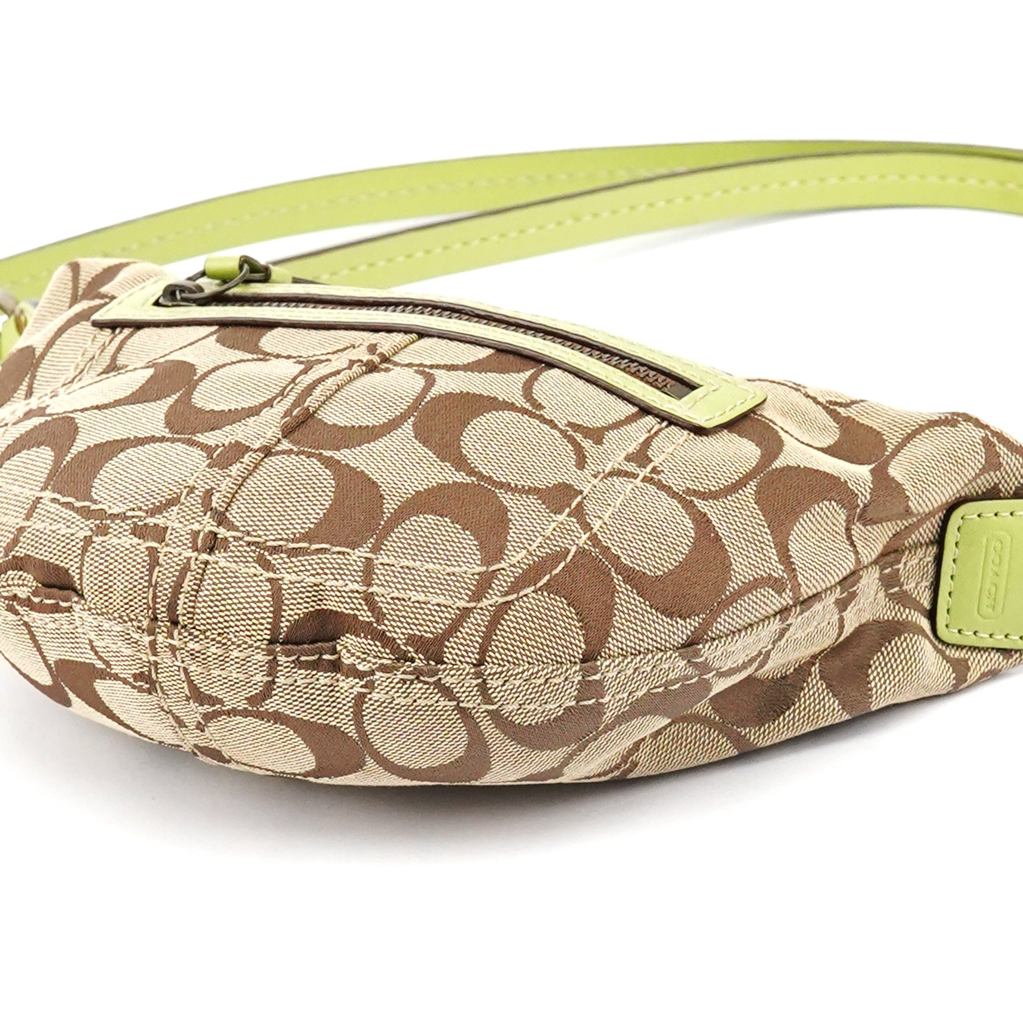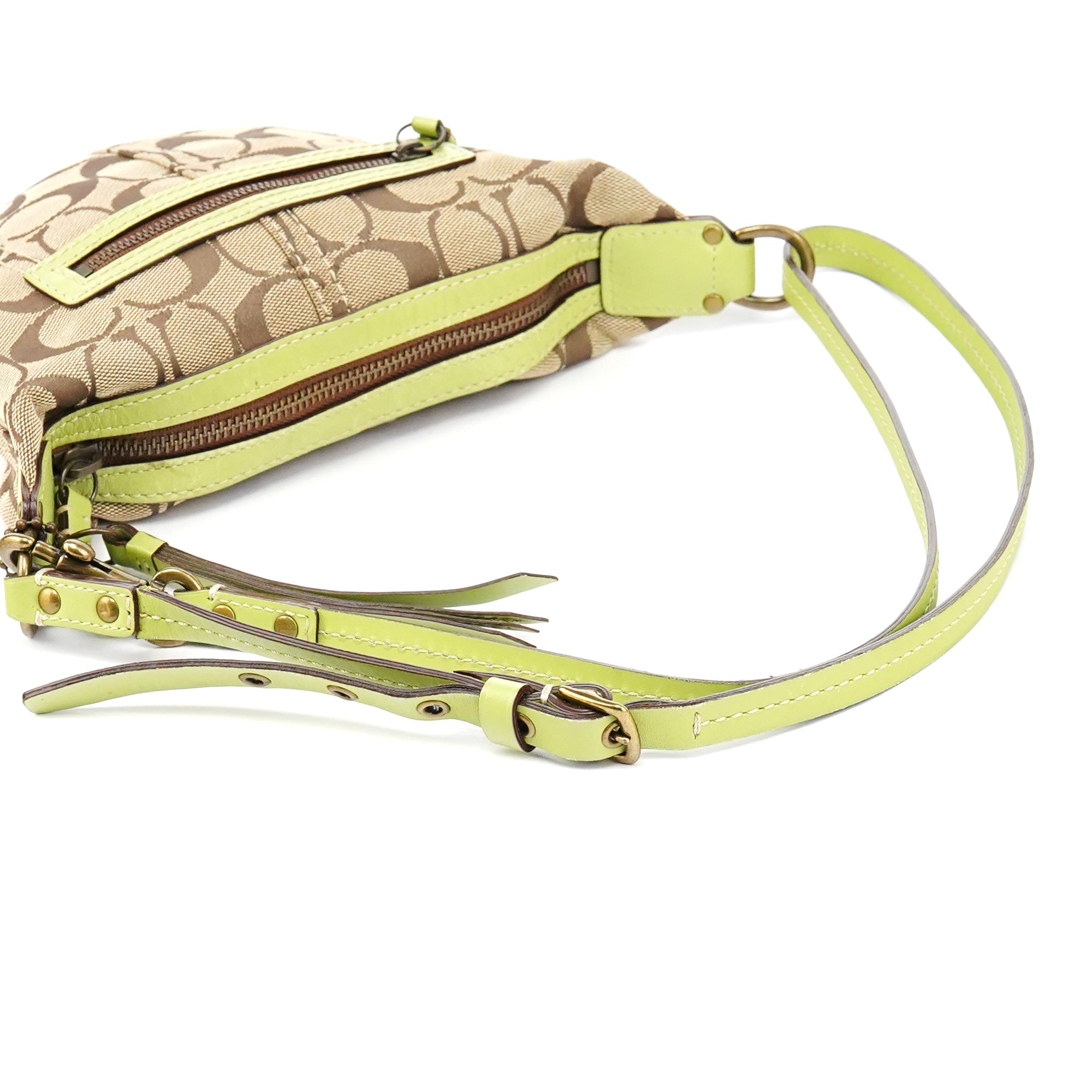 Designed in the early 2000s, the Coach Signature C Swing 2-way bag is crafted from jacquard with green leather trim and brass hardware. It features a front zipper pocket, a satin-lined interior, and an adjustable handle for shoulder or crossbody wear.