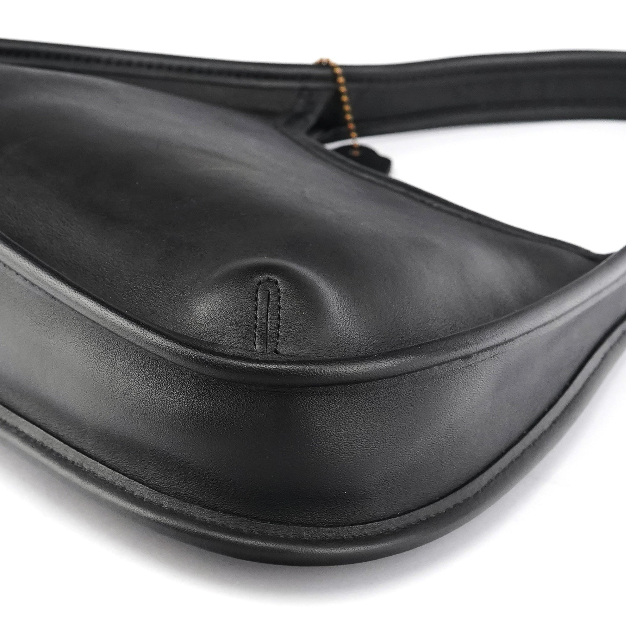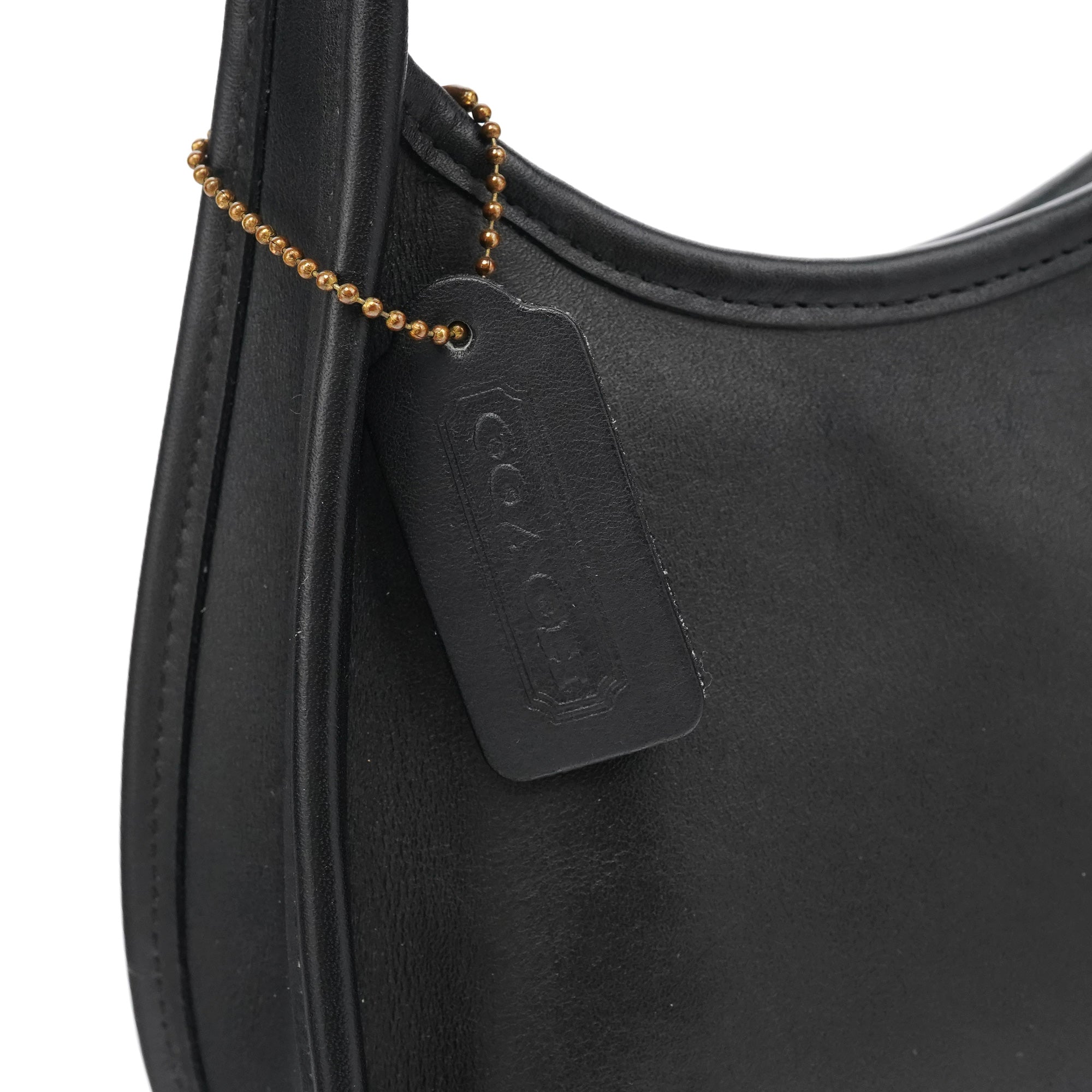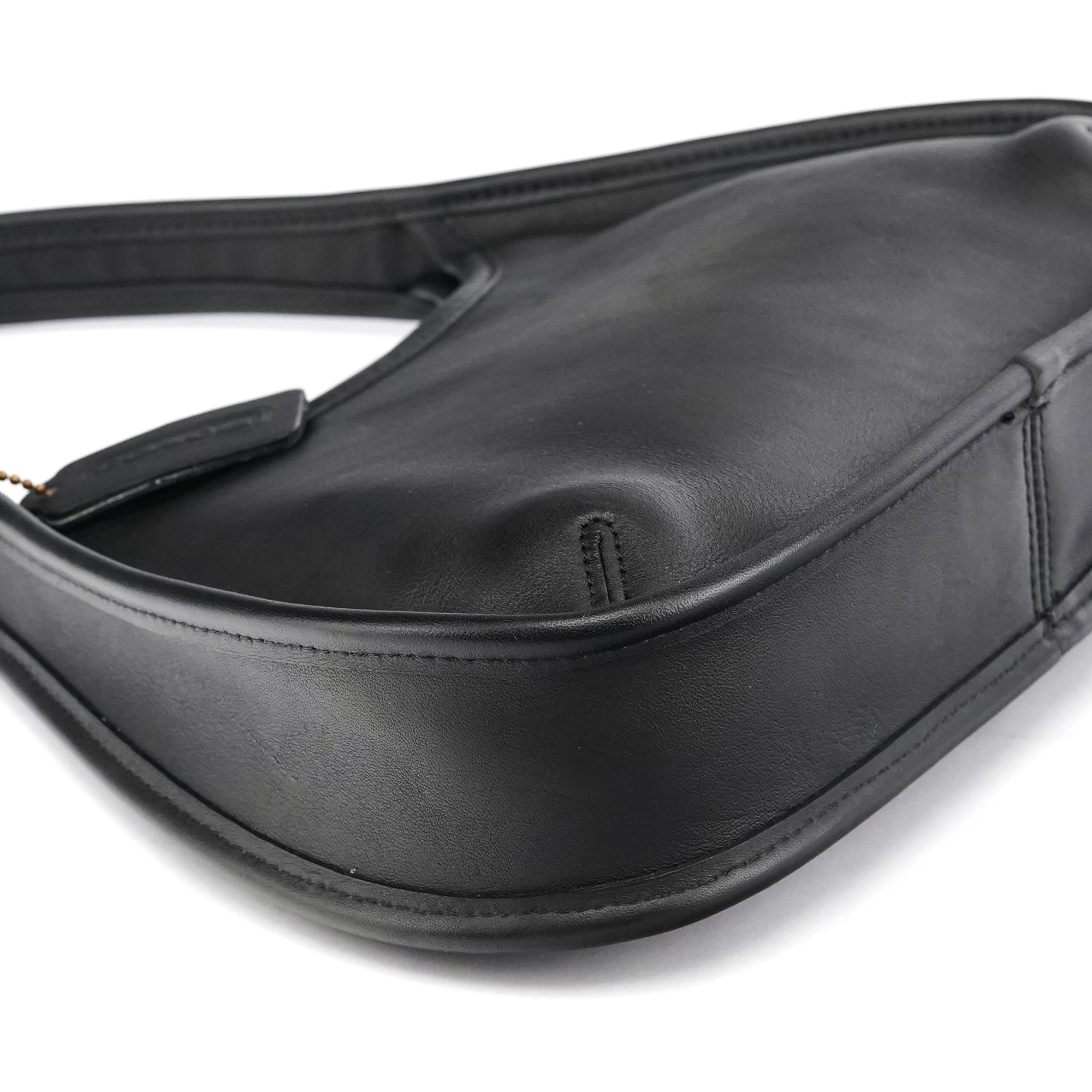 Designed in the late 1990s, this iconic Coach Ergo bag is crafted in smooth black leather with a minimalist curved silhouette. It features a single shoulder strap, magnetic closure, gold-tone hardware, and an unlined interior with embossed creed stamp.