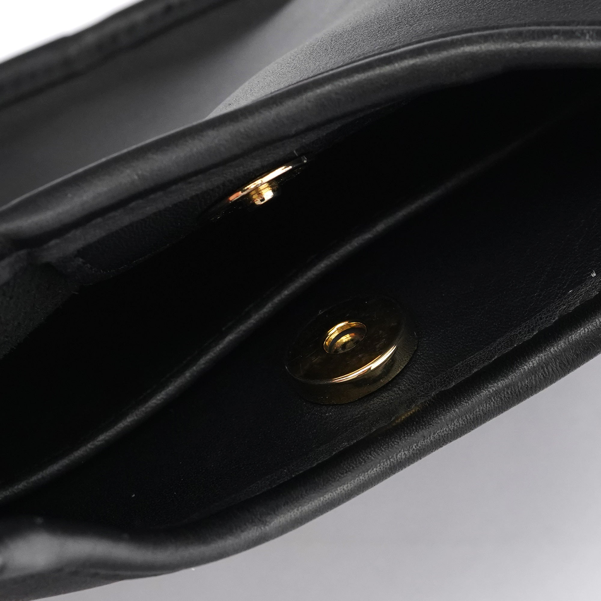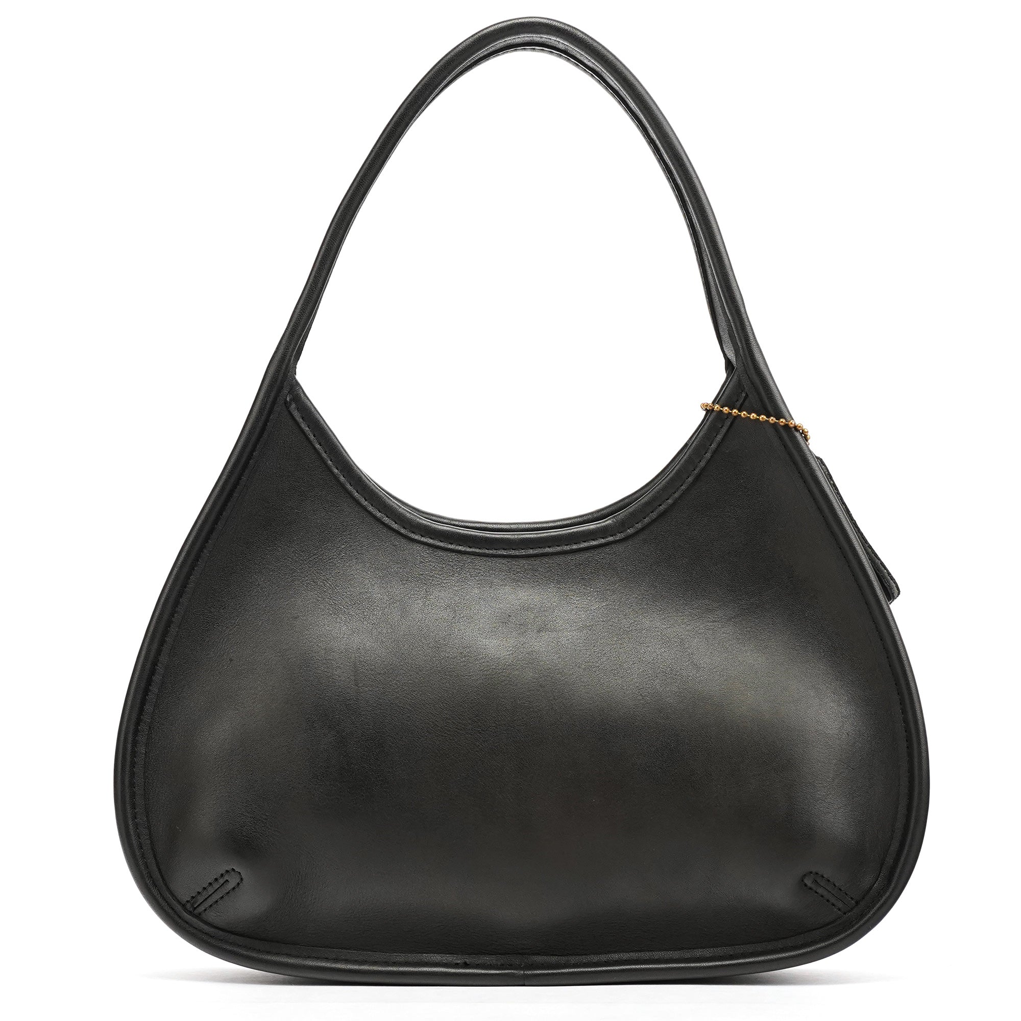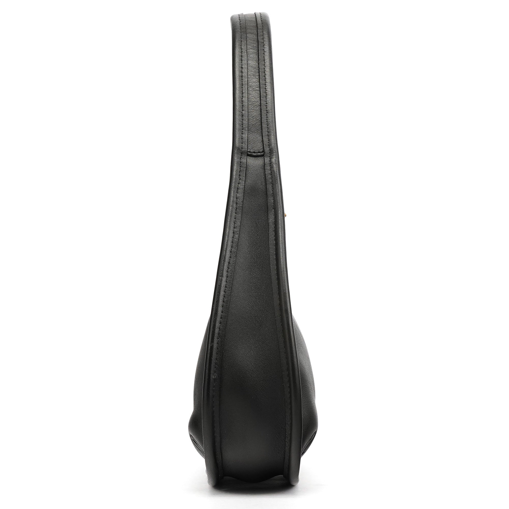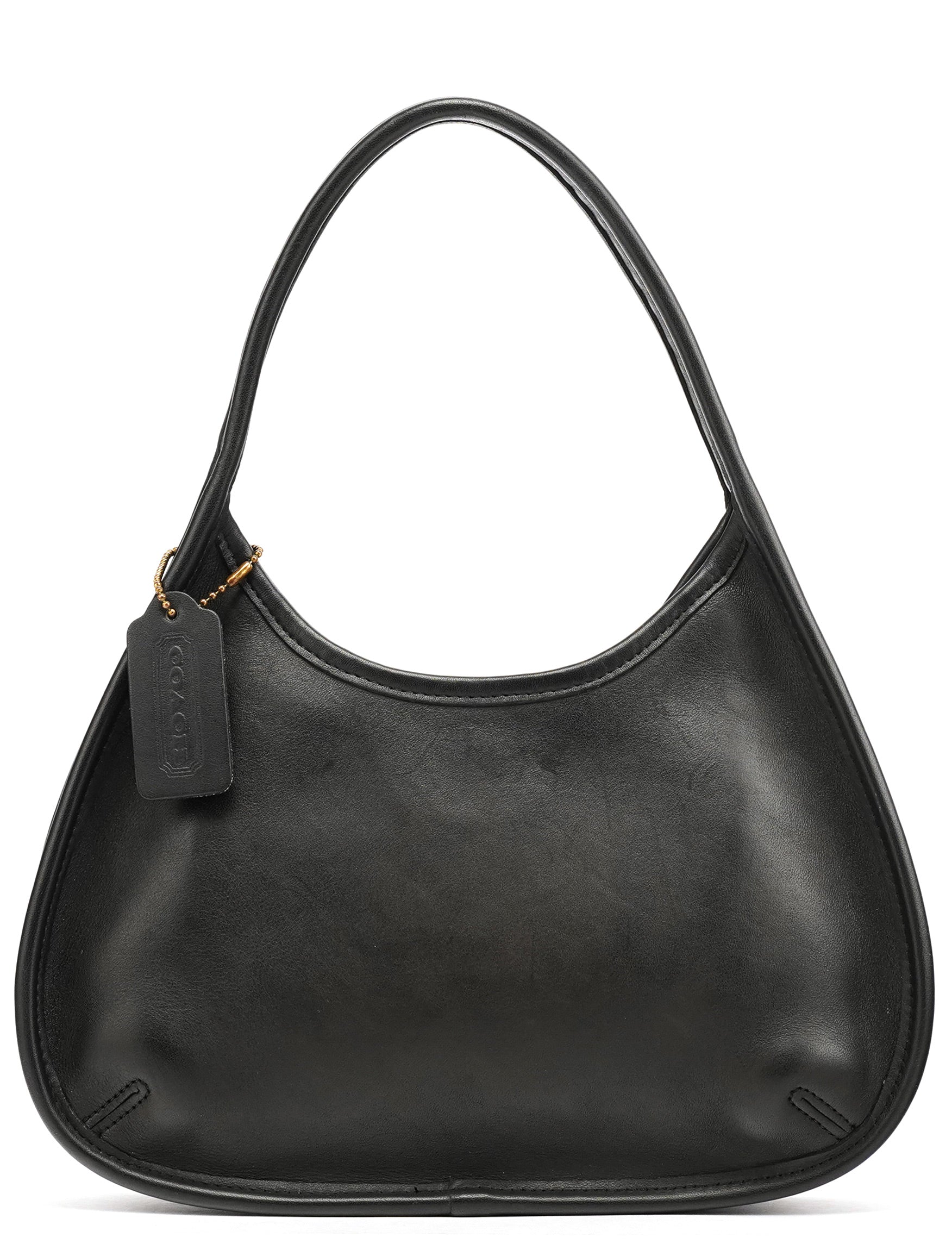 Designed in the late 1990s, this iconic Coach Ergo bag is crafted in smooth black leather with a minimalist curved silhouette. It features a single shoulder strap, magnetic closure, gold-tone hardware, and an unlined interior with embossed creed stamp.