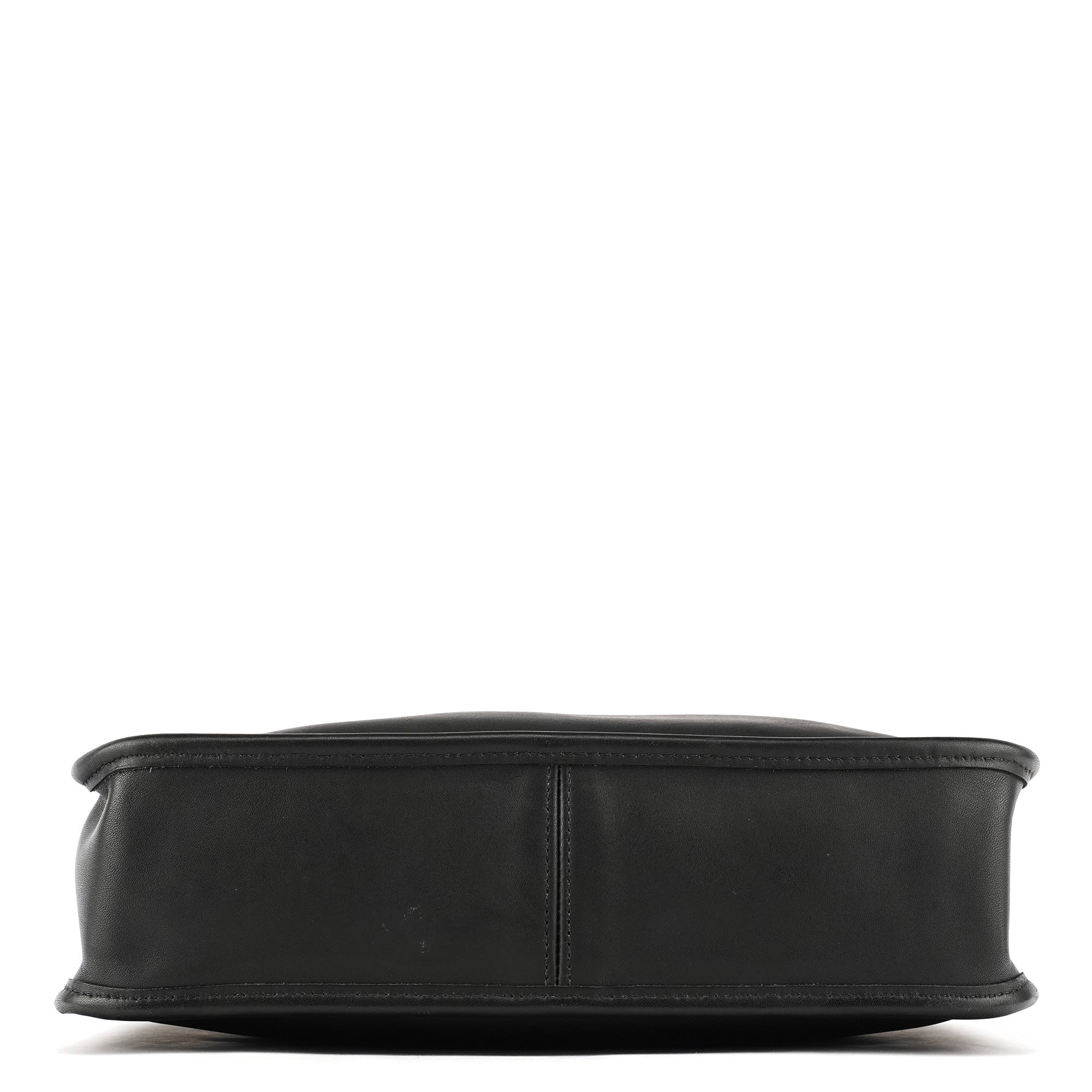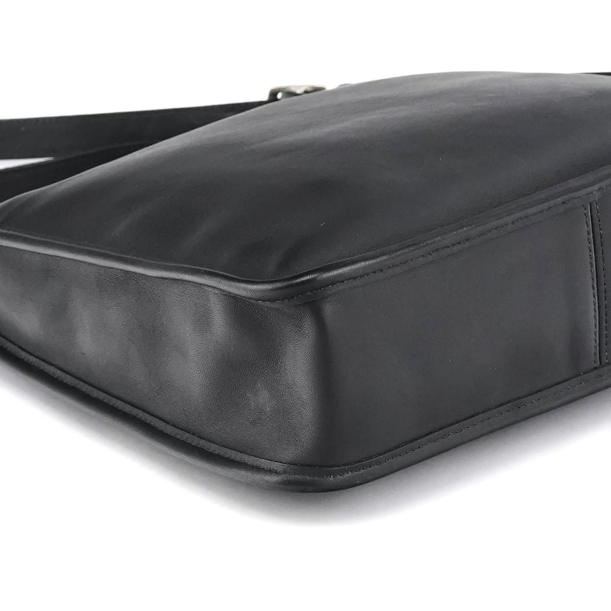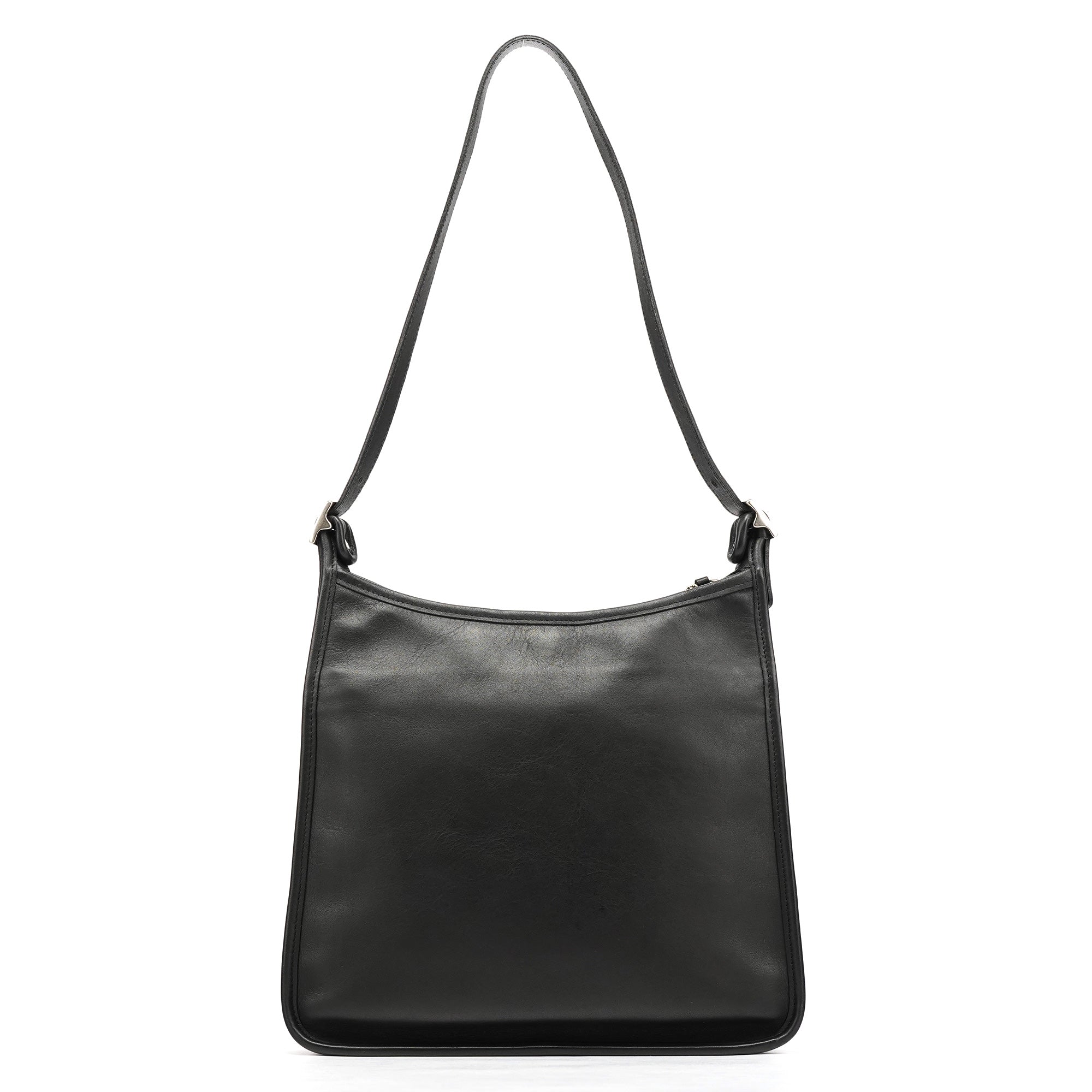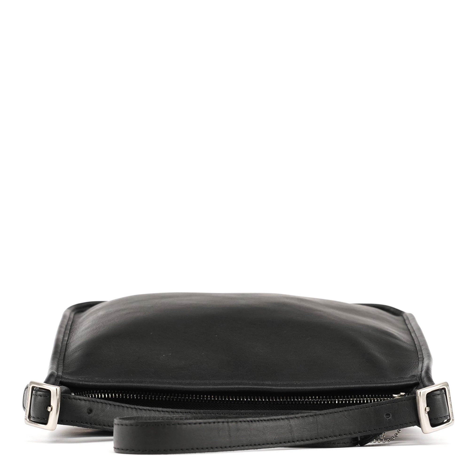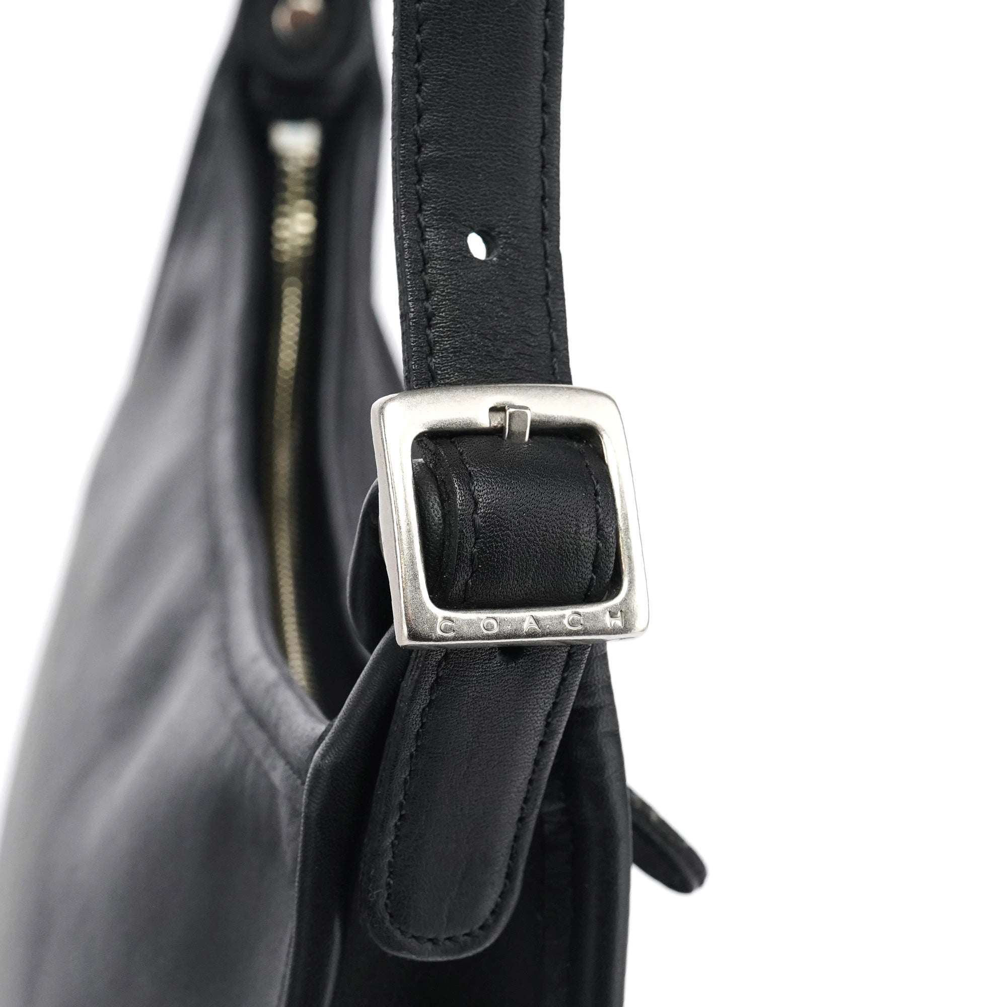 Designed in the late 1990s, this vintage Coach Ergo shoulder bag is crafted from smooth black glove-tanned leather. The structured, curved silhouette features silver-tone hardware, an adjustable buckled strap, and a zip-top closure. The interior is lined with suede and includes a secure zippered pocket.