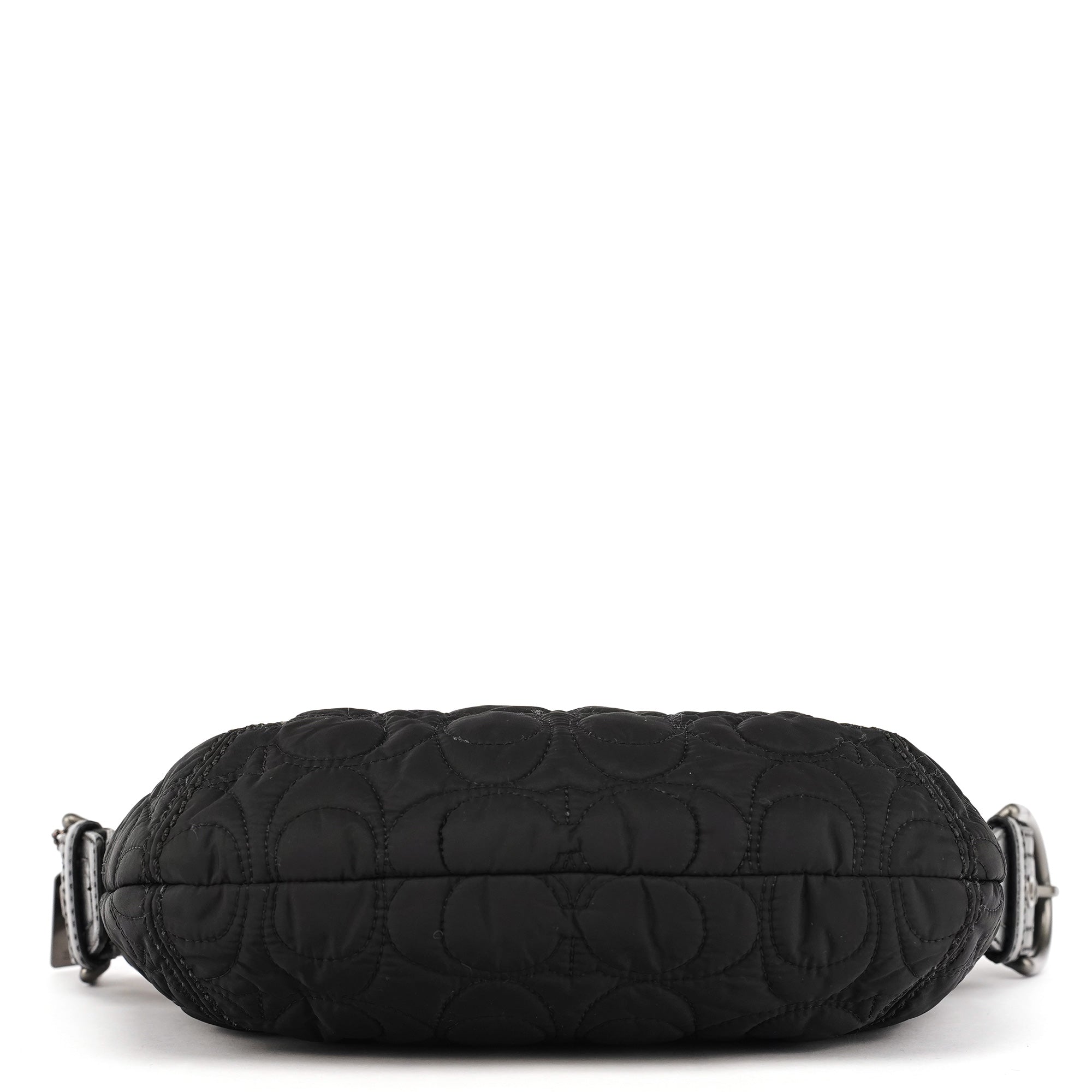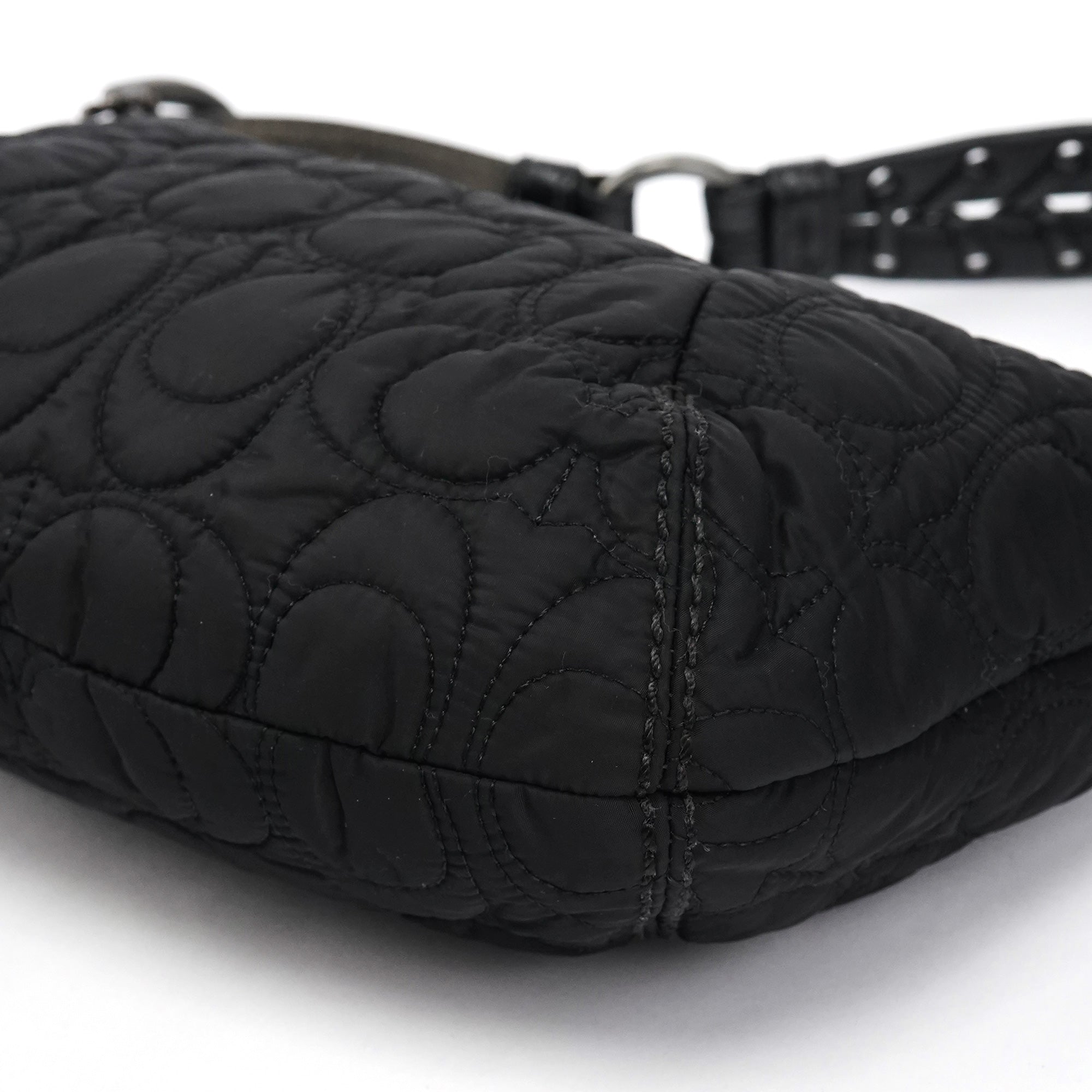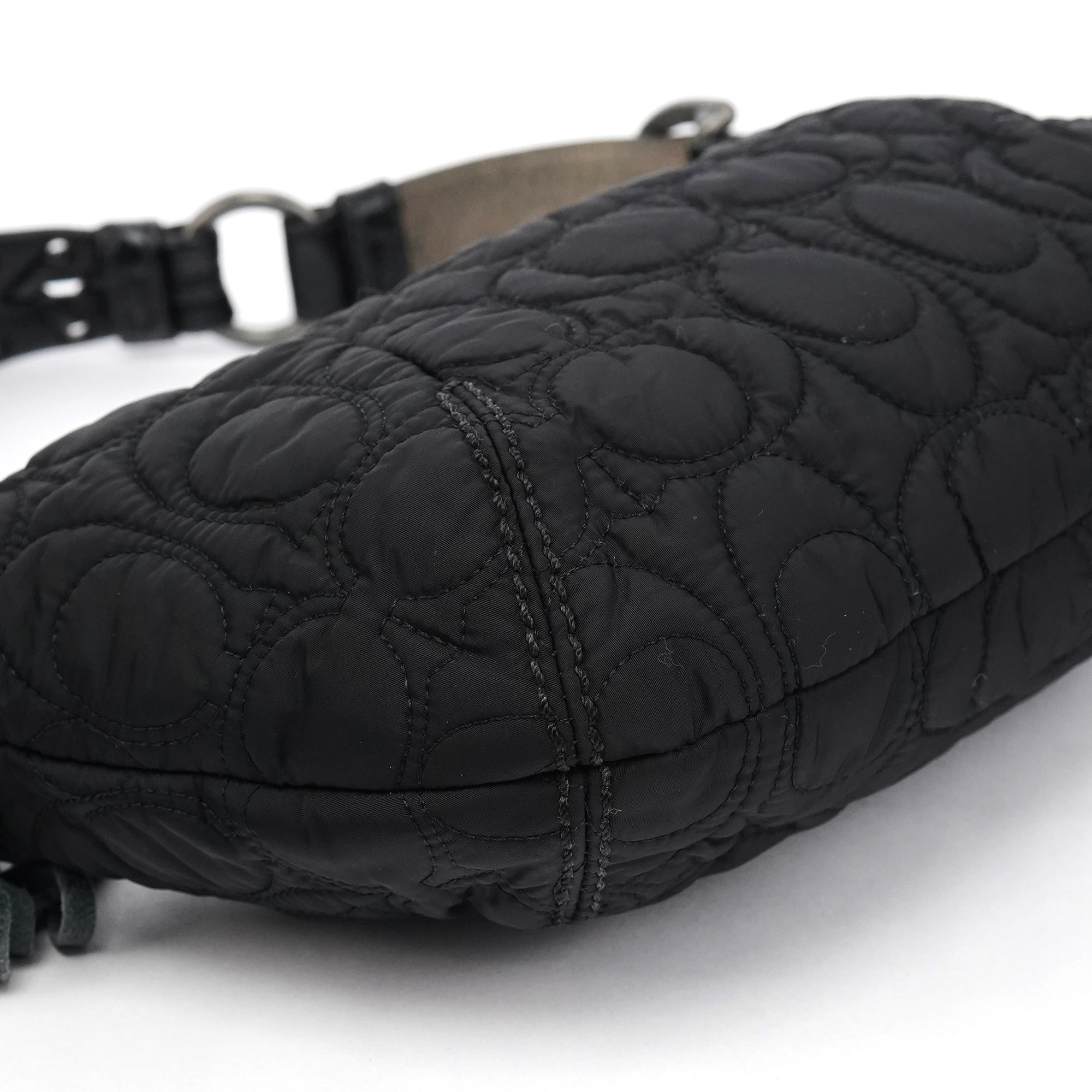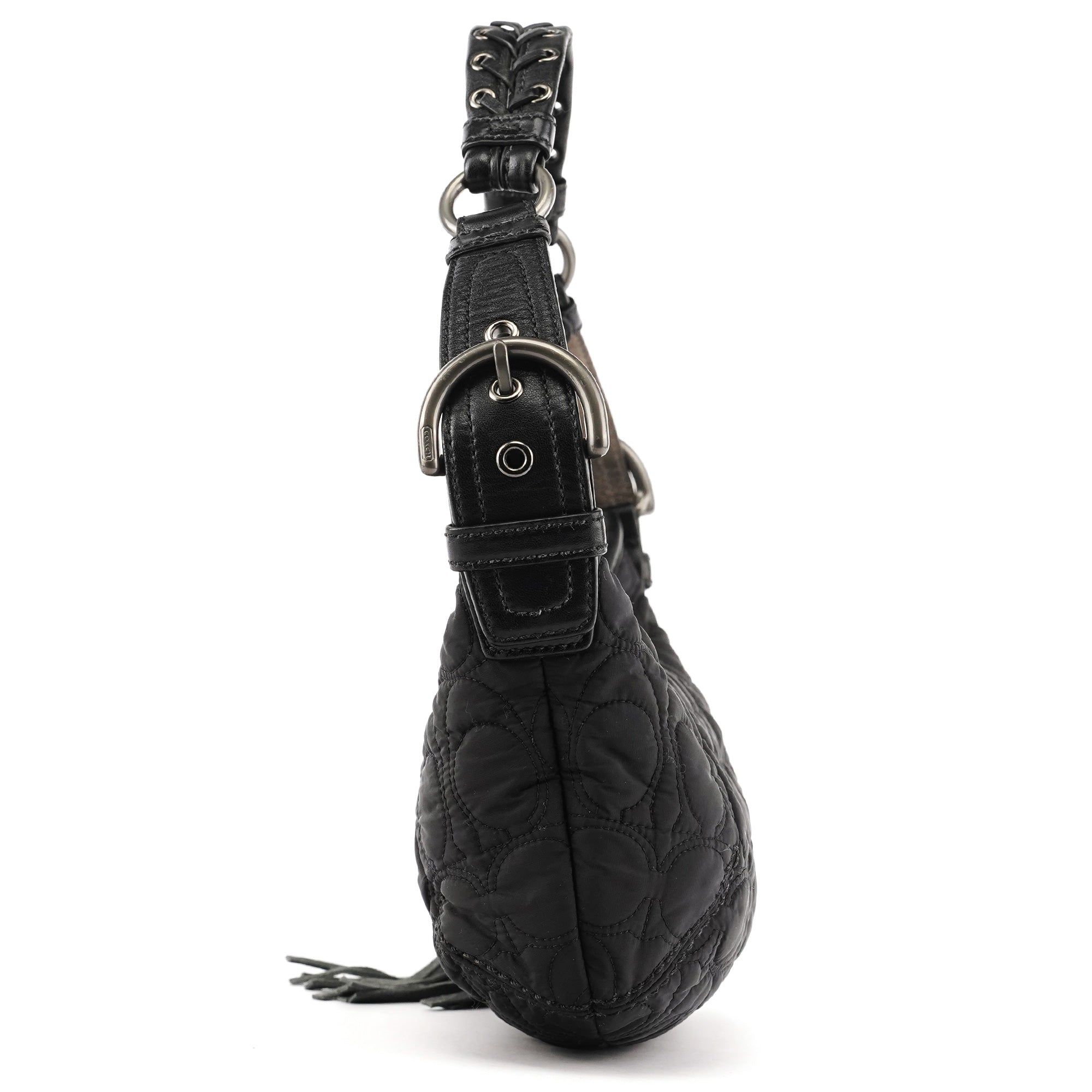 Designed in the early 2000s, the Coach Soho shoulder bag is handcrafted in quilted nylon featuring the brand’s Signature C monogram. It’s detailed with black leather trim, a woven-style handle, and anthracite hardware. The top zipper opens to a satin-lined interior with a zip pocket.
