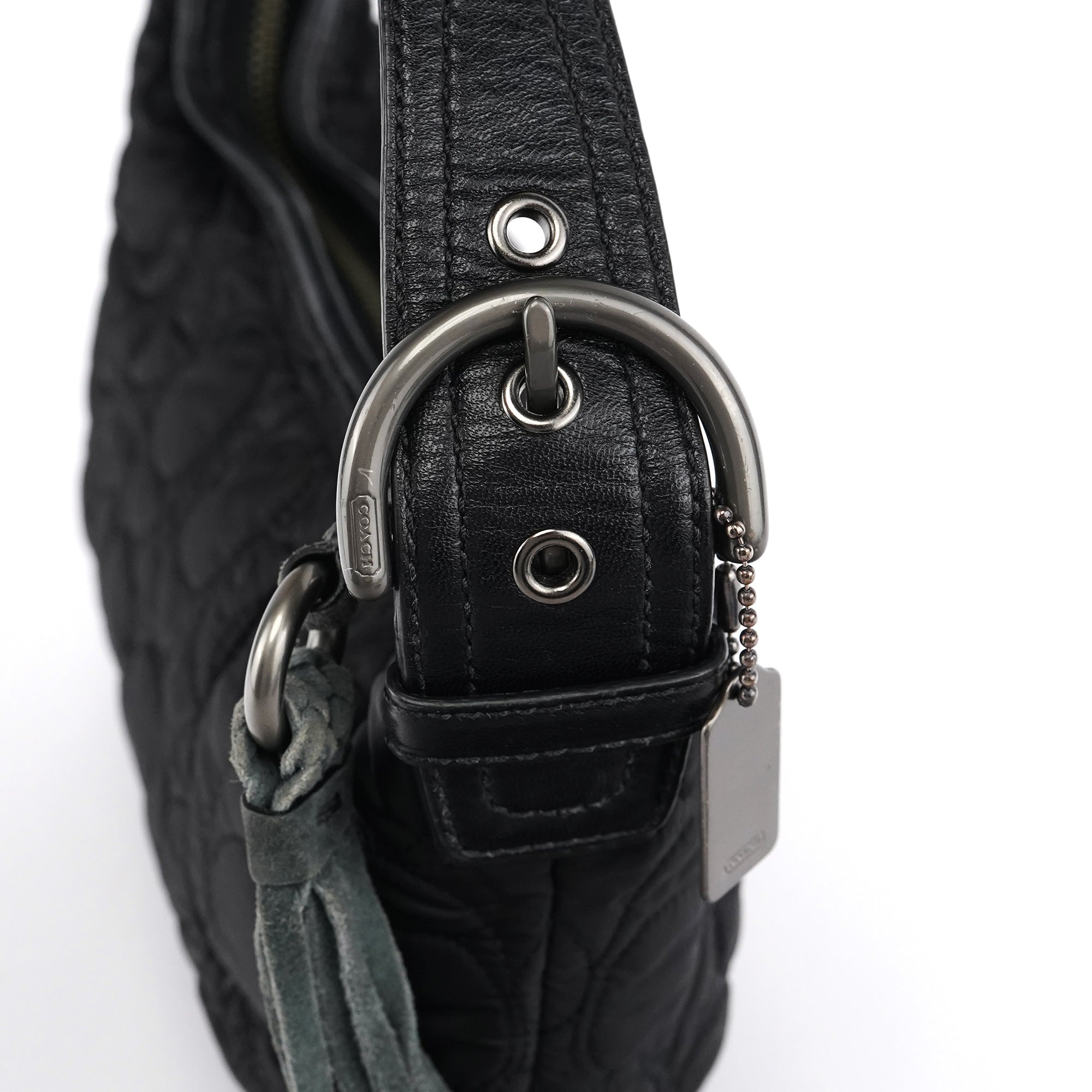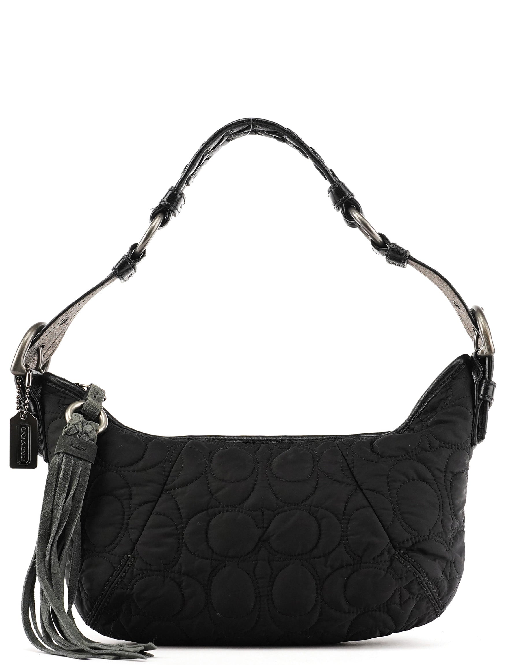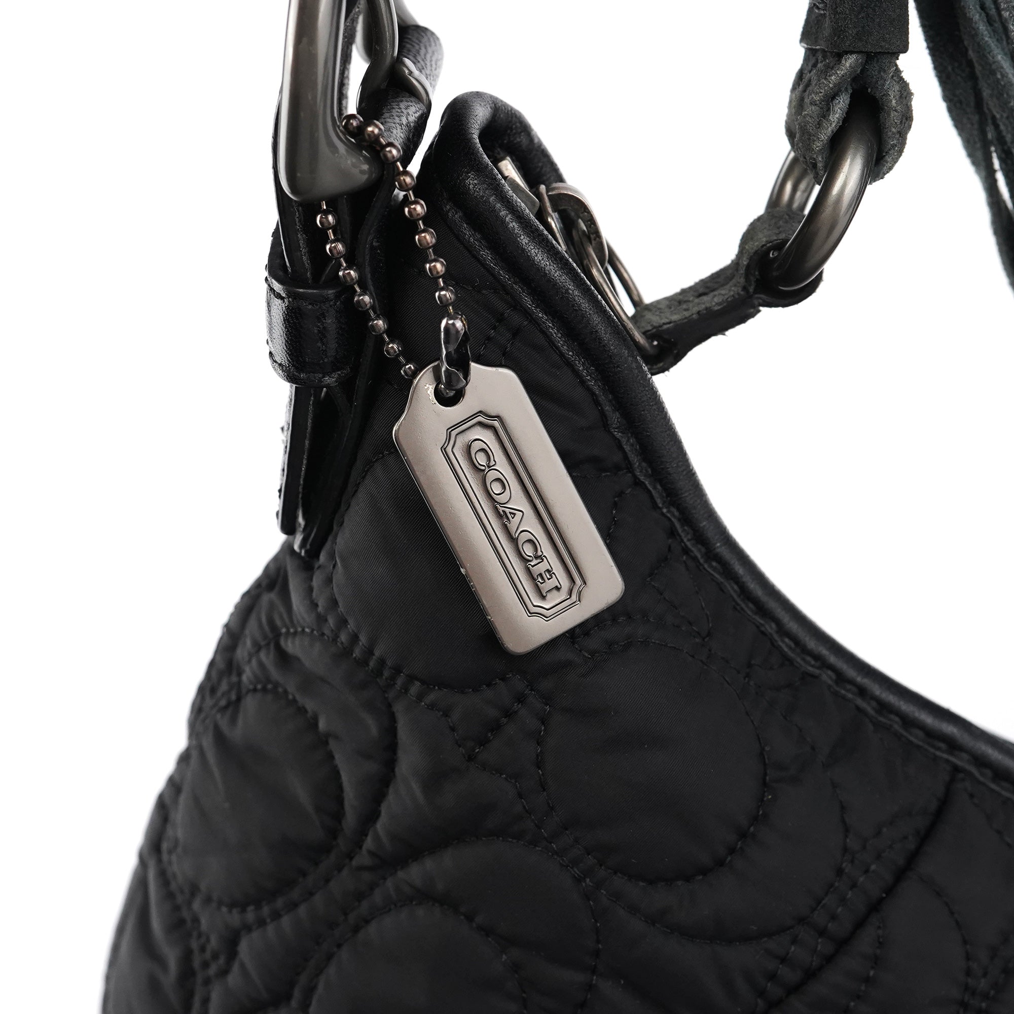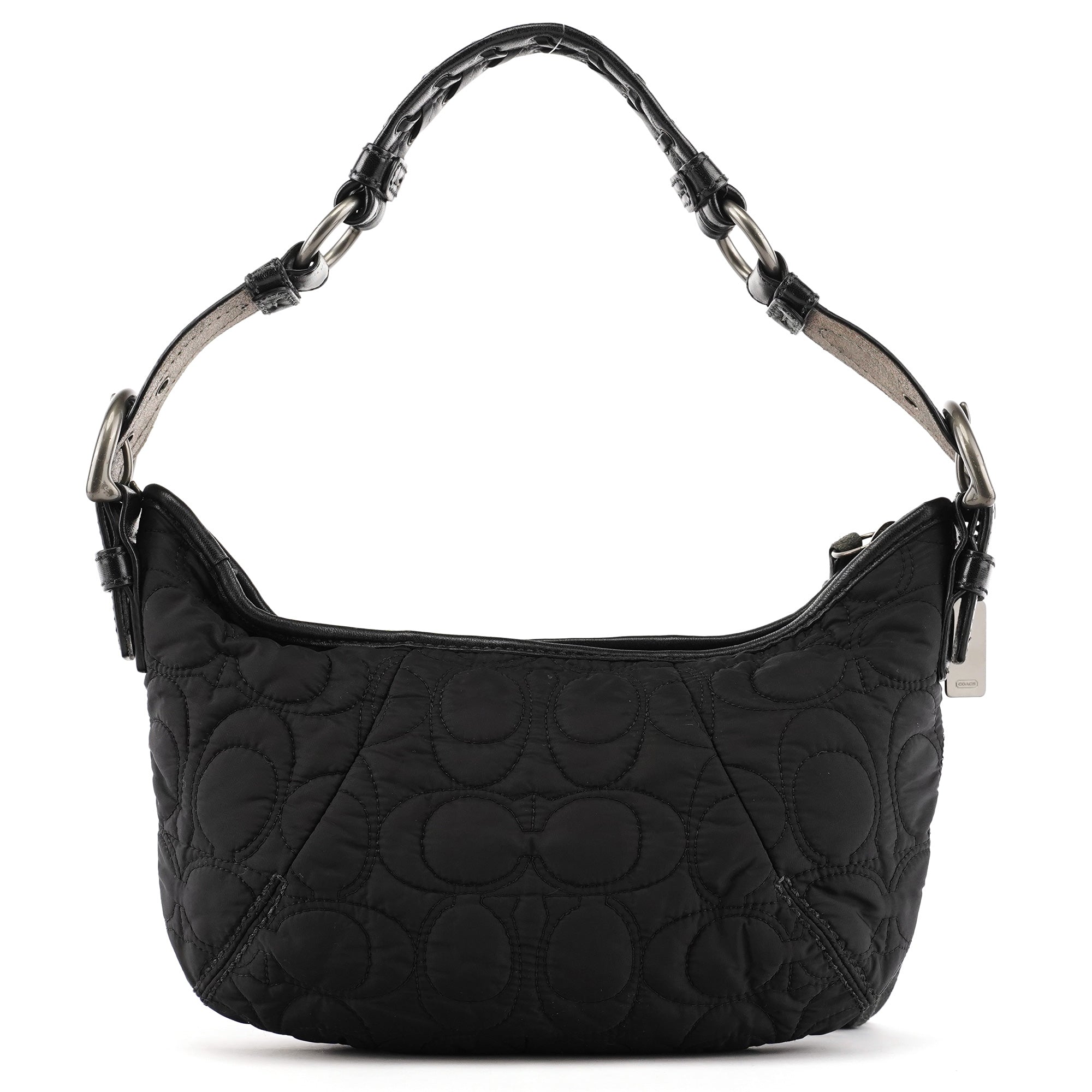 Designed in the early 2000s, the Coach Soho shoulder bag is handcrafted in quilted nylon featuring the brand’s Signature C monogram. It’s detailed with black leather trim, a woven-style handle, and anthracite hardware. The top zipper opens to a satin-lined interior with a zip pocket.
