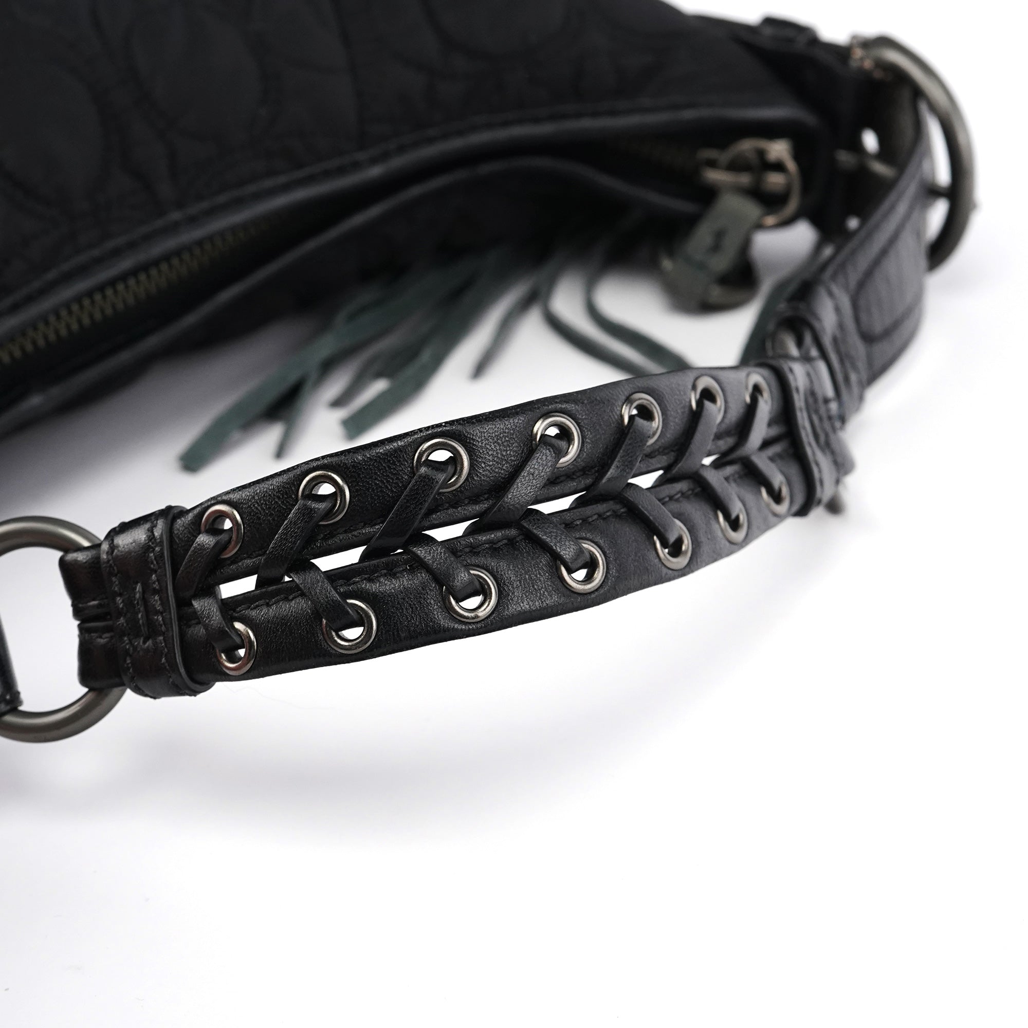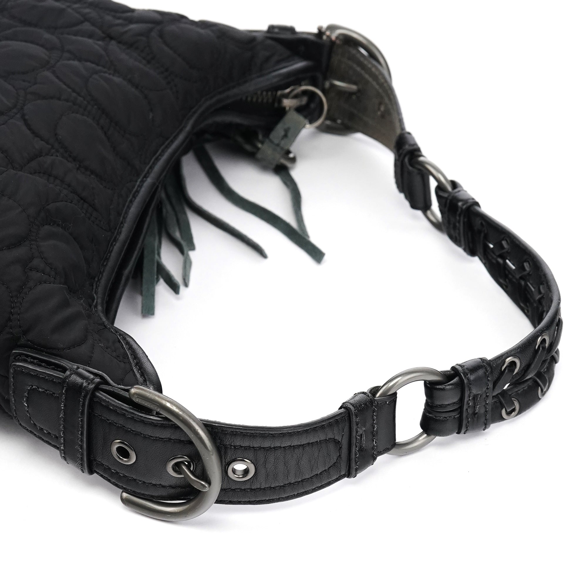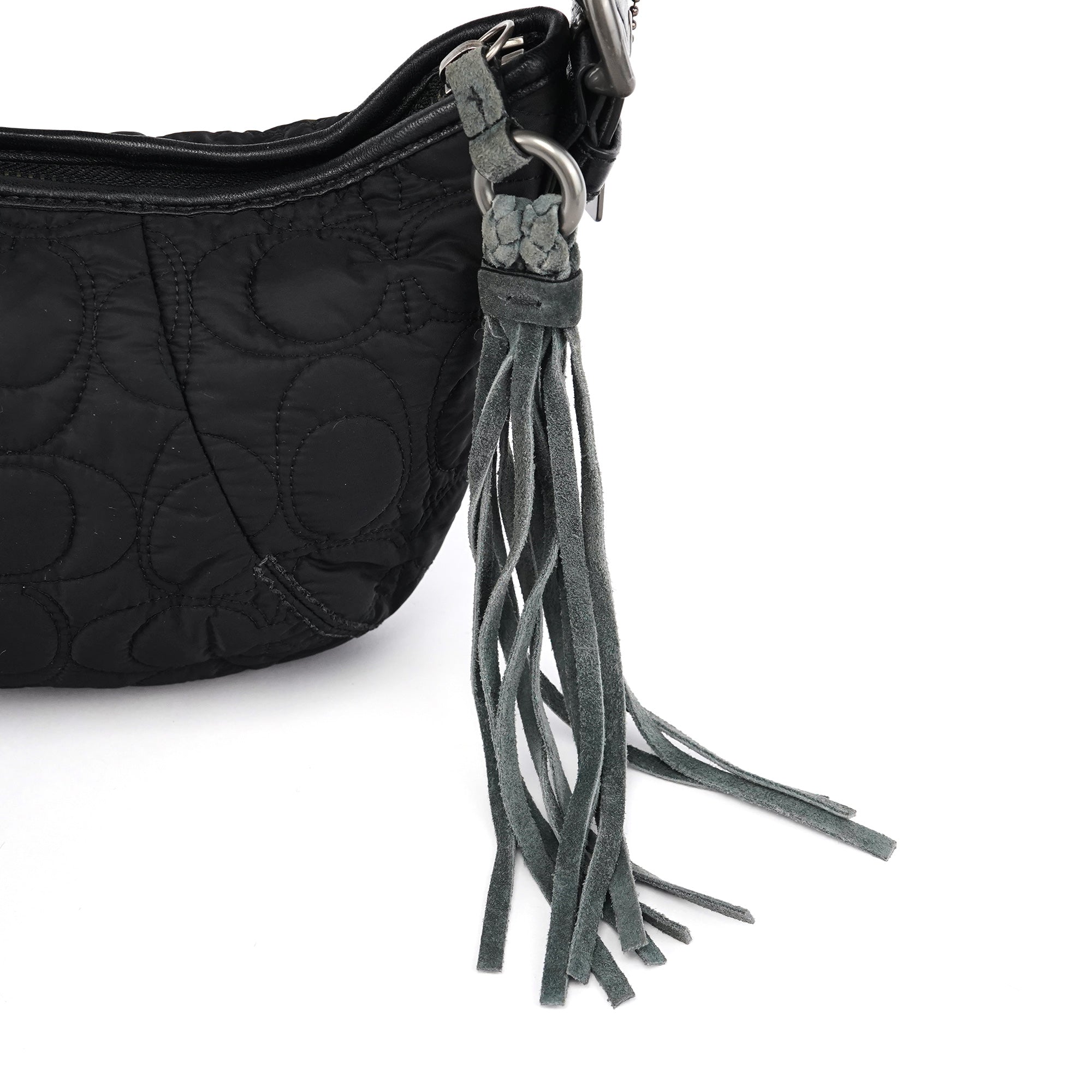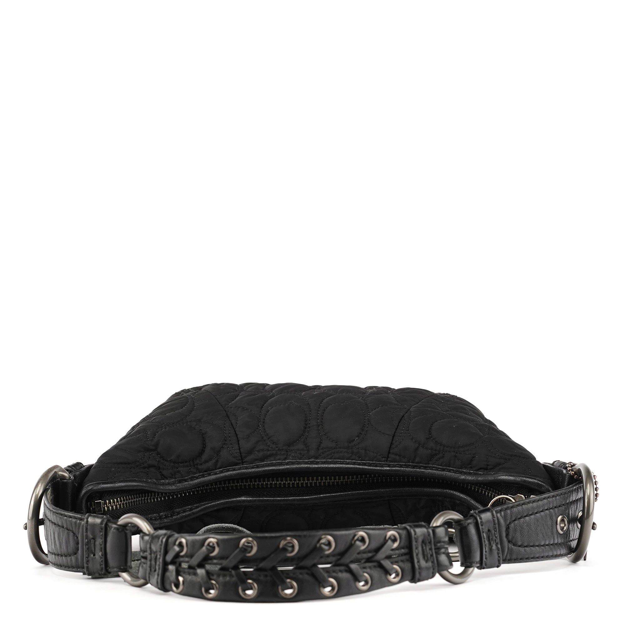 Designed in the early 2000s, the Coach Soho shoulder bag is handcrafted in quilted nylon featuring the brand’s Signature C monogram. It’s detailed with black leather trim, a woven-style handle, and anthracite hardware. The top zipper opens to a satin-lined interior with a zip pocket.