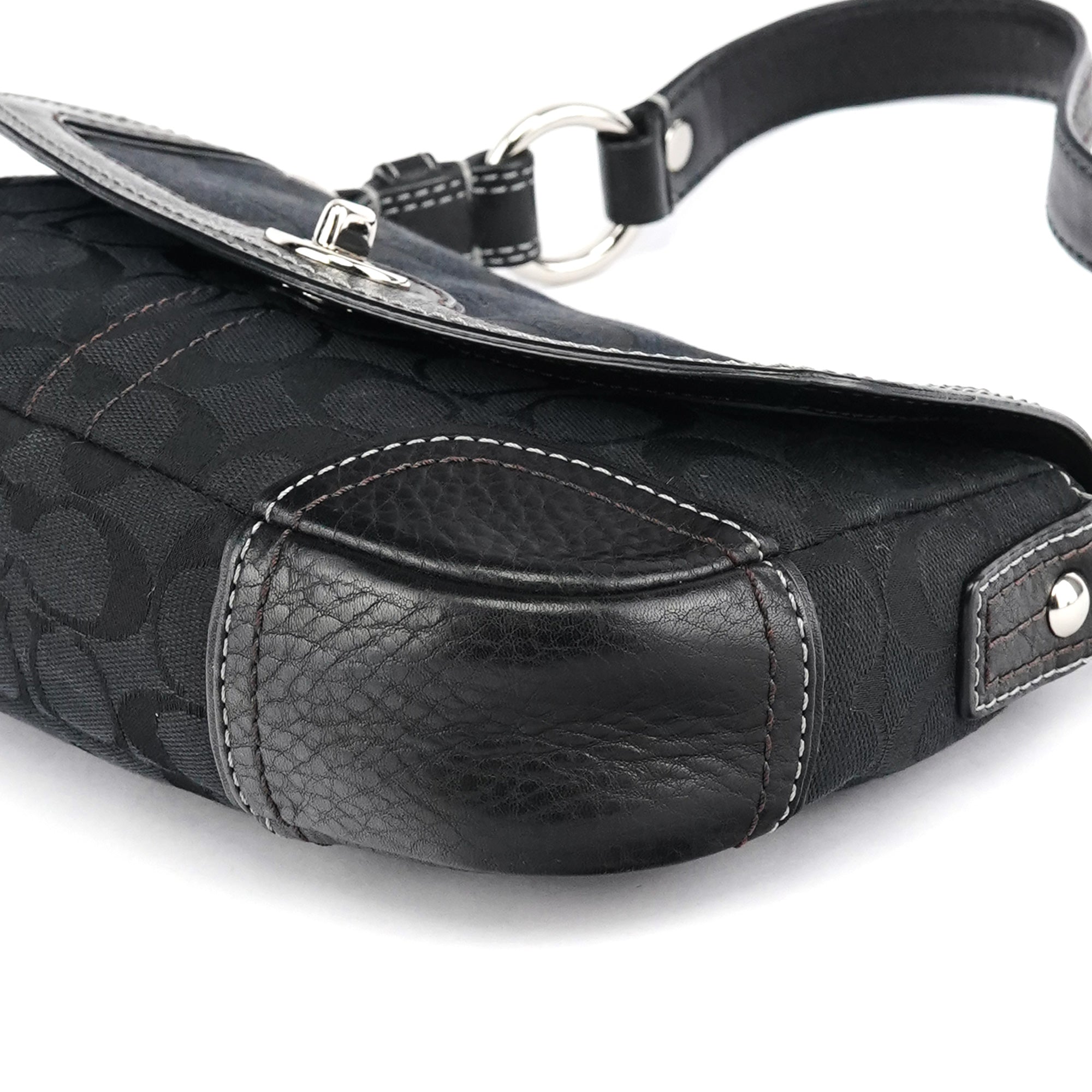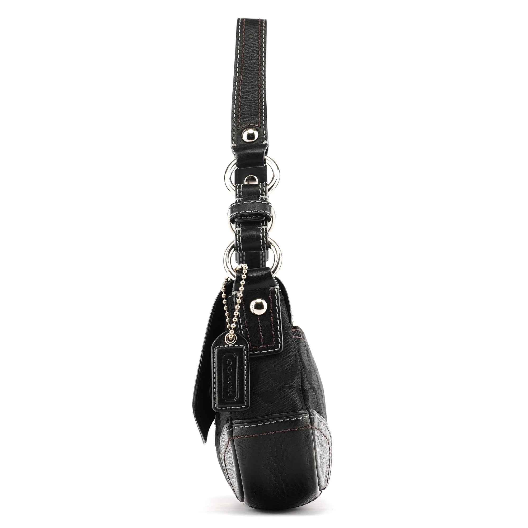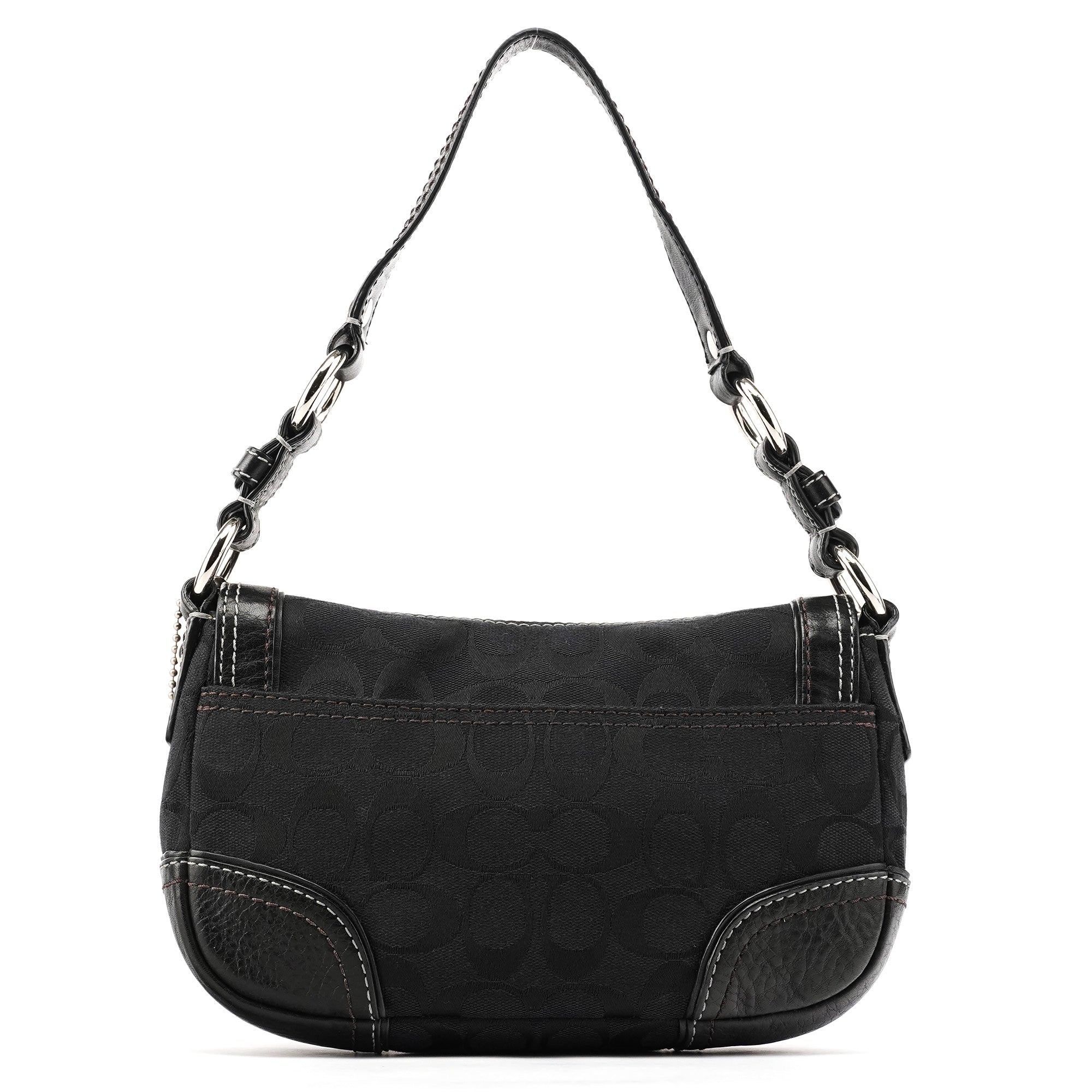 Designed in the early 2000s, this Coach Soho shoulder bag is crafted in black signature jacquard with leather trim and contrast stitching. It has a flap with turn-lock closure, silver-tone hardware, a short chain-accented strap, and a lined interior with a zip pocket.