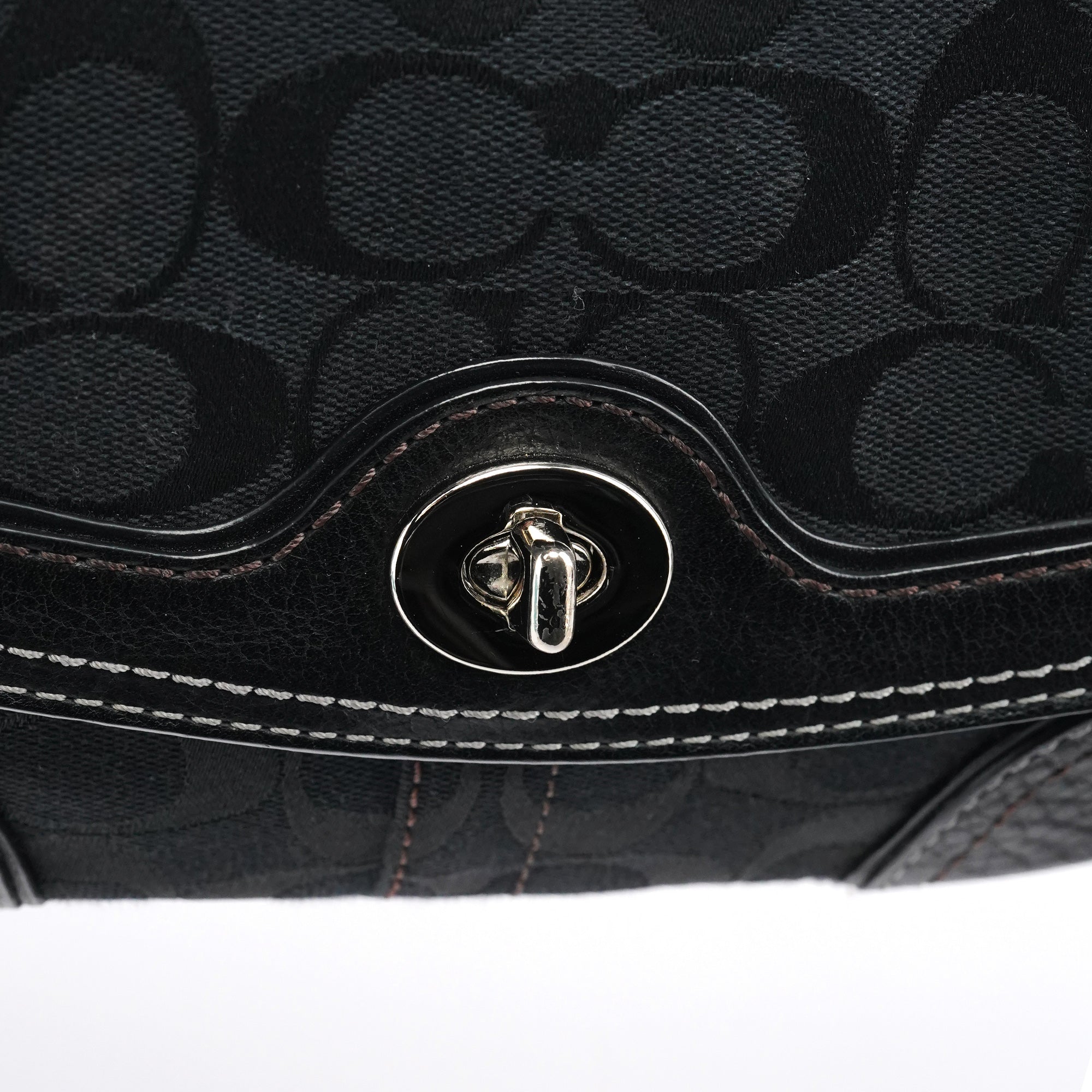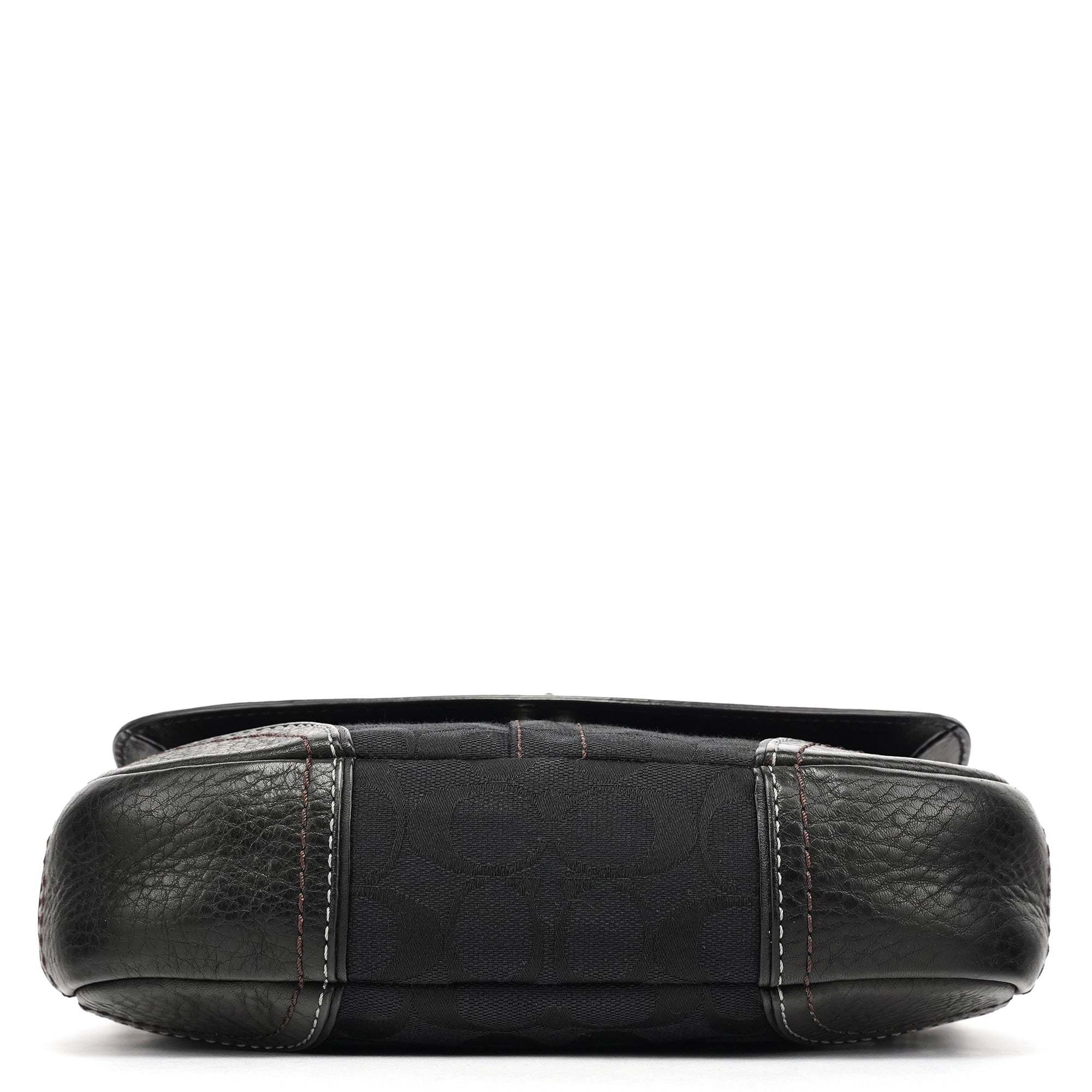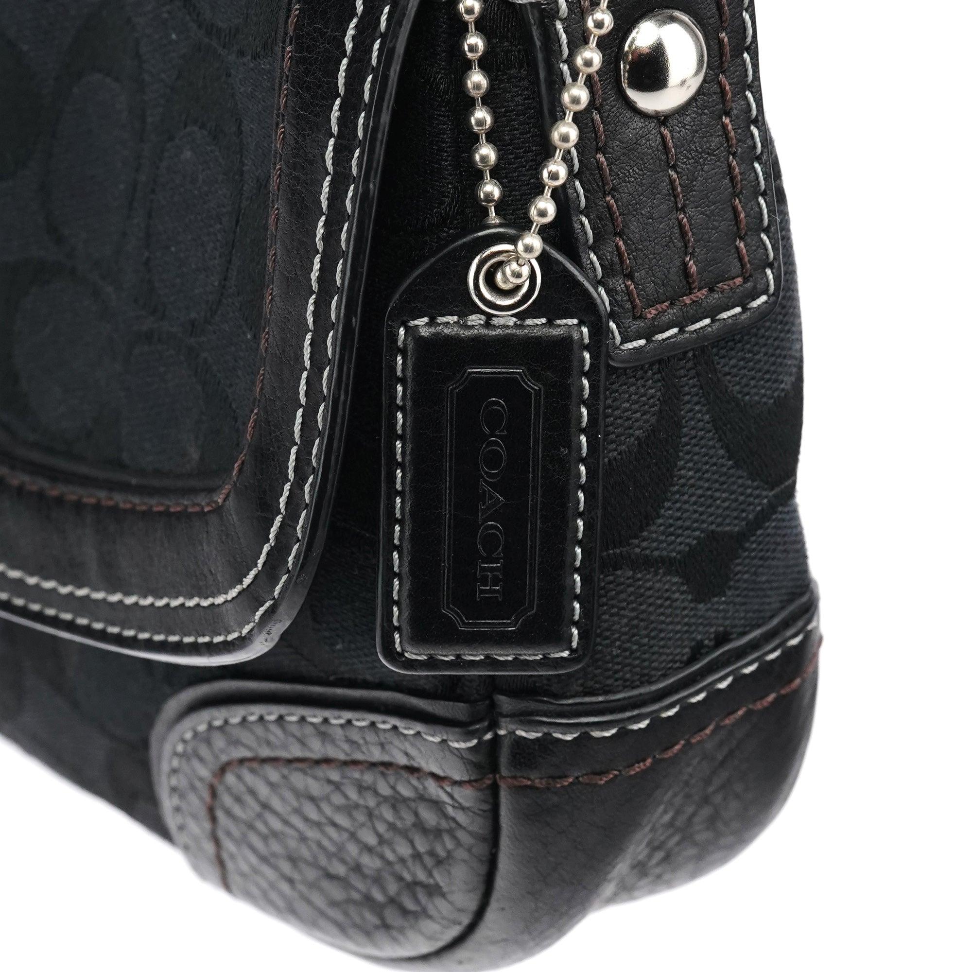 Designed in the early 2000s, this Coach Soho shoulder bag is crafted in black signature jacquard with leather trim and contrast stitching. It has a flap with turn-lock closure, silver-tone hardware, a short chain-accented strap, and a lined interior with a zip pocket.
