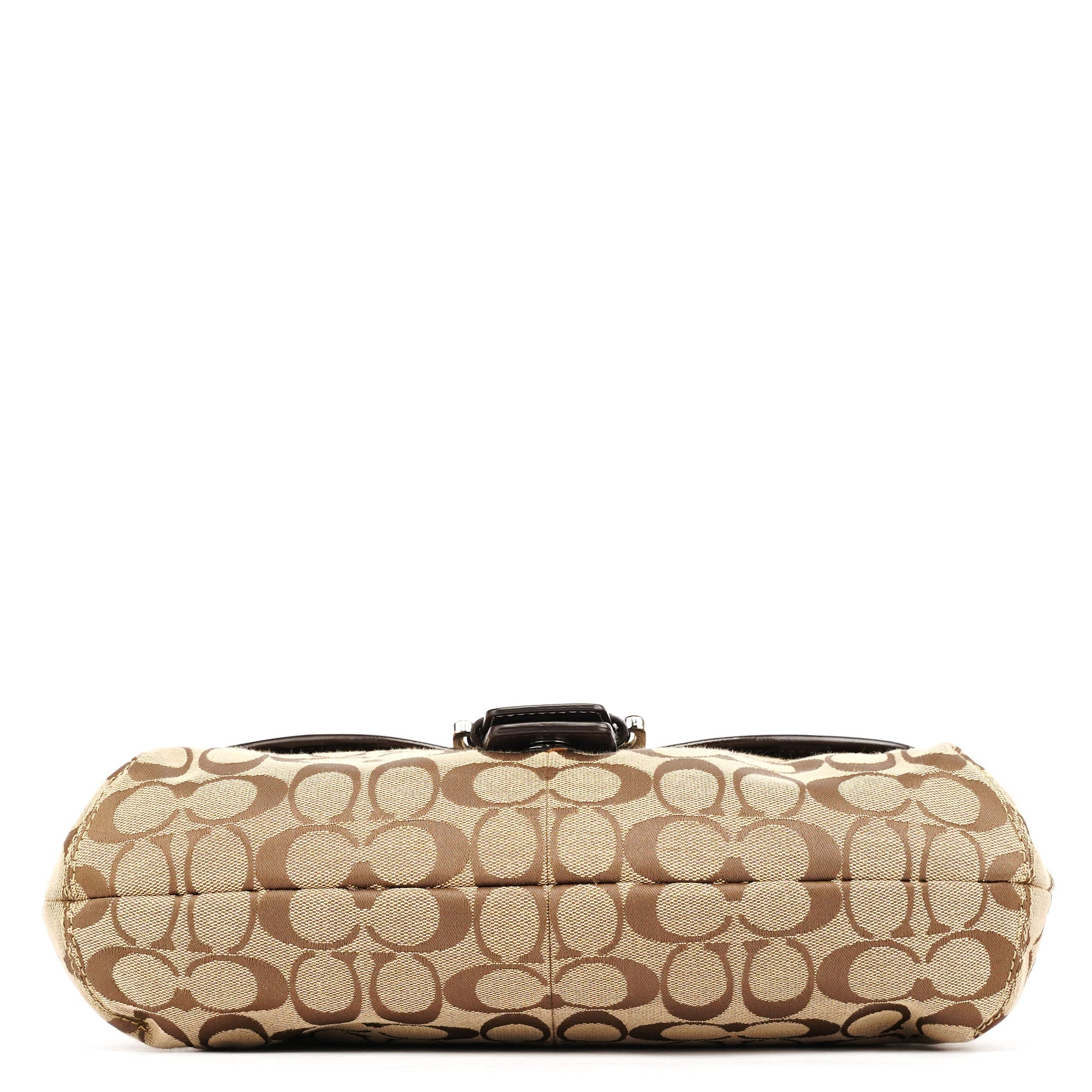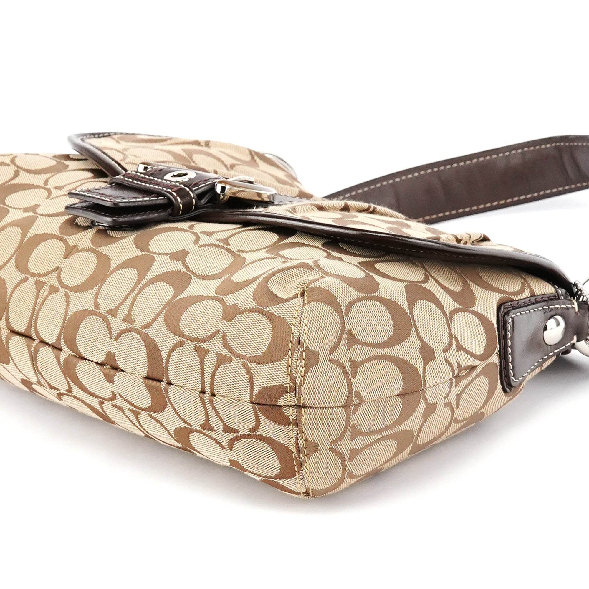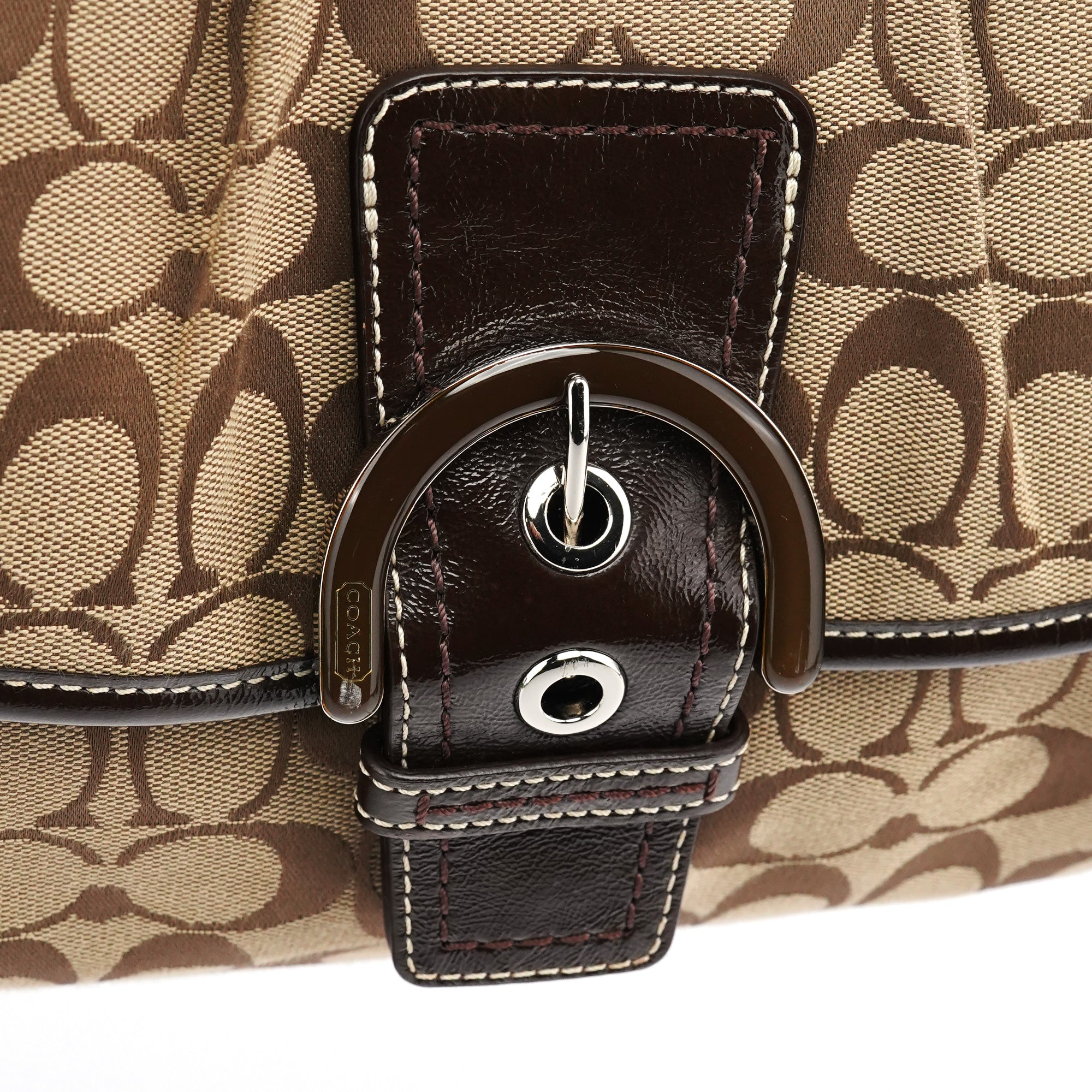 Designed in the mid 2000s, this Coach Soho shoulder bag is crafted from signature beige canvas with dark brown leather trim, finished with a curved flap silhouette, polished buckle closure, adjustable shoulder strap, and satin-lined interior with zip pocket.