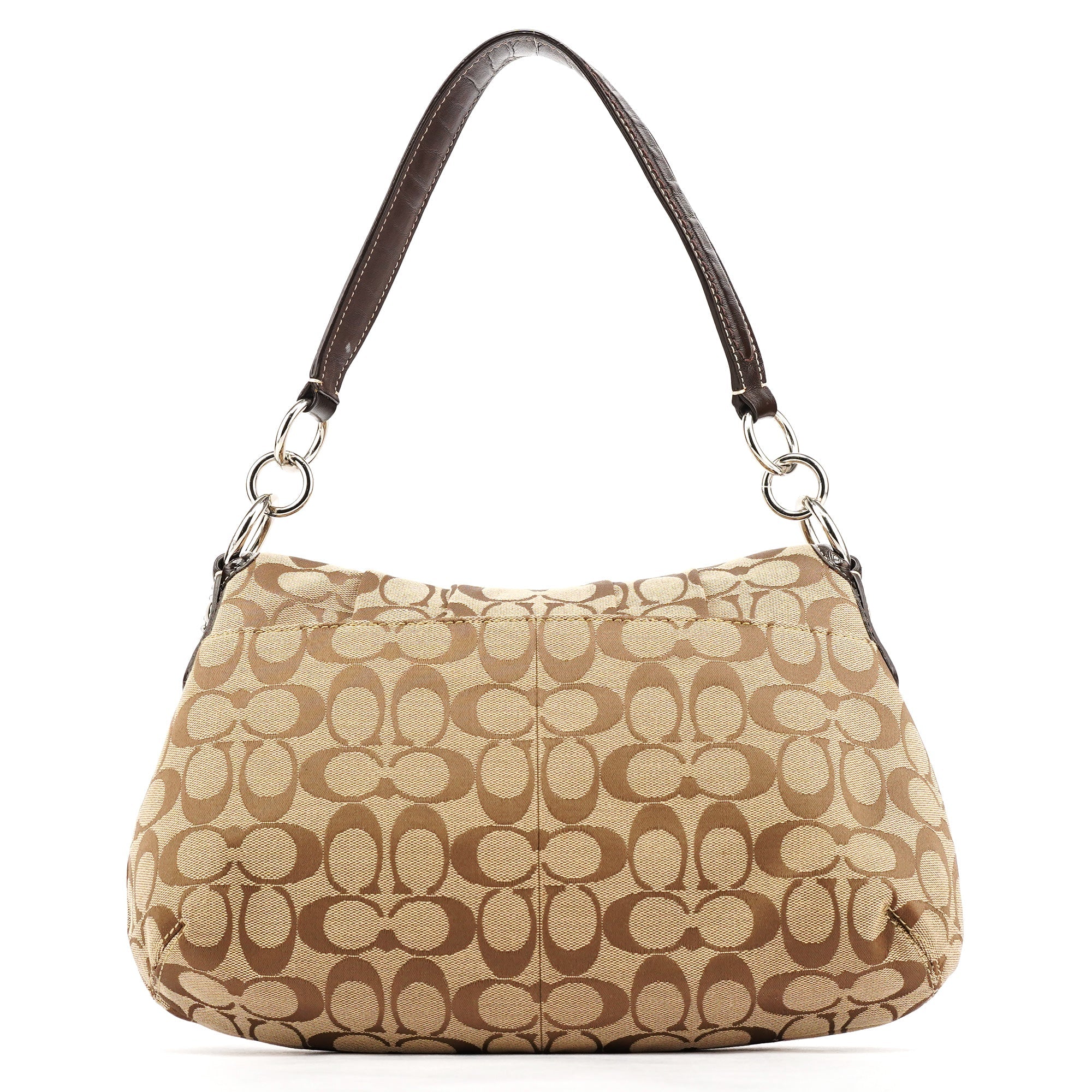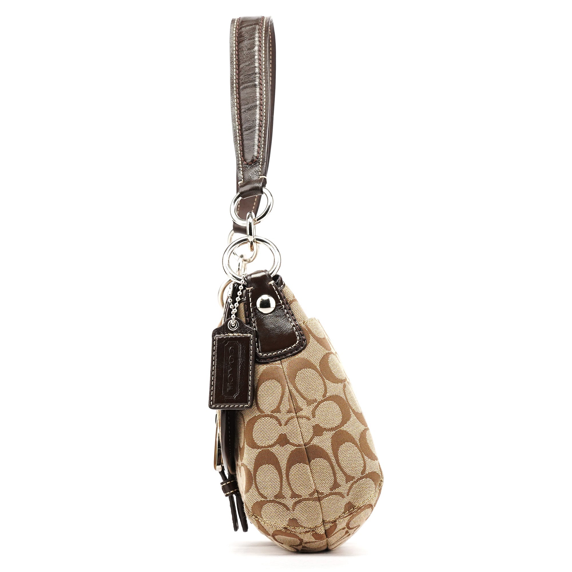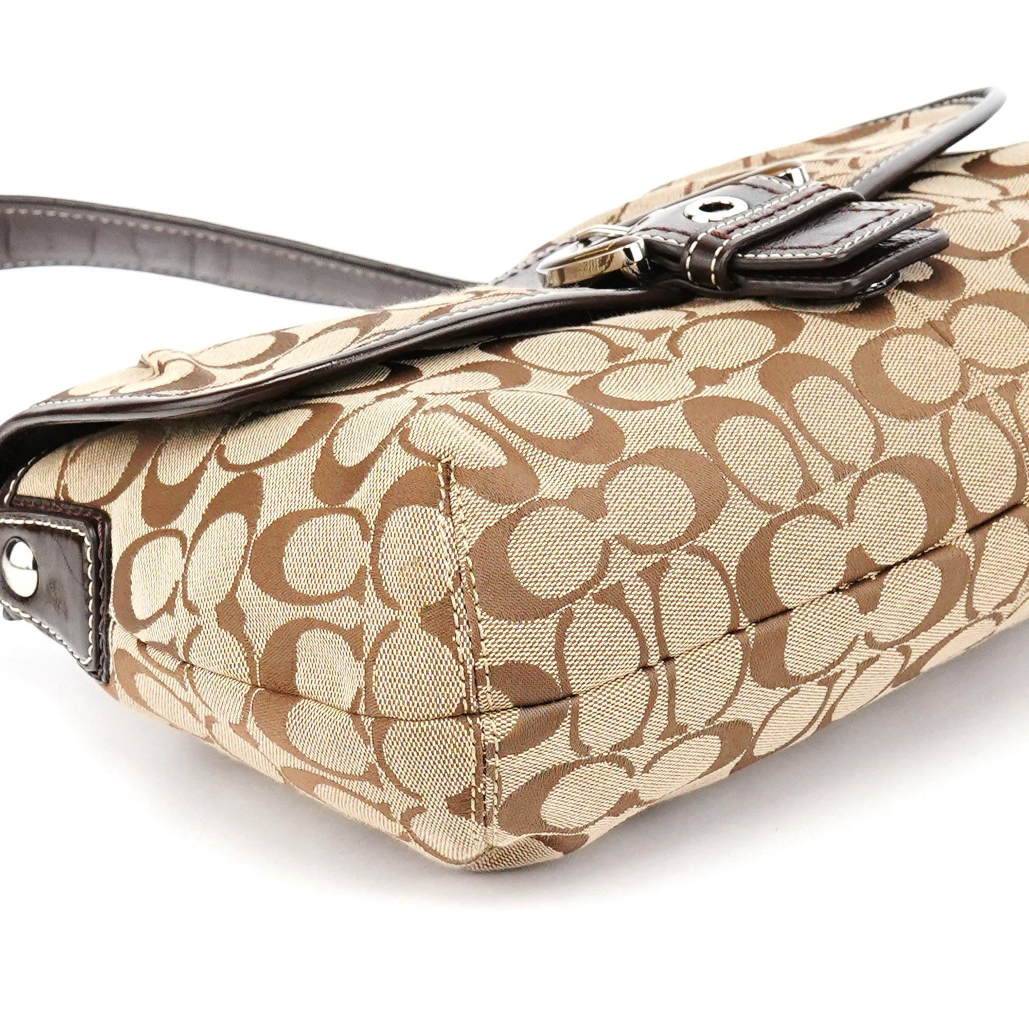 Designed in the mid 2000s, this Coach Soho shoulder bag is crafted from signature beige canvas with dark brown leather trim, finished with a curved flap silhouette, polished buckle closure, adjustable shoulder strap, and satin-lined interior with zip pocket.