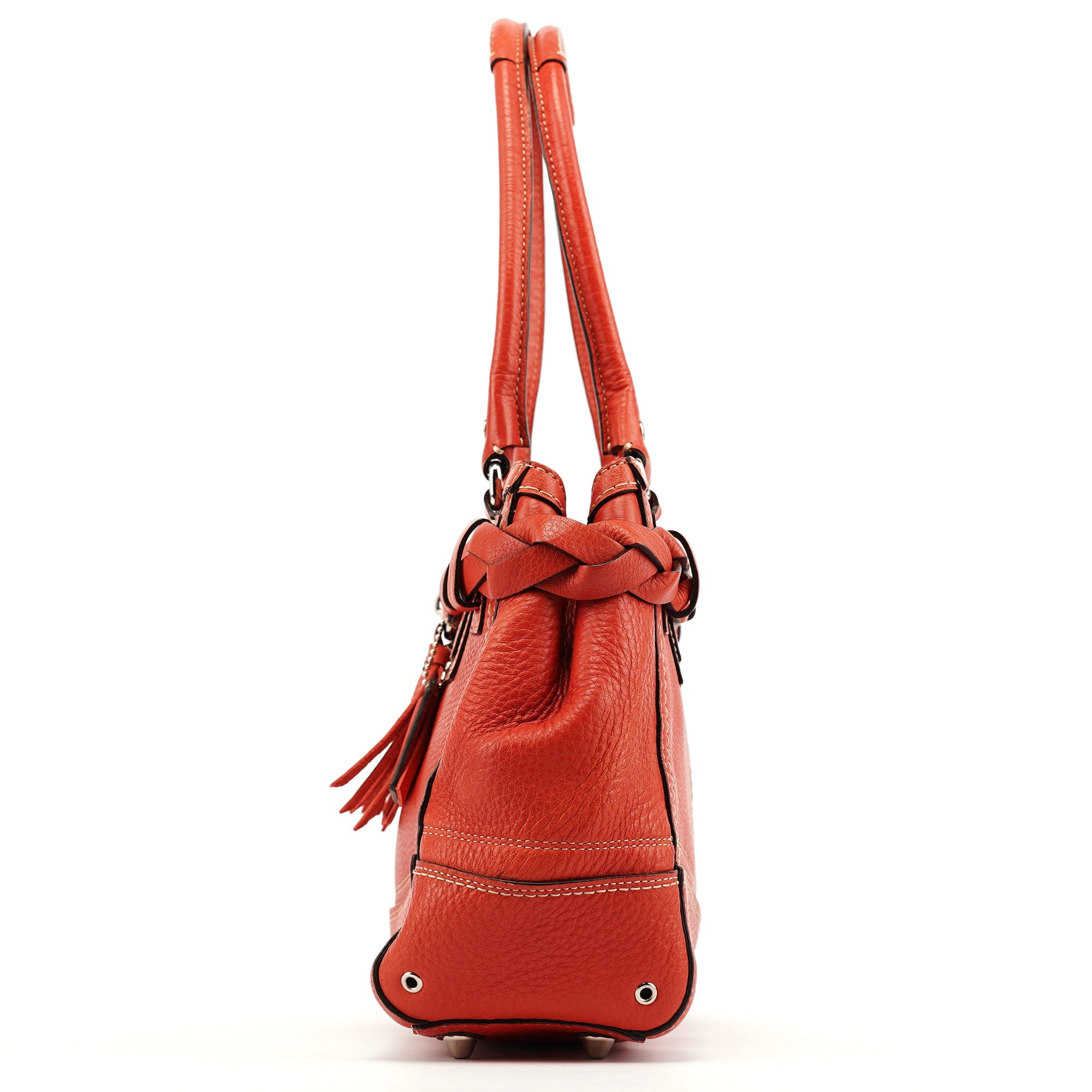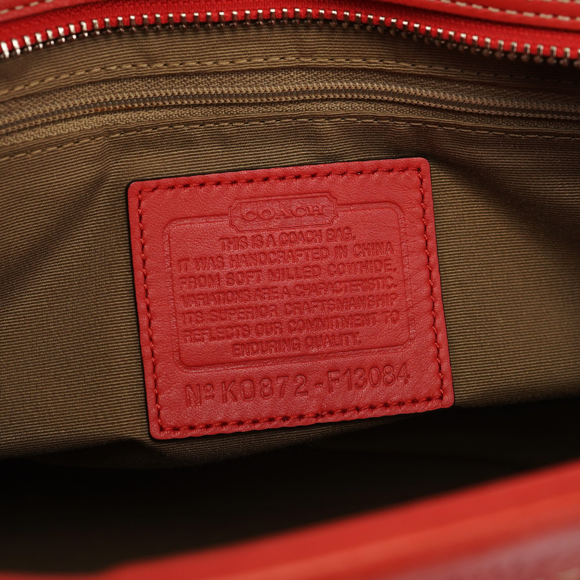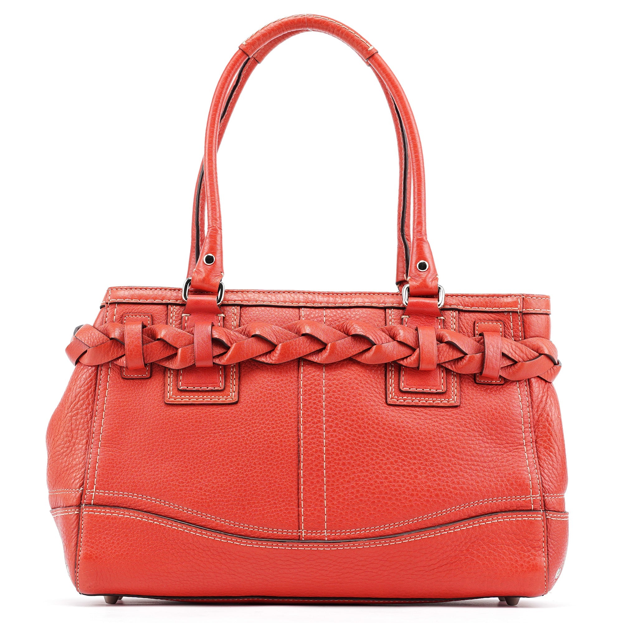 Designed in the early 2000s, this vintage Coach Soho tote bag is crafted from red pebbled leather with dual top handles. The structured silhouette is defined by polished hardware and a front belted accent finished with the signature Coach clasp closure. The interior features two fabric-lined compartments for organized storage.