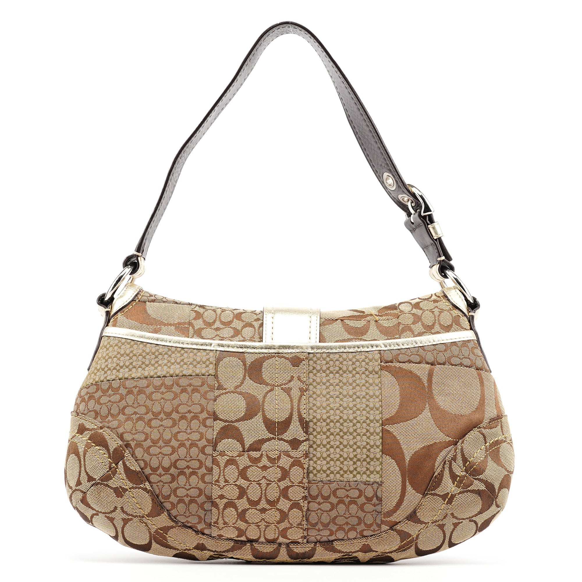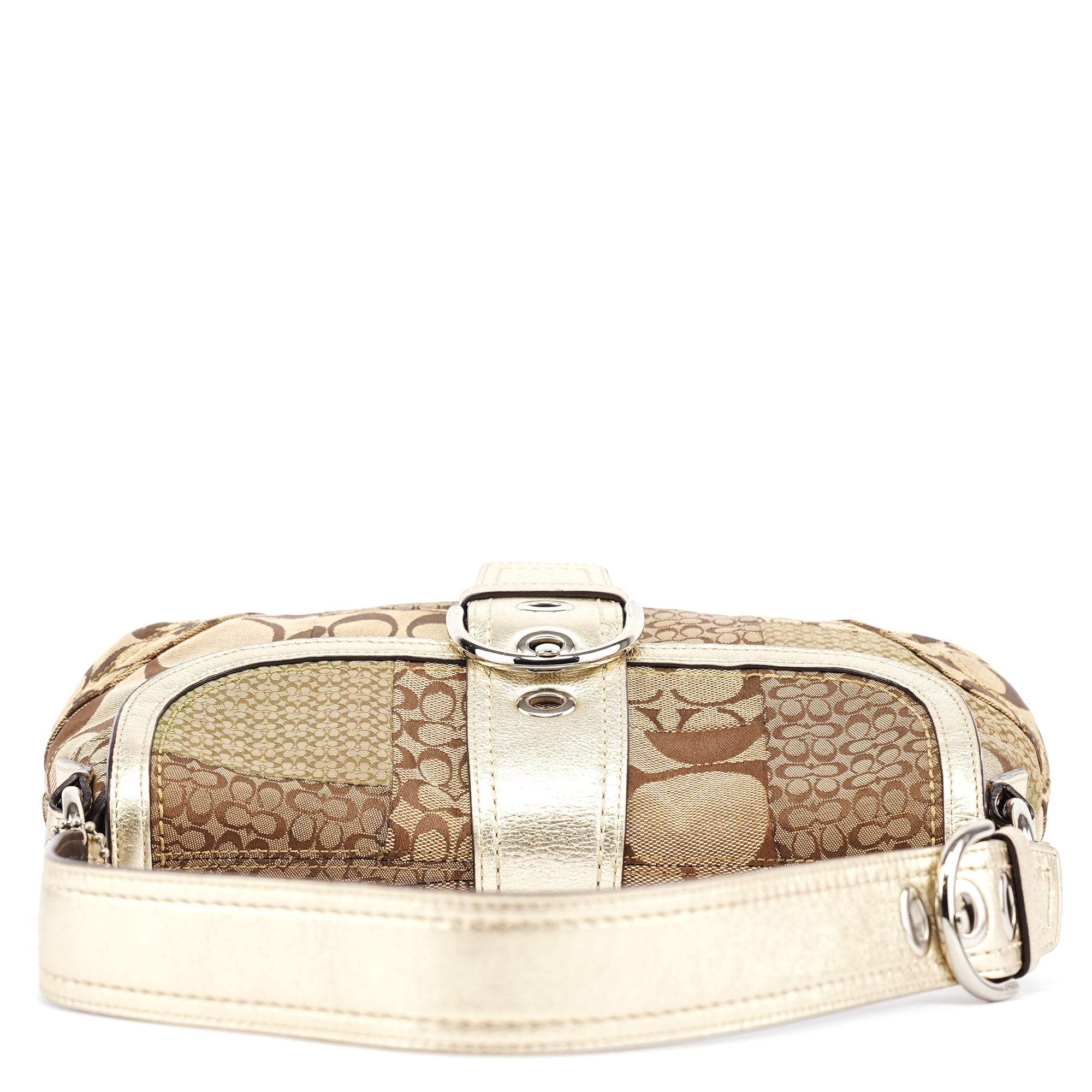 Designed in the early 2000s, this vintage Coach Patchwork Soho shoulder bag features a mixed-media construction of signature Coach canvas and leather in beige tones. The crescent-shaped silhouette showcases the brand's iconic patchwork design with silver-tone hardware and turn-lock closure, representing Coach's heritage craftsmanship and American luxury aesthetic.