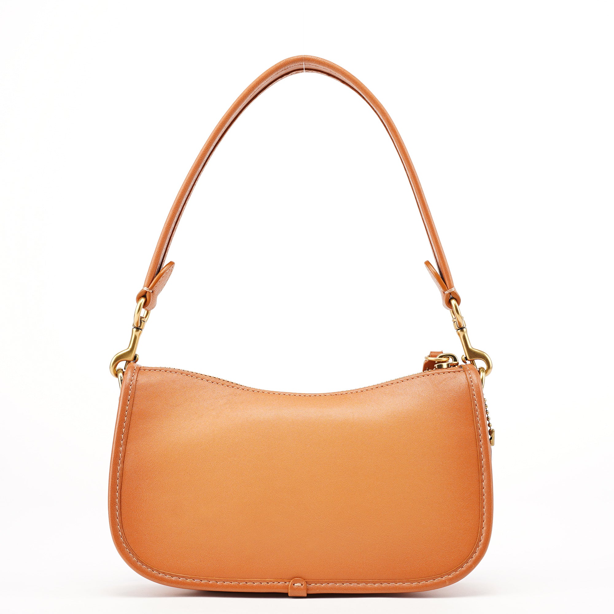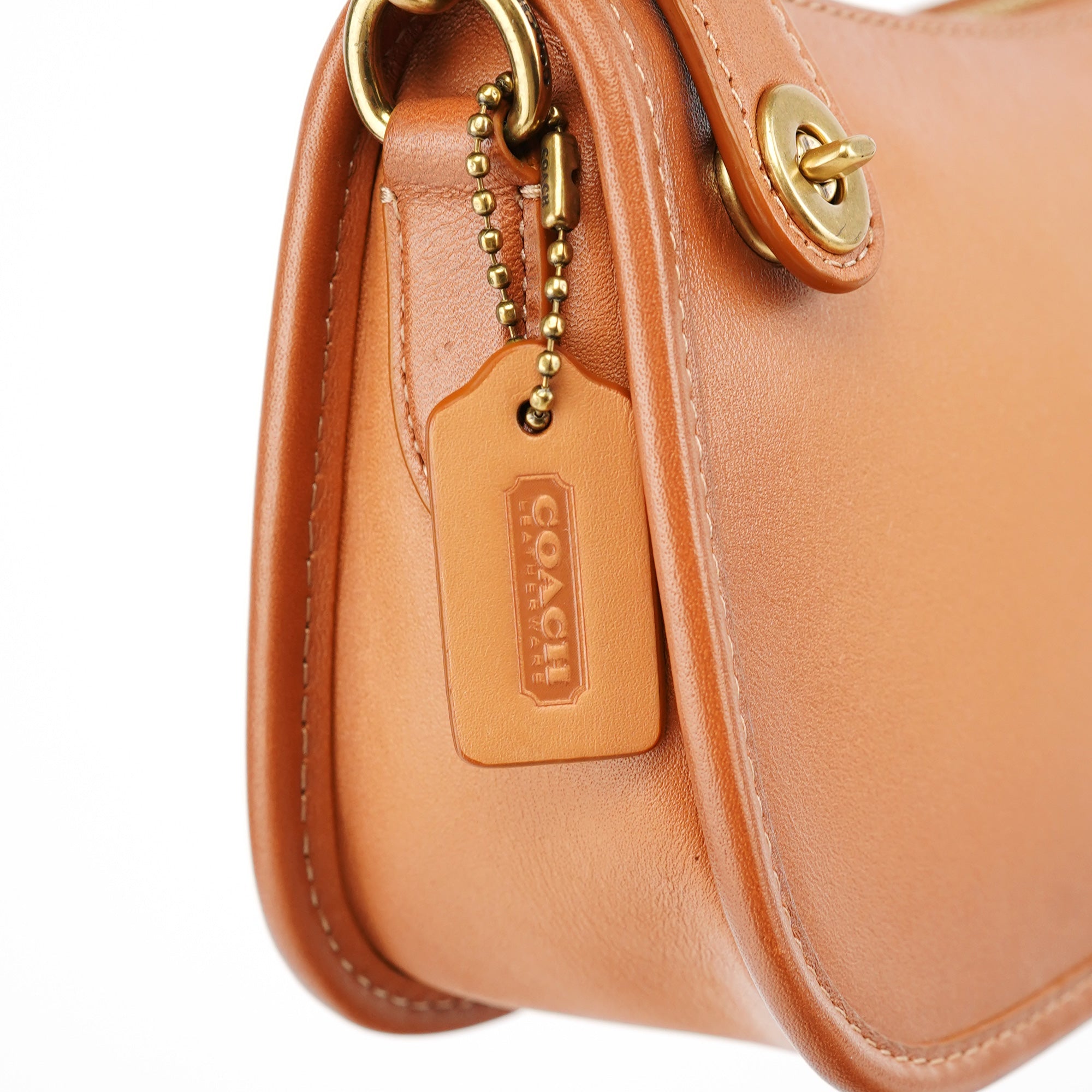 Designed in the 2020s, this limited edition Coach hobo bag is crafted from smooth tan leather with tonal stitching and gold-tone hardware. The softly curved silhouette is finished with a short leather strap, turnlock detail, and signature dog tag charm. The zip-top closure opens to a beige woven fabric lining with a leather creed patch.