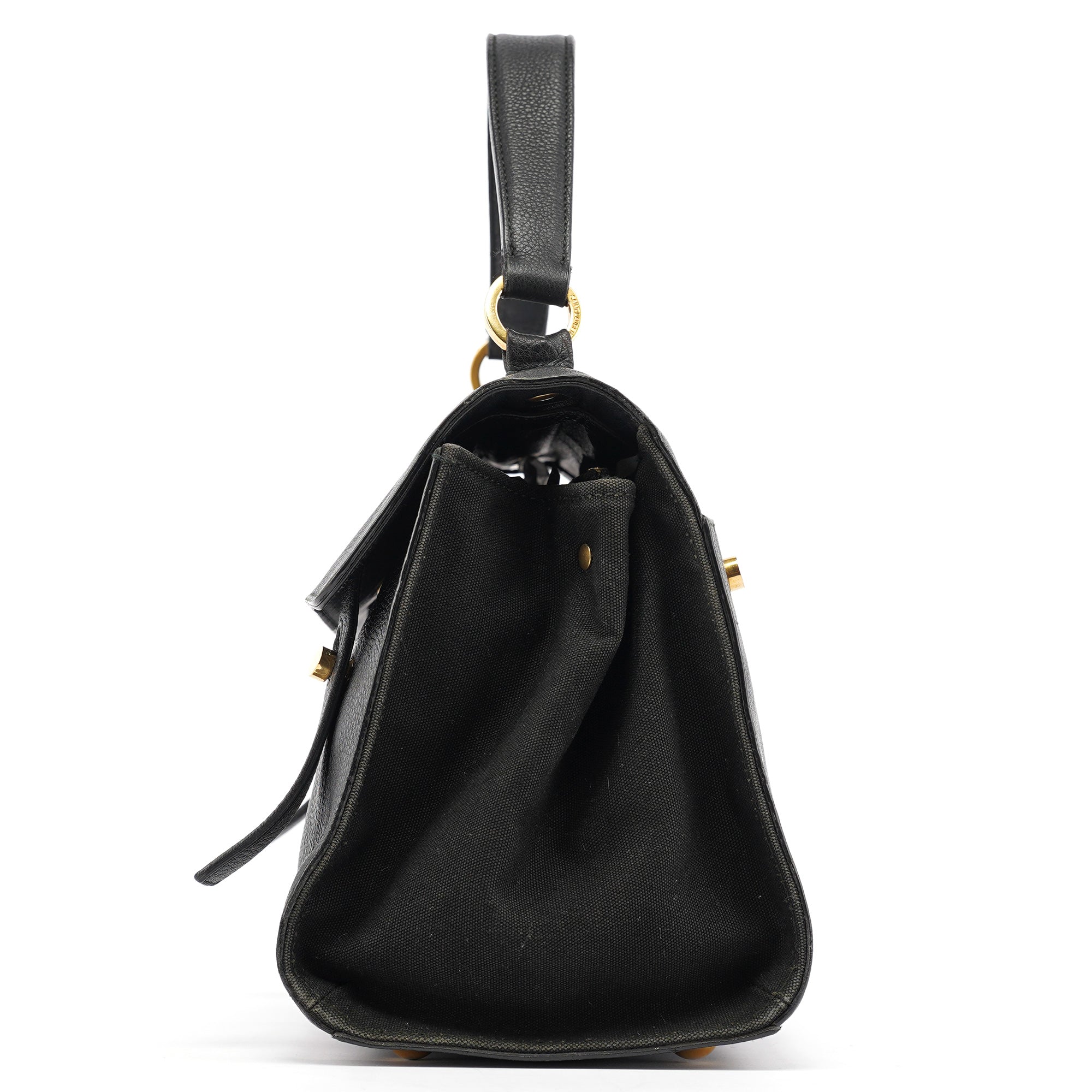 Designed in the late 2010s by Anthony Vaccarello, this Yves Saint Laurent Muse Two handbag features smooth black leather combined with canvas in a center zip partition design. The structured silhouette showcases a top handle with an additional detachable shoulder strap for versatile carry, gold-tone hardware including the signature YSL medallion turnlock closure, and a front pocket detail with decorative studs. The interior opens to reveal compartments with the brand's playful star-print lining.