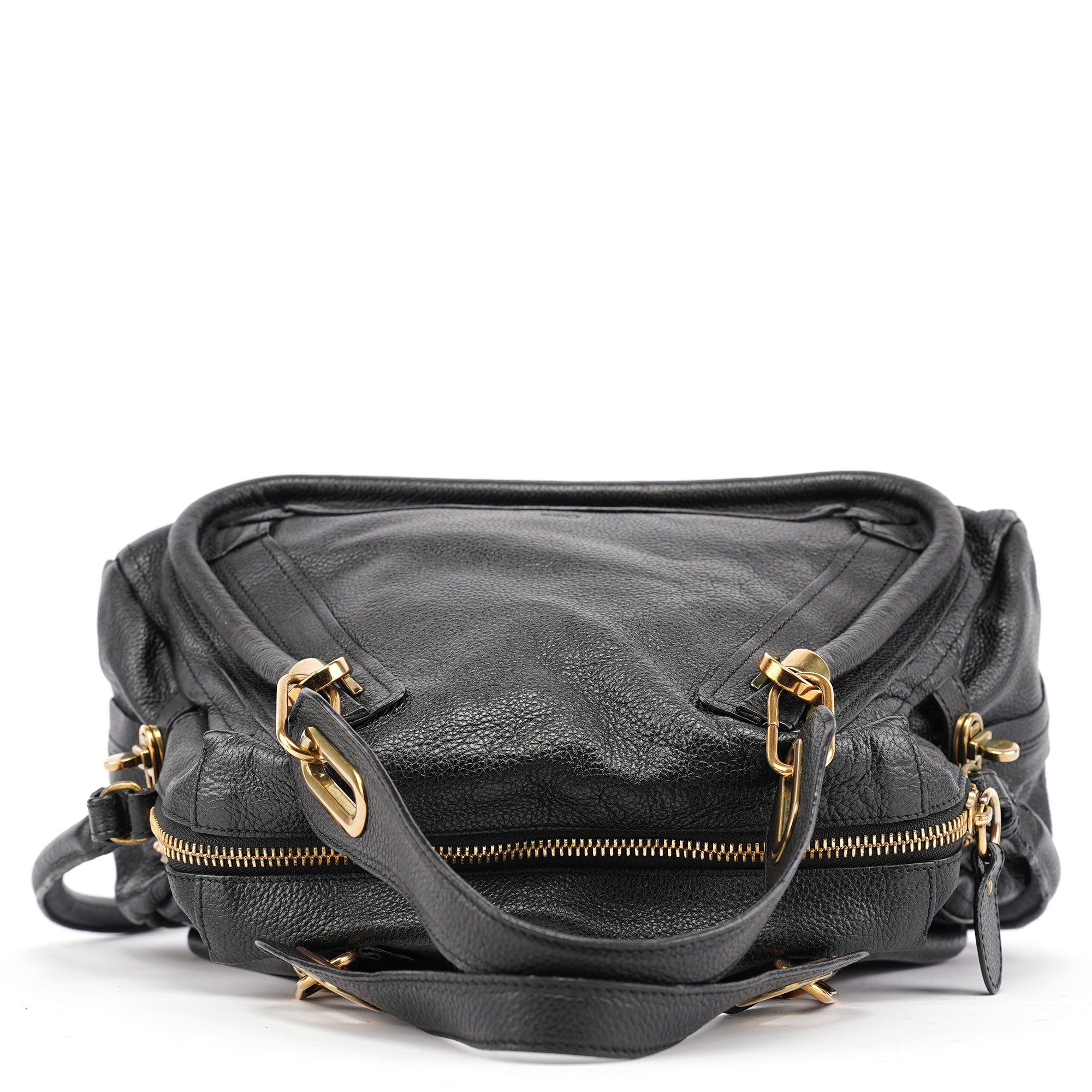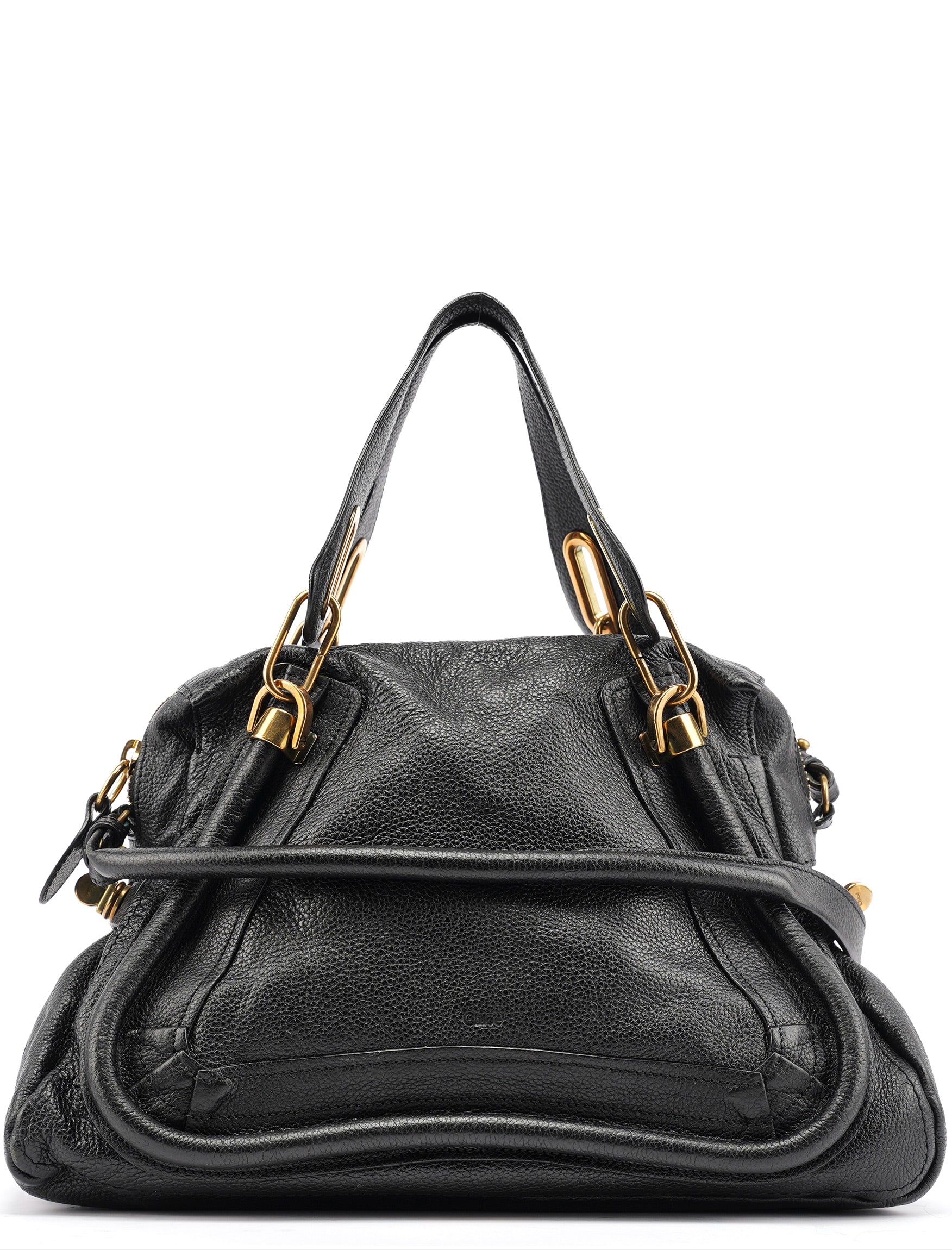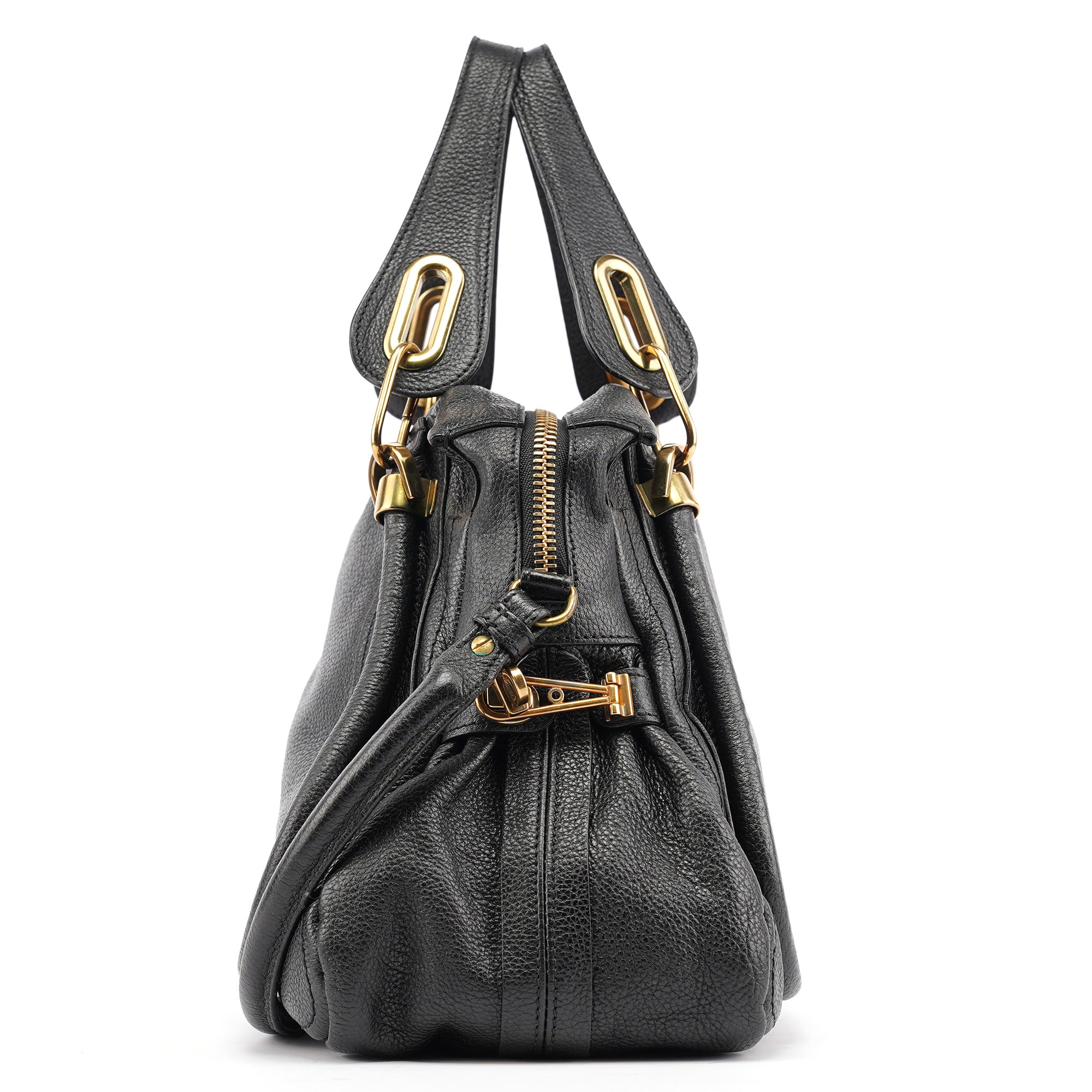 Designed in 2008 by Hannah MacGibbon, this vintage Chloé Paraty 2-way bag features soft black pebbled leather with the model's signature braided top handles and gleaming gold-tone hardware. The structured yet relaxed shape offers both top handles and a detachable shoulder strap, with a zip closure opening to a black fabric-lined interior with interior pockets.