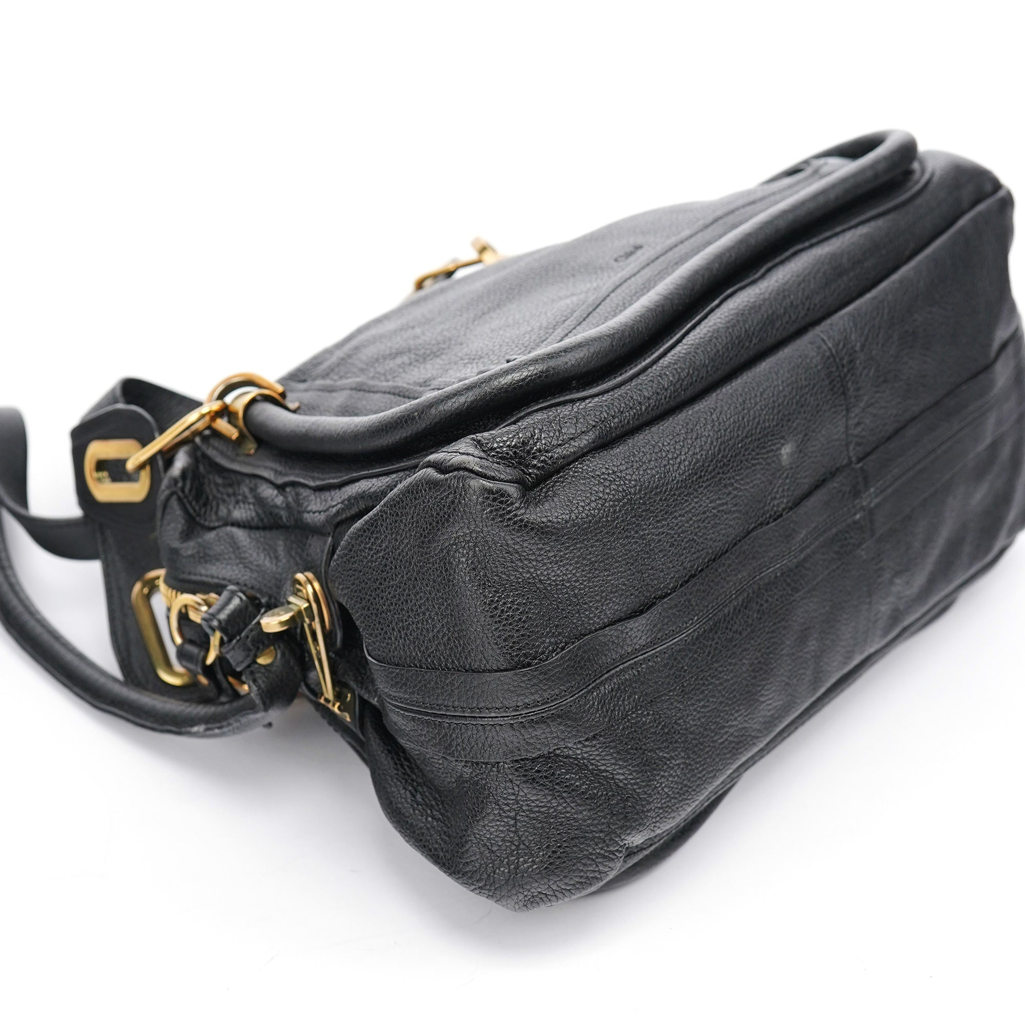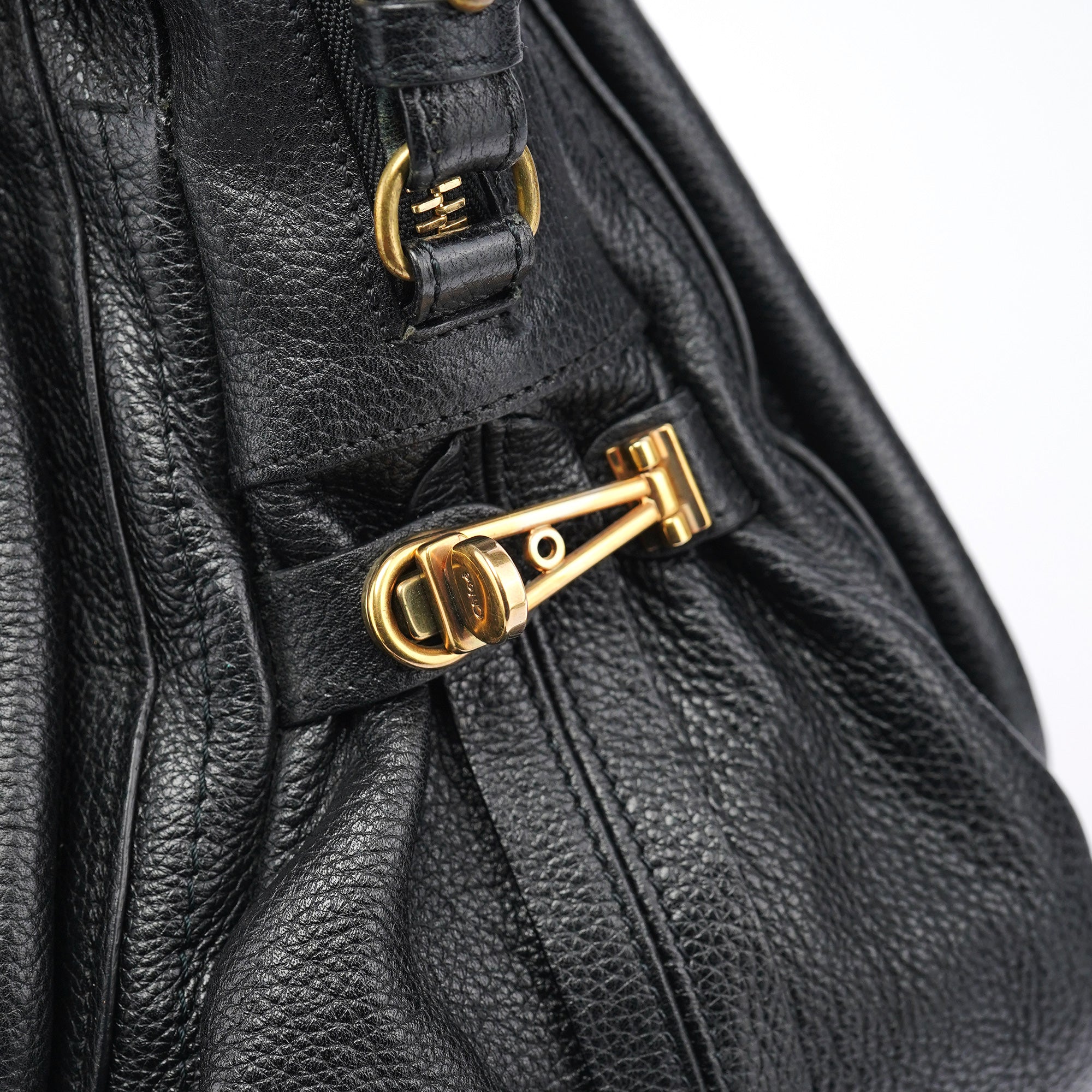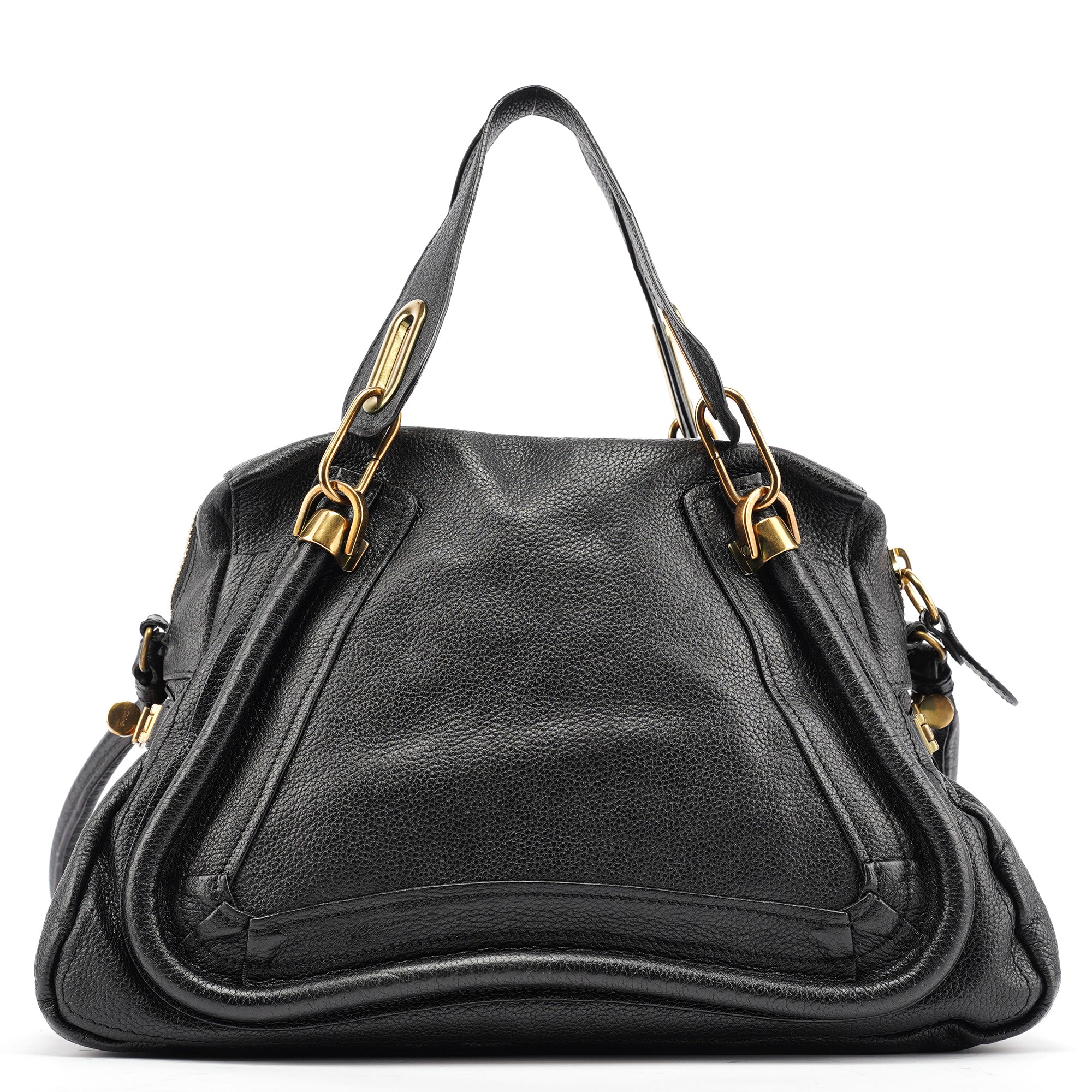 Designed in 2008 by Hannah MacGibbon, this vintage Chloé Paraty 2-way bag features soft black pebbled leather with the model's signature braided top handles and gleaming gold-tone hardware. The structured yet relaxed shape offers both top handles and a detachable shoulder strap, with a zip closure opening to a black fabric-lined interior with interior pockets.