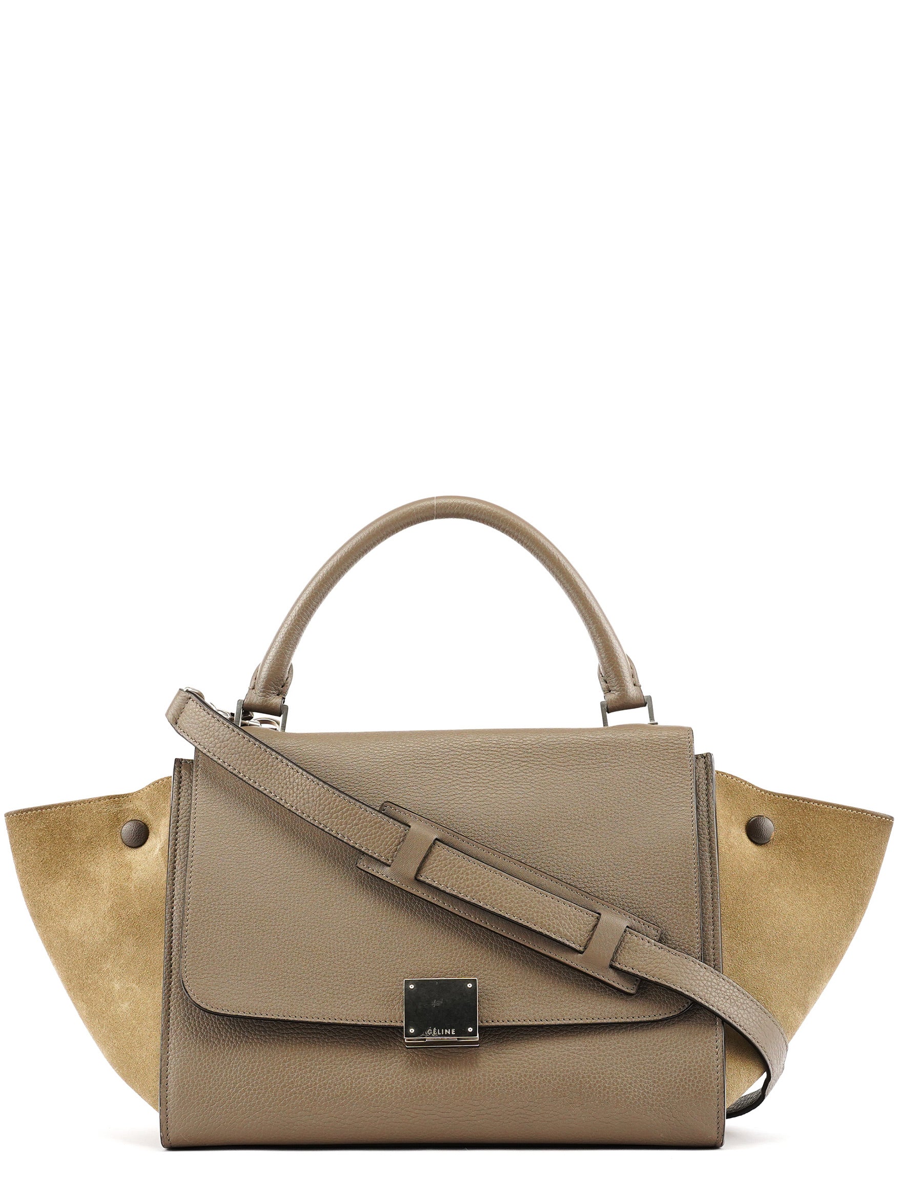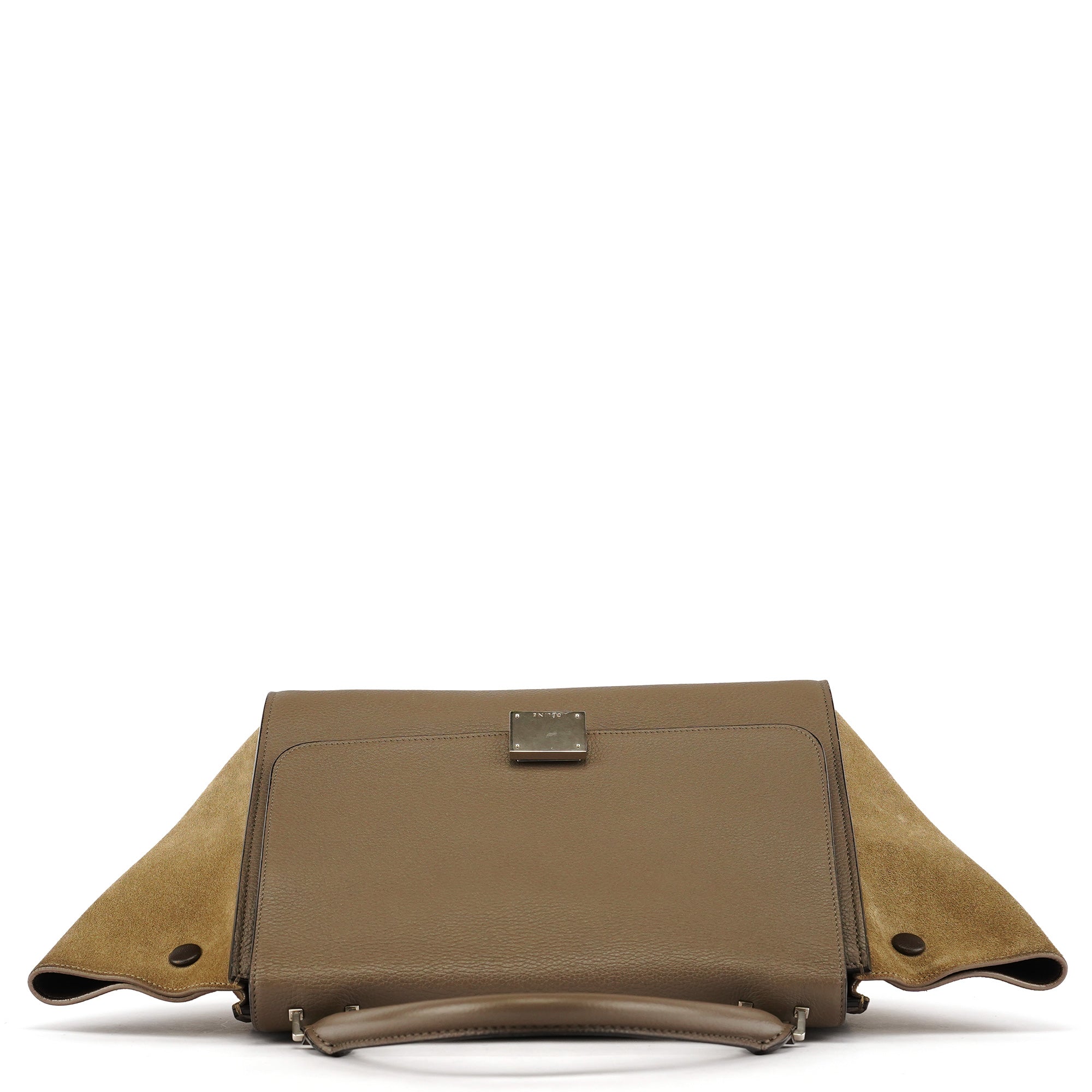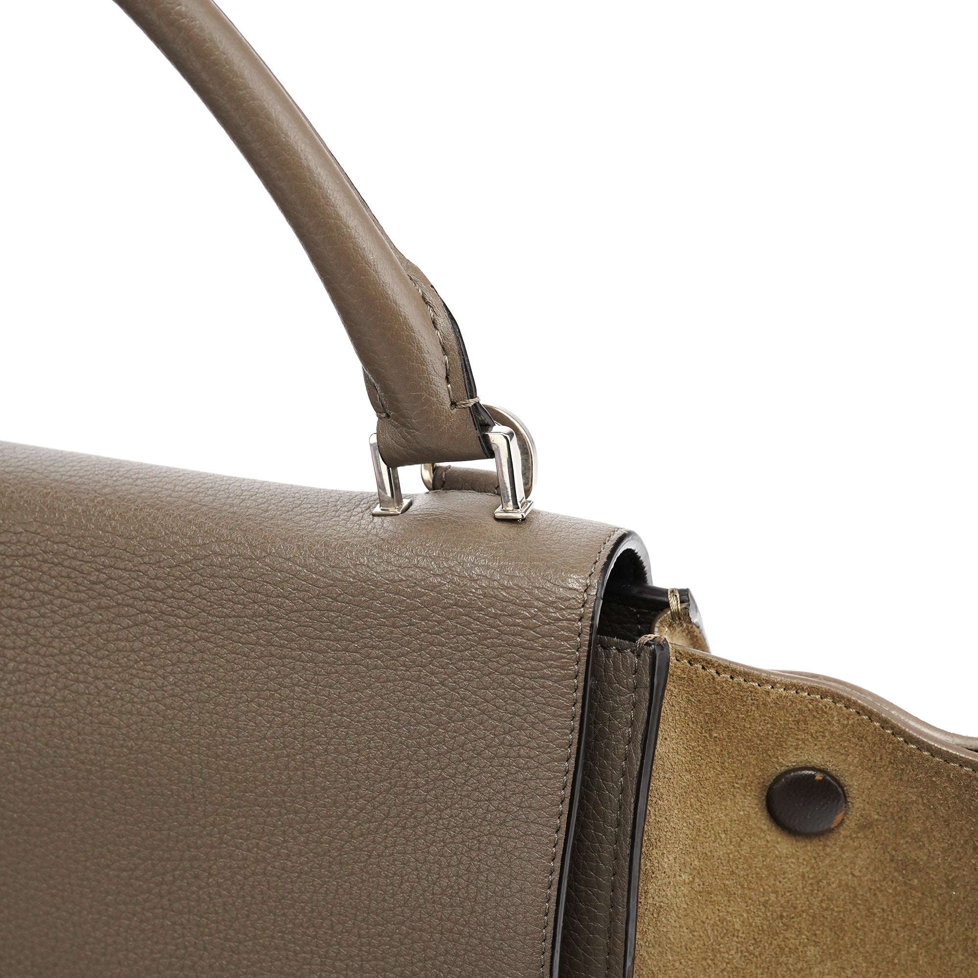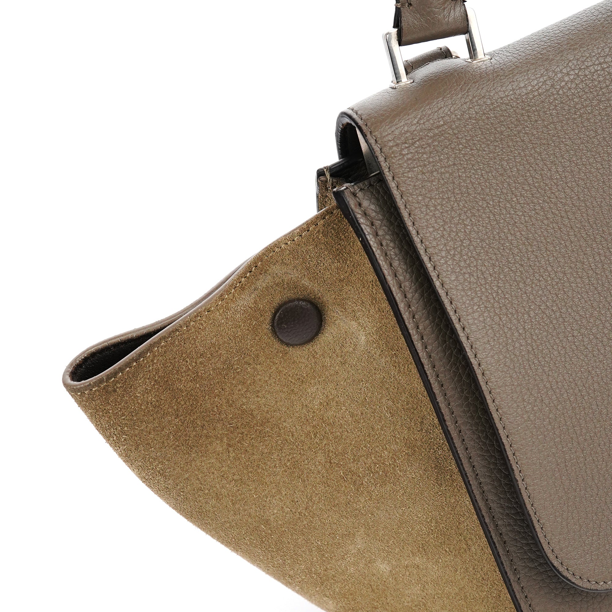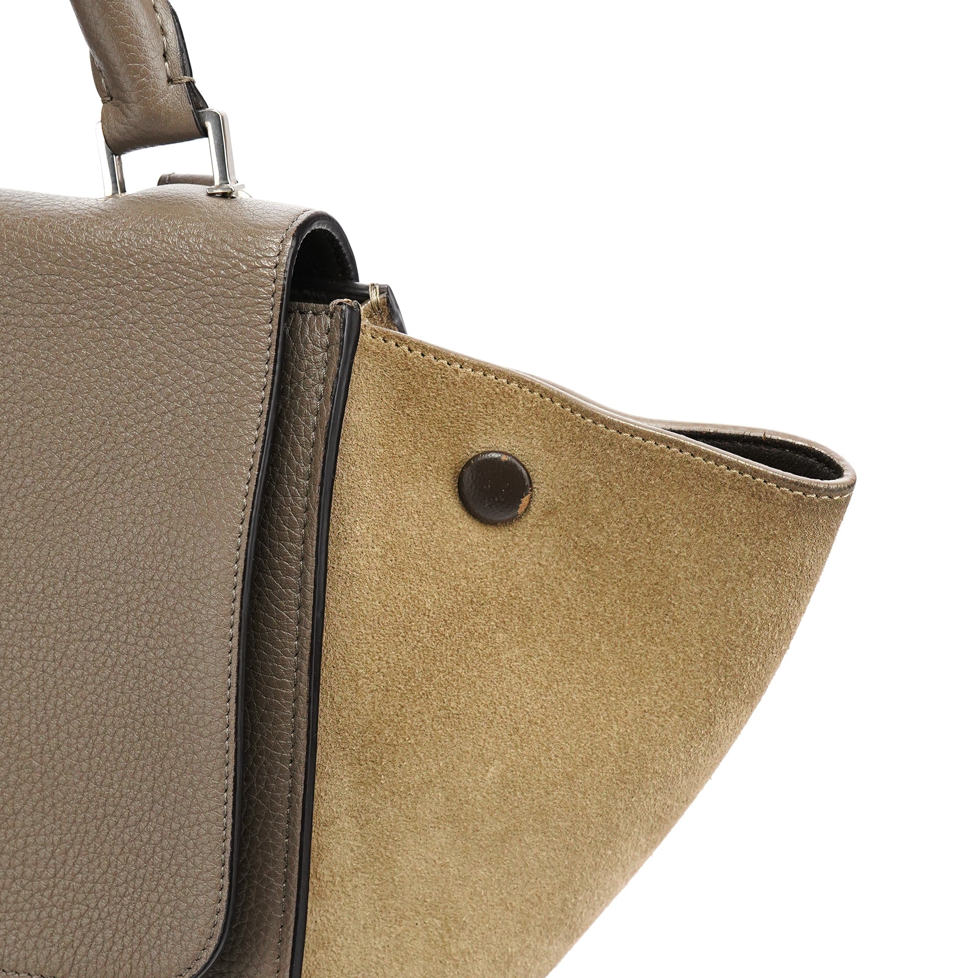 Designed in 2012 by Phoebe Philo, this Céline Trapeze combines taupe grained leather with contrasting gold suede side wings. The trapezoidal structure has a flap top closure and polished silver-tone hardware. It includes a leather top handle, a long detachable strap, and dual interior compartments.