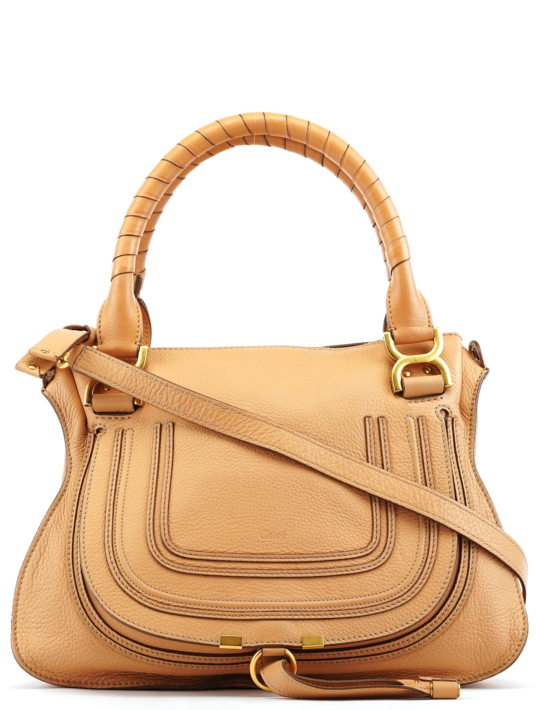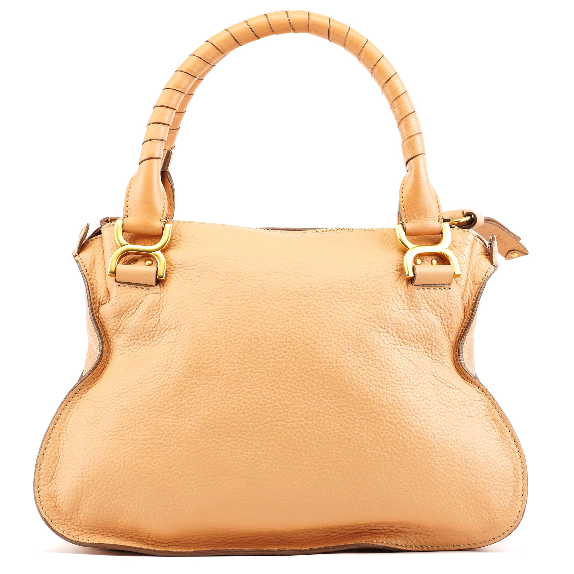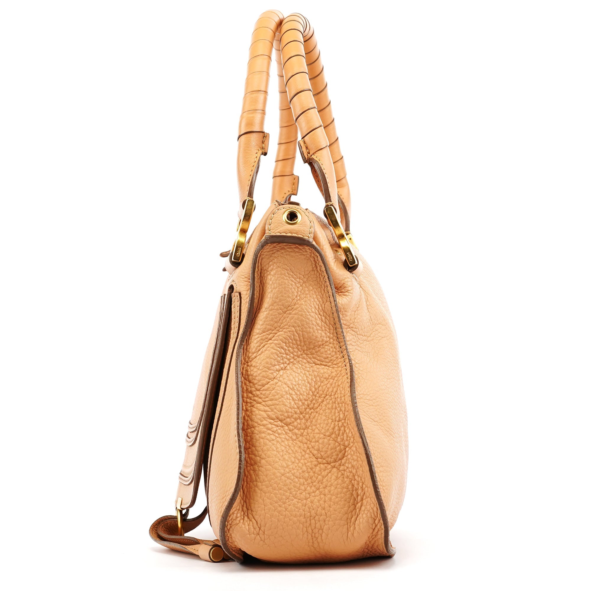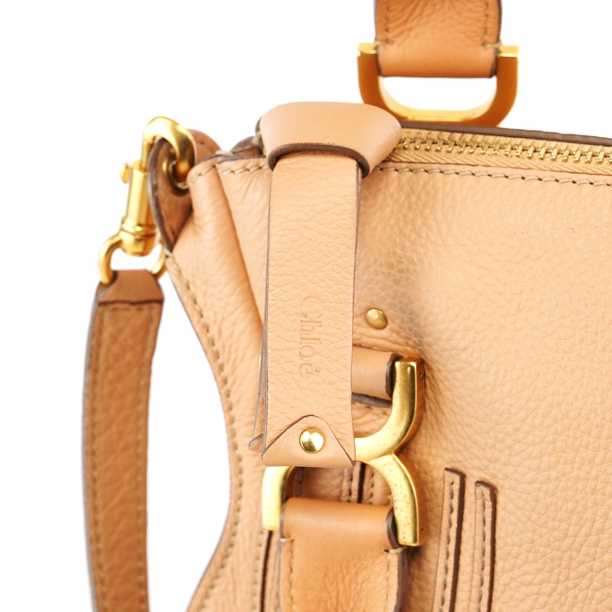 Designed in the 2010s, the Chloé Marcie 2-Way bag is crafted from beige grained leather with a structured yet bohemian silhouette. It features braided leather handles, brass hardware, and the signature curved front panel with layered stitching. The top-zip closure opens to a spacious canvas-lined interior with a zip pocket and slip compartments, while the detachable strap offers versatile styling options.