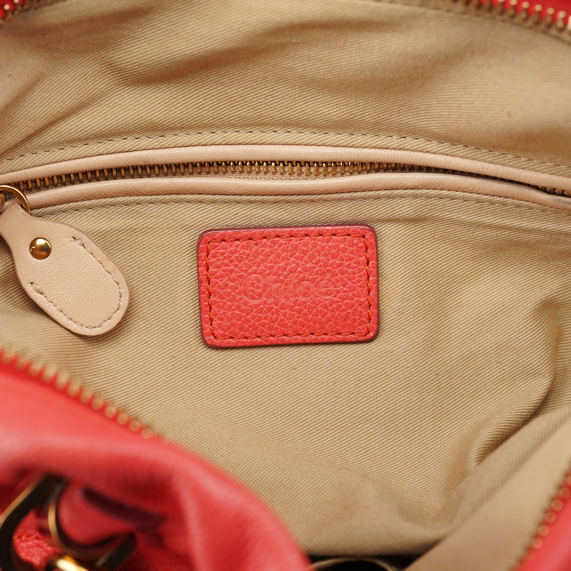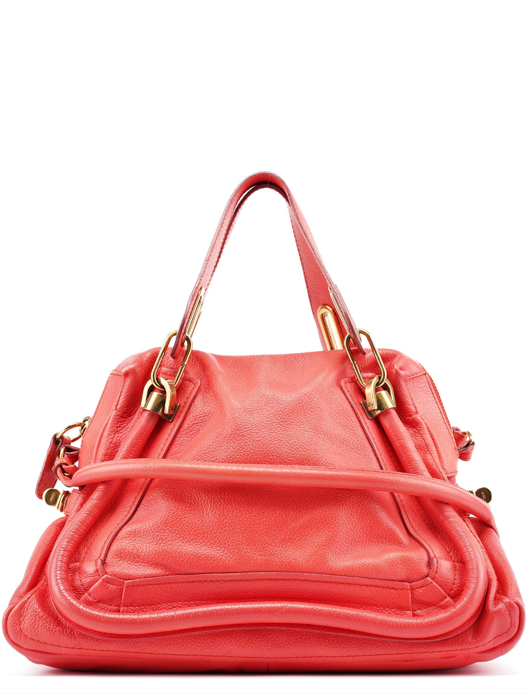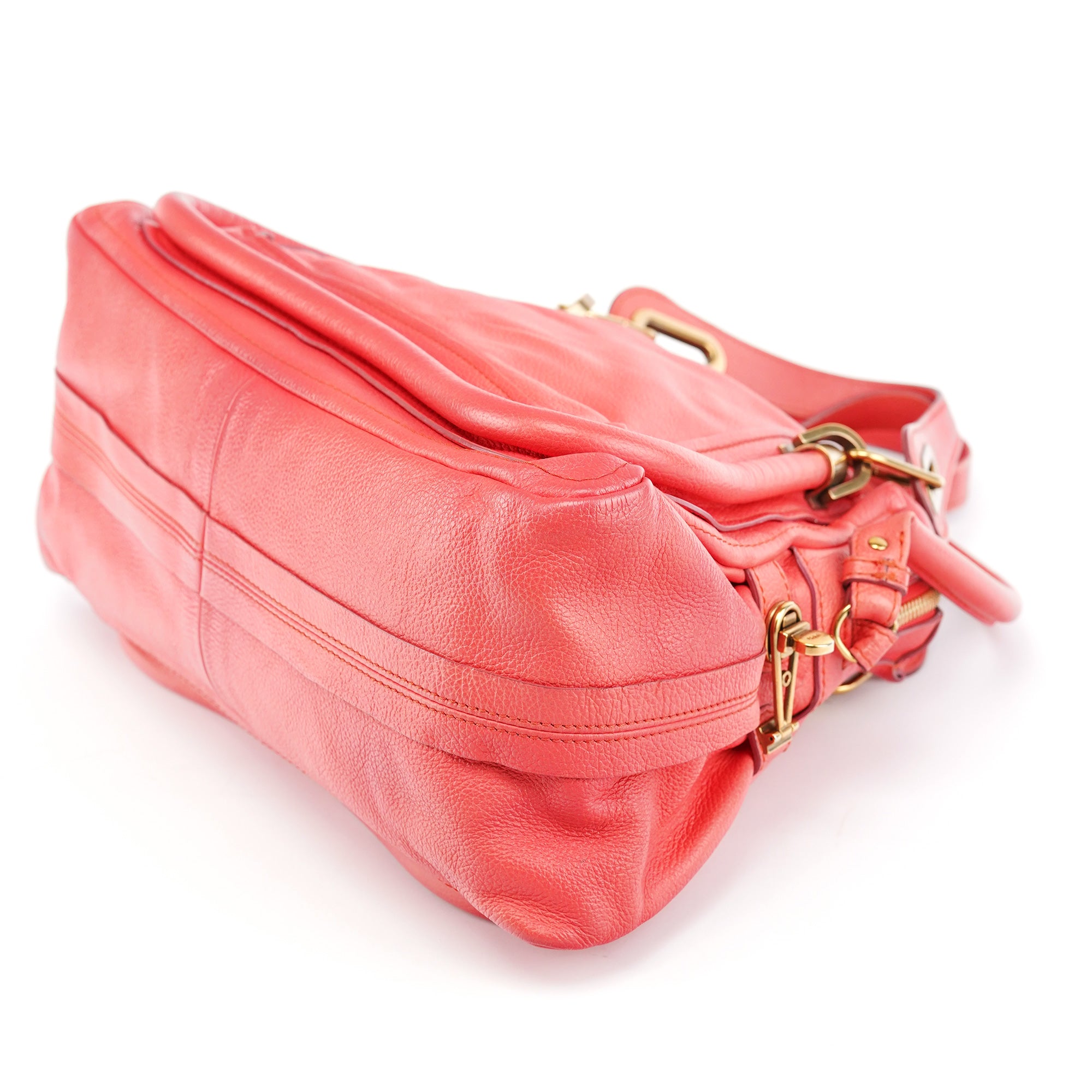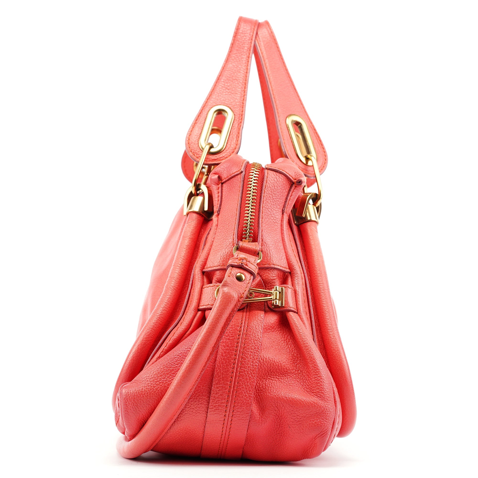 Designed in 2008 by Hannah MacGibbon, this vintage Chloé Paraty satchel showcases soft pink pebbled leather with the model's signature braided top handles and gold-tone hardware. The structured yet relaxed shape features both top handles and a detachable shoulder strap, with a zip closure opening to a neutral fabric-lined interior.