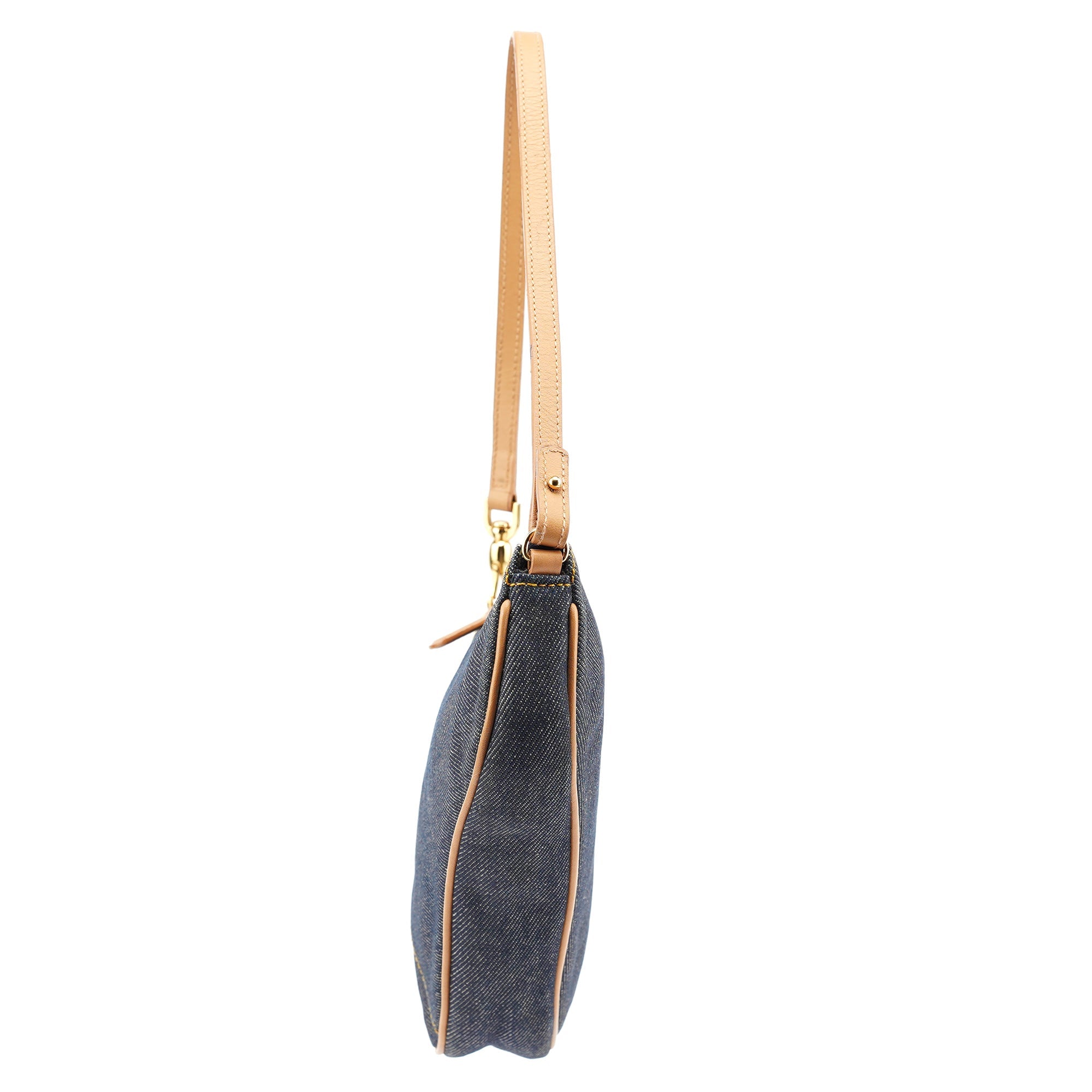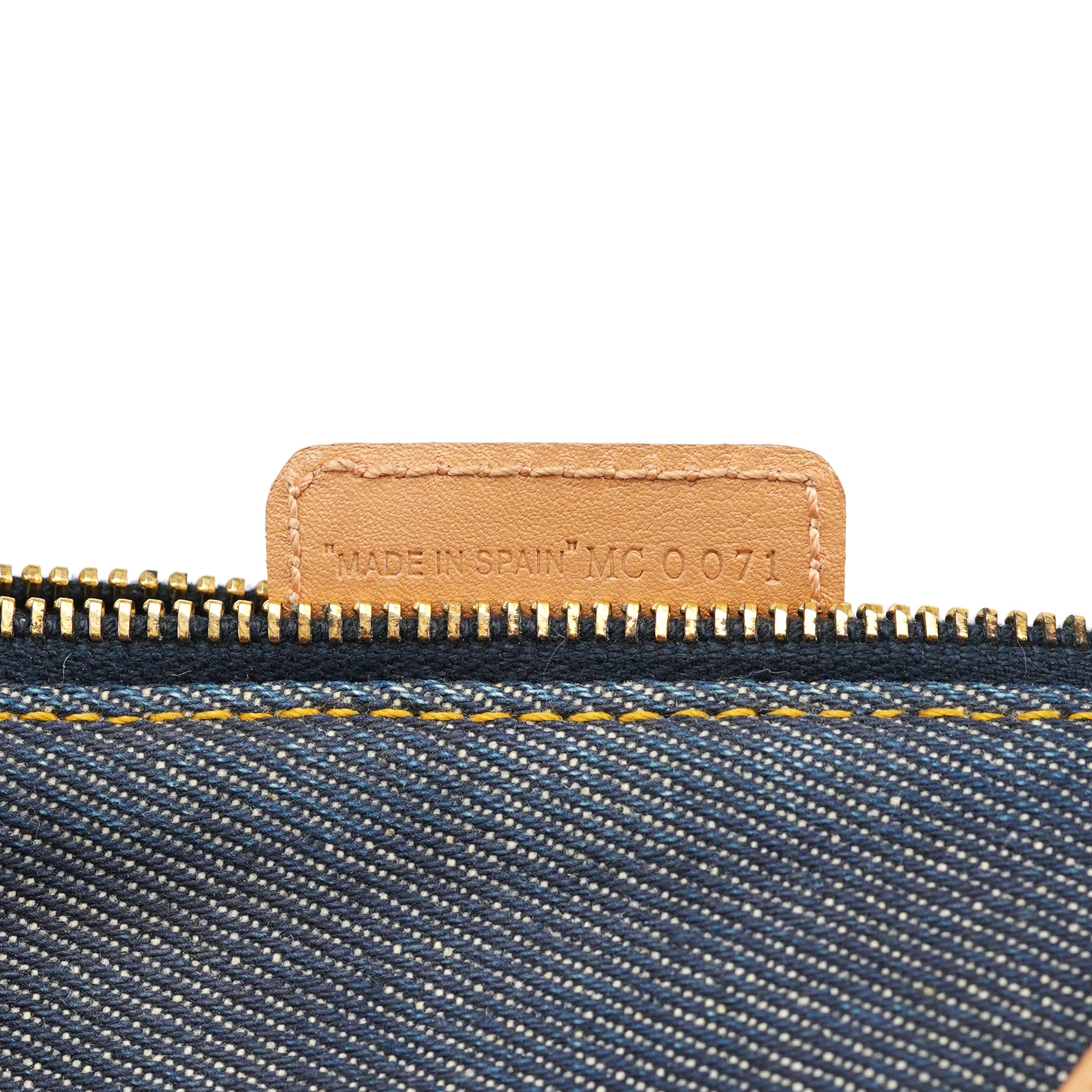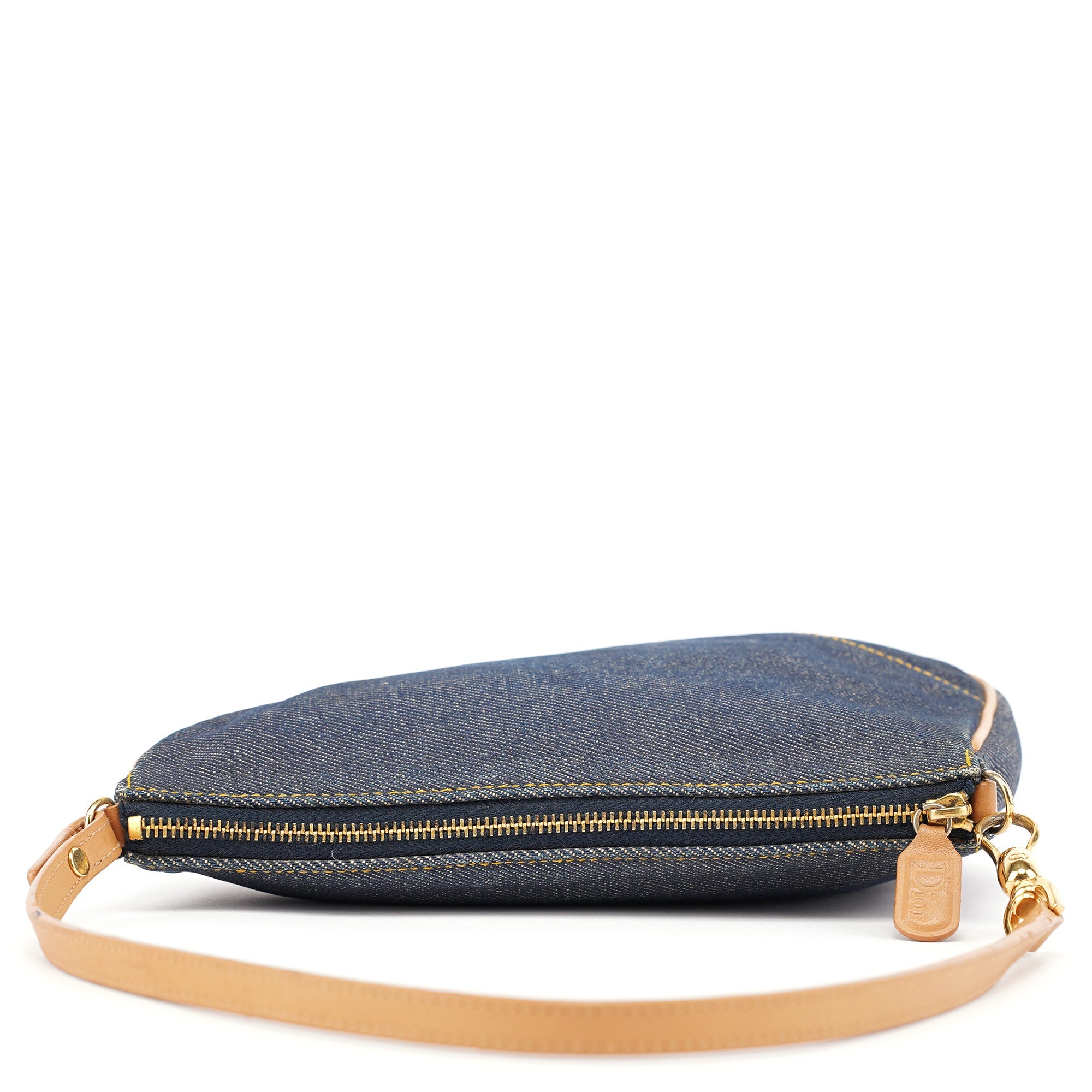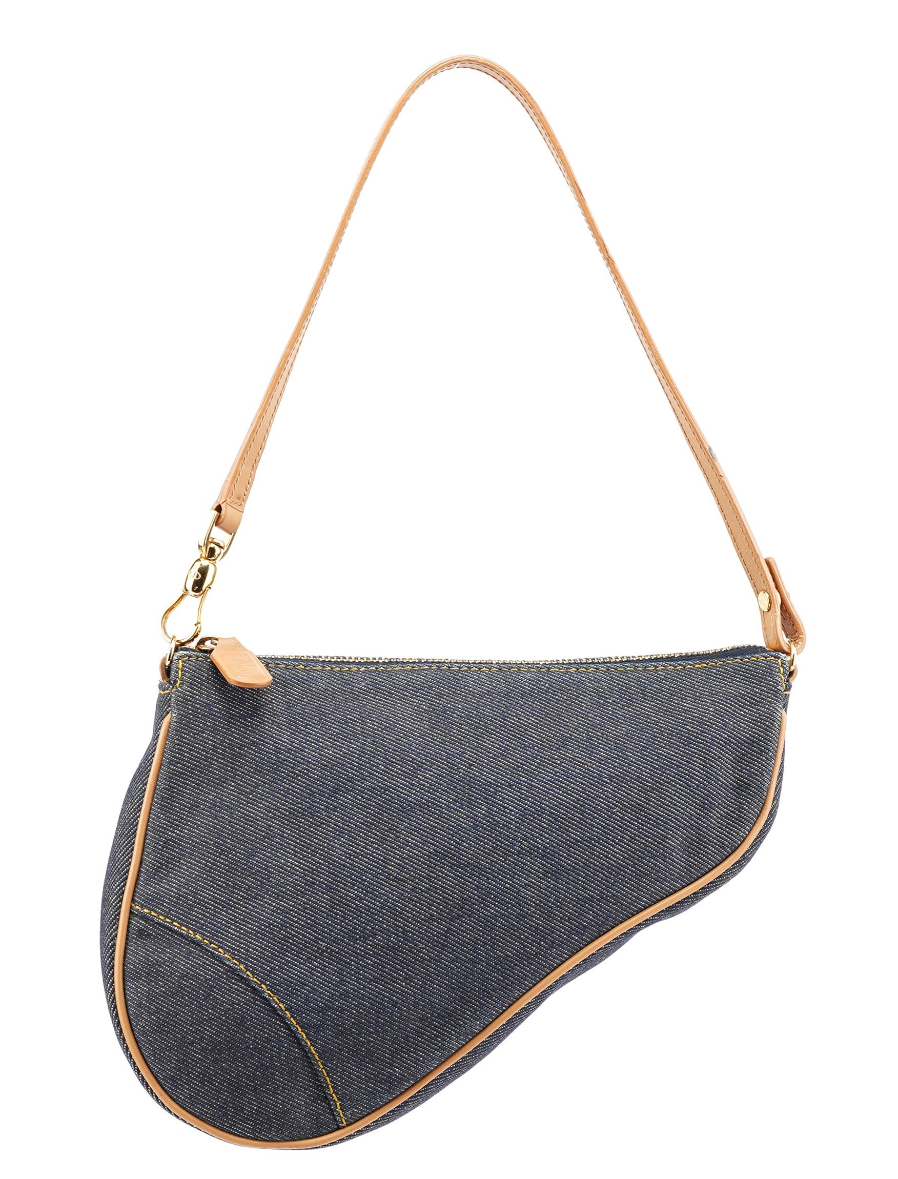 Designed in the early 2000s by John Galliano, this Dior mini Saddle shoulder bag is crafted from navy denim with natural Vachetta leather trim and gold-tone hardware. Its iconic asymmetrical silhouette is finished with a zip closure and a single flat shoulder strap. The interior is lined in fabric.