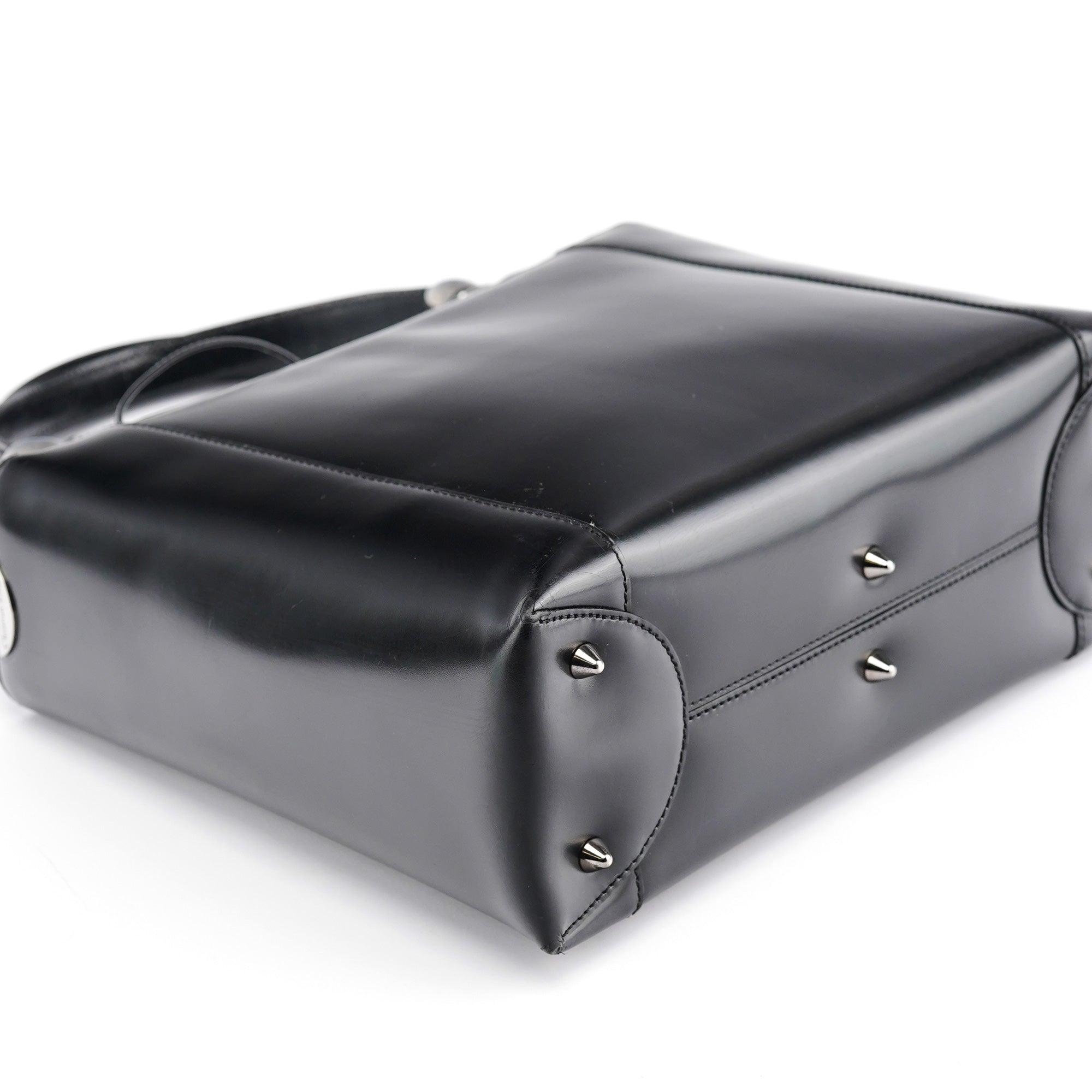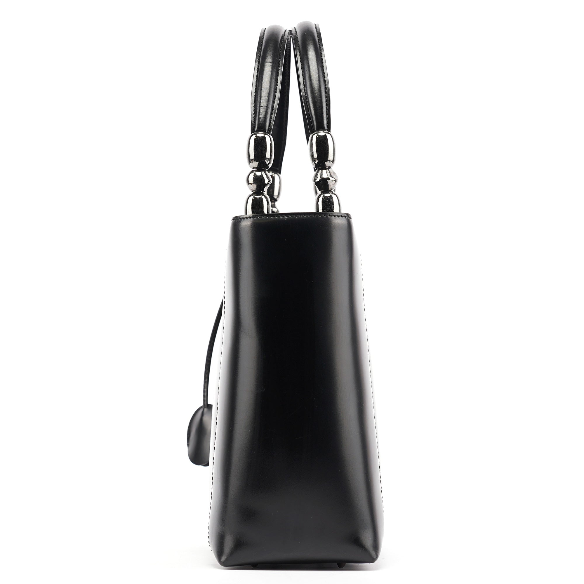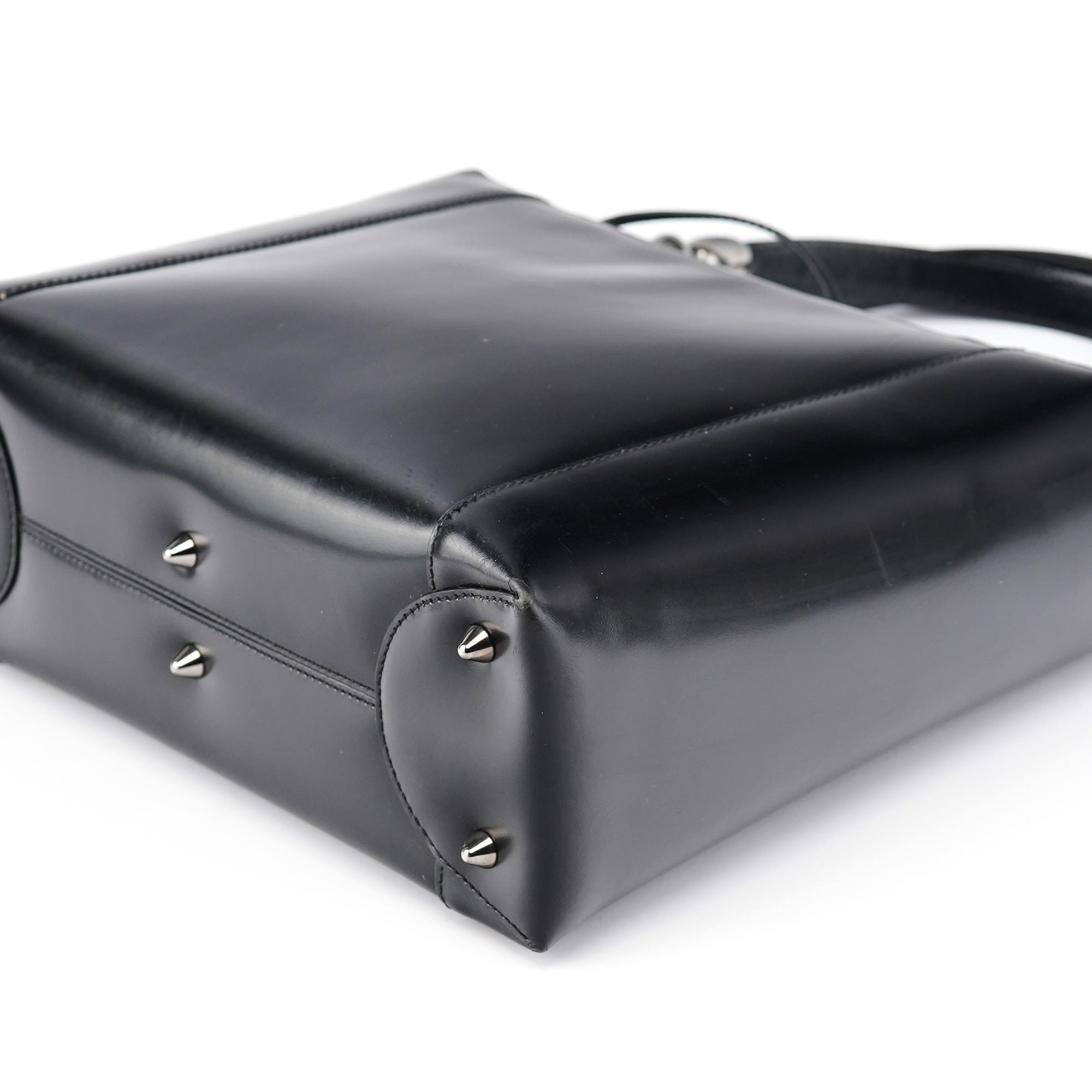 Designed in the early 2000s by John Galliano, this vintage Dior Lady Dior tote epitomizes the house's architectural elegance with its smooth black calfskin leather and signature cannage topstitching. The structured silhouette features dual rolled leather handles with decorative silver-tone pearl logo plate detailing, while the spacious interior is lined in signature grey Dior monogram fabric.