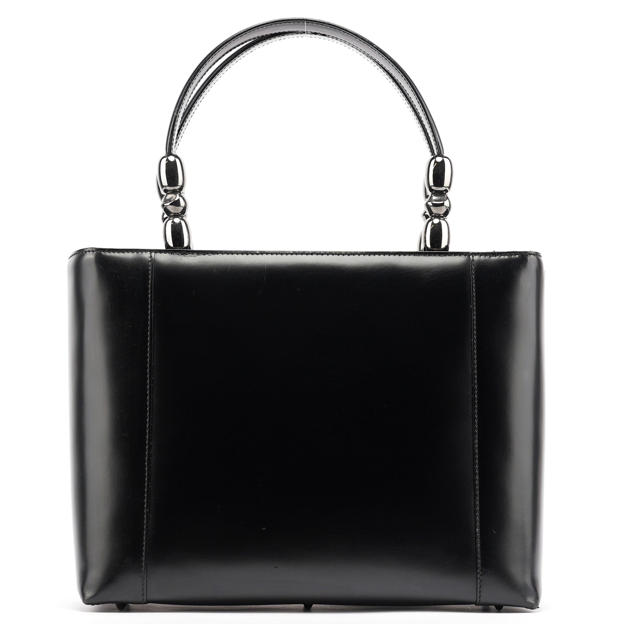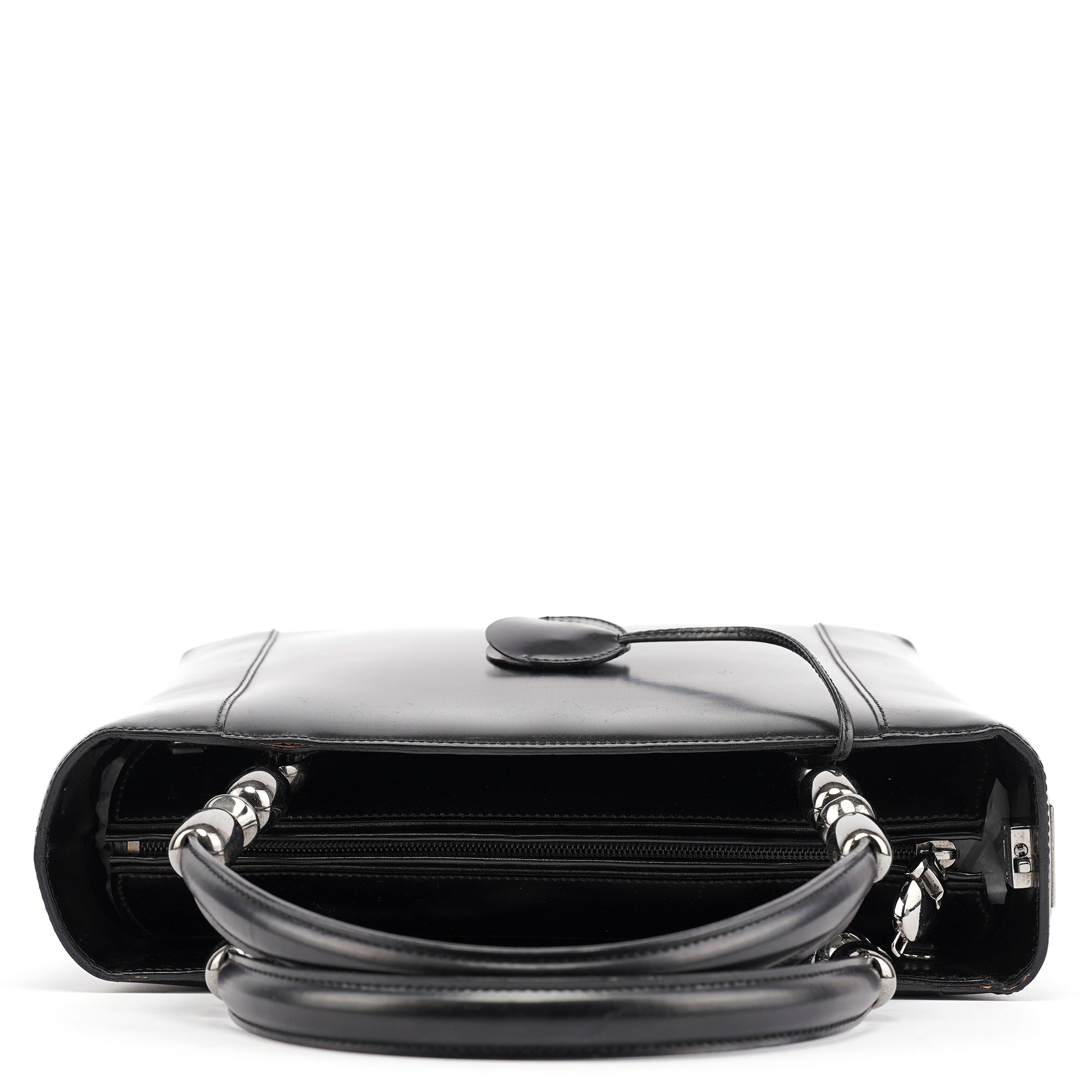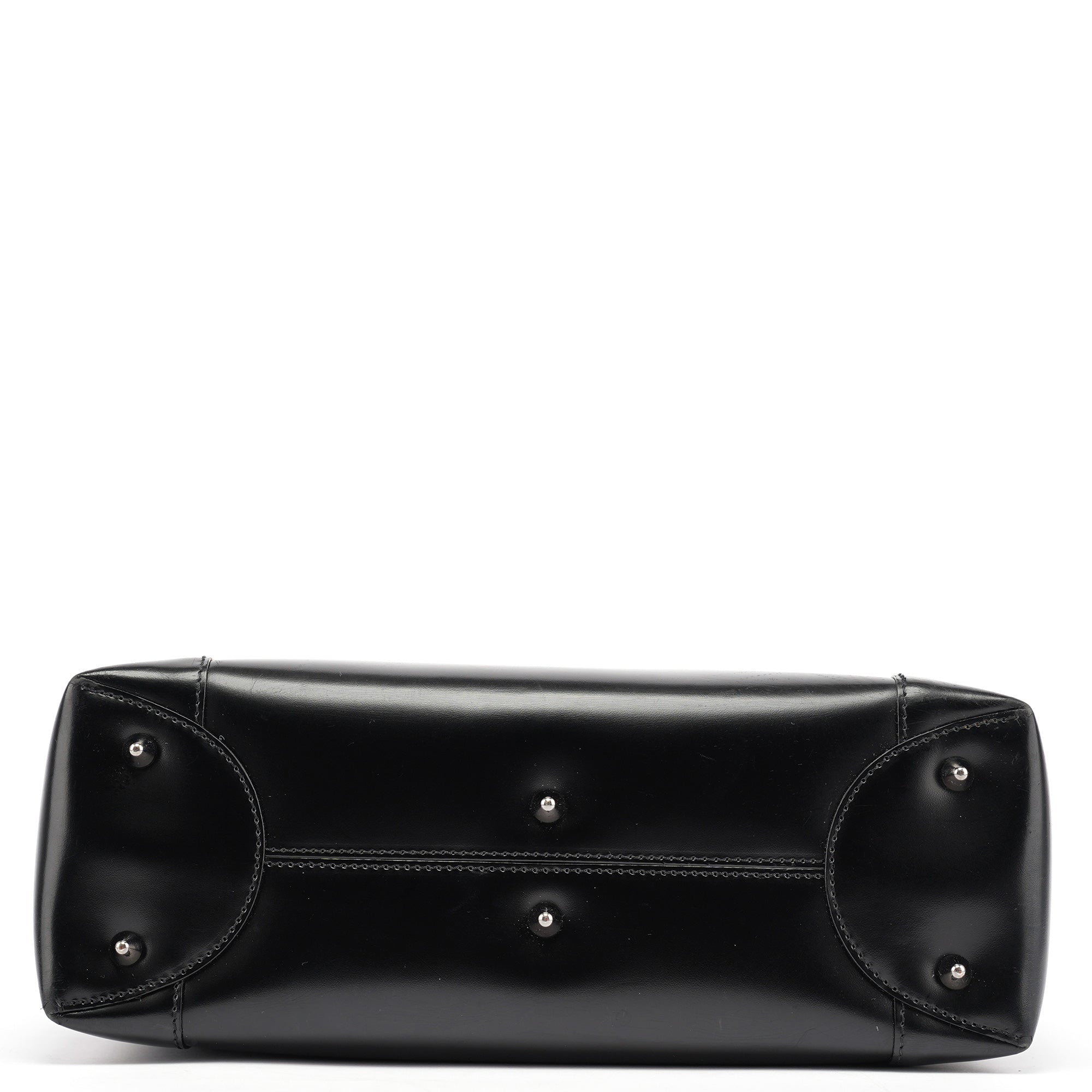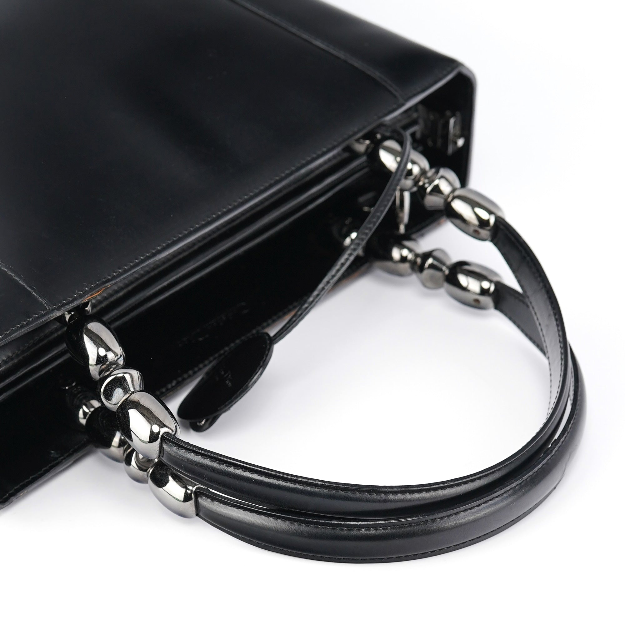 Designed in the early 2000s by John Galliano, this vintage Dior Lady Dior tote epitomizes the house's architectural elegance with its smooth black calfskin leather and signature cannage topstitching. The structured silhouette features dual rolled leather handles with decorative silver-tone pearl logo plate detailing, while the spacious interior is lined in signature grey Dior monogram fabric.