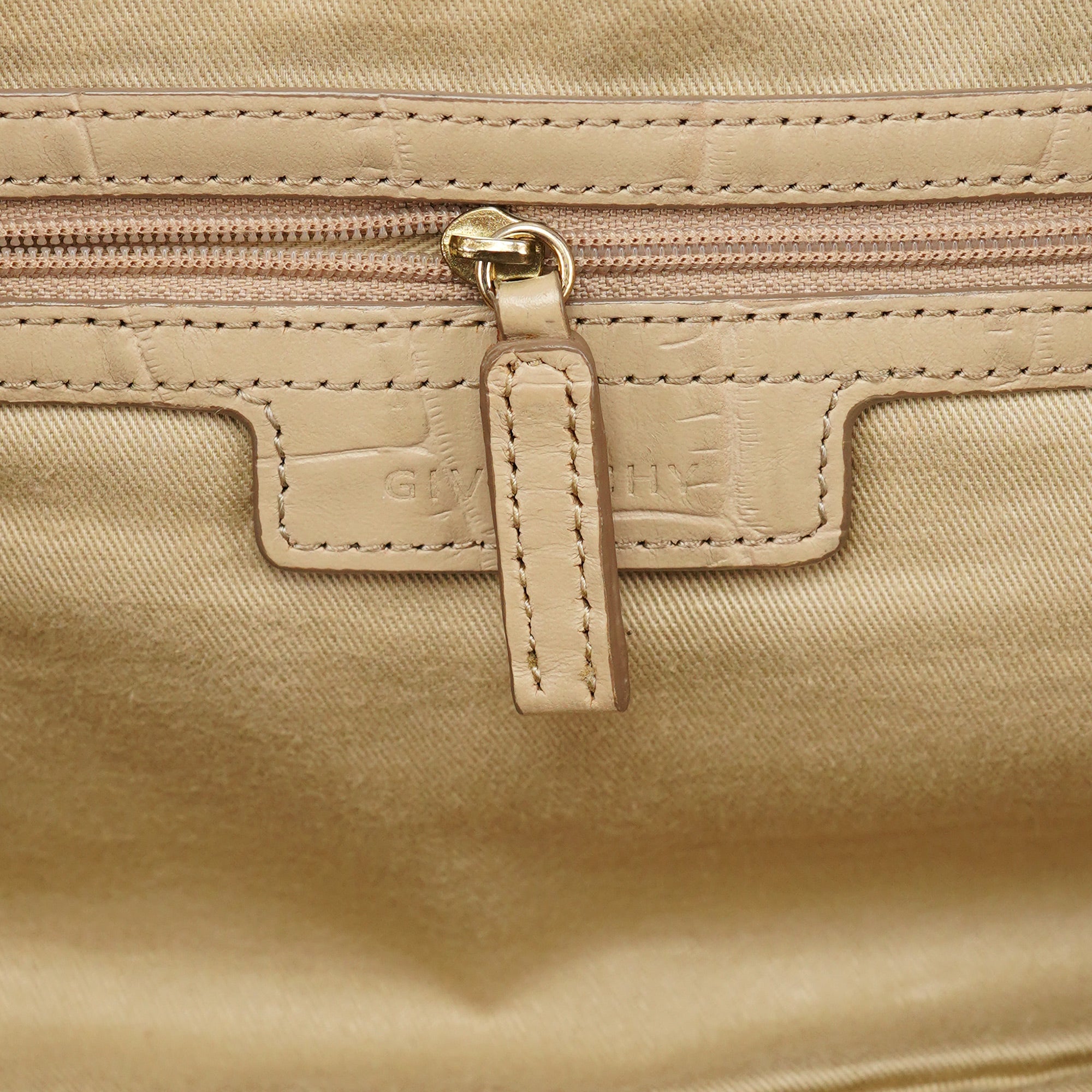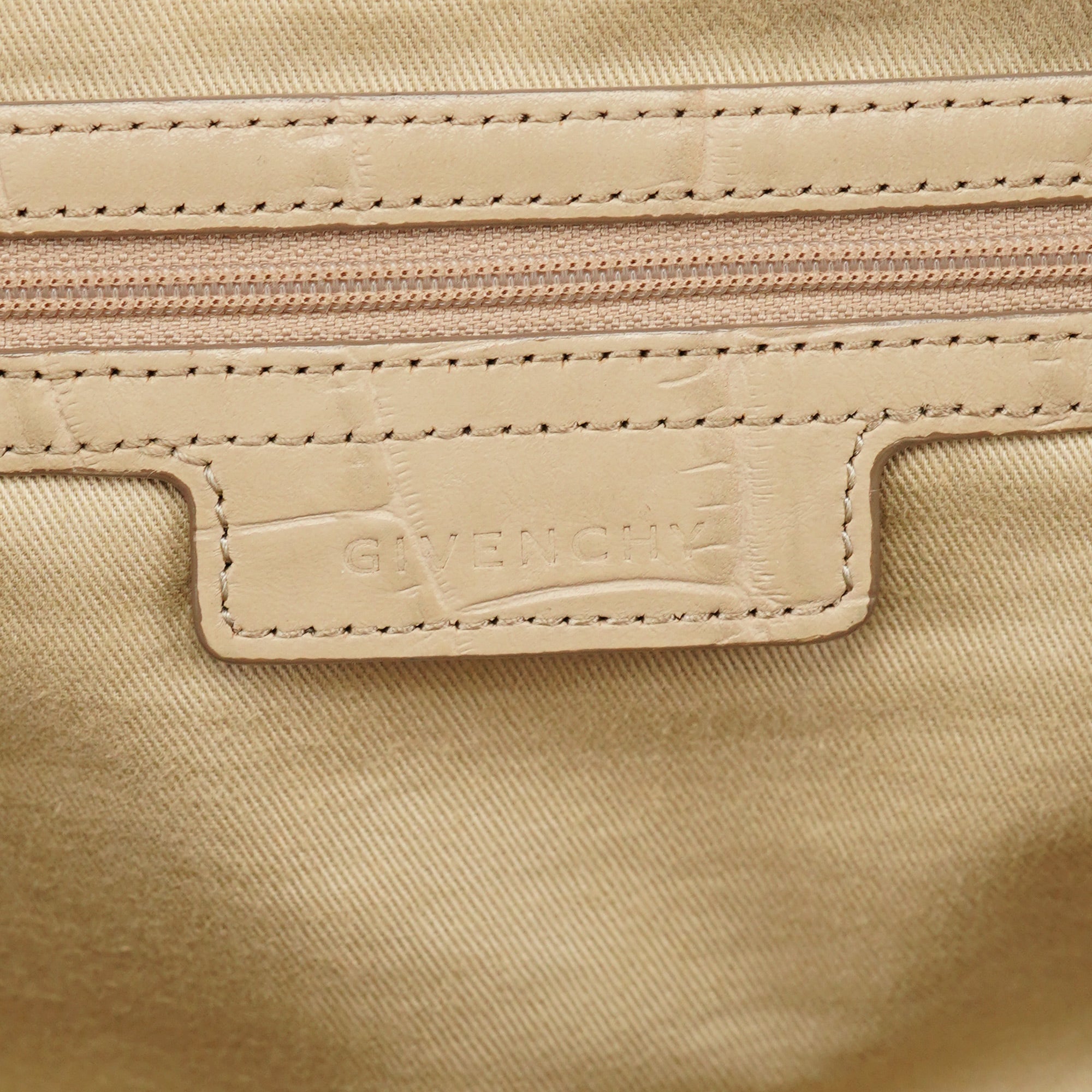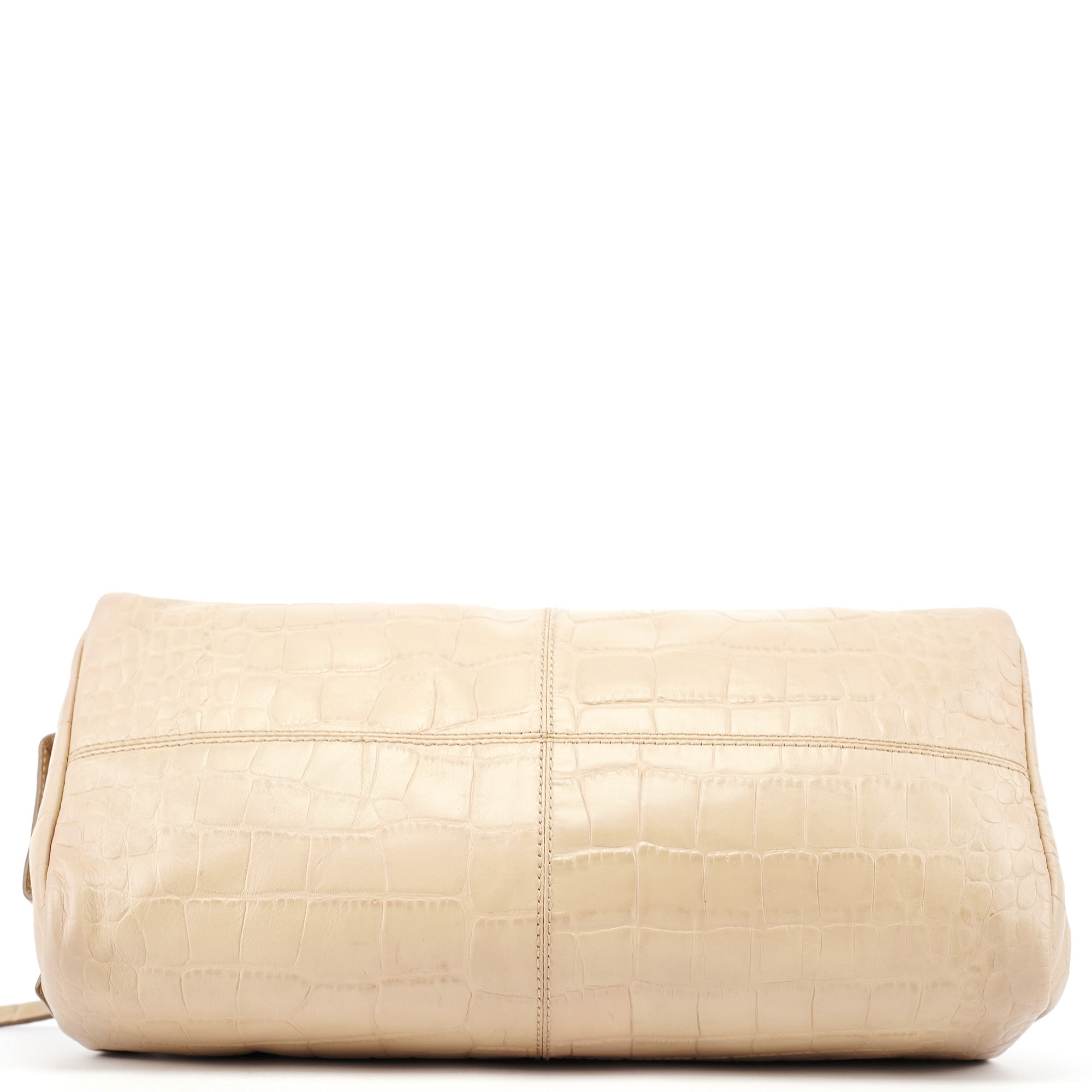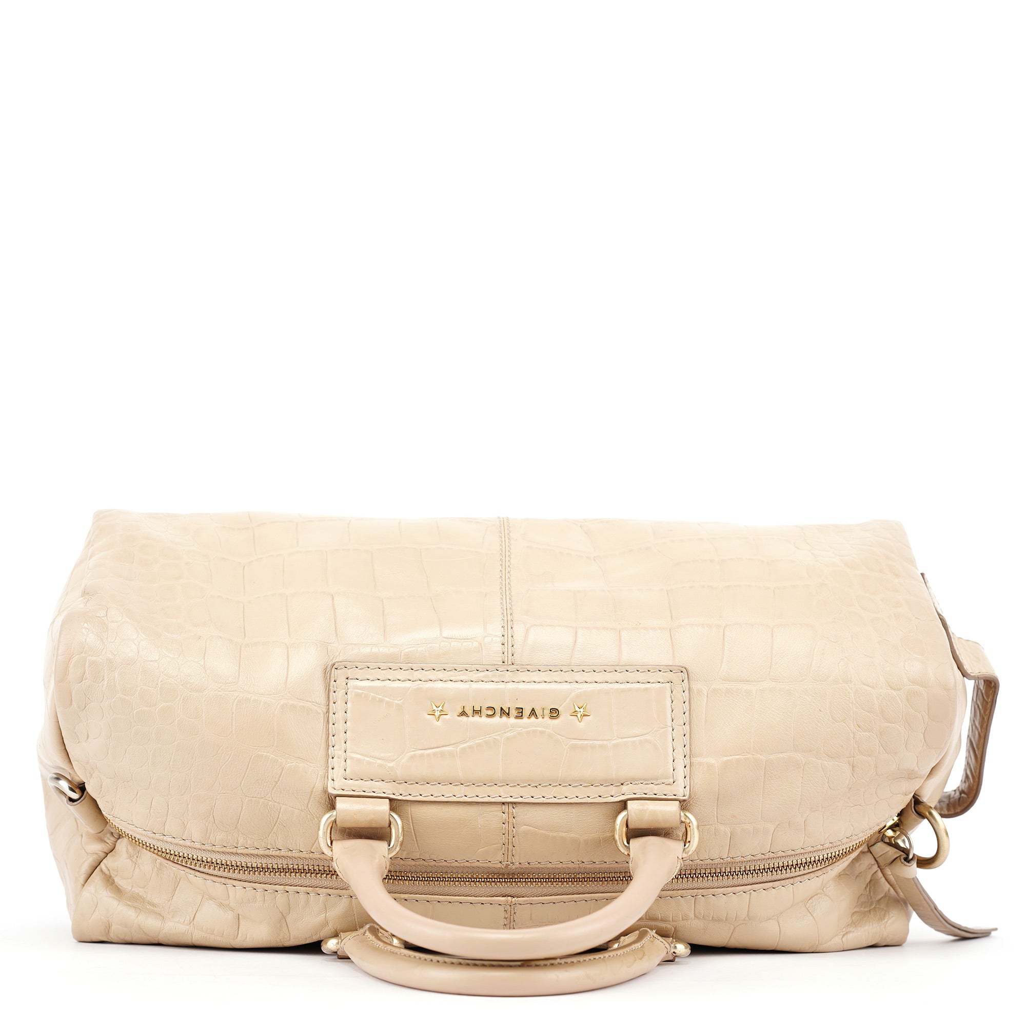 Designed in the 2010s, this Givenchy bowling bag is crafted in beige croc-embossed leather with a sleek cylindrical silhouette and rolled top handles. The gold-tone zip closure extends around the sides, enhancing the structured form while offering full access to the interior. The bag opens to a spacious fabric-lined compartment, ideal for everyday essentials. A modern interpretation of classic luxury with an understated exotic finish.