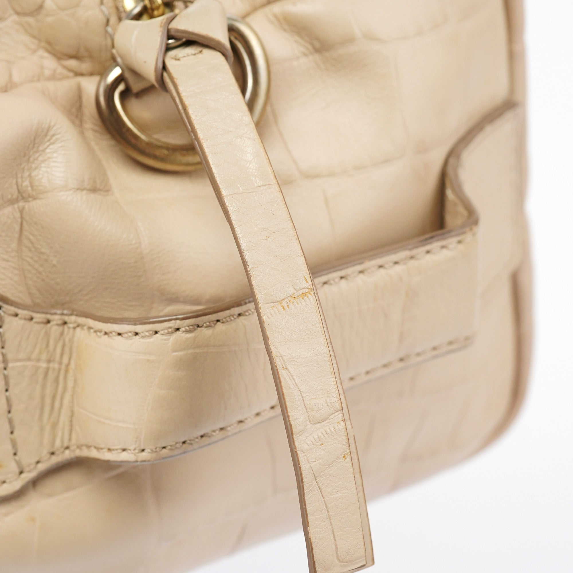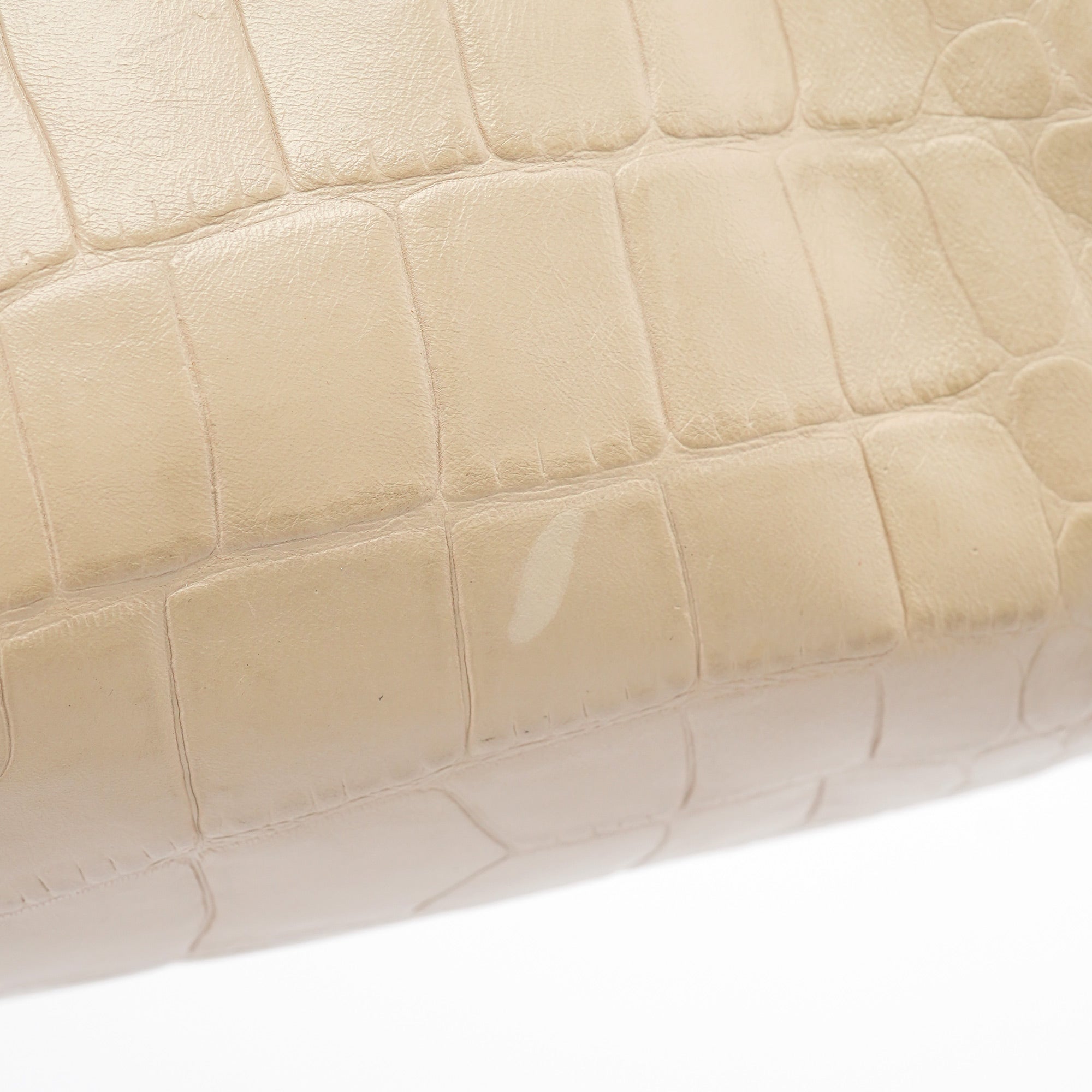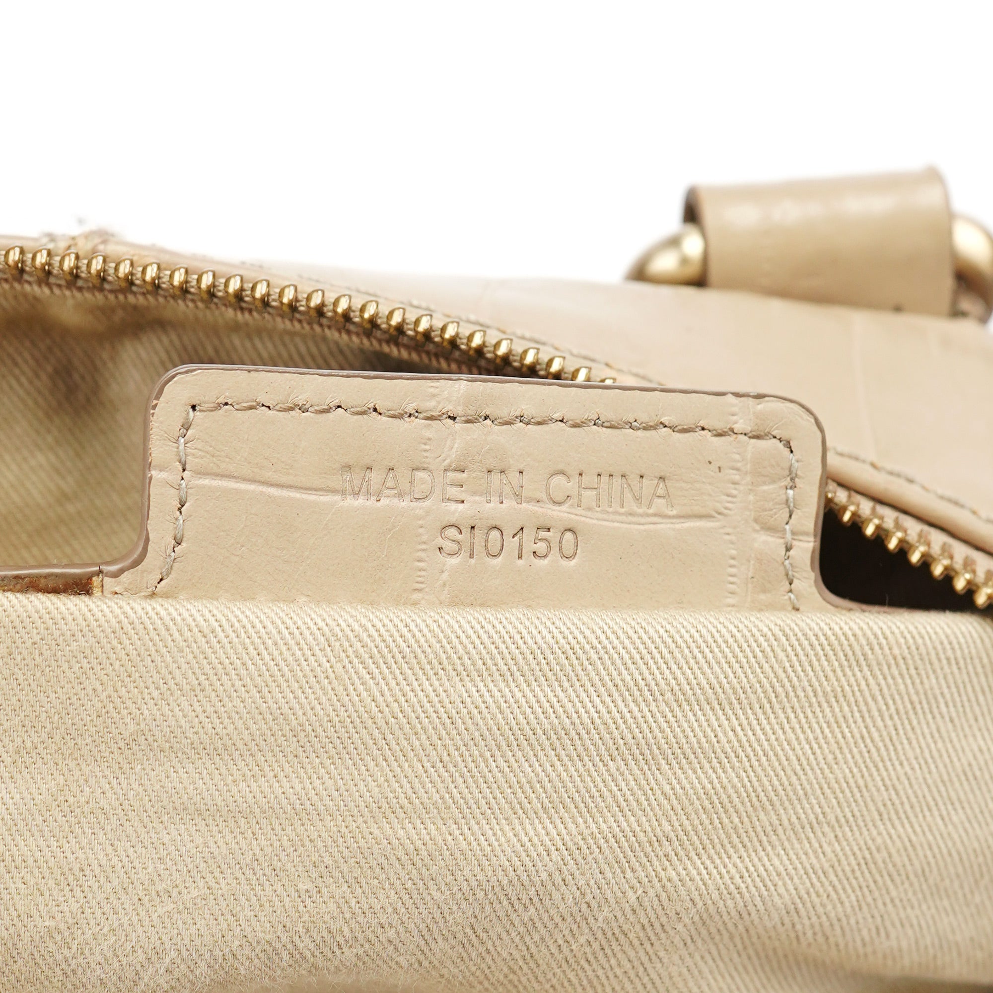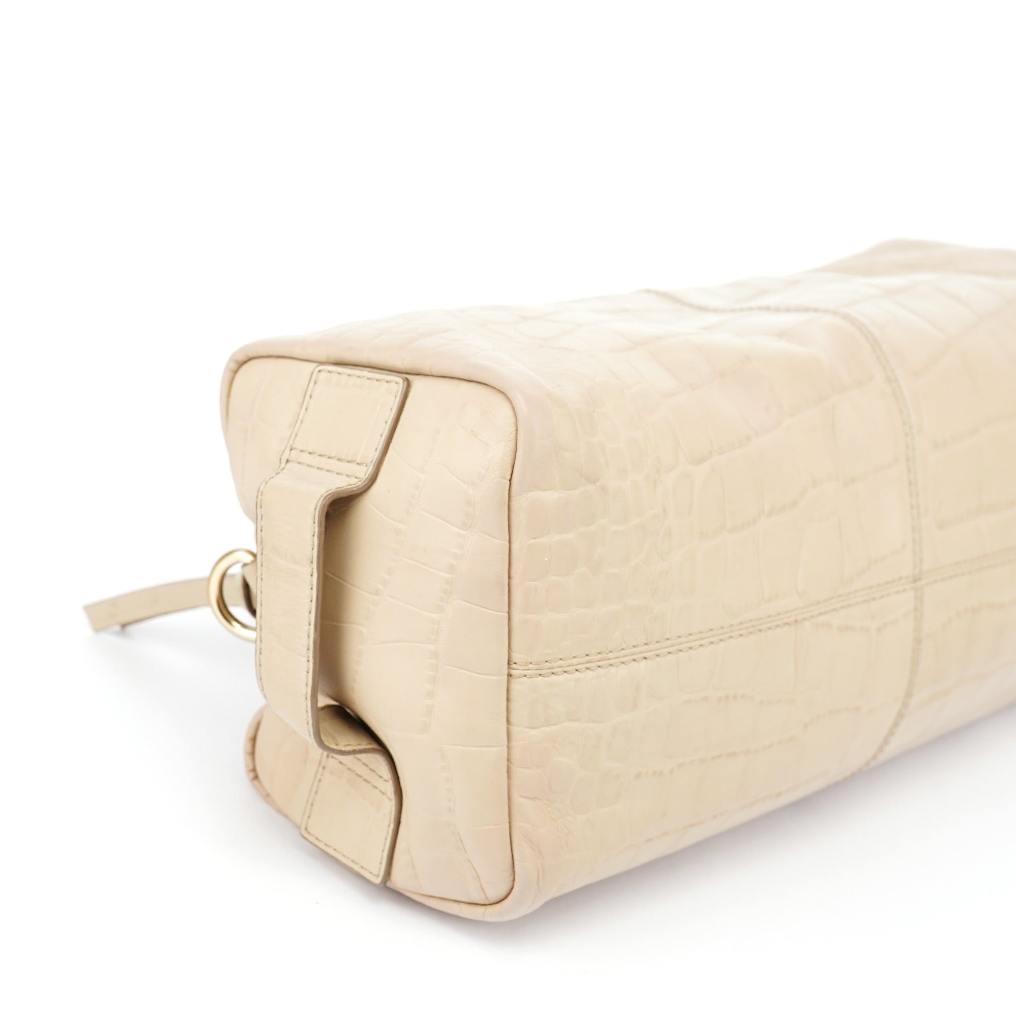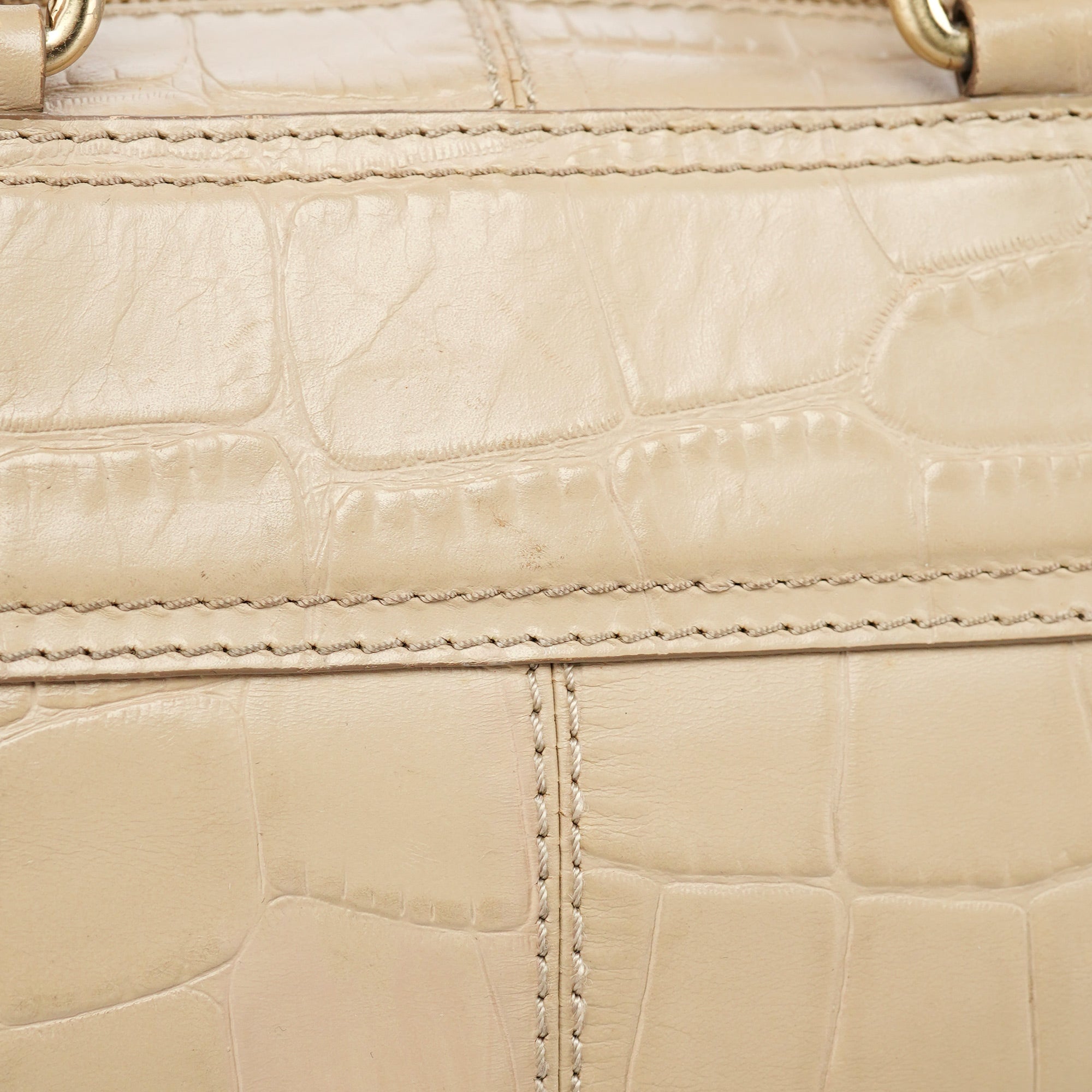 Designed in the 2010s, this Givenchy bowling bag is crafted in beige croc-embossed leather with a sleek cylindrical silhouette and rolled top handles. The gold-tone zip closure extends around the sides, enhancing the structured form while offering full access to the interior. The bag opens to a spacious fabric-lined compartment, ideal for everyday essentials. A modern interpretation of classic luxury with an understated exotic finish.