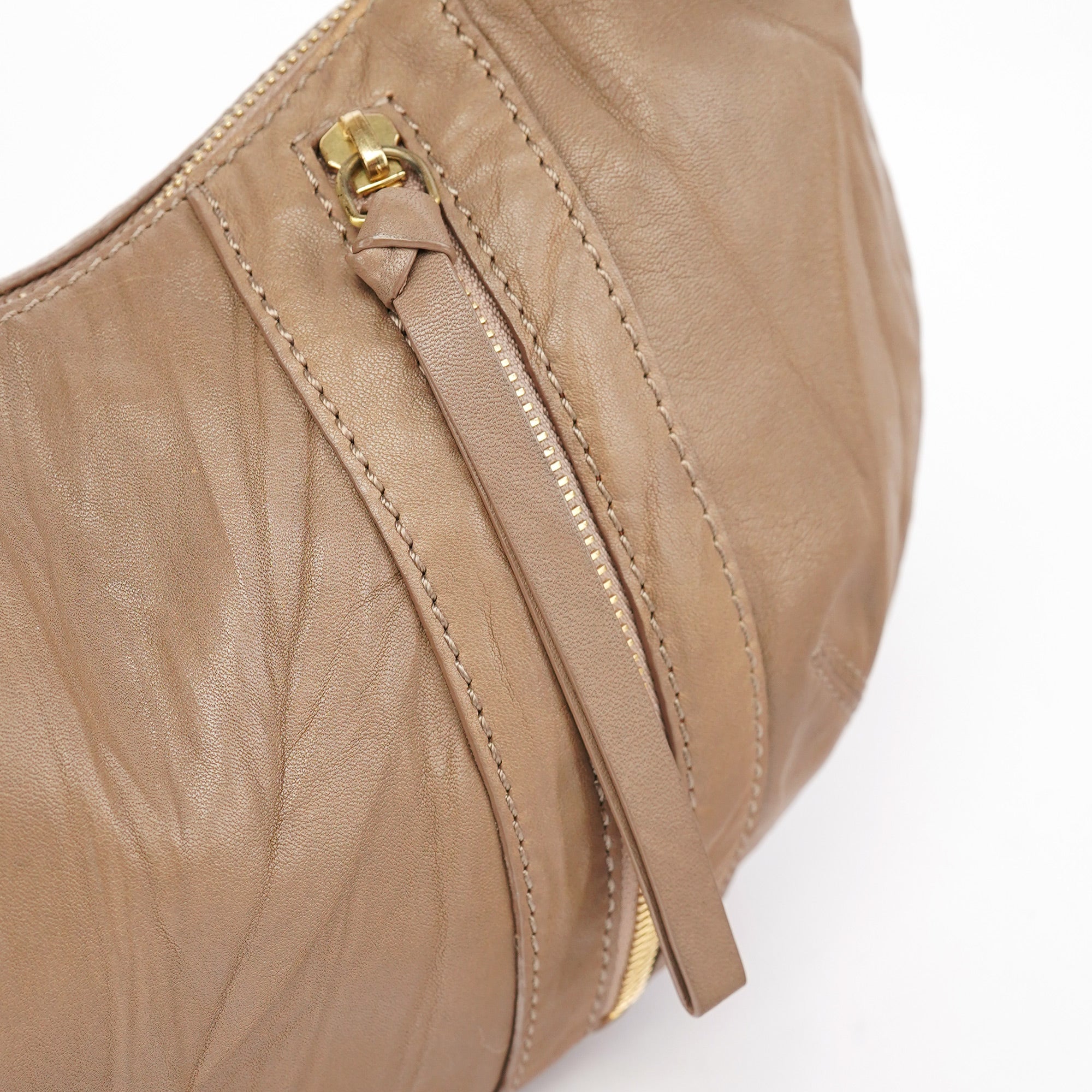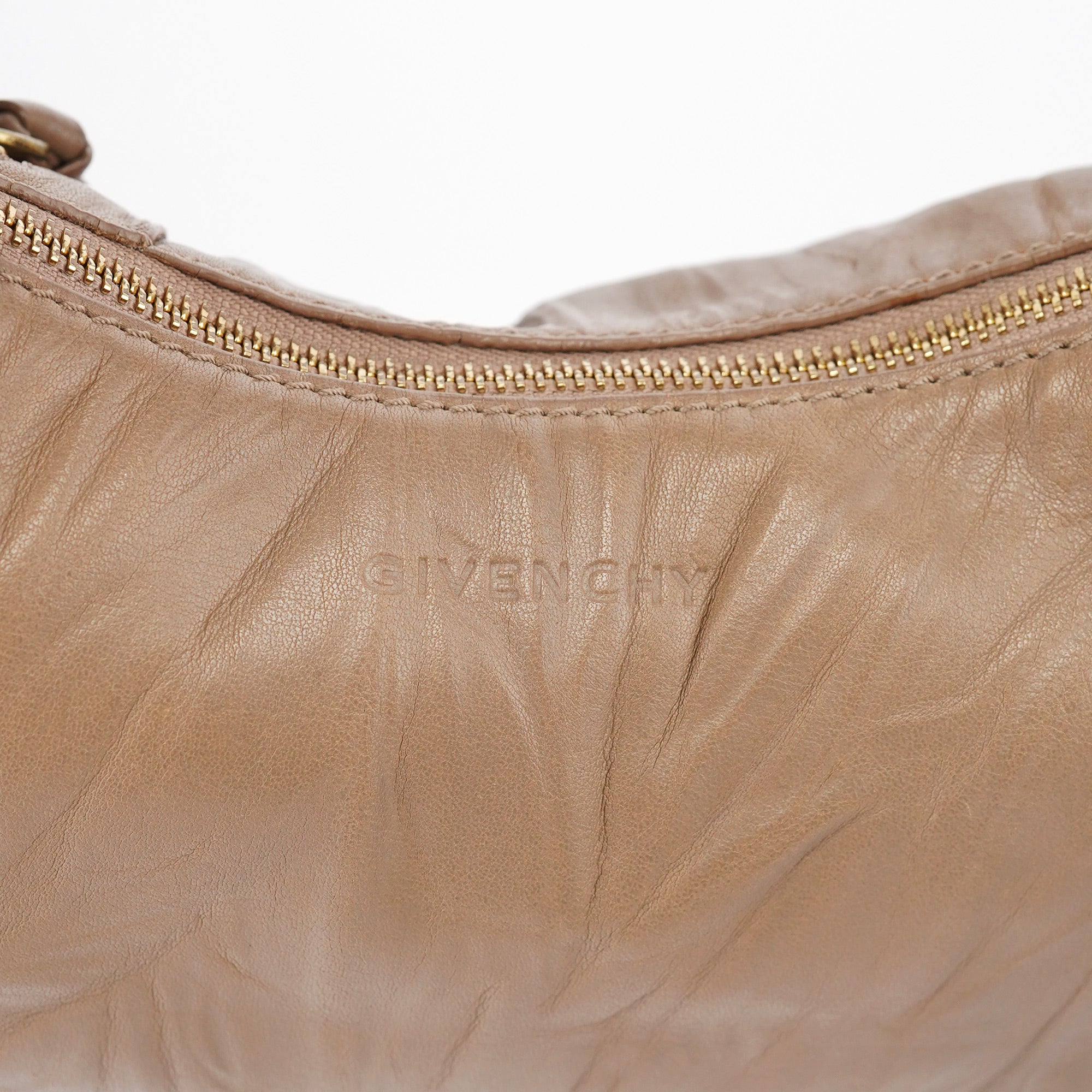 Designed in the early 2000s by Ricardo Tisci, this Givenchy hobo bag is crafted in supple beige lambskin with a slouchy crescent silhouette, gold-tone hardware, and a zipper front pocket with a leather tassel pull. The dual-handle design and adjustable strap offer versatile carry options, while the interior features one outer and three inner pockets lined in dark twill.