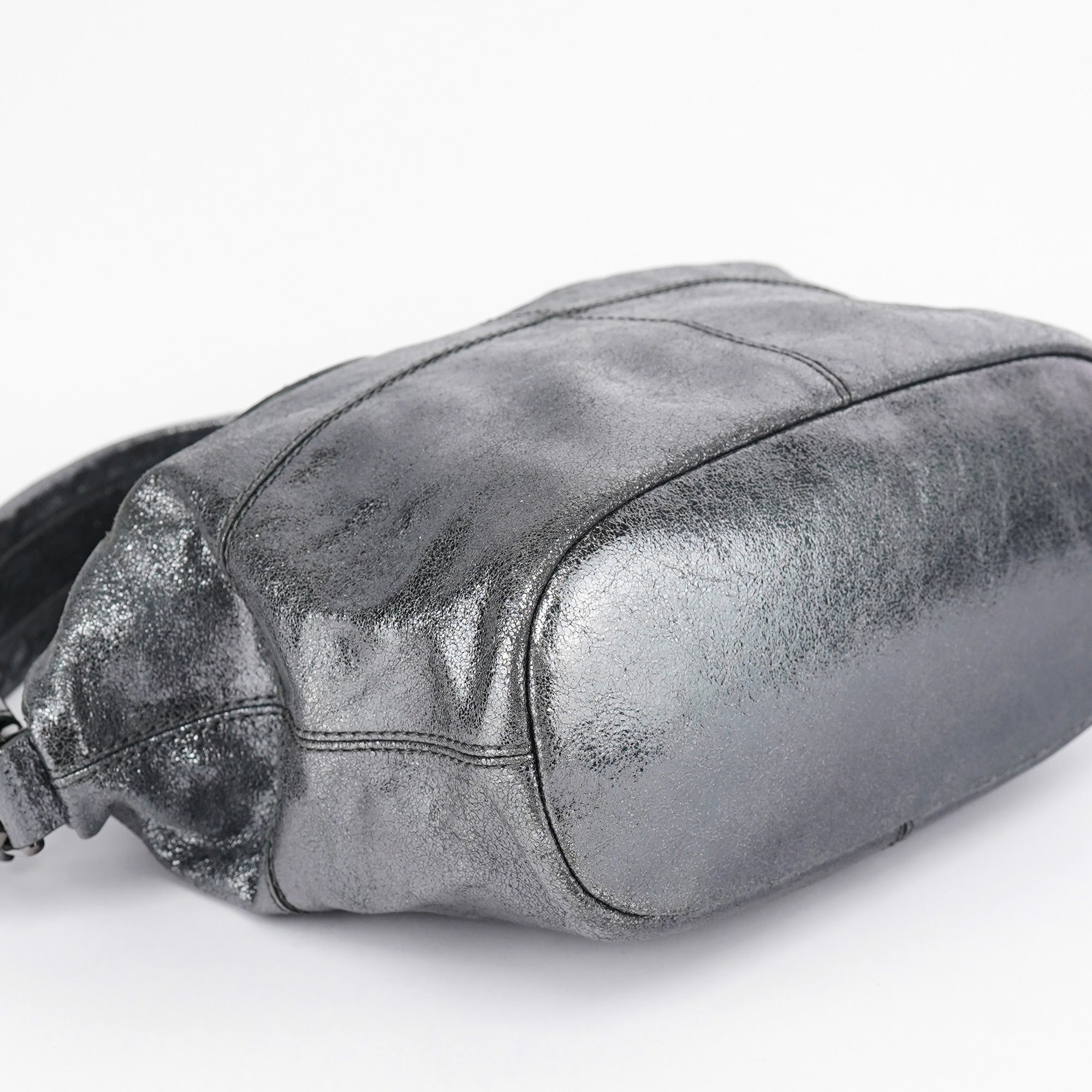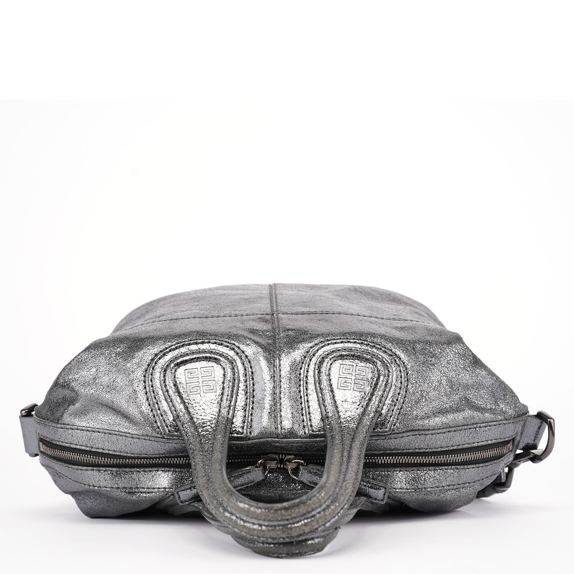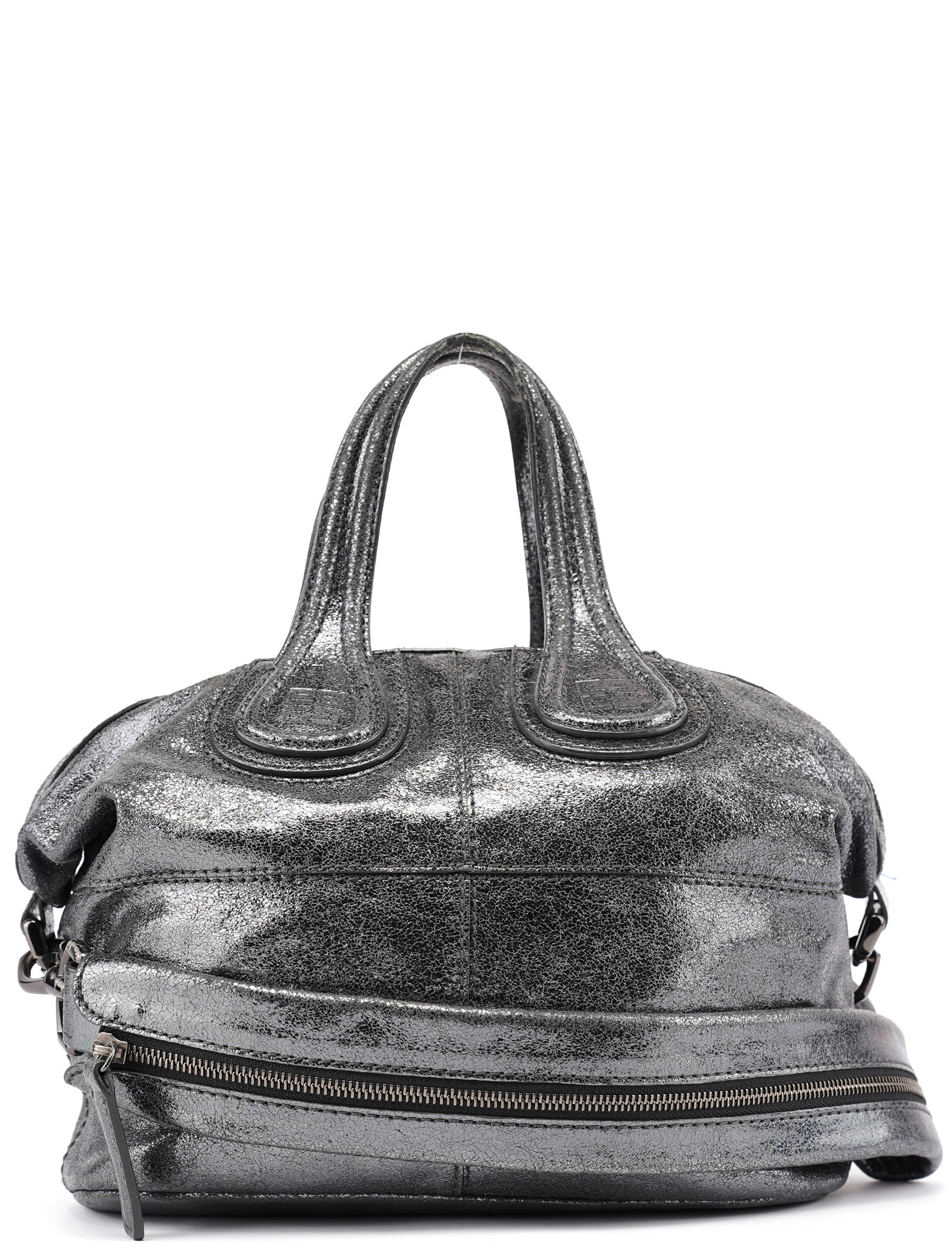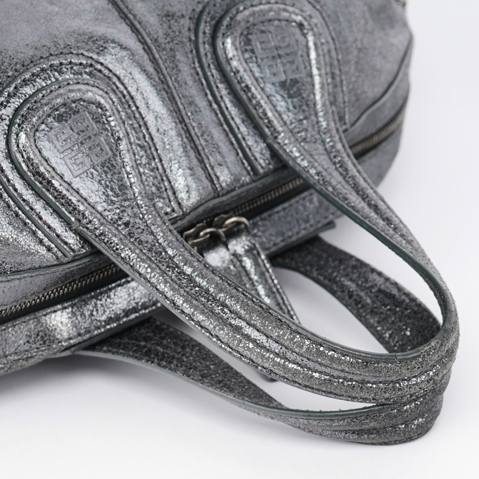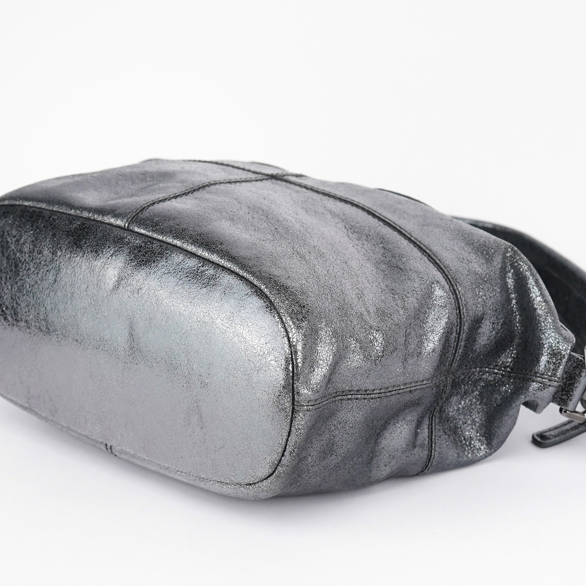 Designed in the early 2000s, this Givenchy tote bag is crafted in silver metallic leather with dual top handles, structured seaming, and a softly rounded silhouette. The spacious zippered interior is lined in black canvas and includes a single zip pocket.