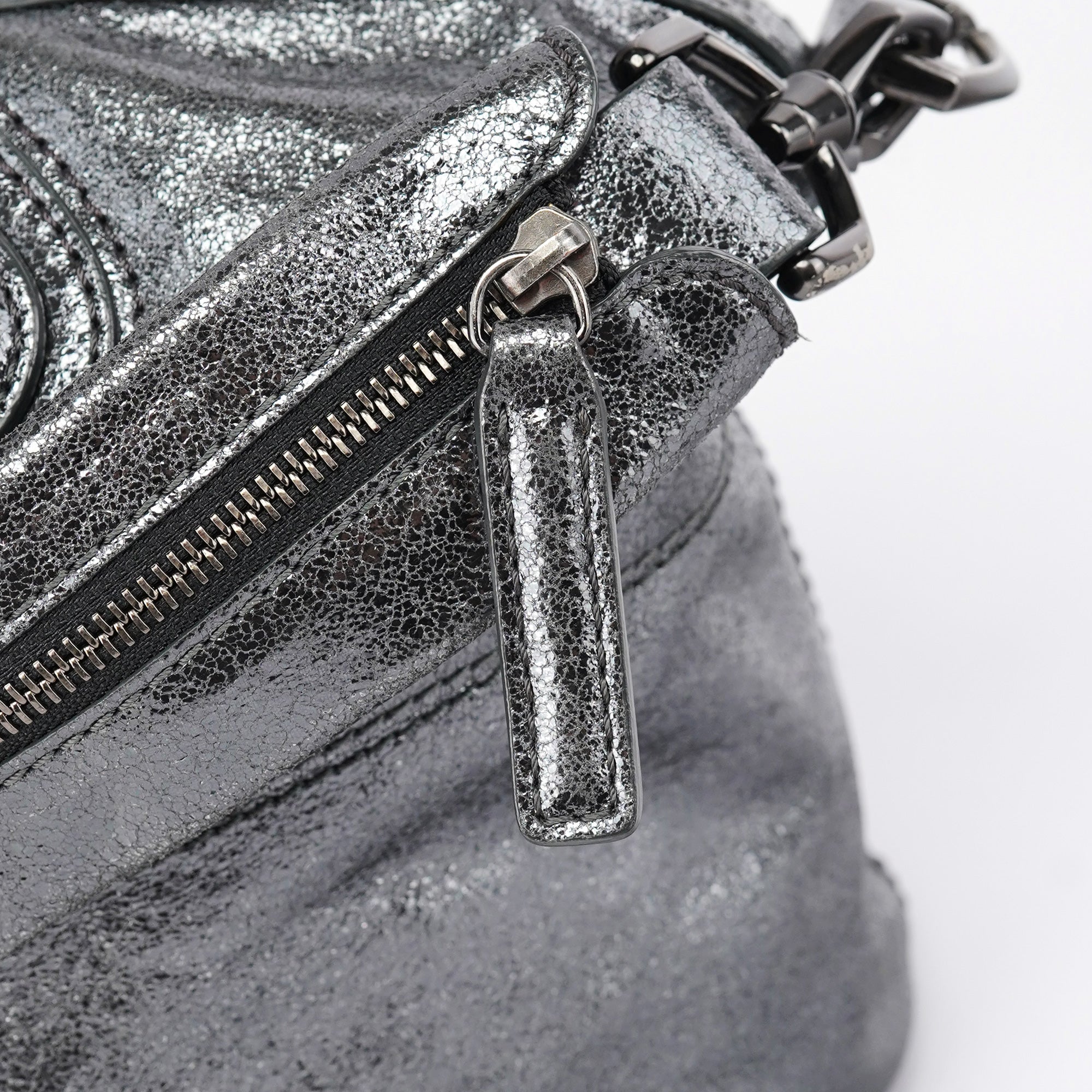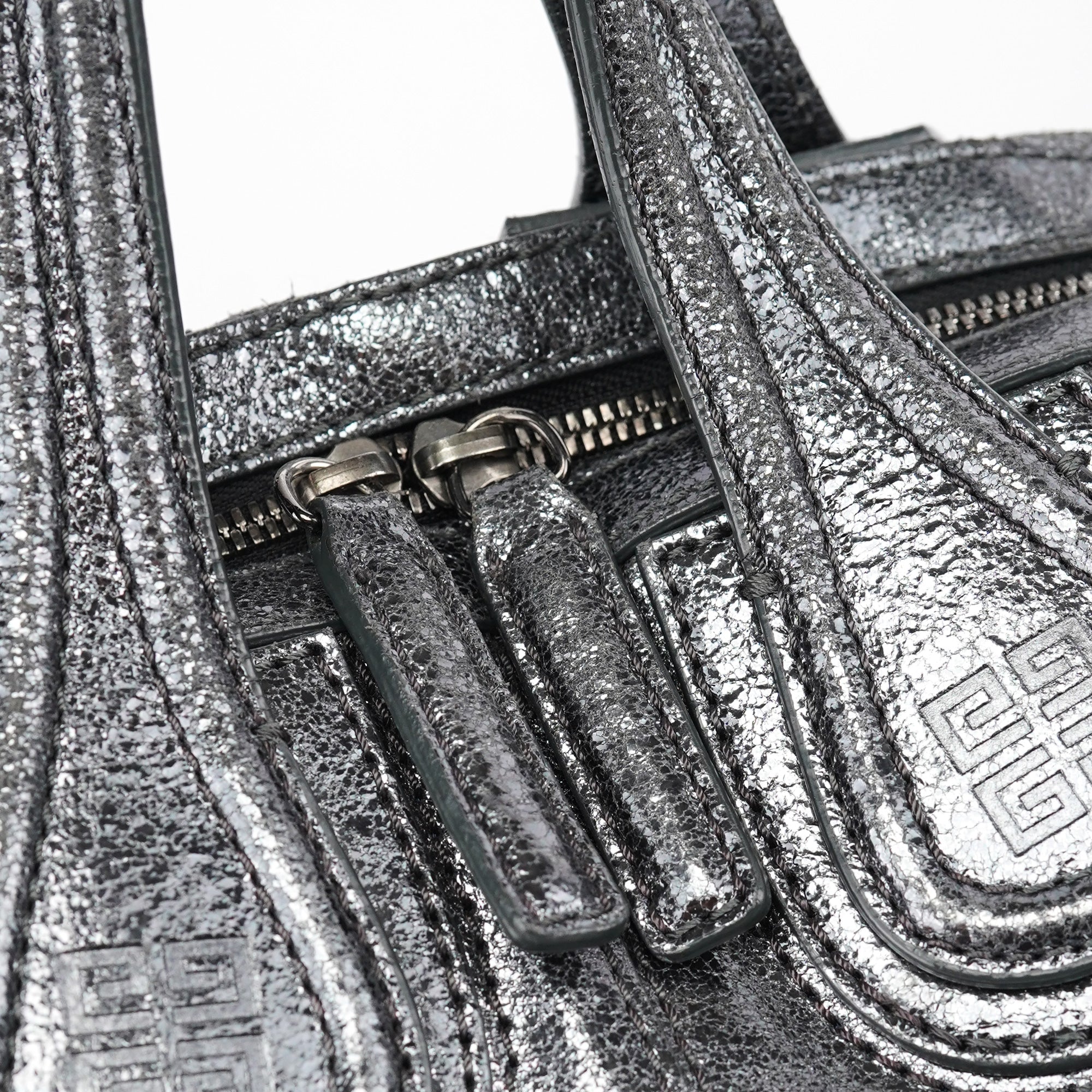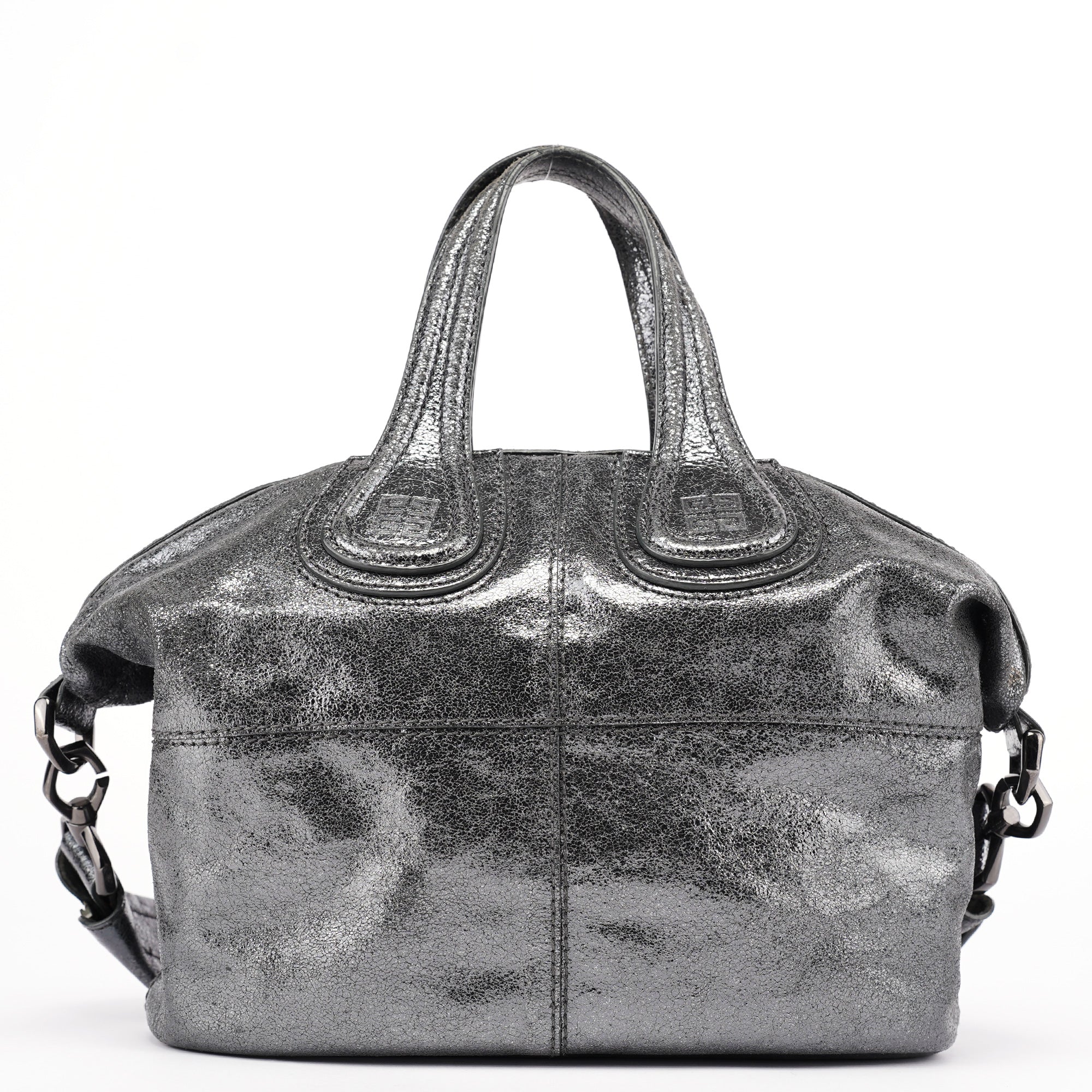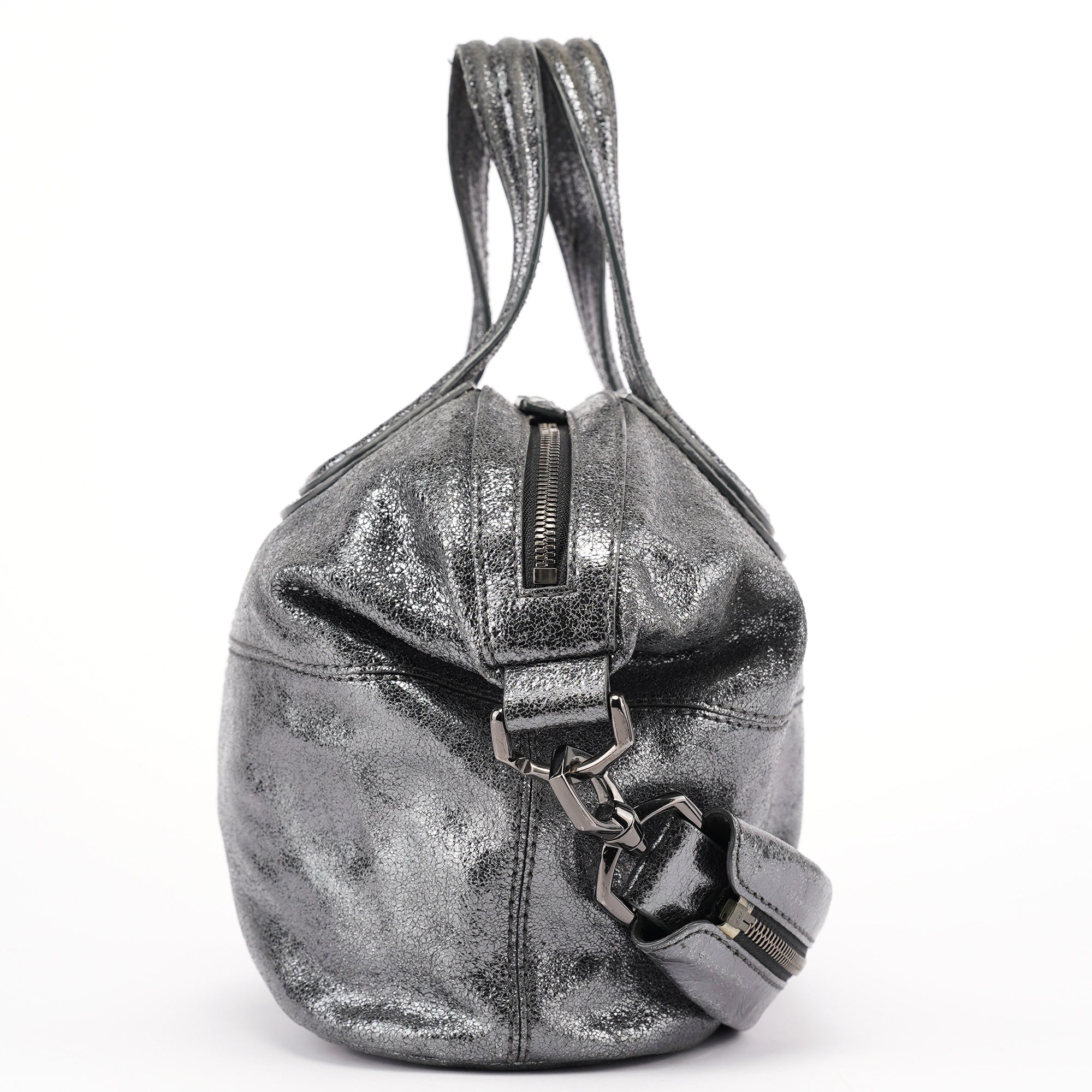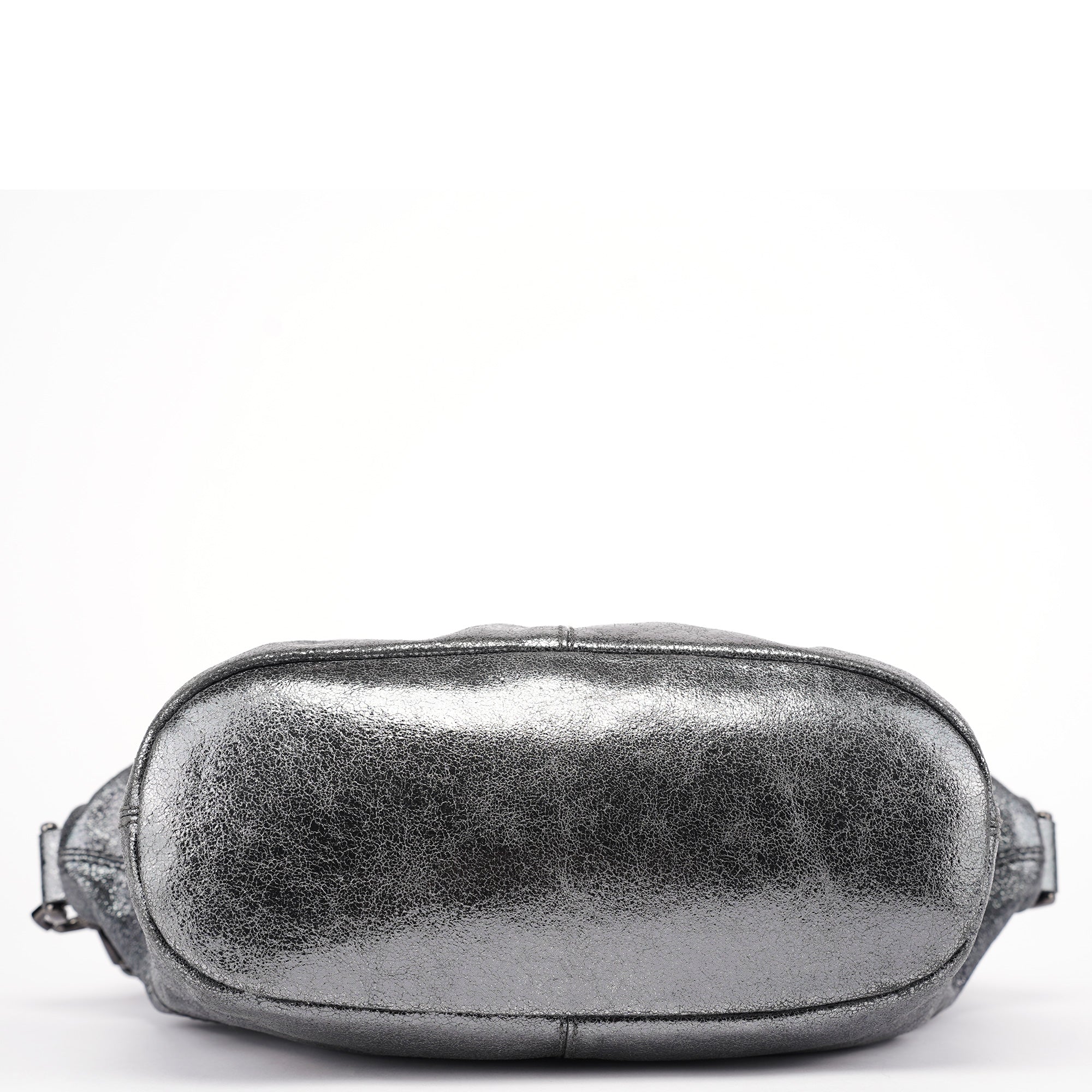 Designed in the early 2000s, this Givenchy tote bag is crafted in silver metallic leather with dual top handles, structured seaming, and a softly rounded silhouette. The spacious zippered interior is lined in black canvas and includes a single zip pocket.