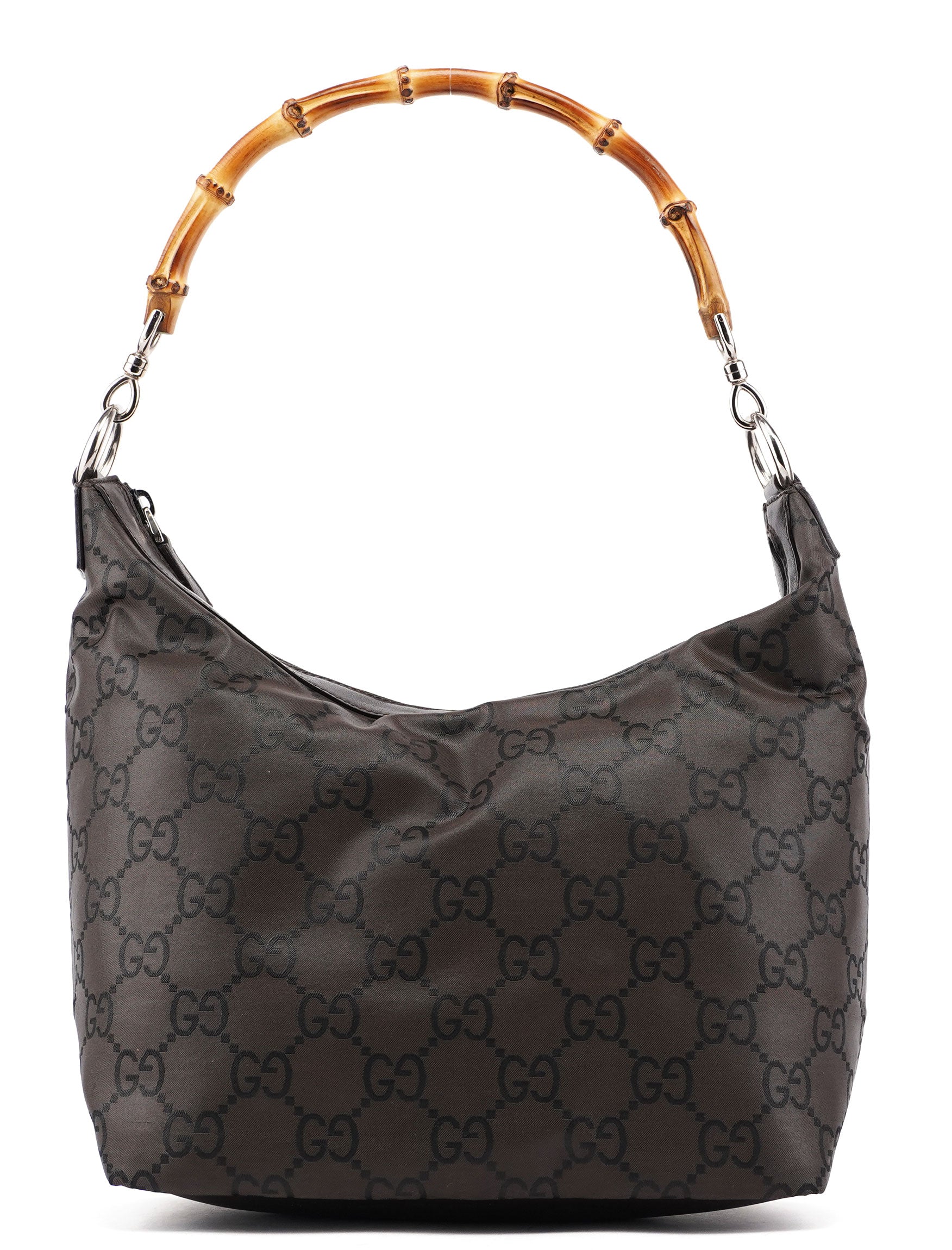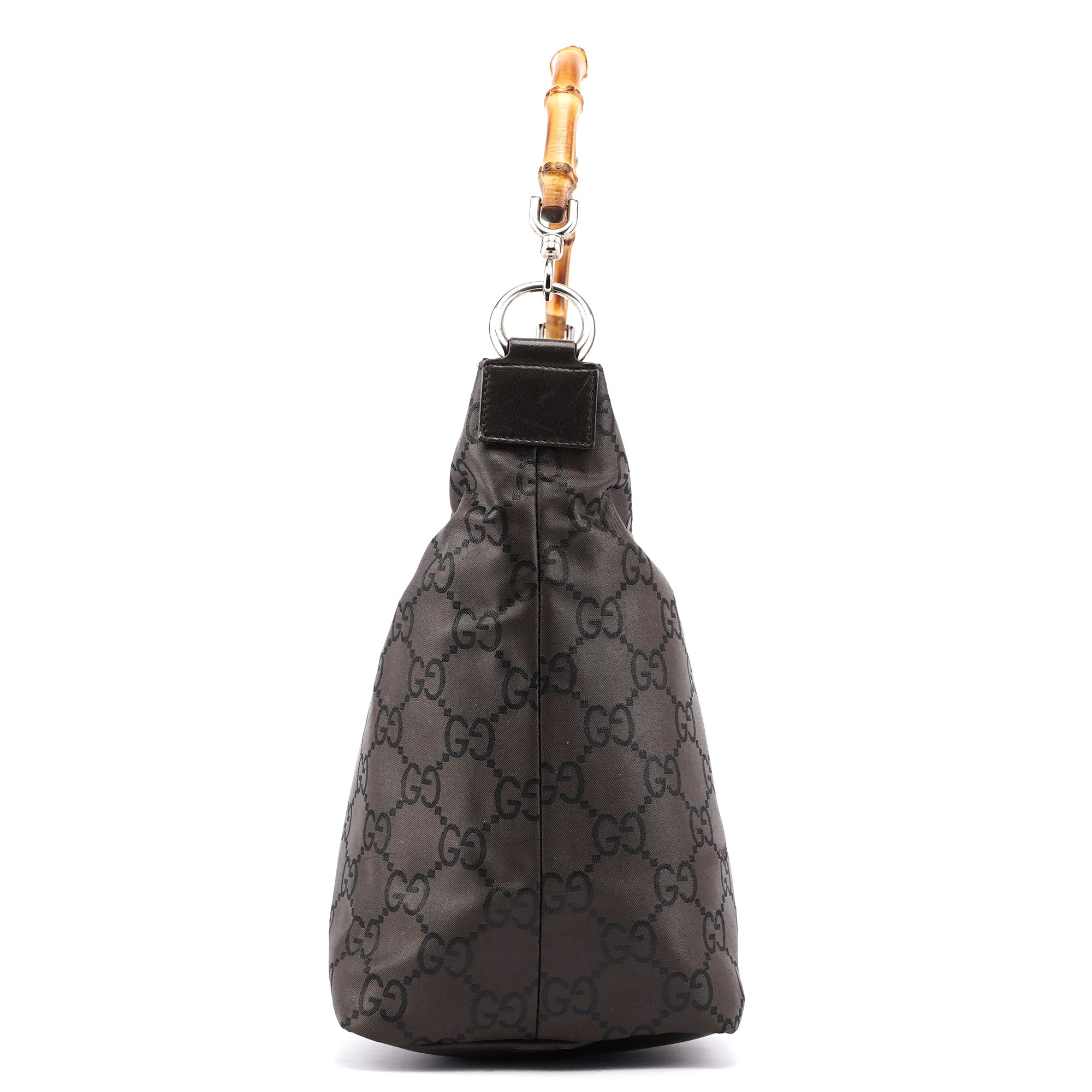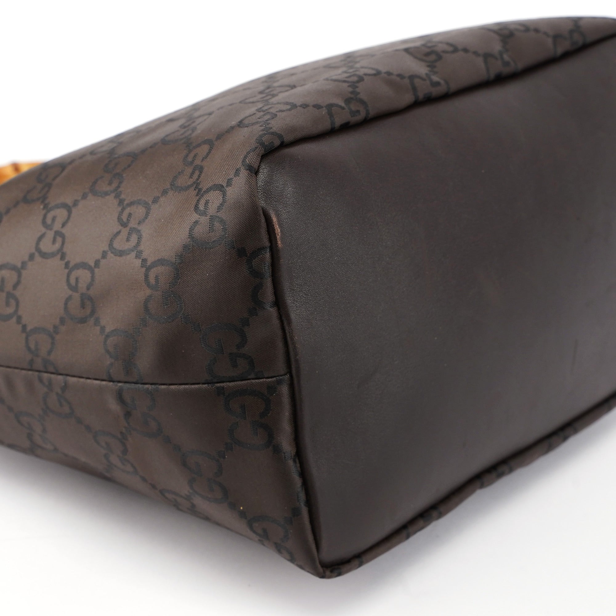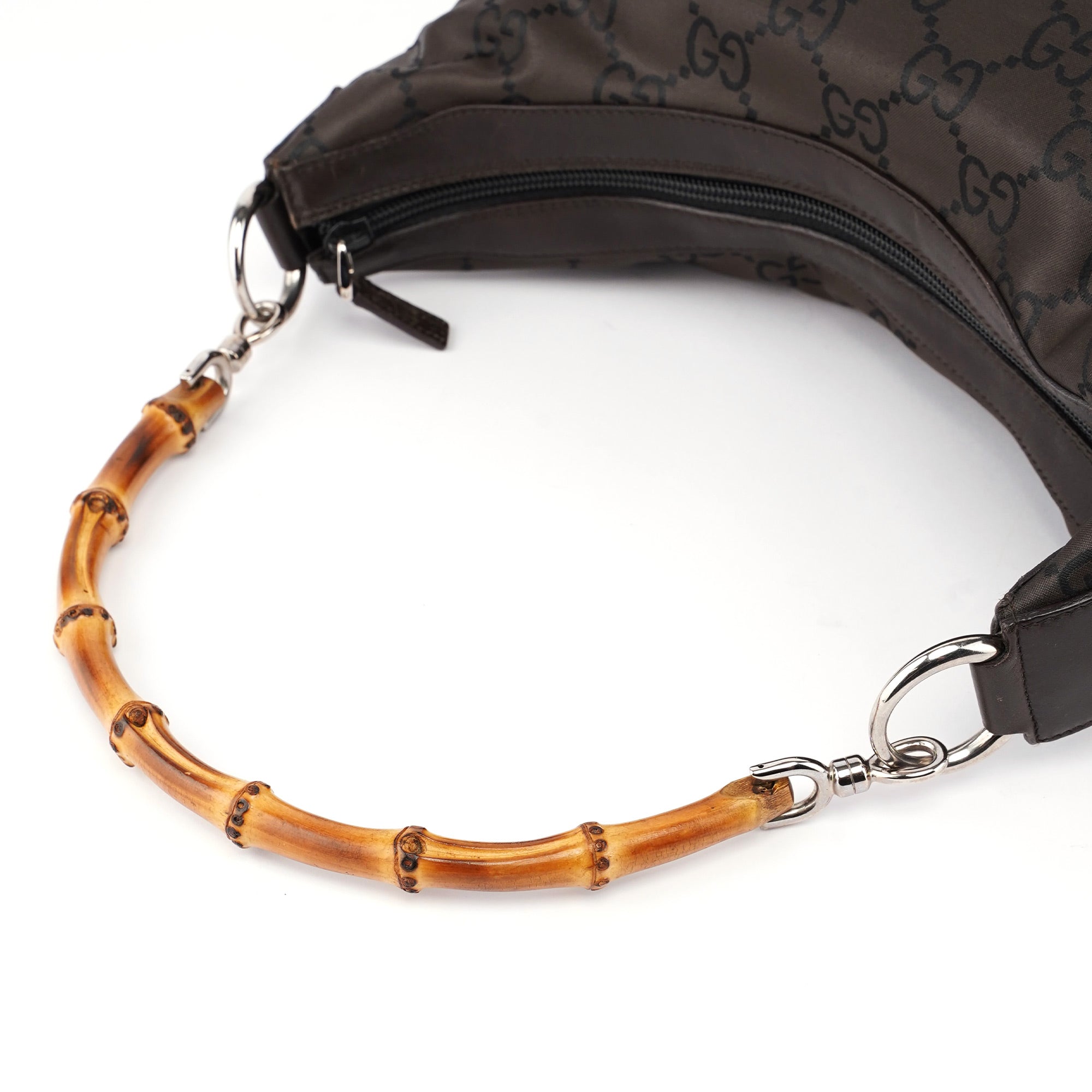 Discover the Gucci Bamboo shoulder bag, designed by Tom Ford in the late 1990s. This timeless piece features a classic bamboo handle, complemented by brown GG monogram nylon, silver-tone hardware, and tonal leather trim for striking contrast. A spacious satin-lined interior with a zipper closure and an additional zipper pocket offers ample storage and organisation.