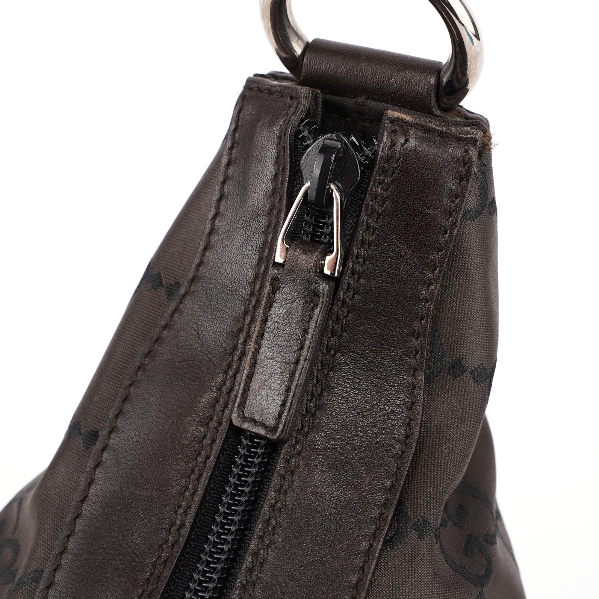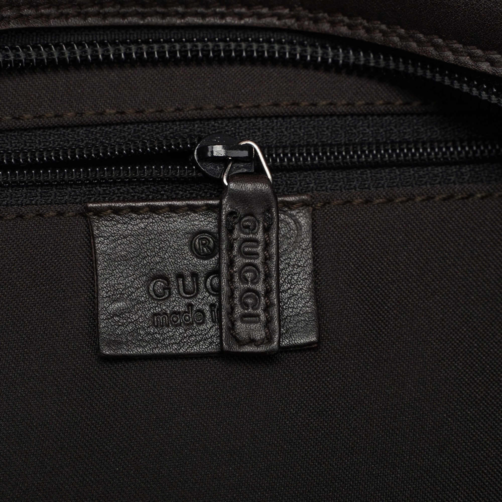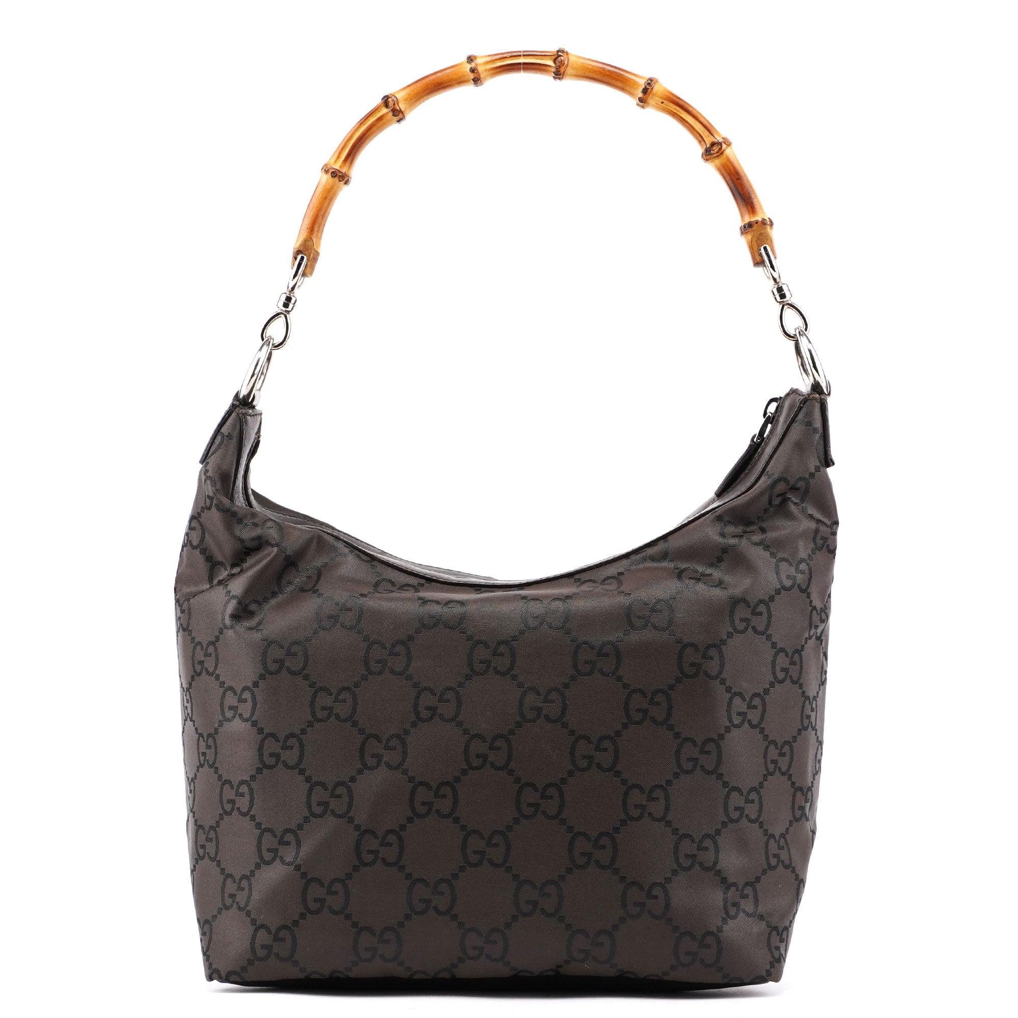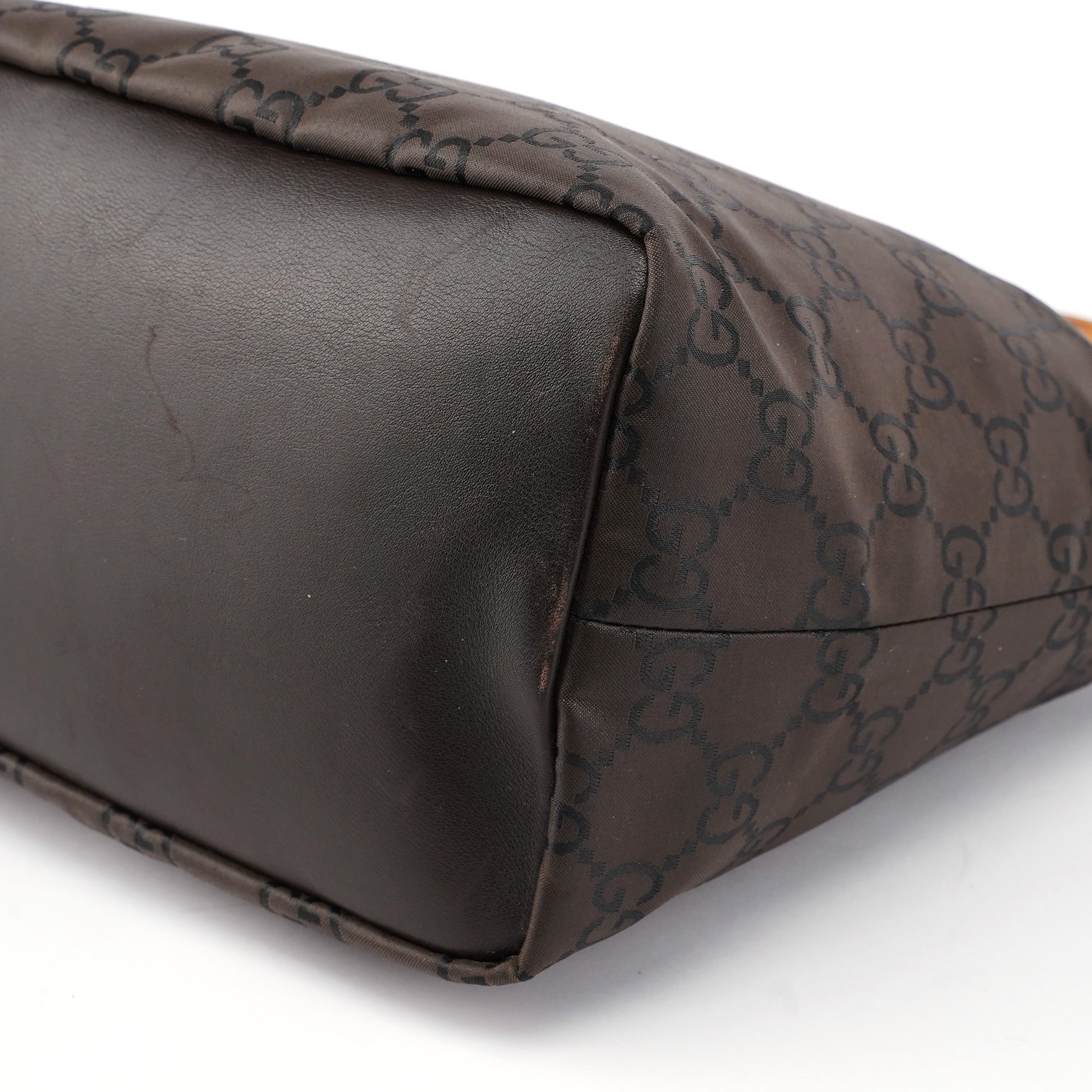 Discover the Gucci Bamboo shoulder bag, designed by Tom Ford in the late 1990s. This timeless piece features a classic bamboo handle, complemented by brown GG monogram nylon, silver-tone hardware, and tonal leather trim for striking contrast. A spacious satin-lined interior with a zipper closure and an additional zipper pocket offers ample storage and organisation.