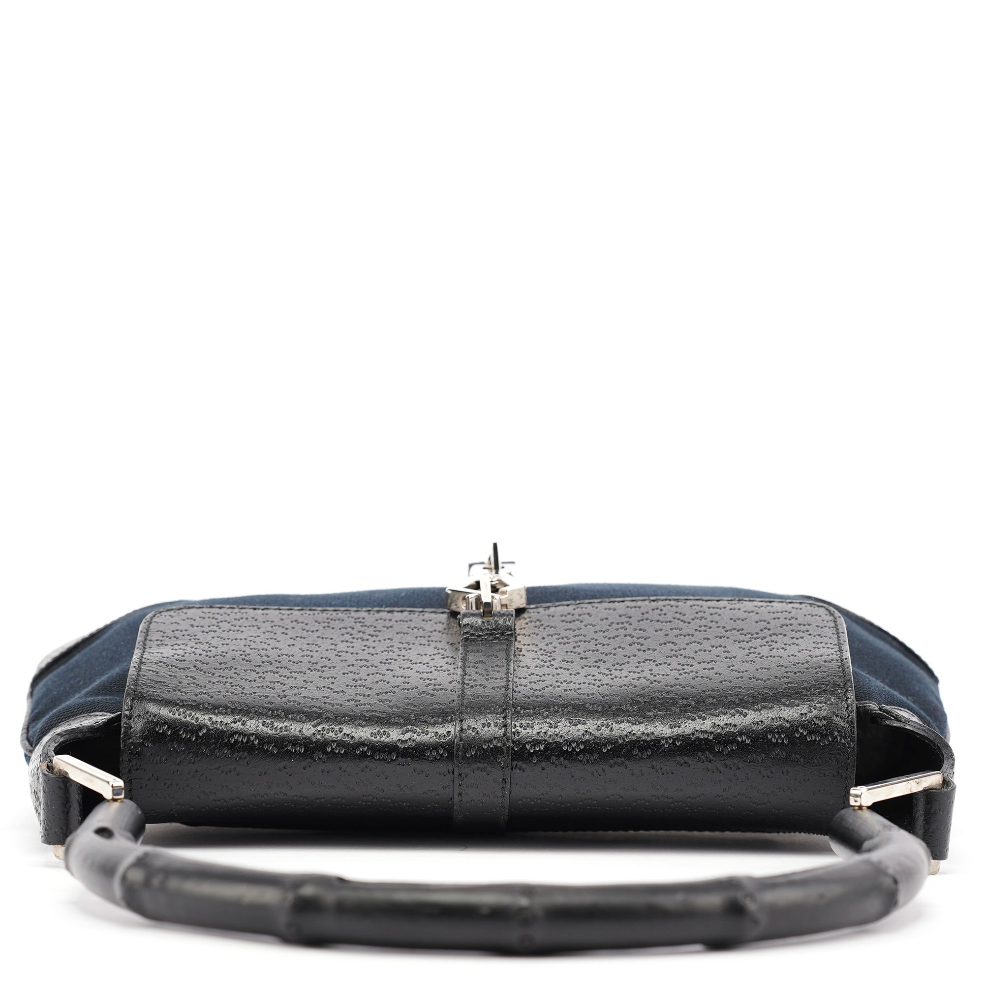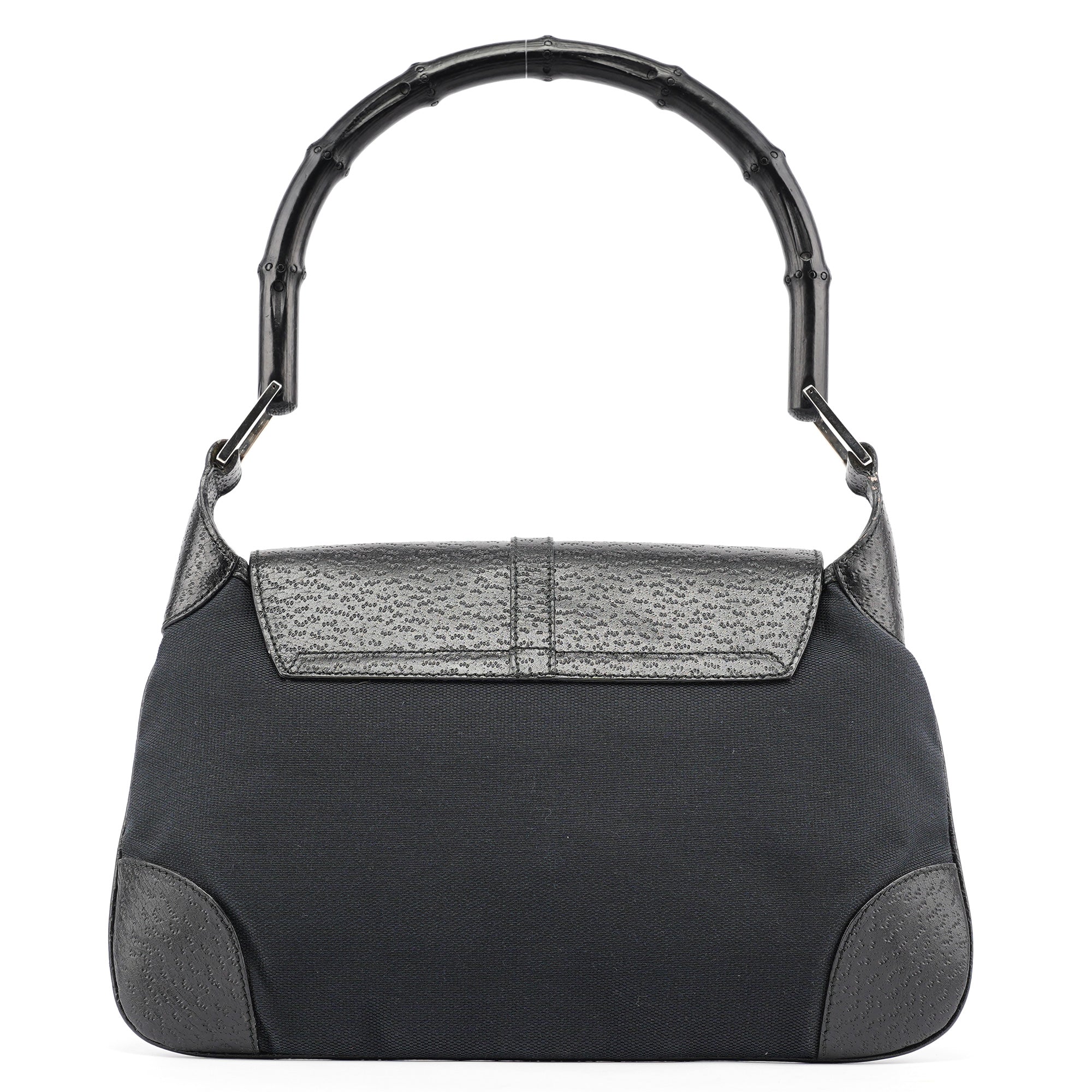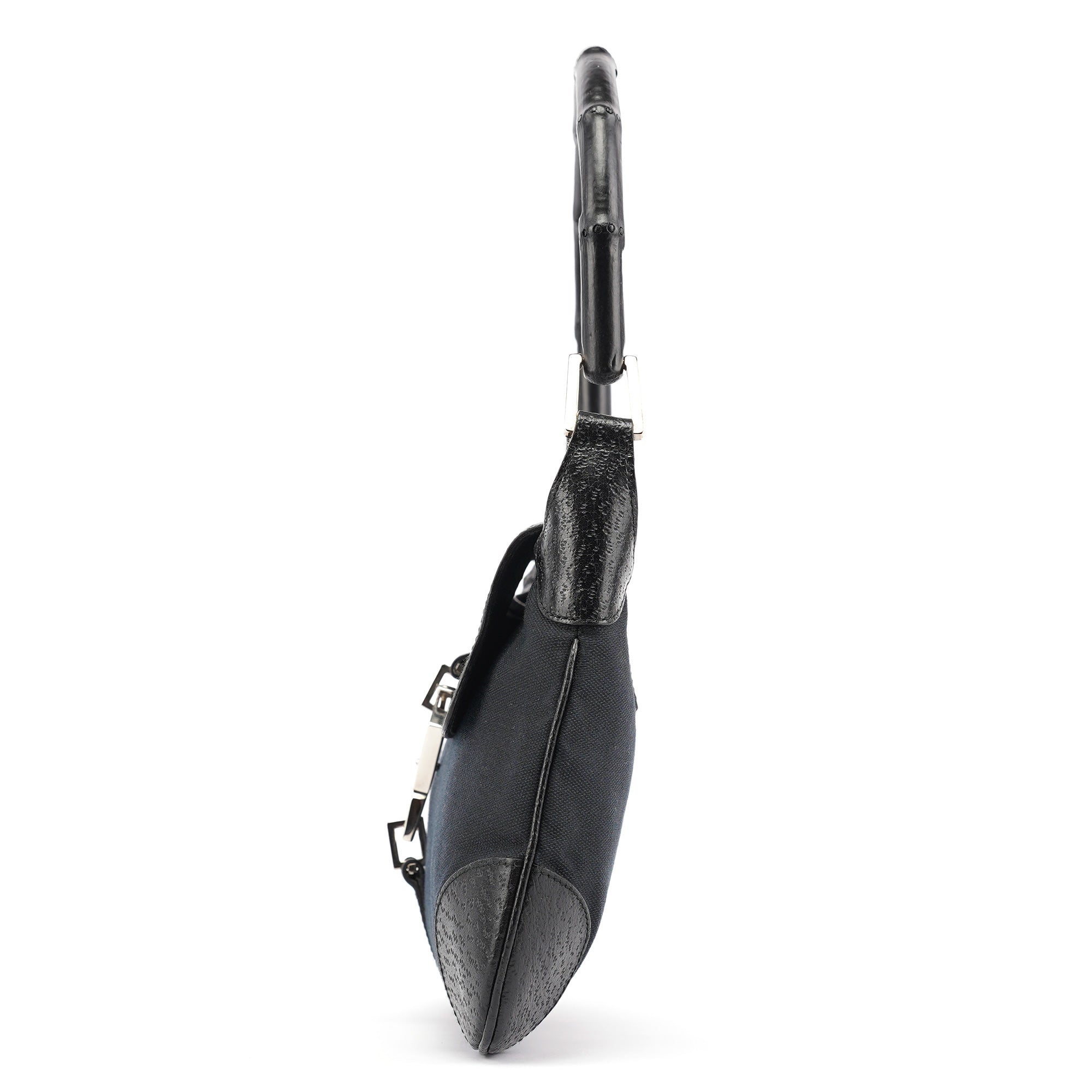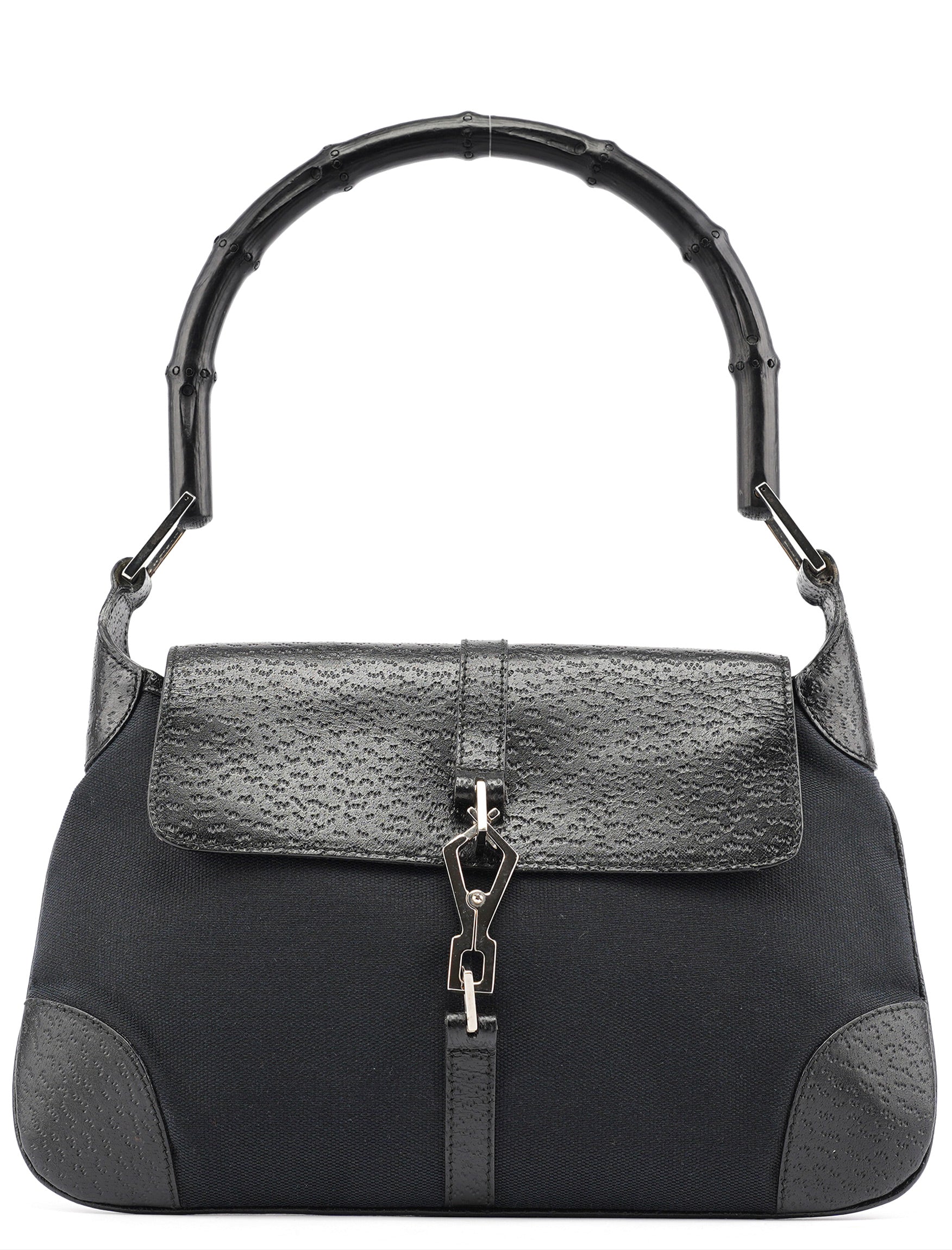 Designed in the early 2000s by Tom Ford, this vintage Gucci Jackie Bamboo shoulder bag features black canvas with black leather trim, combining two house icons in one sophisticated design. The distinctive crescent shape showcases the signature bamboo handle alongside the Jackie's characteristic piston closure with gold-tone hardware. The compact silhouette offers a front flap closure over a spacious interior.
