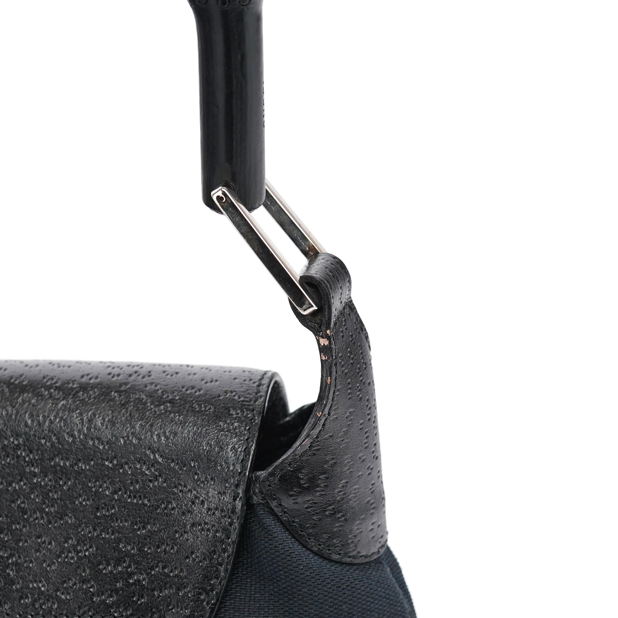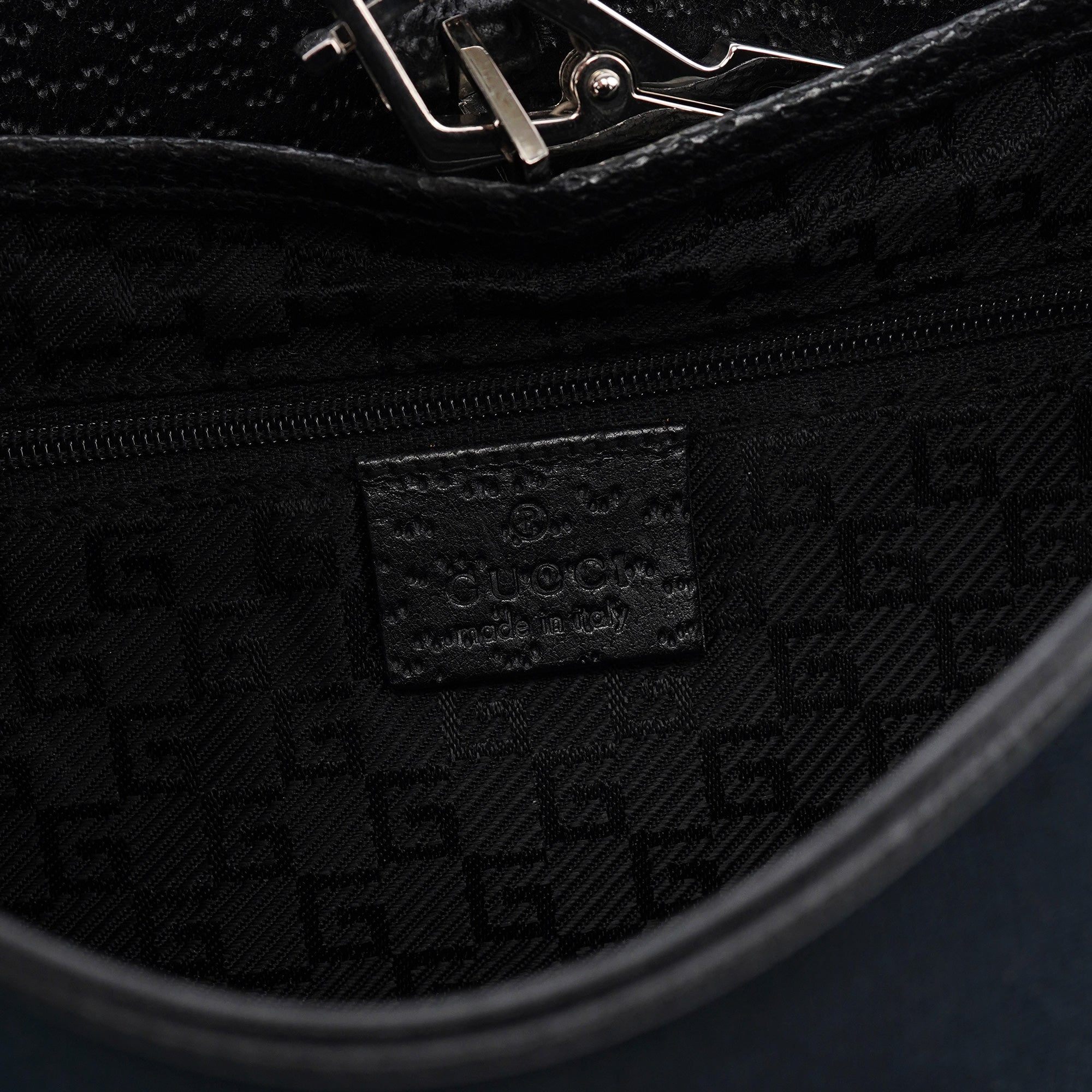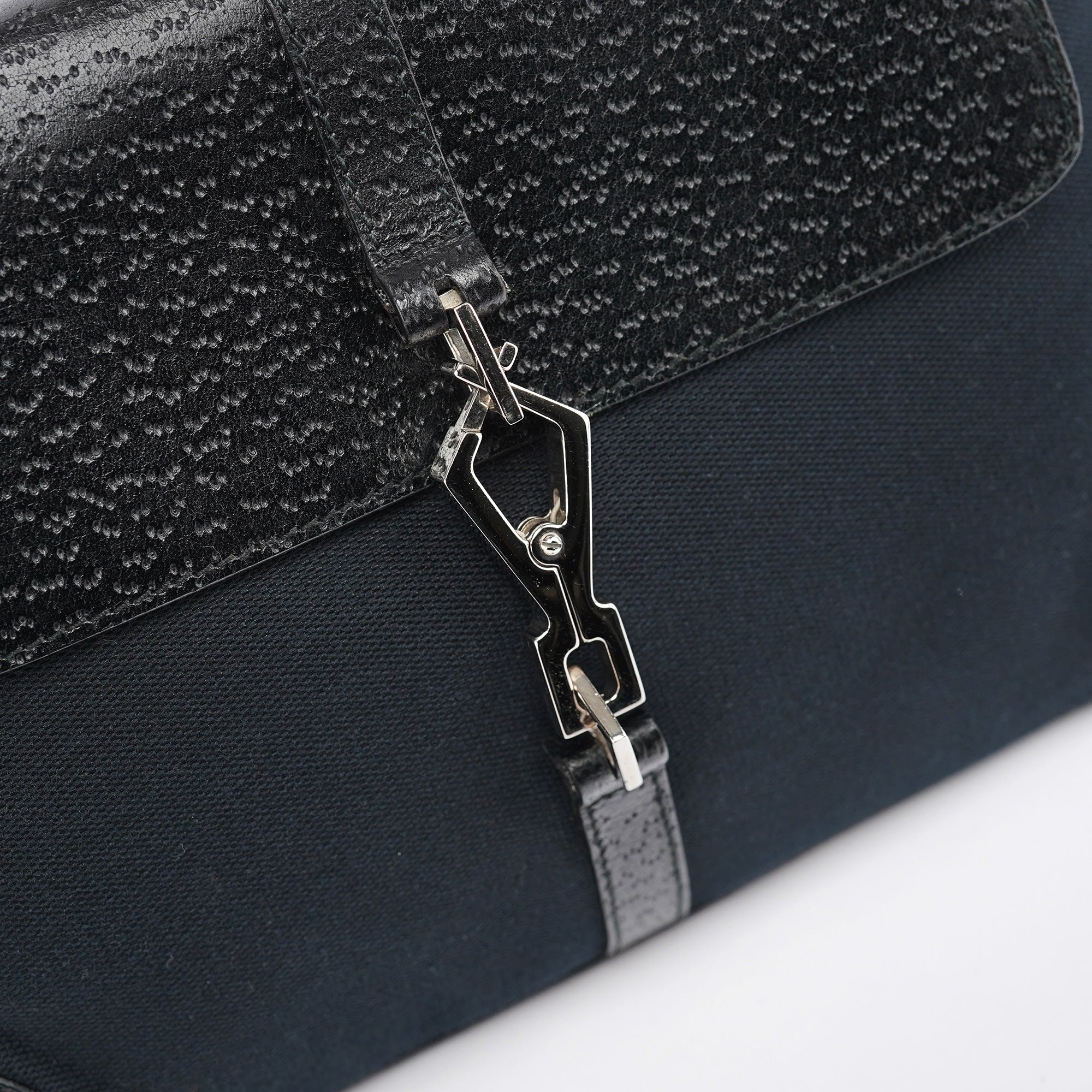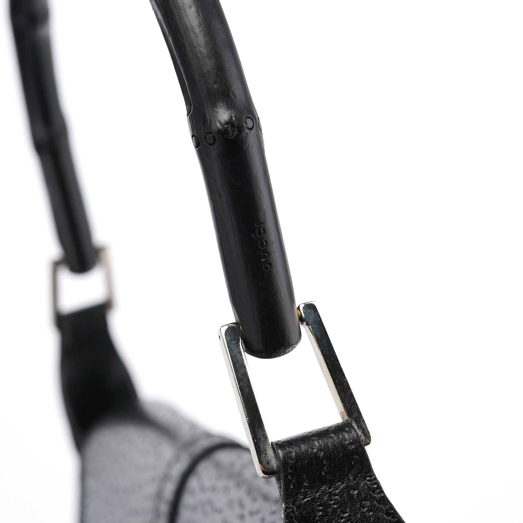 Designed in the early 2000s by Tom Ford, this vintage Gucci Jackie Bamboo shoulder bag features black canvas with black leather trim, combining two house icons in one sophisticated design. The distinctive crescent shape showcases the signature bamboo handle alongside the Jackie's characteristic piston closure with gold-tone hardware. The compact silhouette offers a front flap closure over a spacious interior.