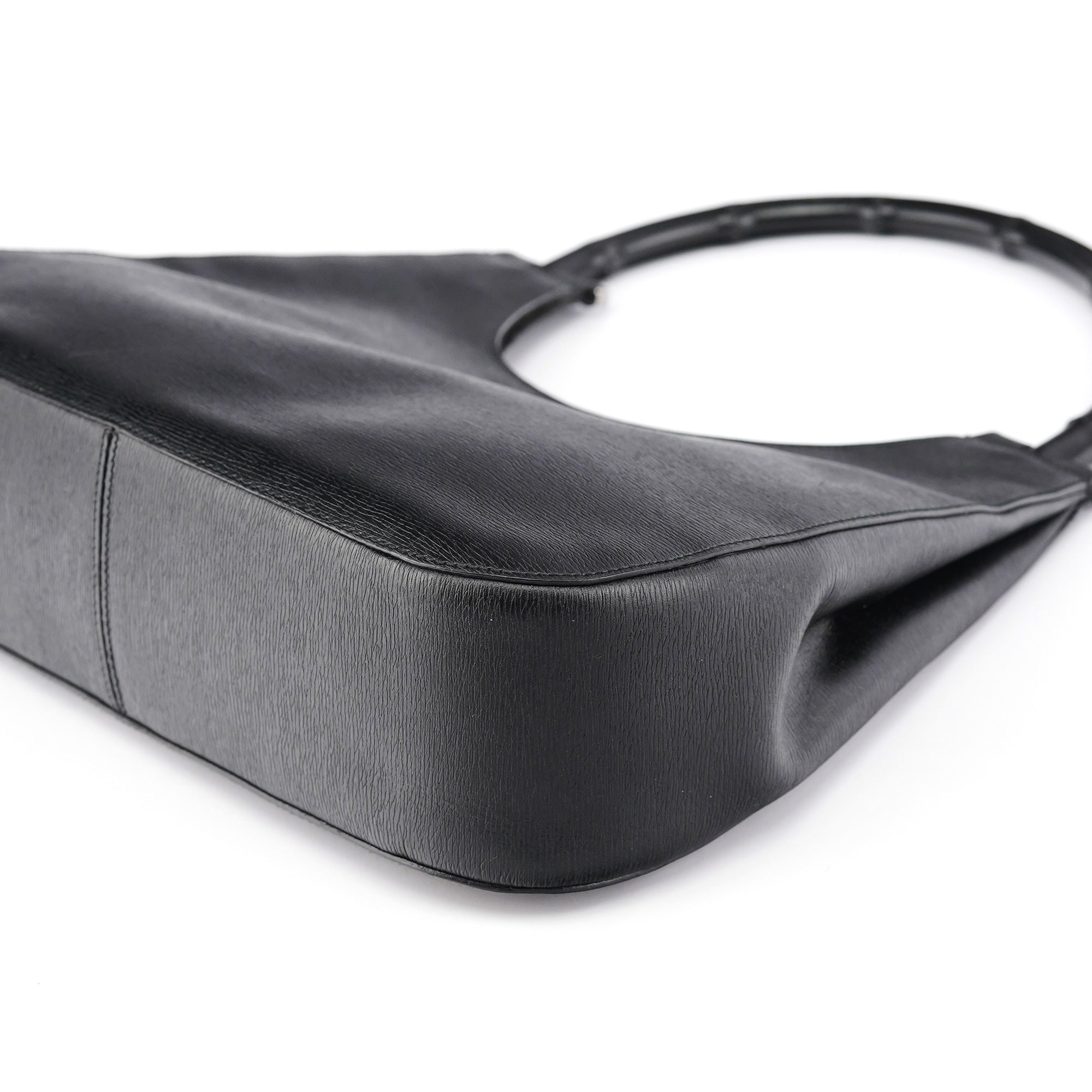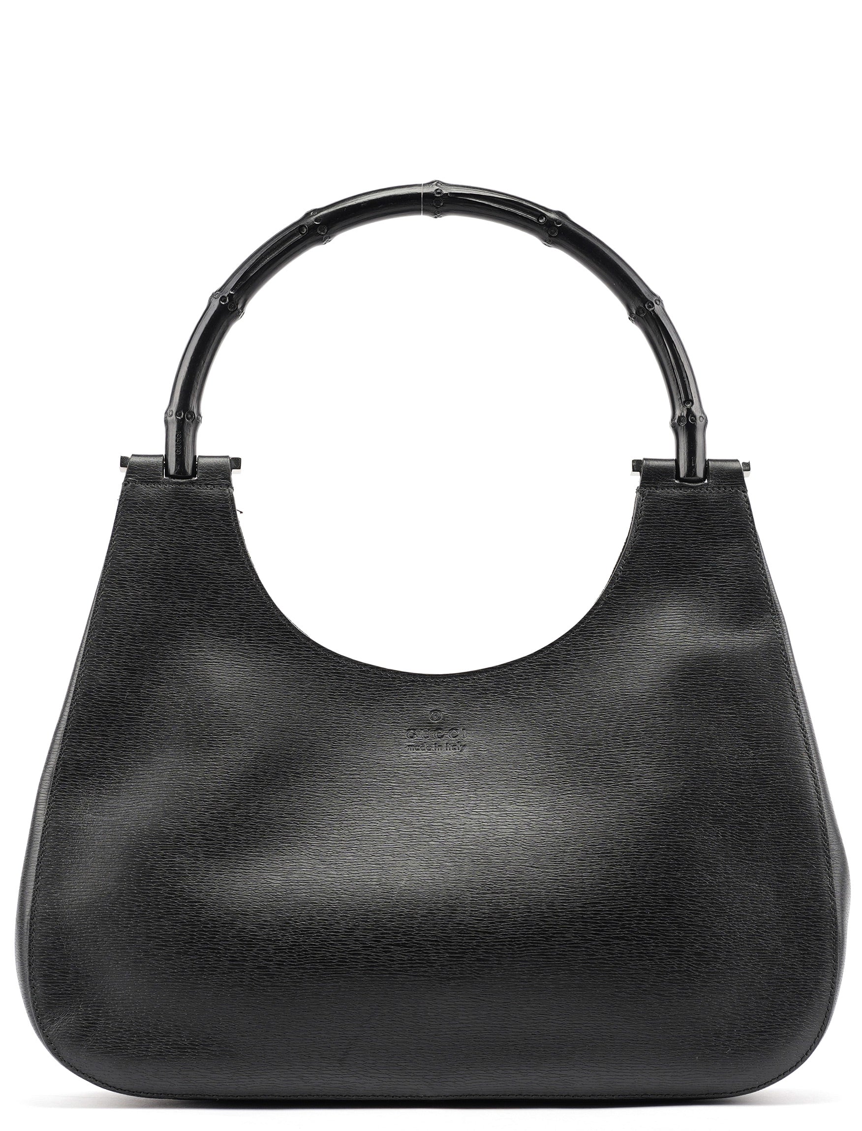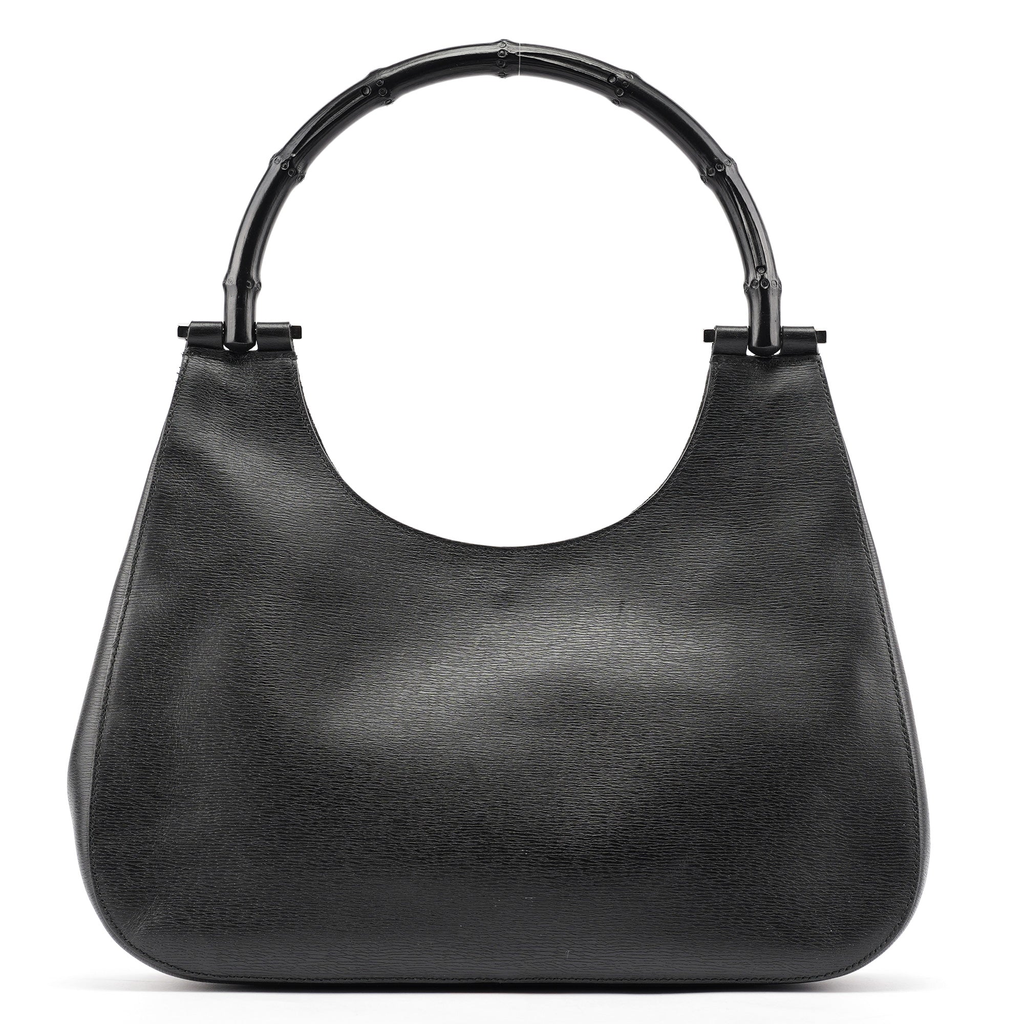 Designed in the early 2000s by Tom Ford, this Gucci bamboo shoulder bag reimagines the house's iconic 1947 bamboo handle design in sleek black leather. Under Ford's vision, Gucci's heritage bamboo motif became a symbol of modern luxury and sophistication. The minimalist hobo silhouette features a curved bamboo top handle with gunmetal hardware attachments and a magnetic closure. The interior is lined in fabric with interior pockets.