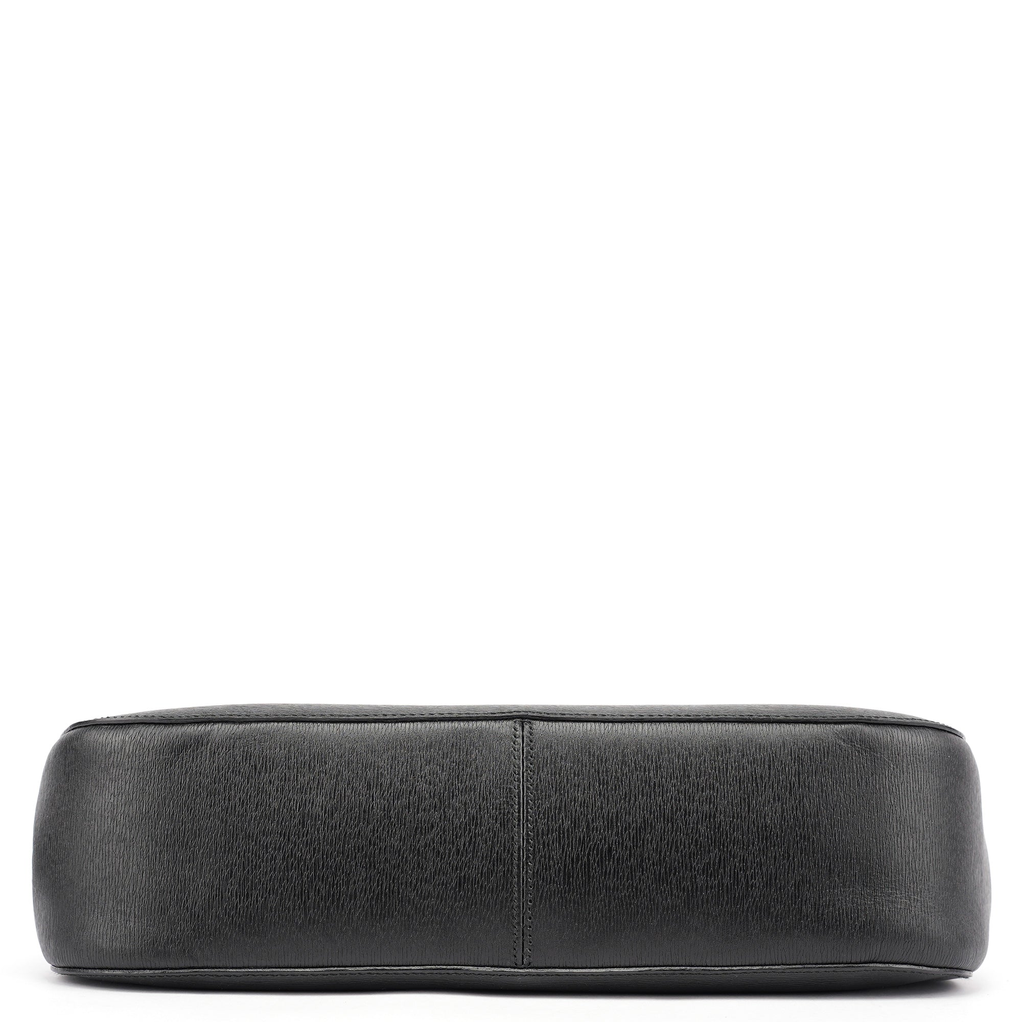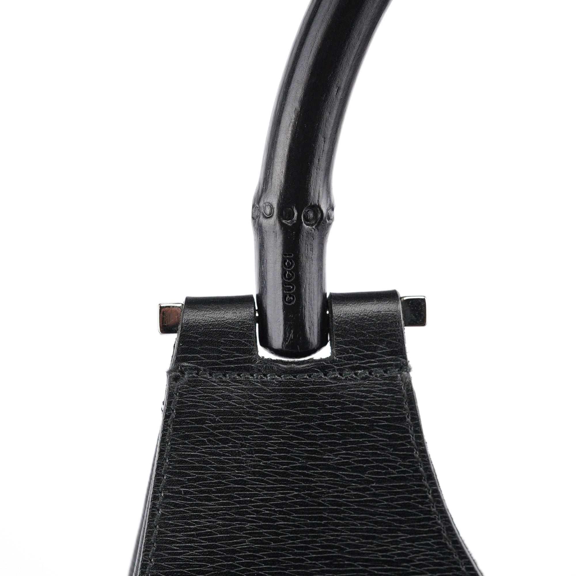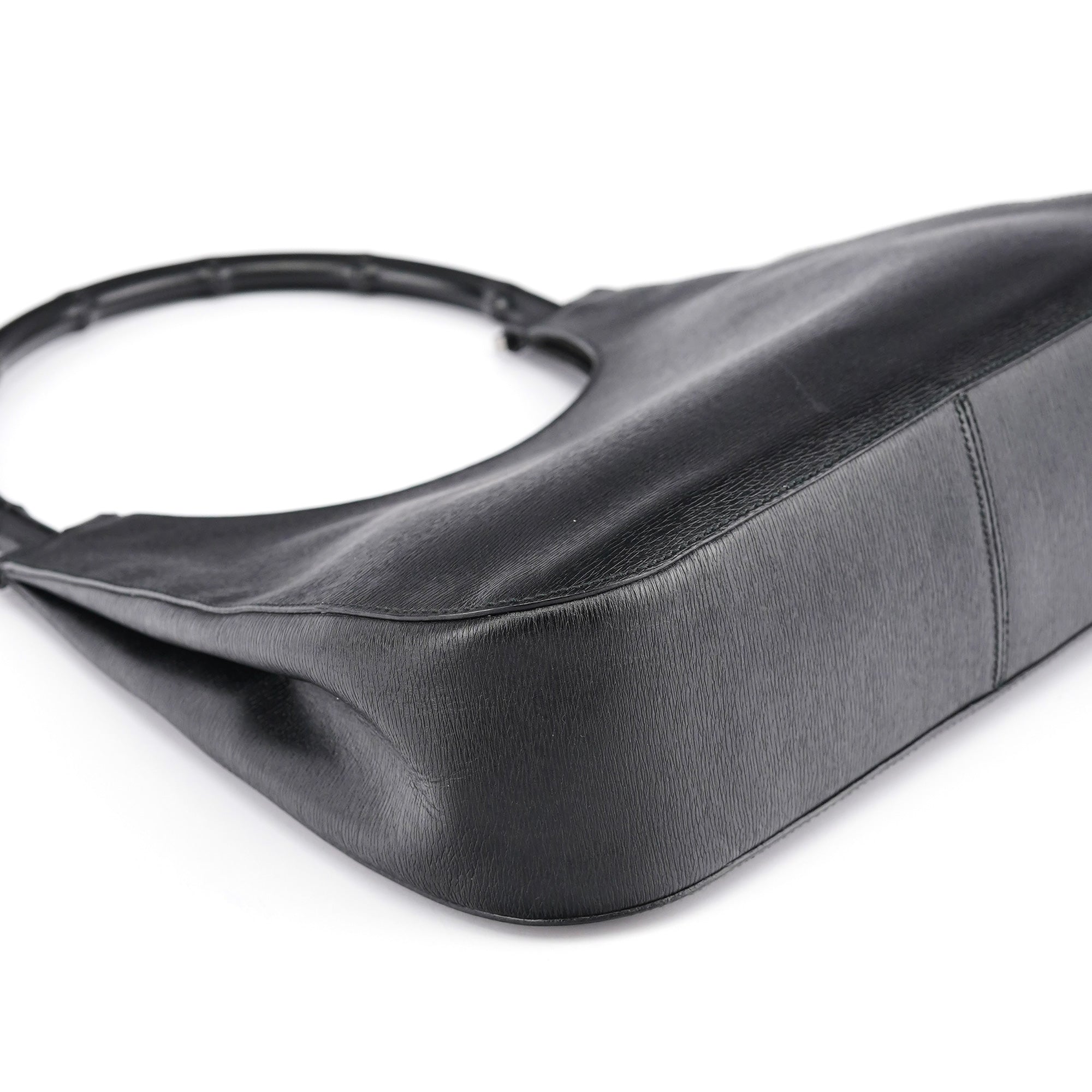 Designed in the early 2000s by Tom Ford, this Gucci bamboo shoulder bag reimagines the house's iconic 1947 bamboo handle design in sleek black leather. Under Ford's vision, Gucci's heritage bamboo motif became a symbol of modern luxury and sophistication. The minimalist hobo silhouette features a curved bamboo top handle with gunmetal hardware attachments and a magnetic closure. The interior is lined in fabric with interior pockets.