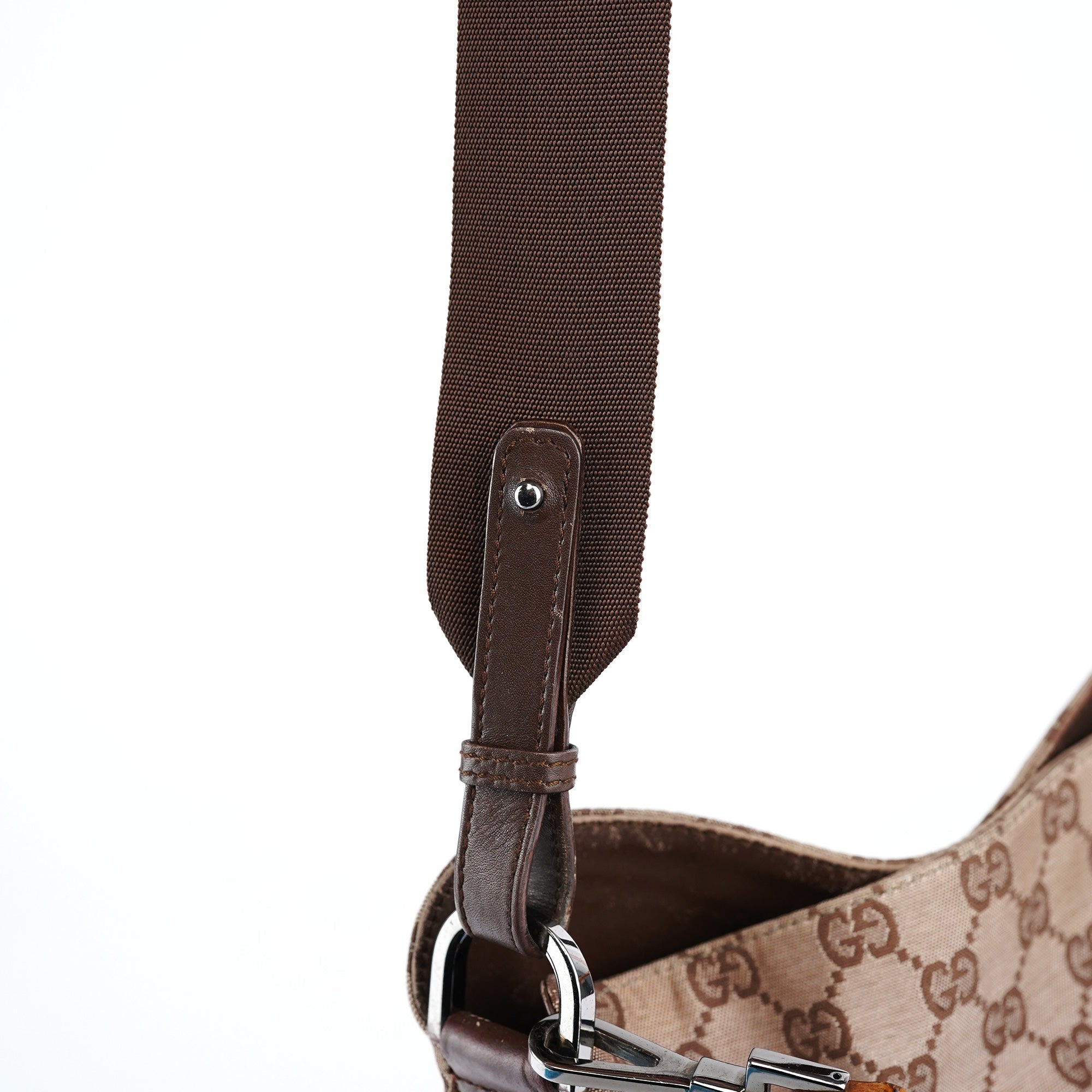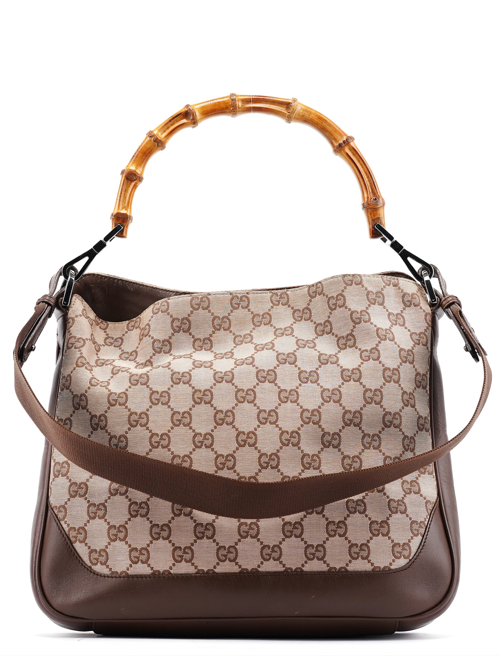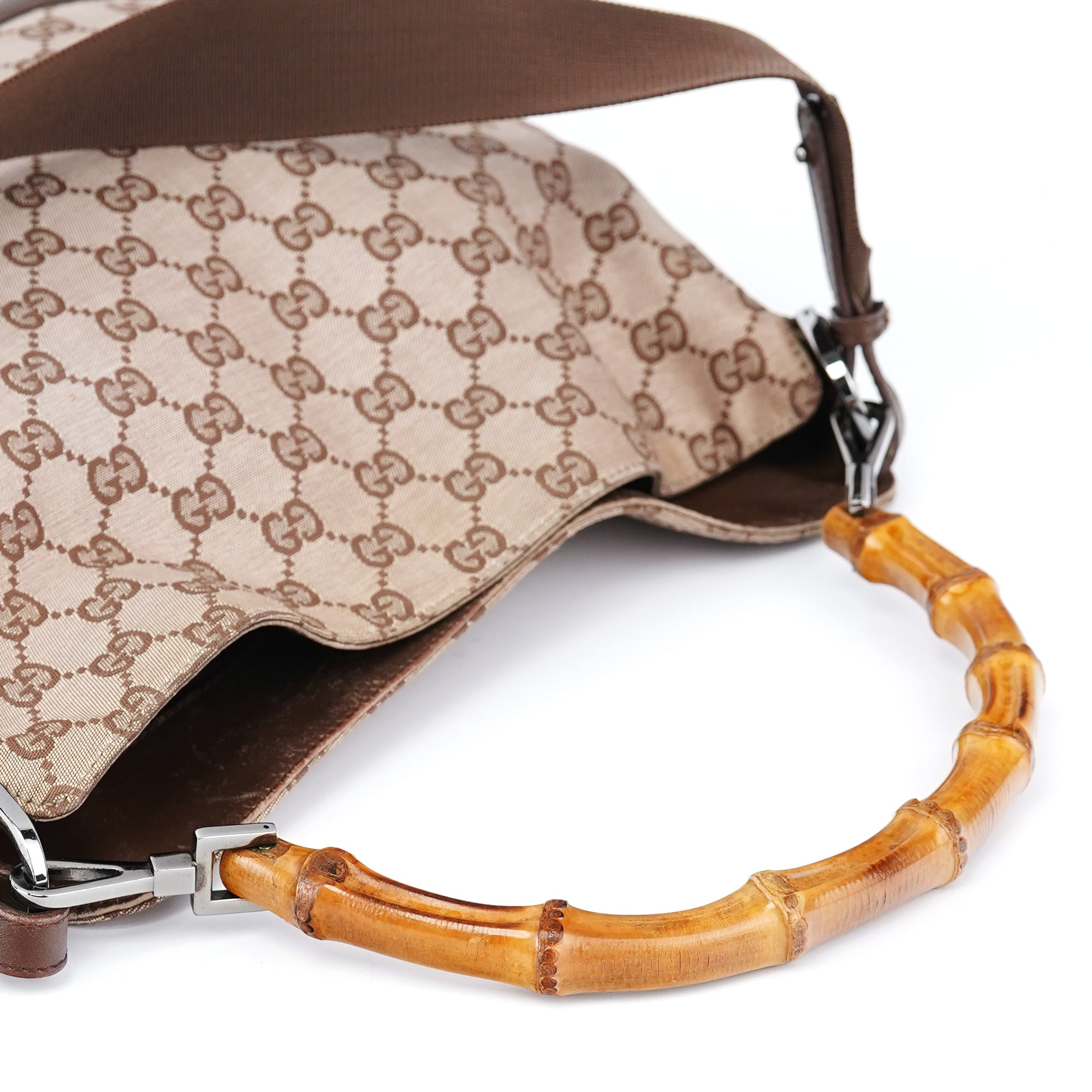 Designed in the early 2000's by Tom Ford, this vintage Gucci GG Bamboo bag features beige GG canvas with brown leather trim and iconic bamboo top handles. The versatile silhouette includes a removable shoulder strap for dual carrying options, a zip-top closure, and hardware accents. The fabric-lined interior offers practical storage for everyday essentials.