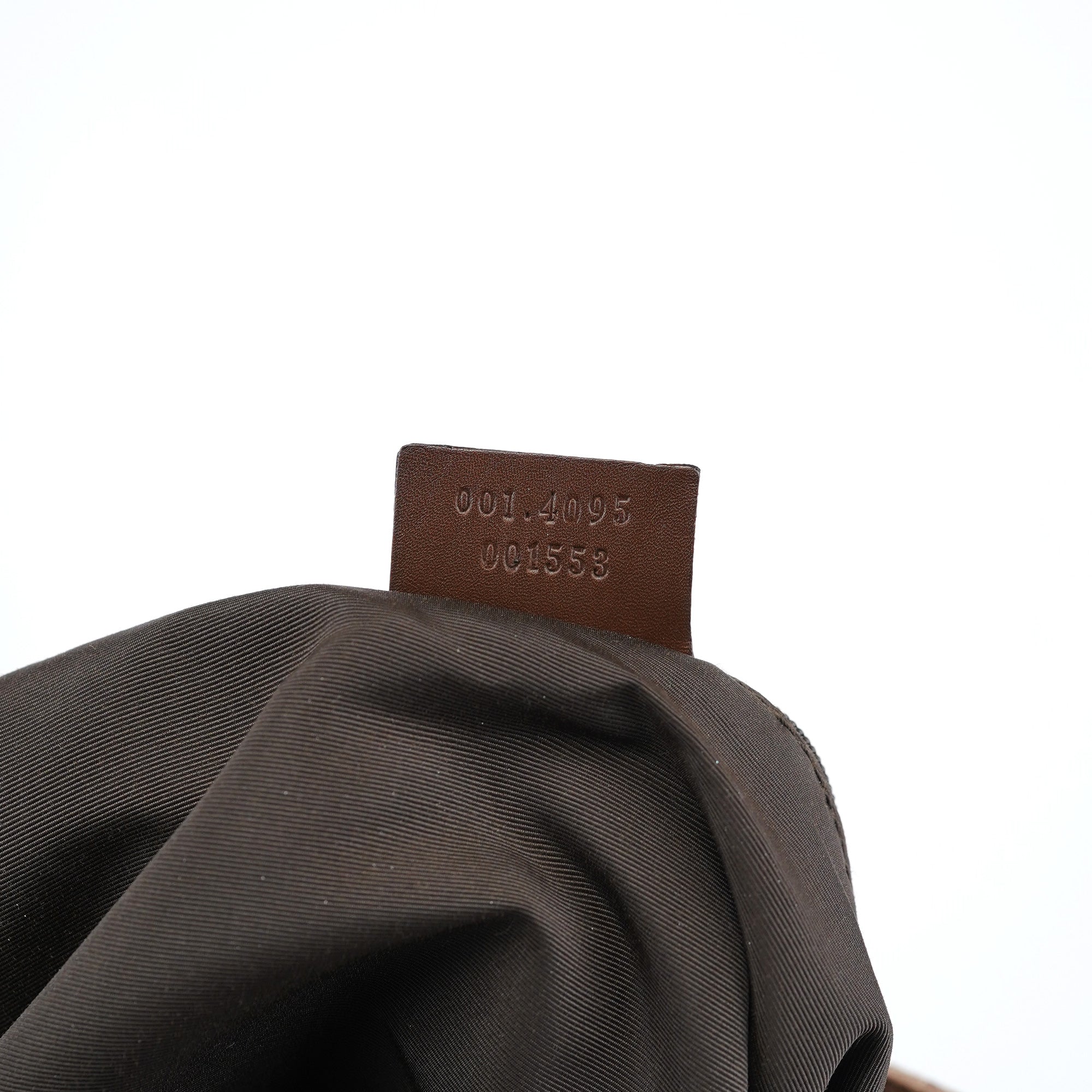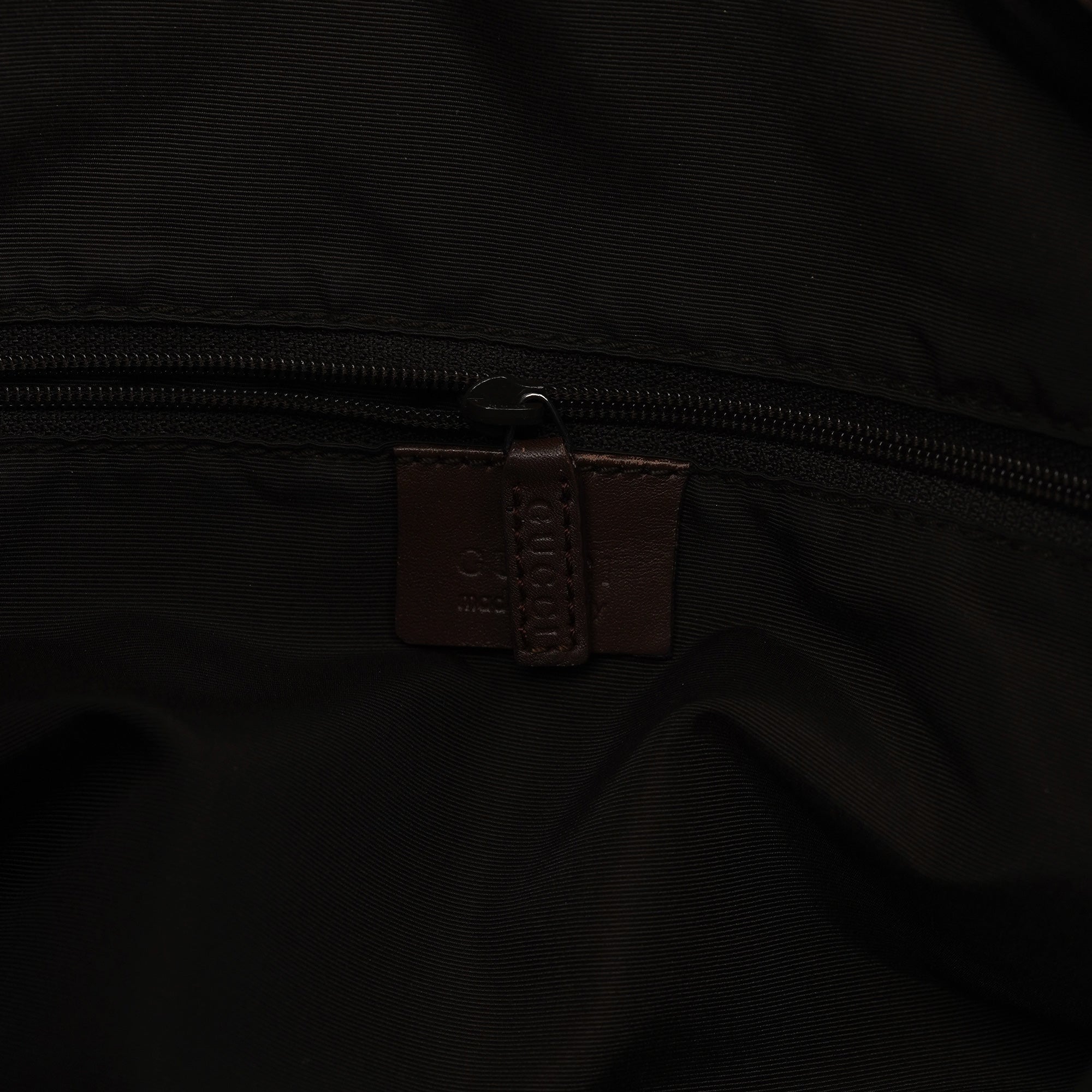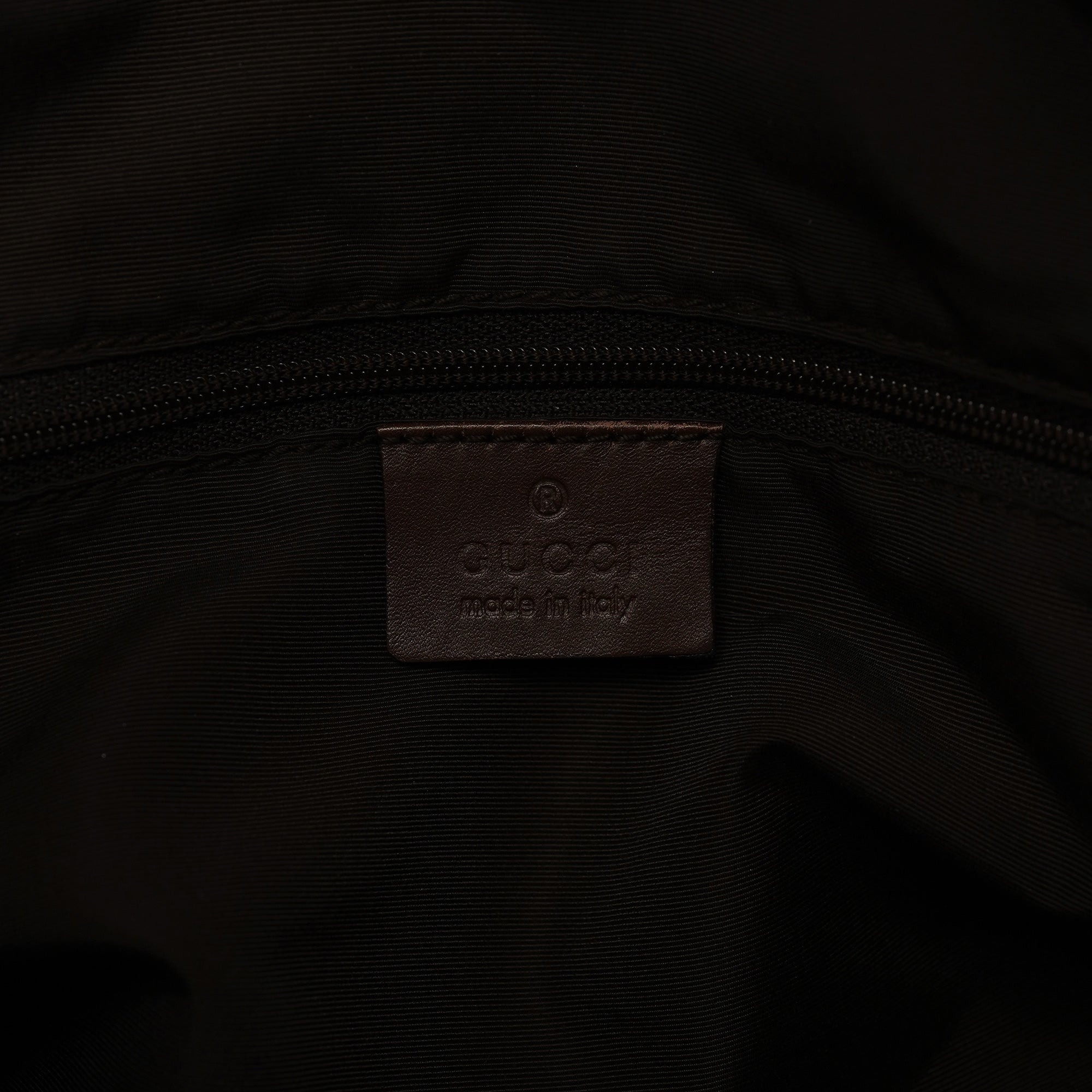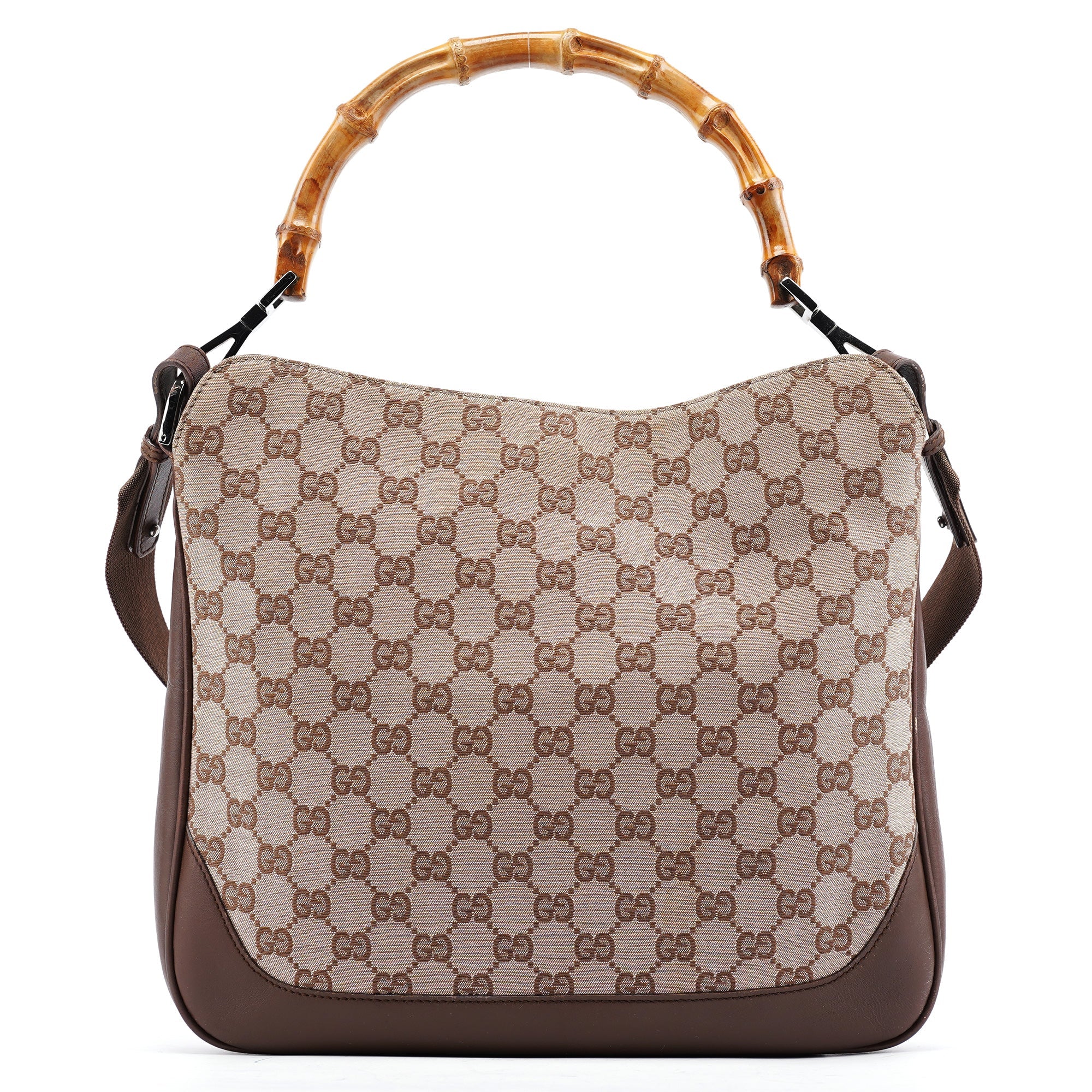 Designed in the early 2000's by Tom Ford, this vintage Gucci GG Bamboo bag features beige GG canvas with brown leather trim and iconic bamboo top handles. The versatile silhouette includes a removable shoulder strap for dual carrying options, a zip-top closure, and hardware accents. The fabric-lined interior offers practical storage for everyday essentials.