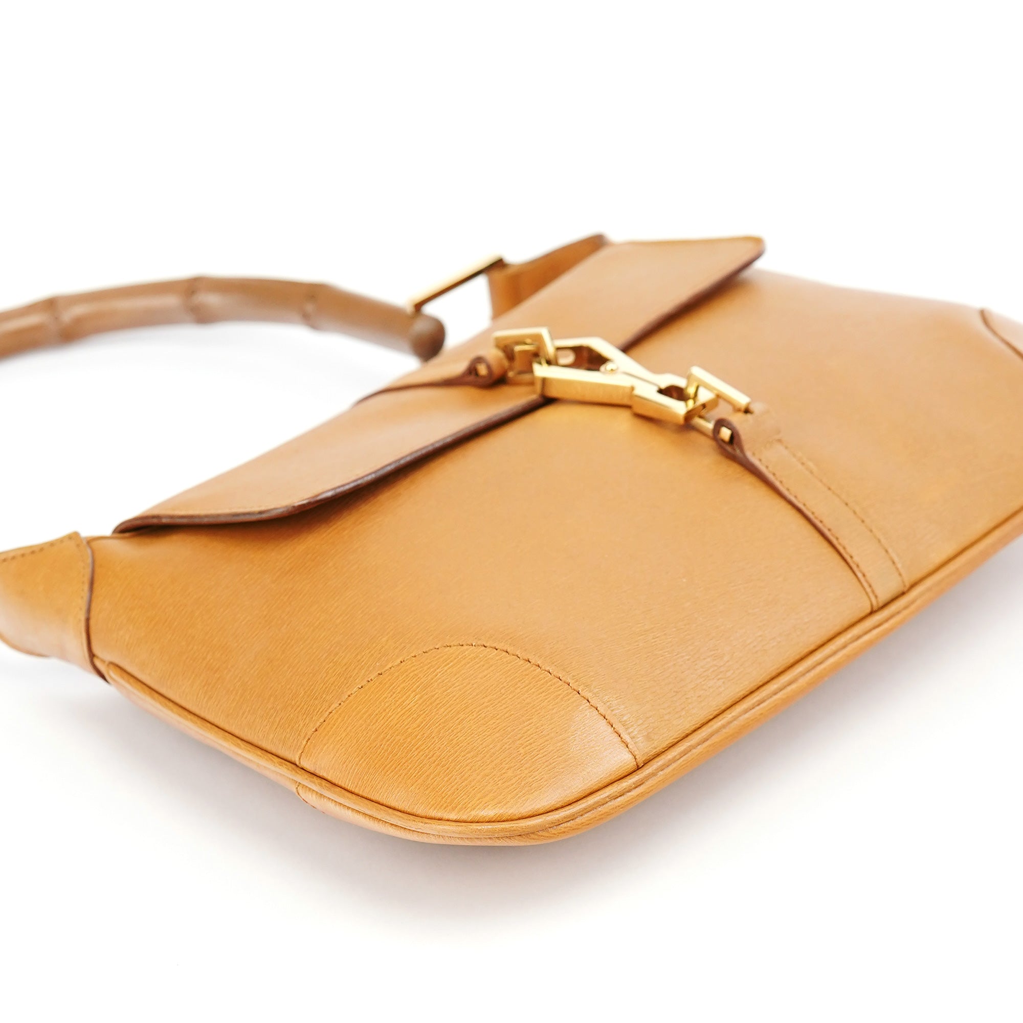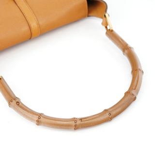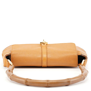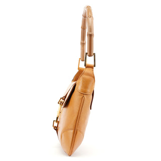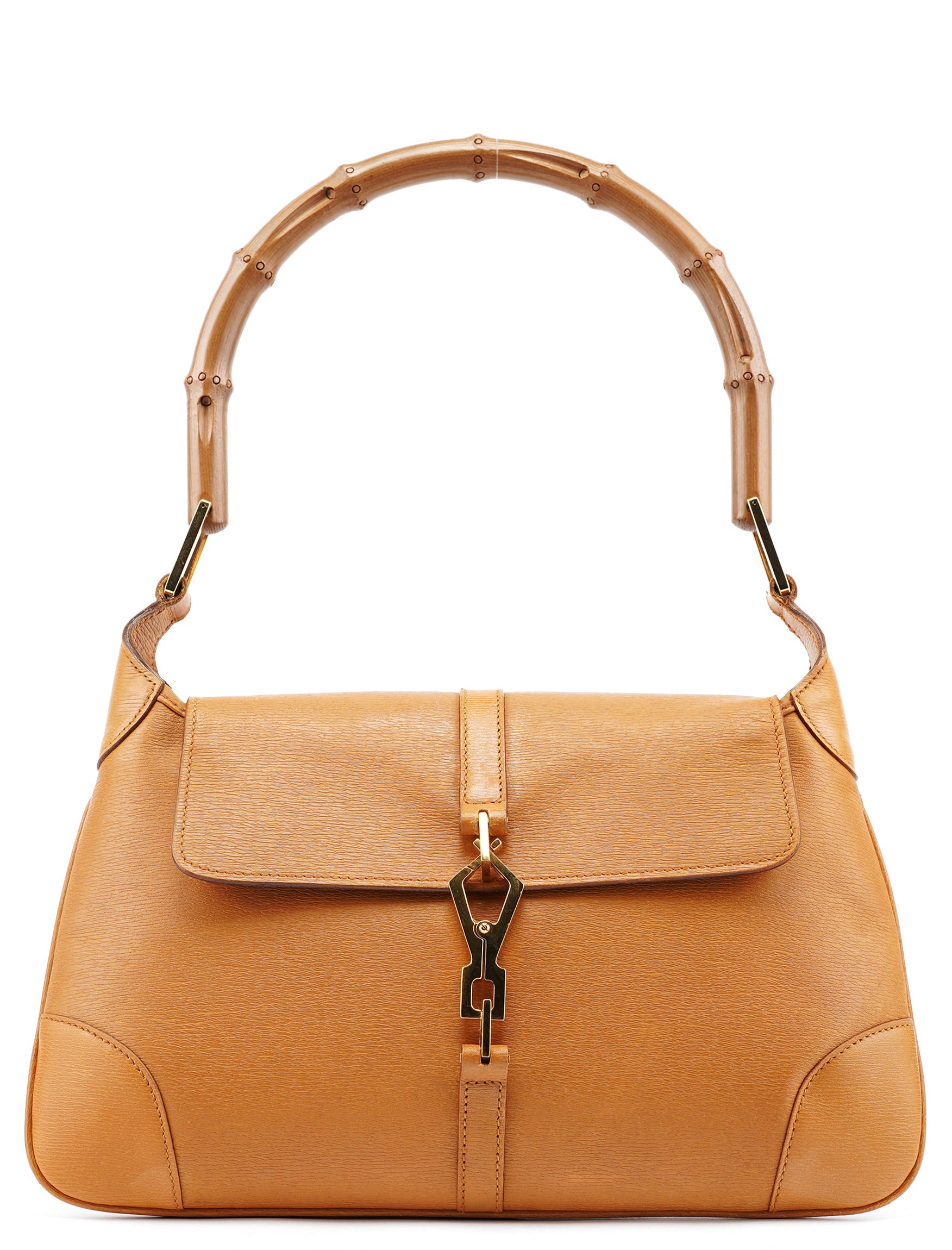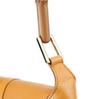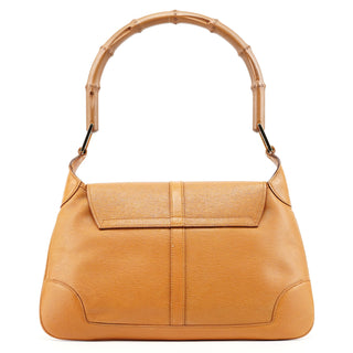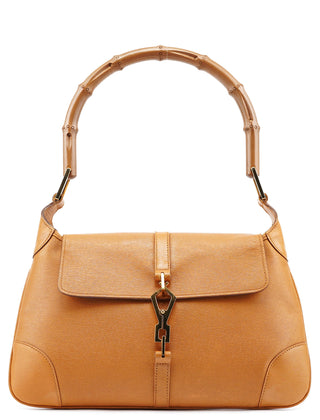 Designed in the early 2000s by Tom Ford, this Gucci Jackie Bamboo bag is crafted in tan leather with a structured flap silhouette and signature bamboo handle. It features gold-tone piston hardware, a fabric-lined interior, and a zip pocket for essentials.