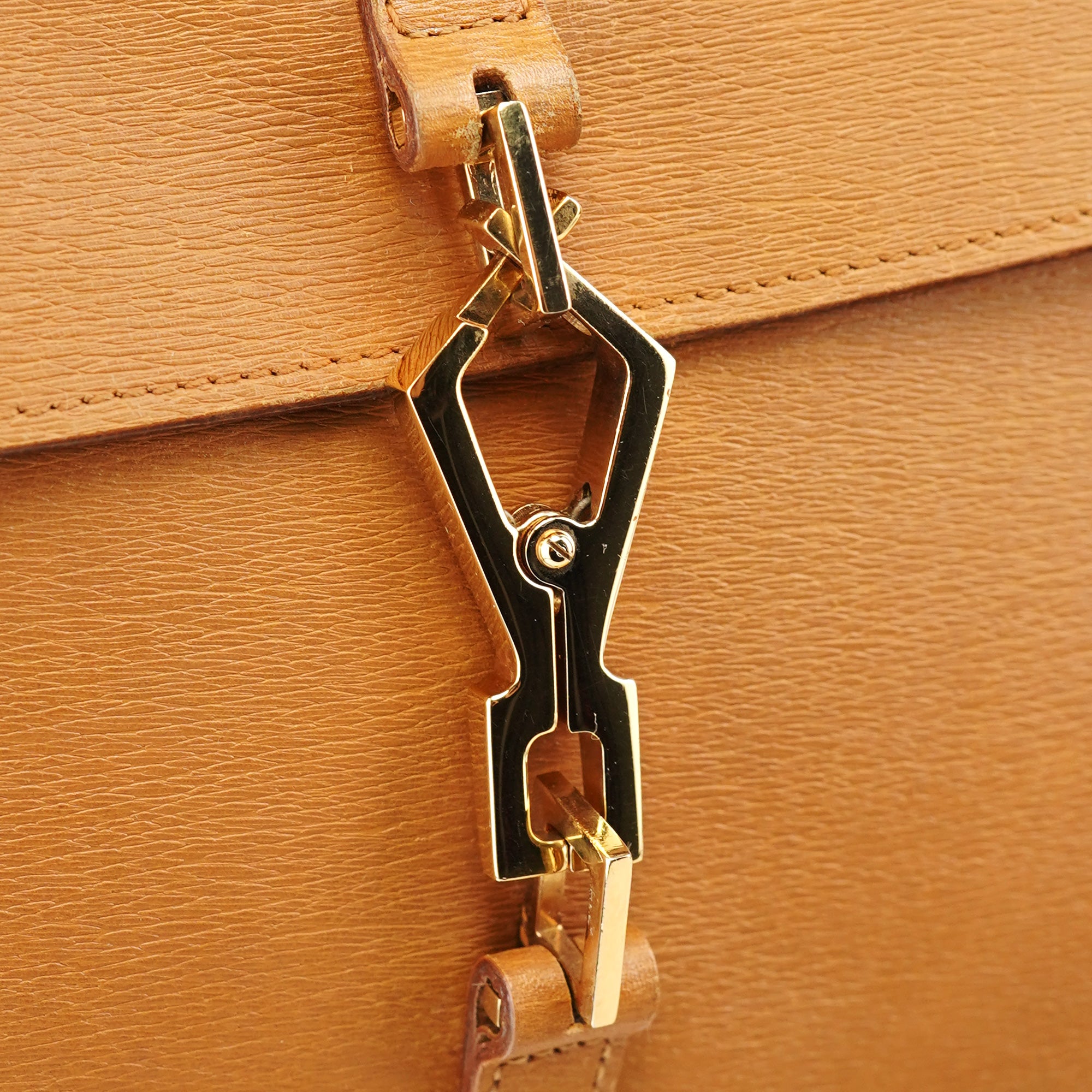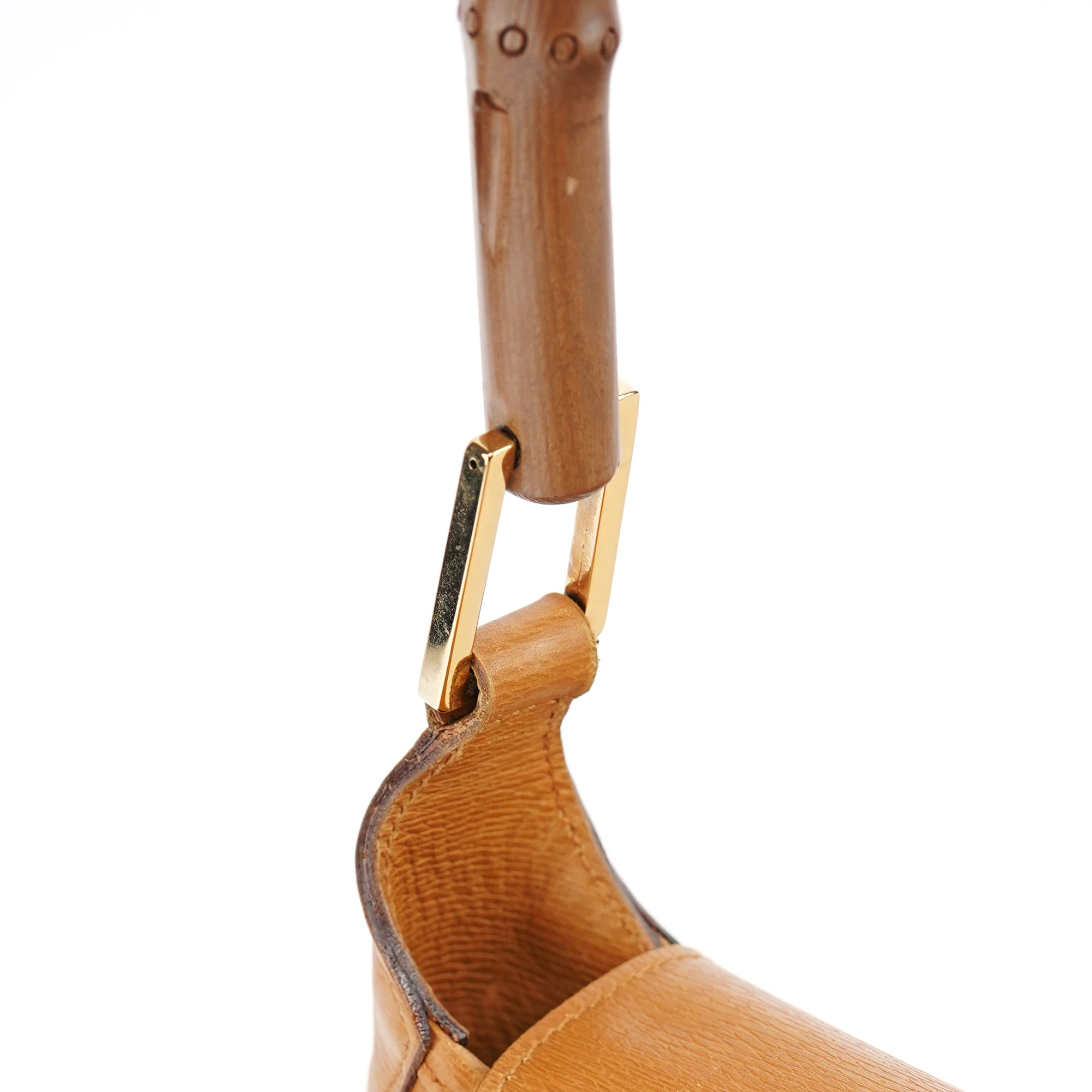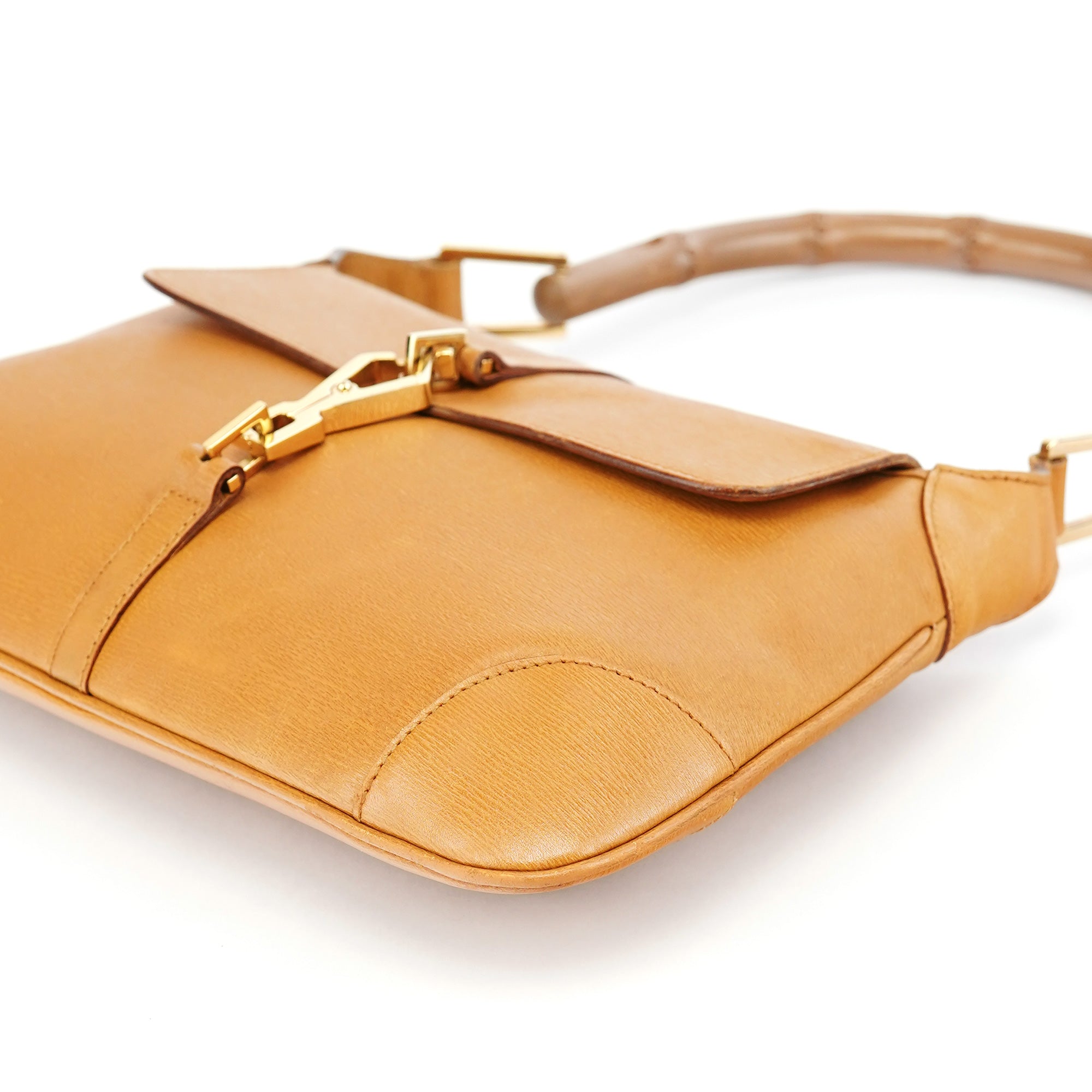 Designed in the early 2000s by Tom Ford, this Gucci Jackie Bamboo bag is crafted in tan leather with a structured flap silhouette and signature bamboo handle. It features gold-tone piston hardware, a fabric-lined interior, and a zip pocket for essentials.
