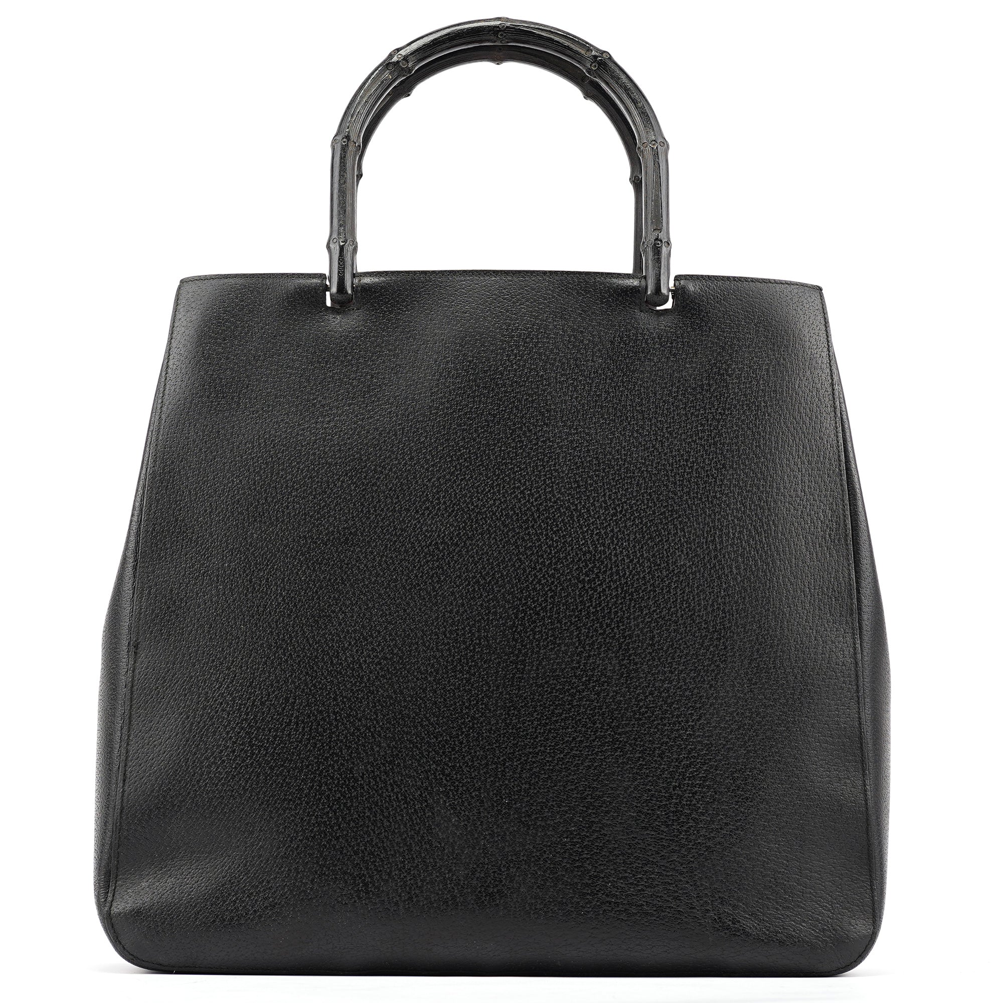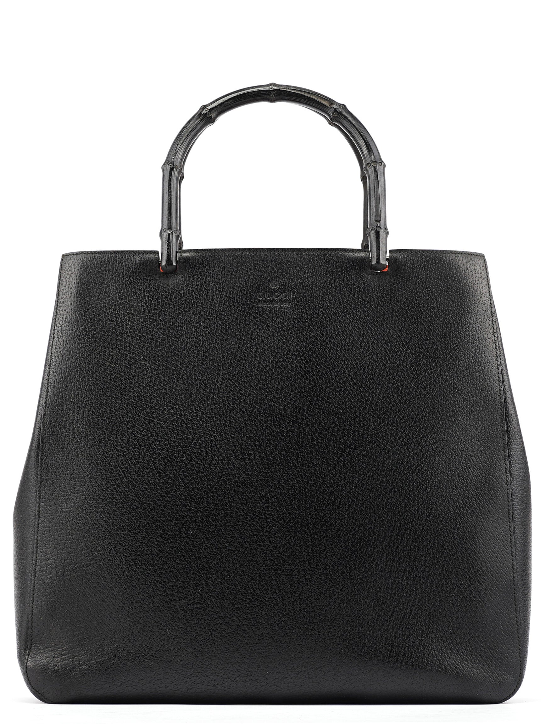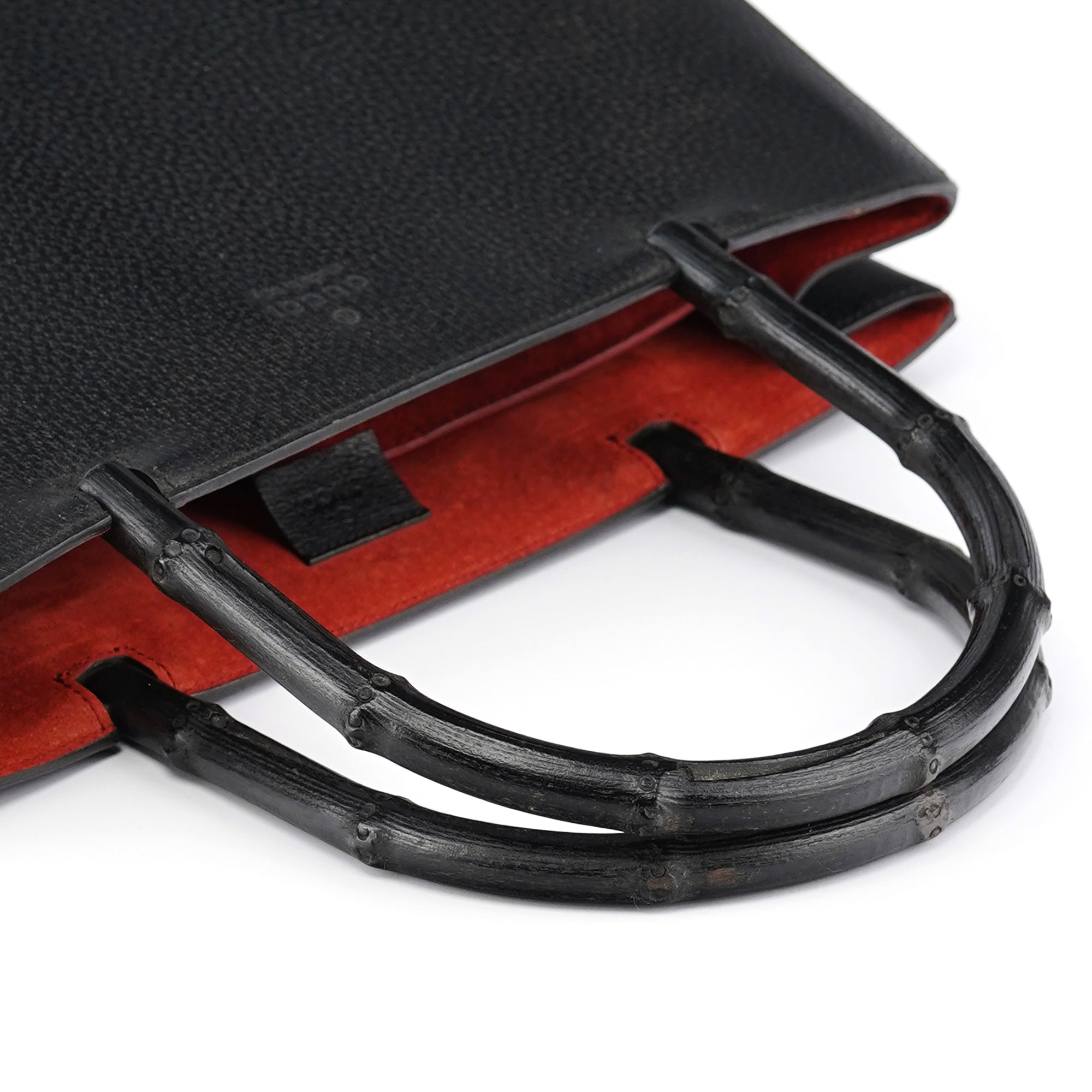 Designed in the late 1990s by Tom Ford, this vintage Gucci tote is crafted in black pebbled leather with a sculptural silhouette and engraved black bamboo top handles. The interior is lined in bold red suede and features tonal embossed branding on both the exterior and the interior leather tab.