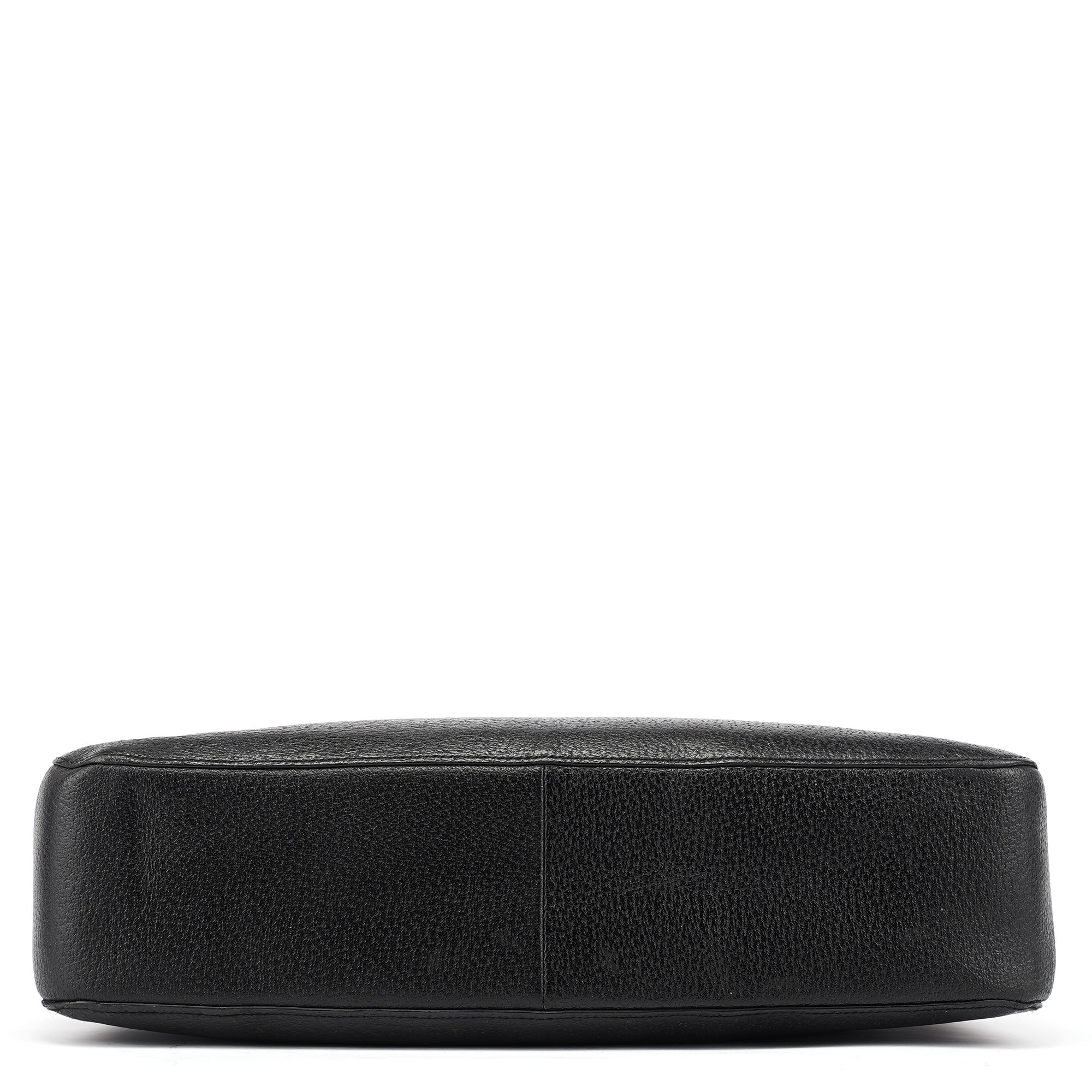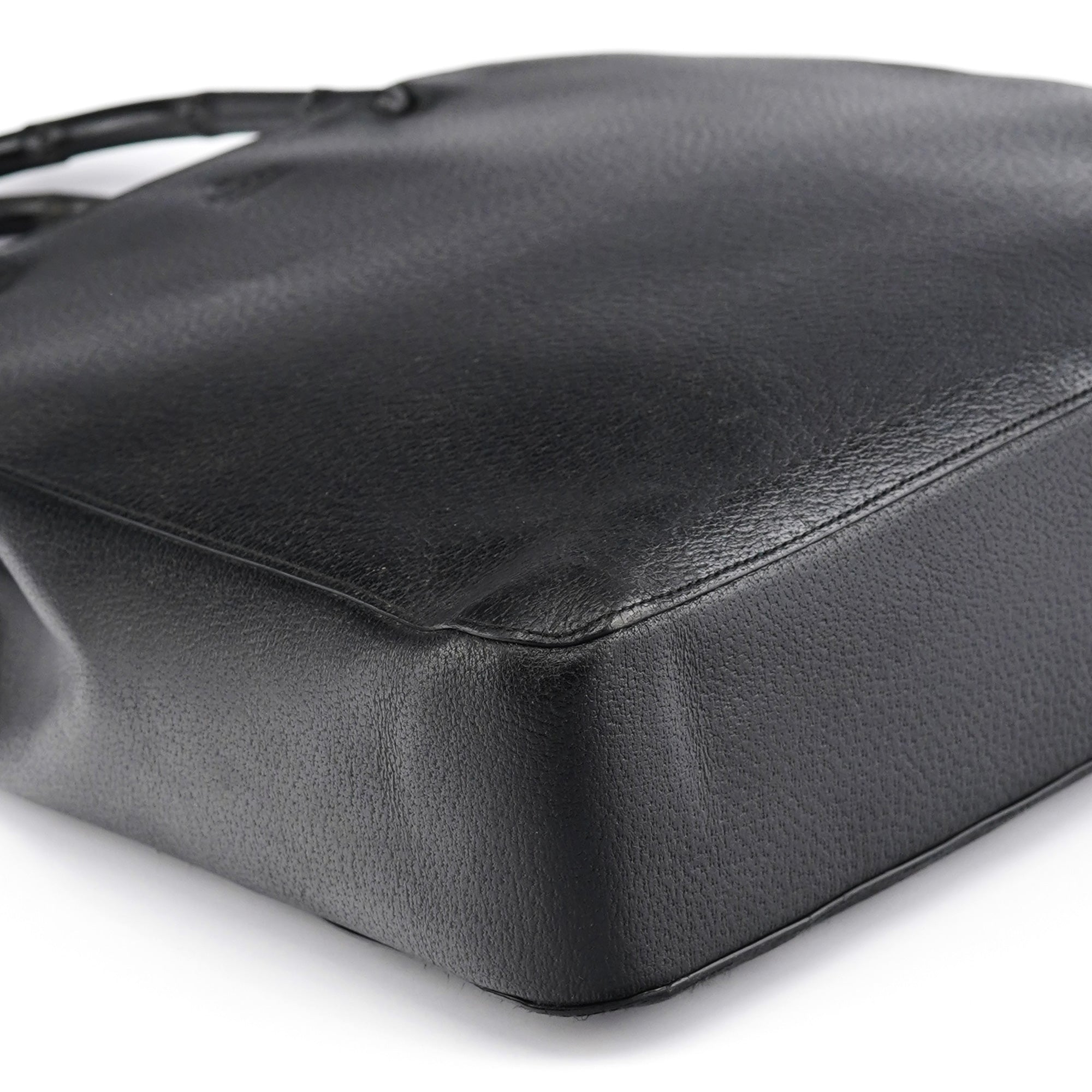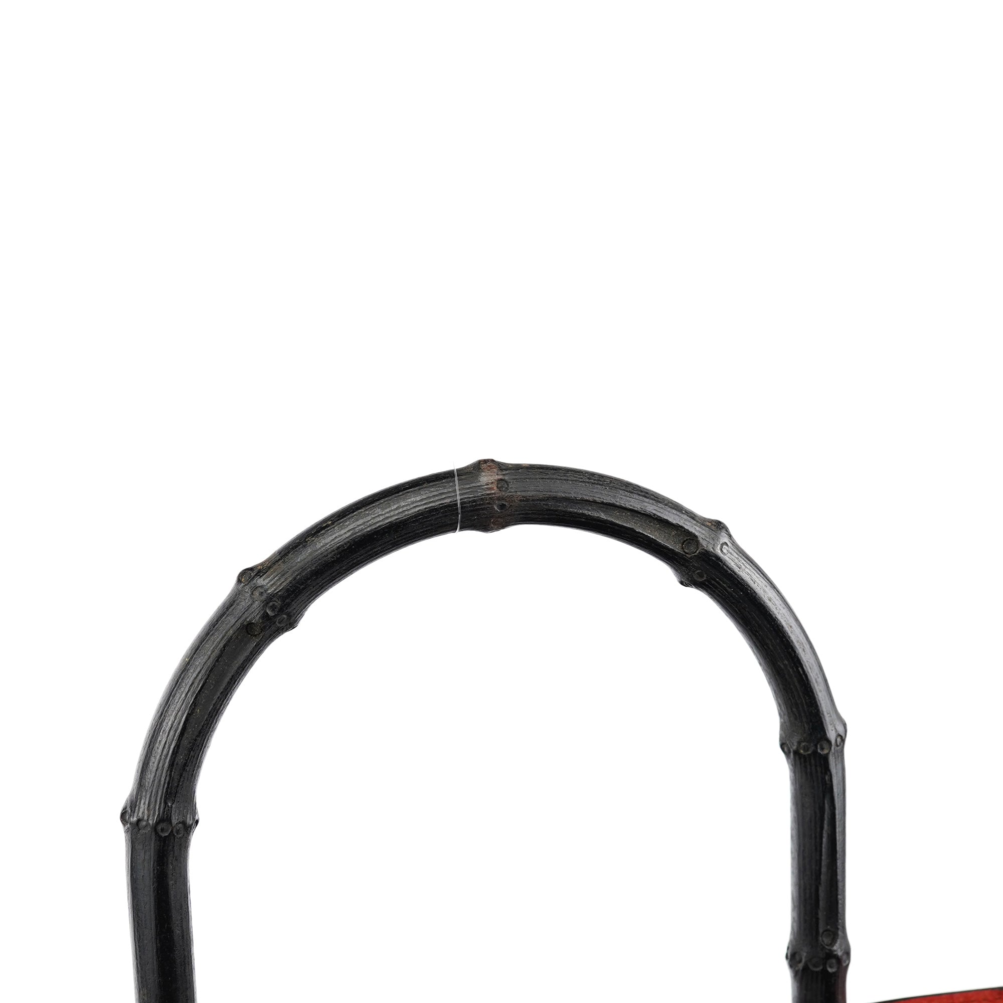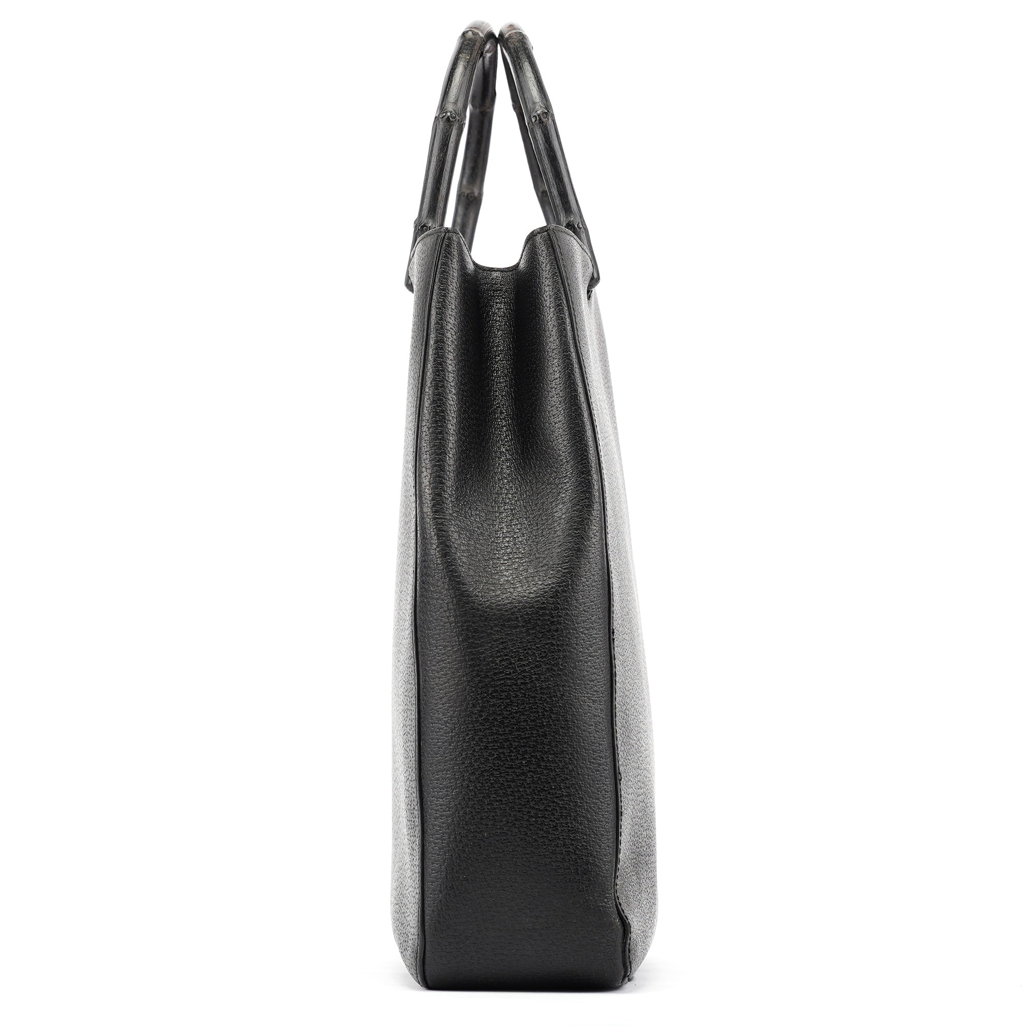 Designed in the late 1990s by Tom Ford, this vintage Gucci tote is crafted in black pebbled leather with a sculptural silhouette and engraved black bamboo top handles. The interior is lined in bold red suede and features tonal embossed branding on both the exterior and the interior leather tab.