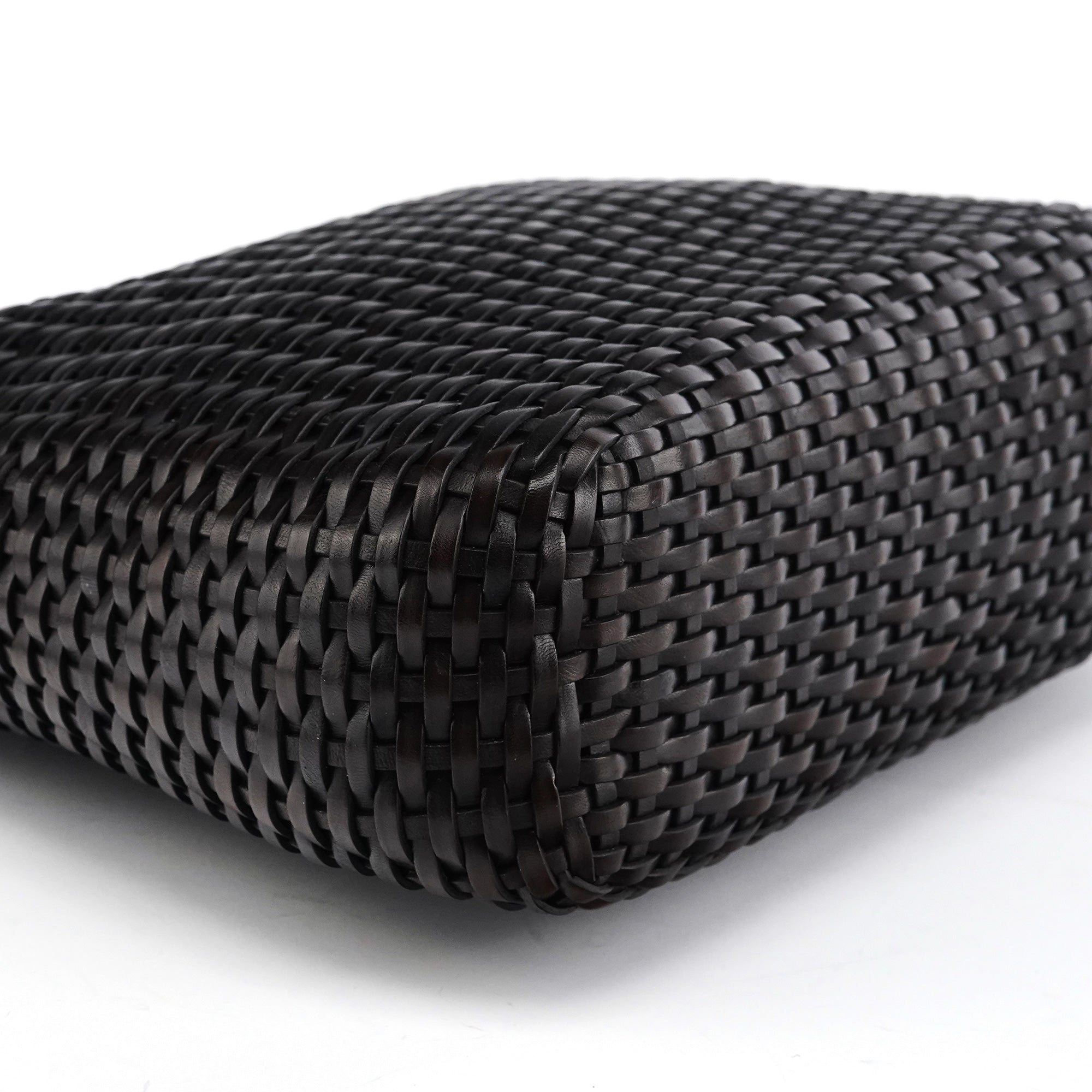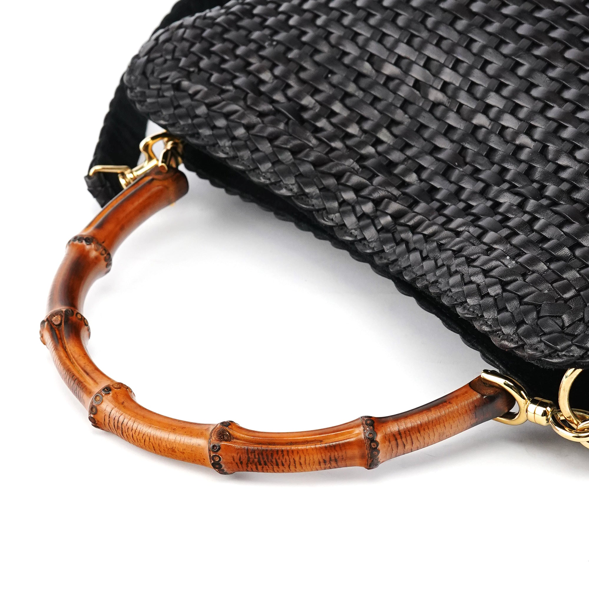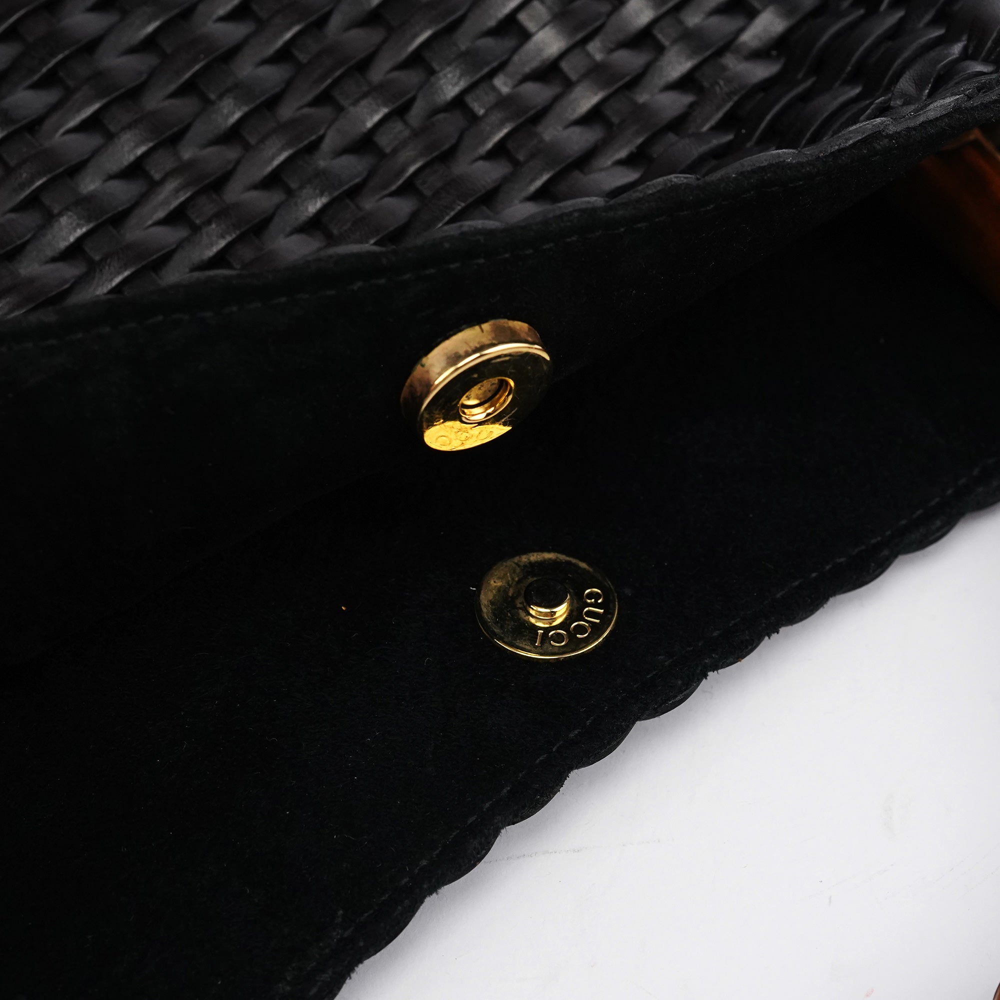 Designed in 1996 by Tom Ford, this rare Gucci Bamboo 2-way bag is crafted in tightly woven dark brown leather with a structured silhouette and signature bamboo top handle. The design features gold-tone hardware, a detachable braided leather shoulder strap, and a magnetic snap closure. The interior is lined in black suede with a single zip pocket.