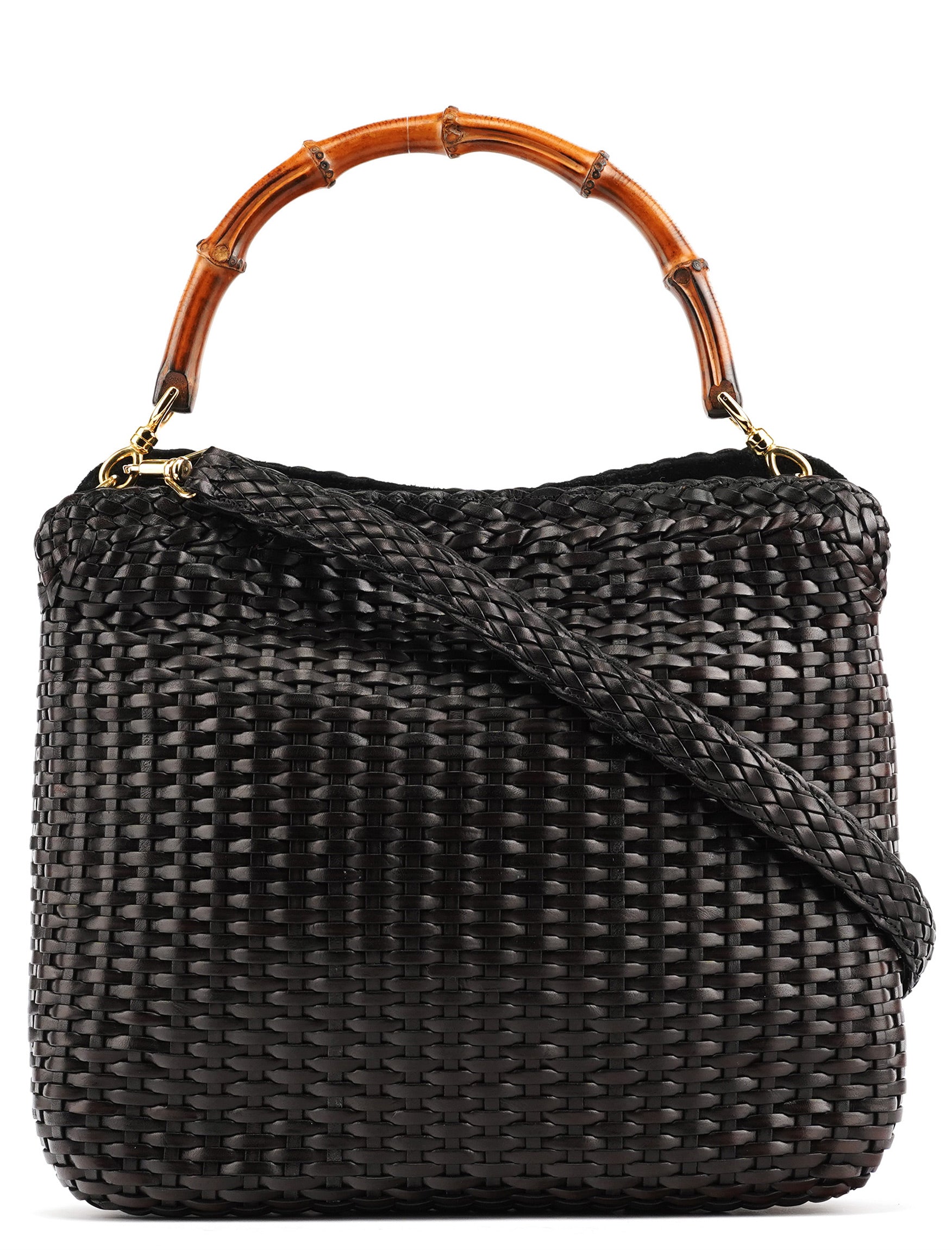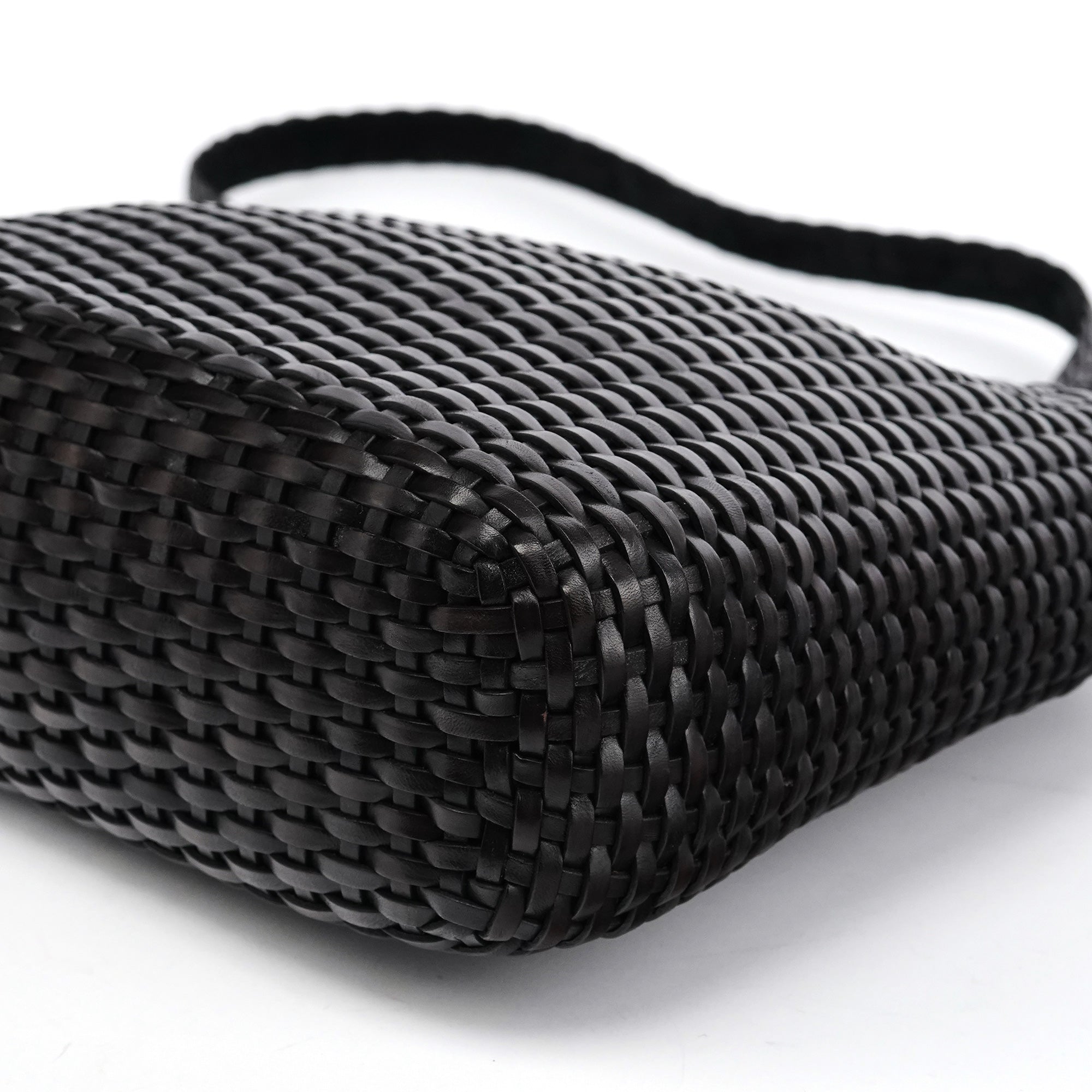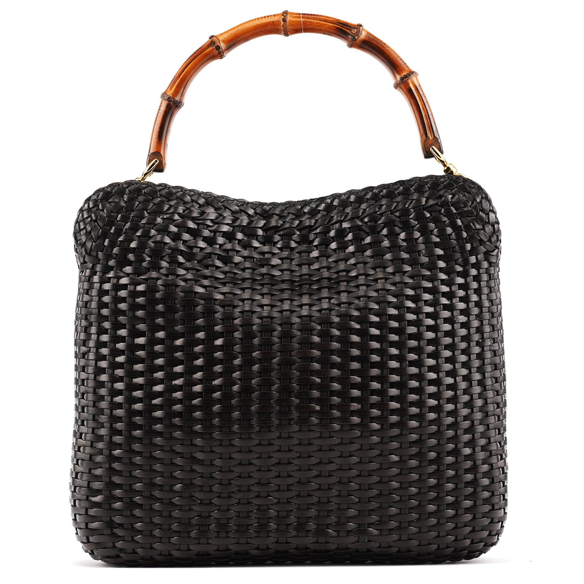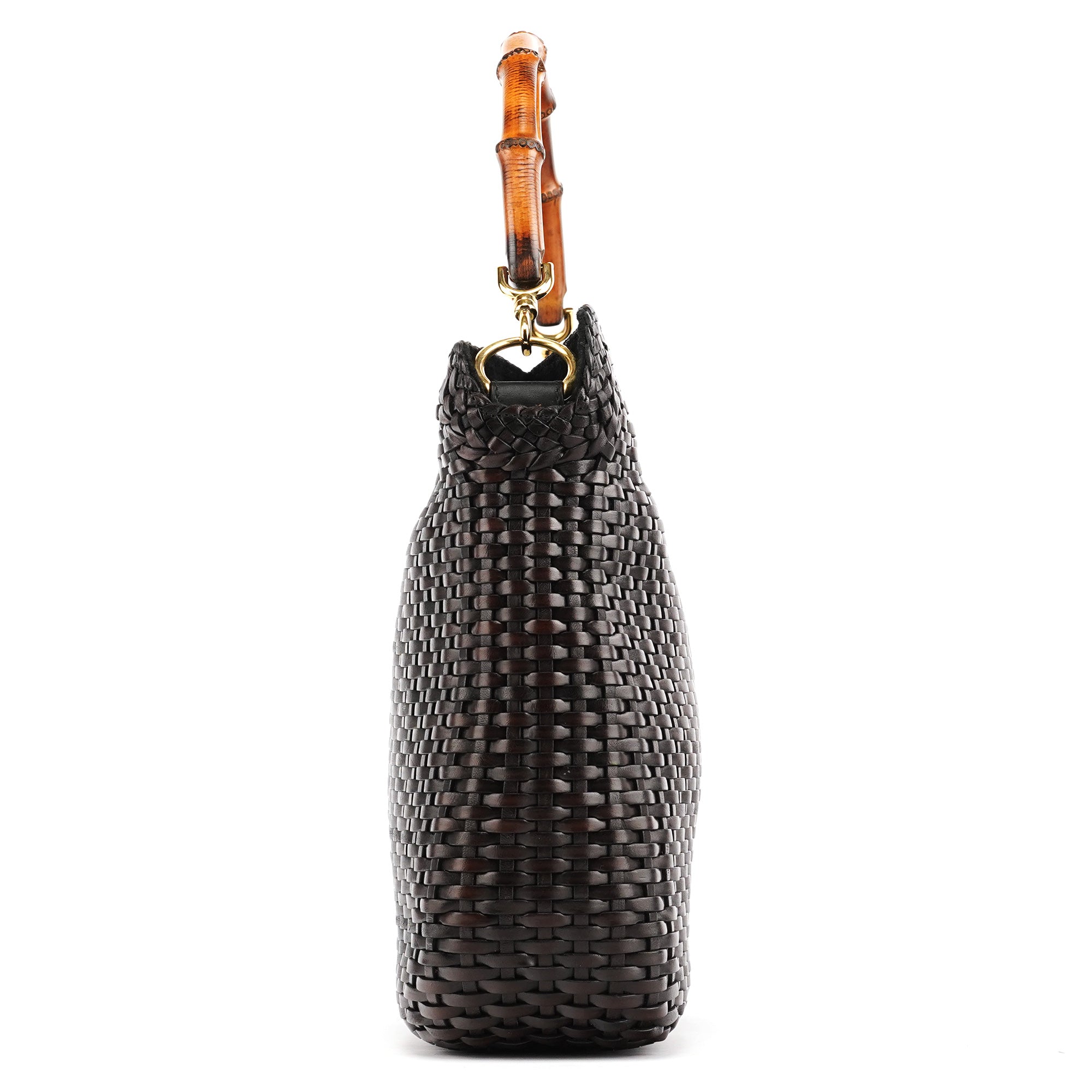 Designed in 1996 by Tom Ford, this rare Gucci Bamboo 2-way bag is crafted in tightly woven dark brown leather with a structured silhouette and signature bamboo top handle. The design features gold-tone hardware, a detachable braided leather shoulder strap, and a magnetic snap closure. The interior is lined in black suede with a single zip pocket.