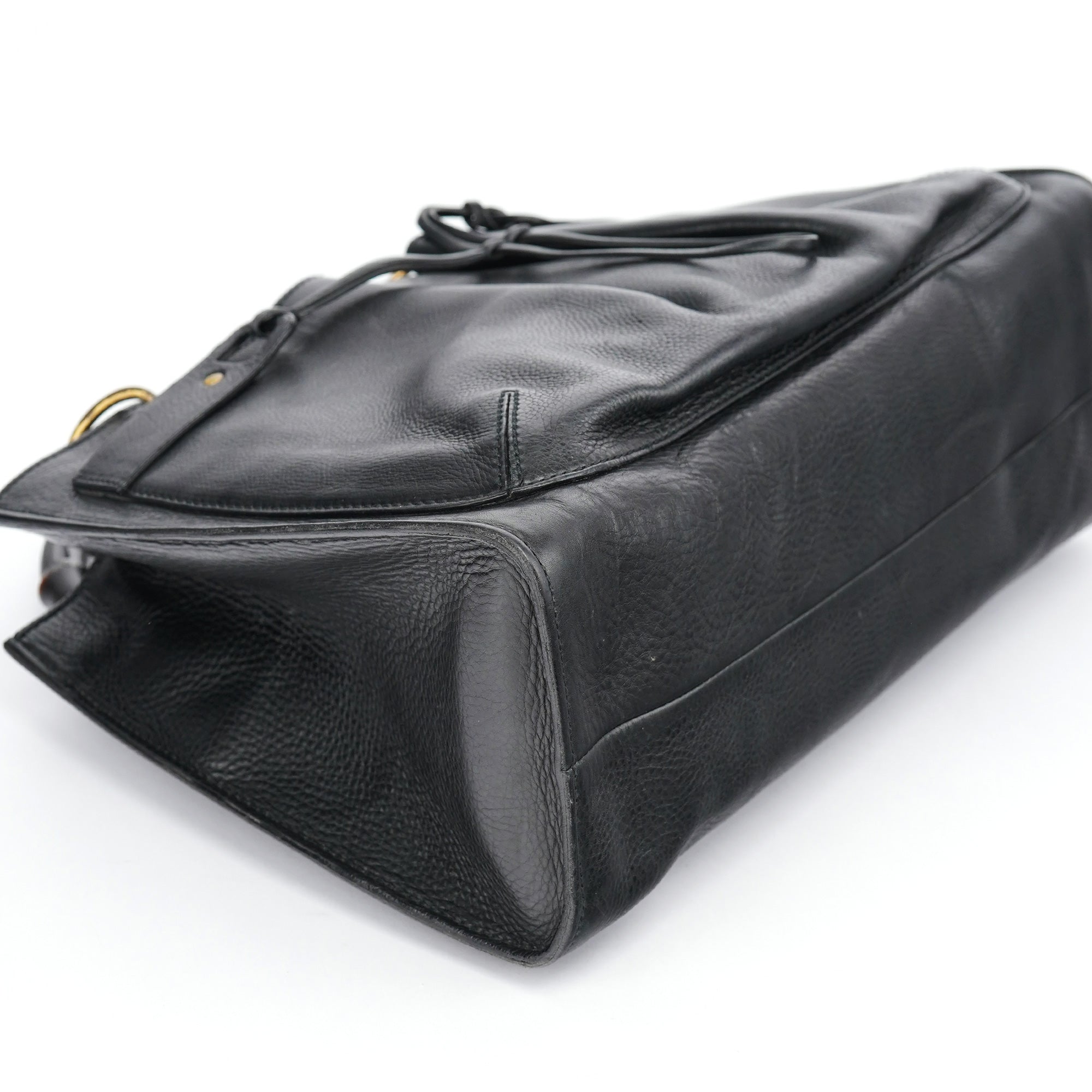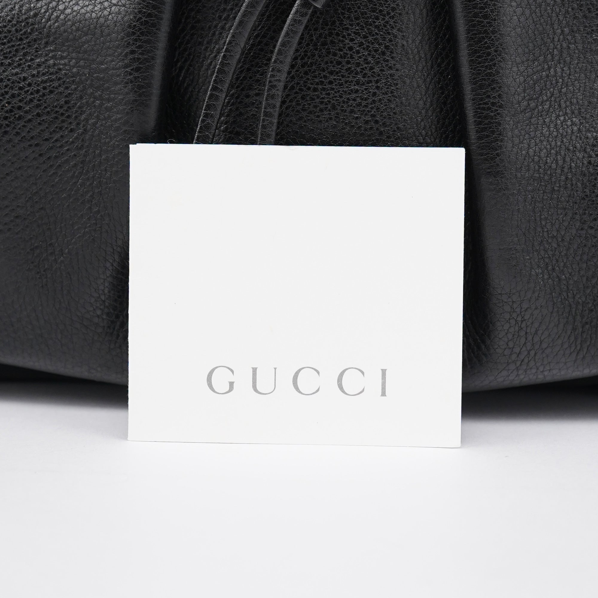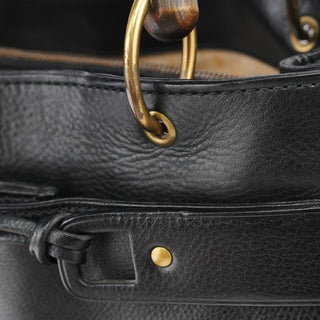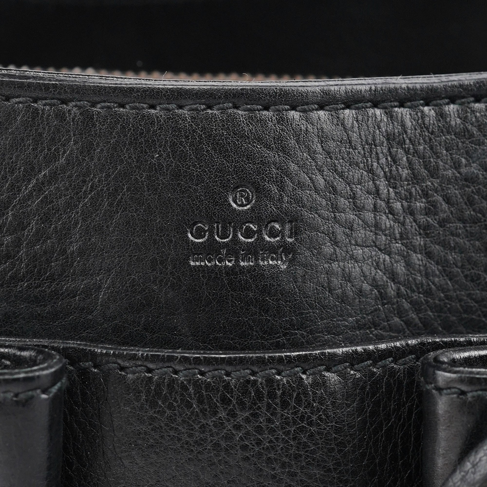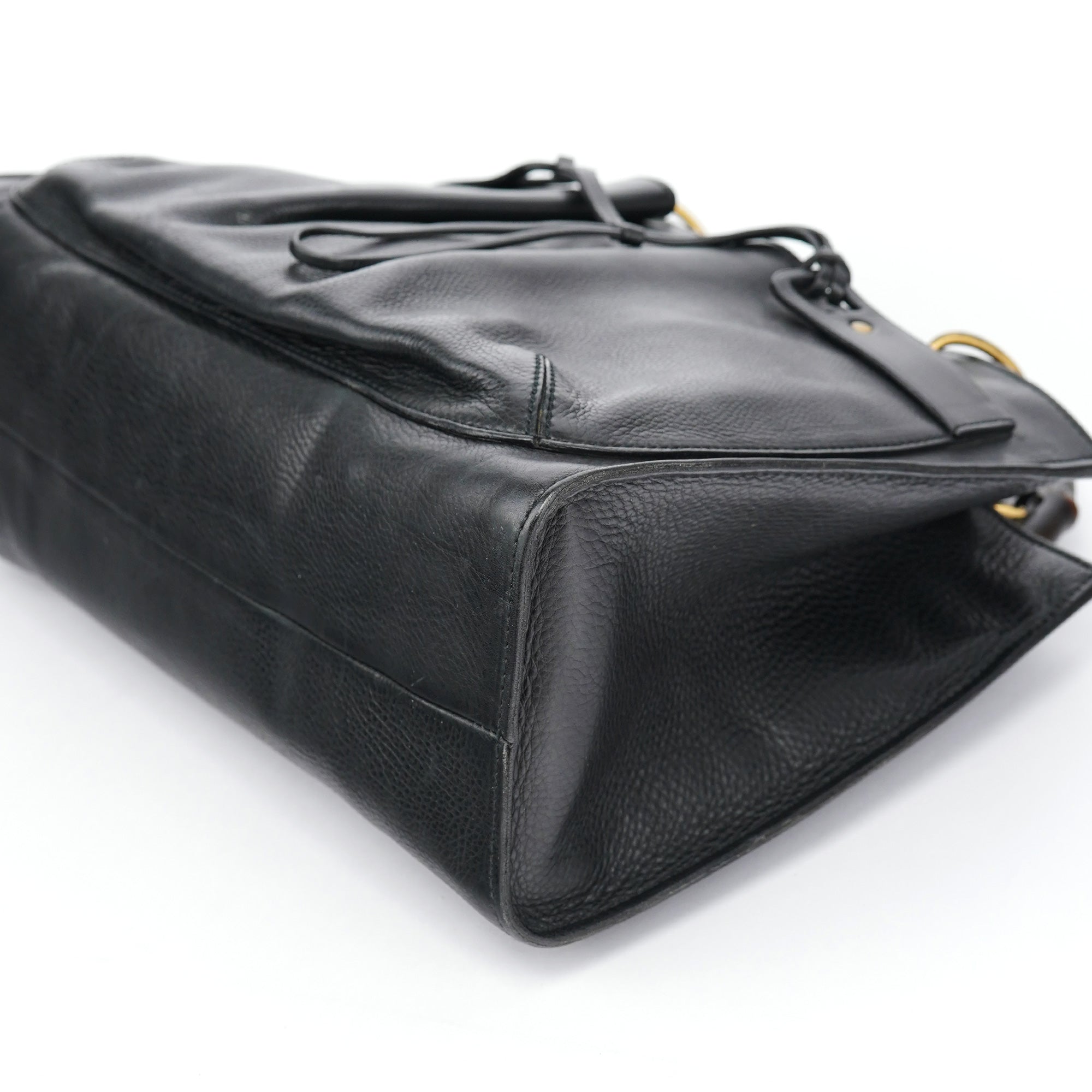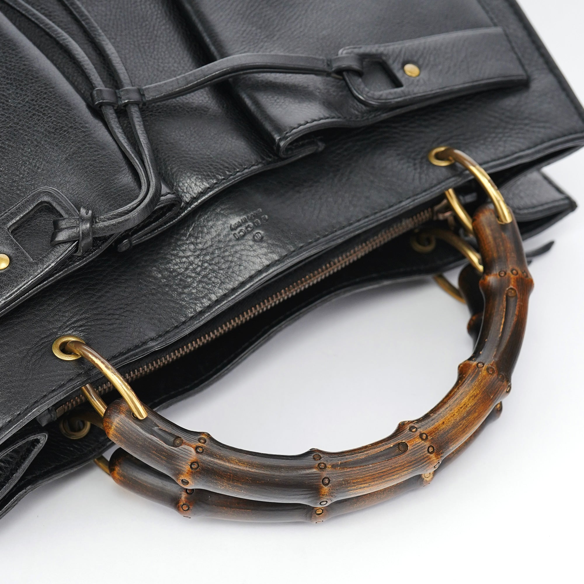 Designed in 2003 by Tom Ford, this Gucci Bamboo tote is crafted from supple black leather with signature curved bamboo handles and pleated front detailing. The spacious interior is lined in canvas and includes a zippered pocket, while the exterior features an open slot pocket for quick access. Finished with gold-tone hardware and leather drawstring accents.