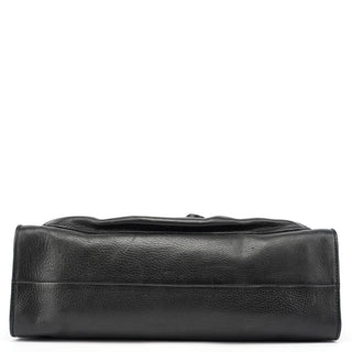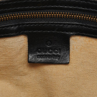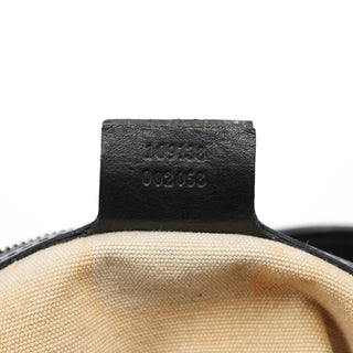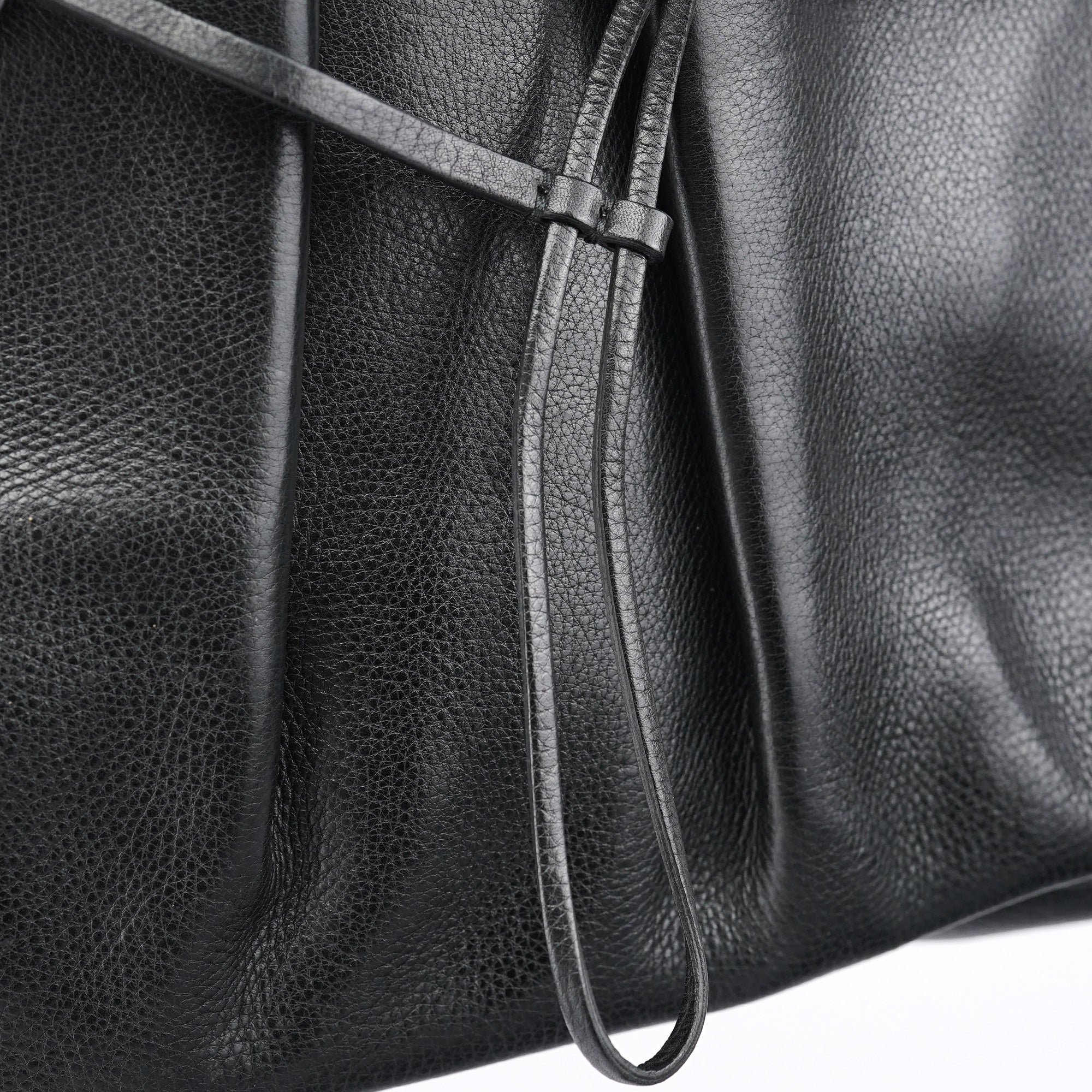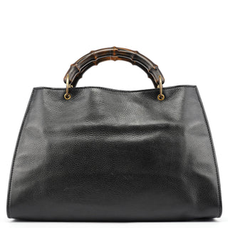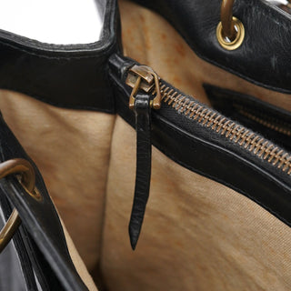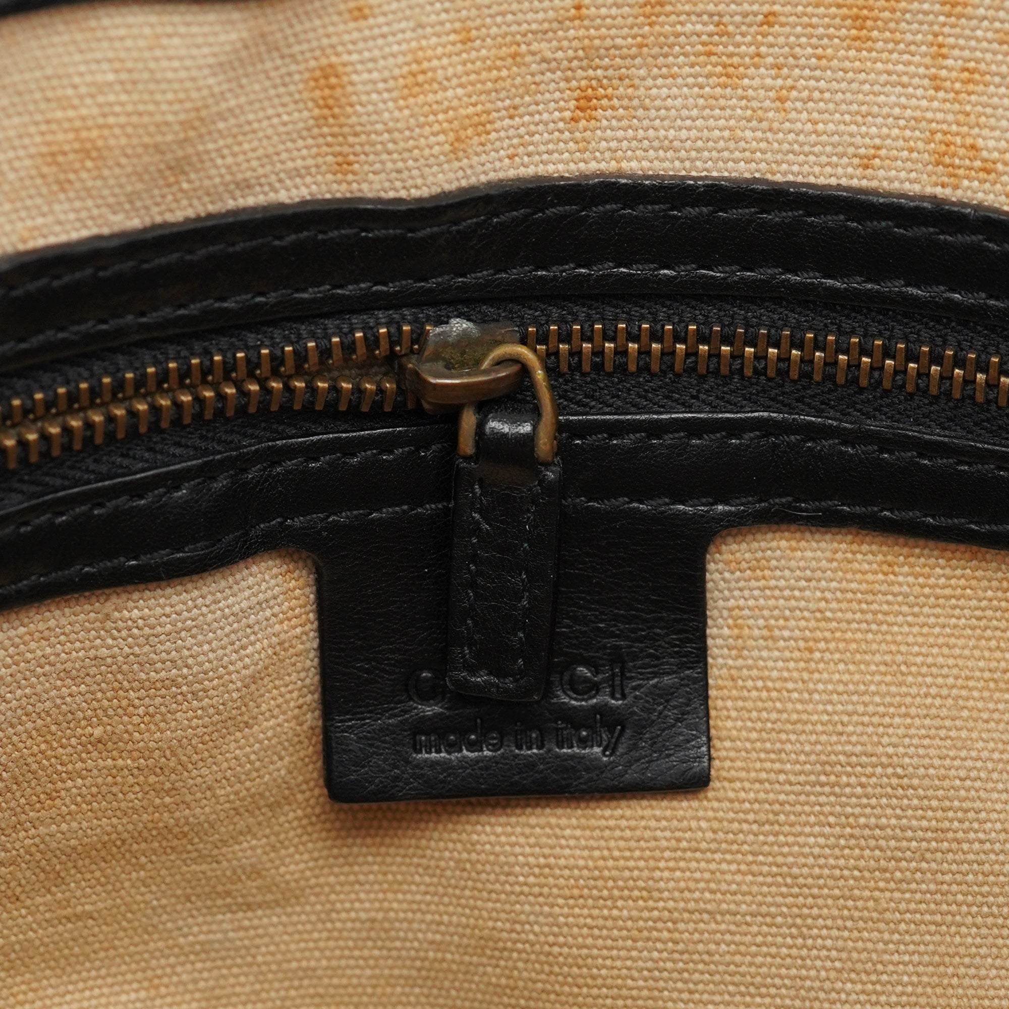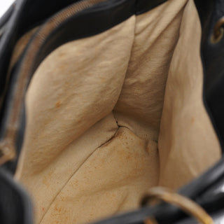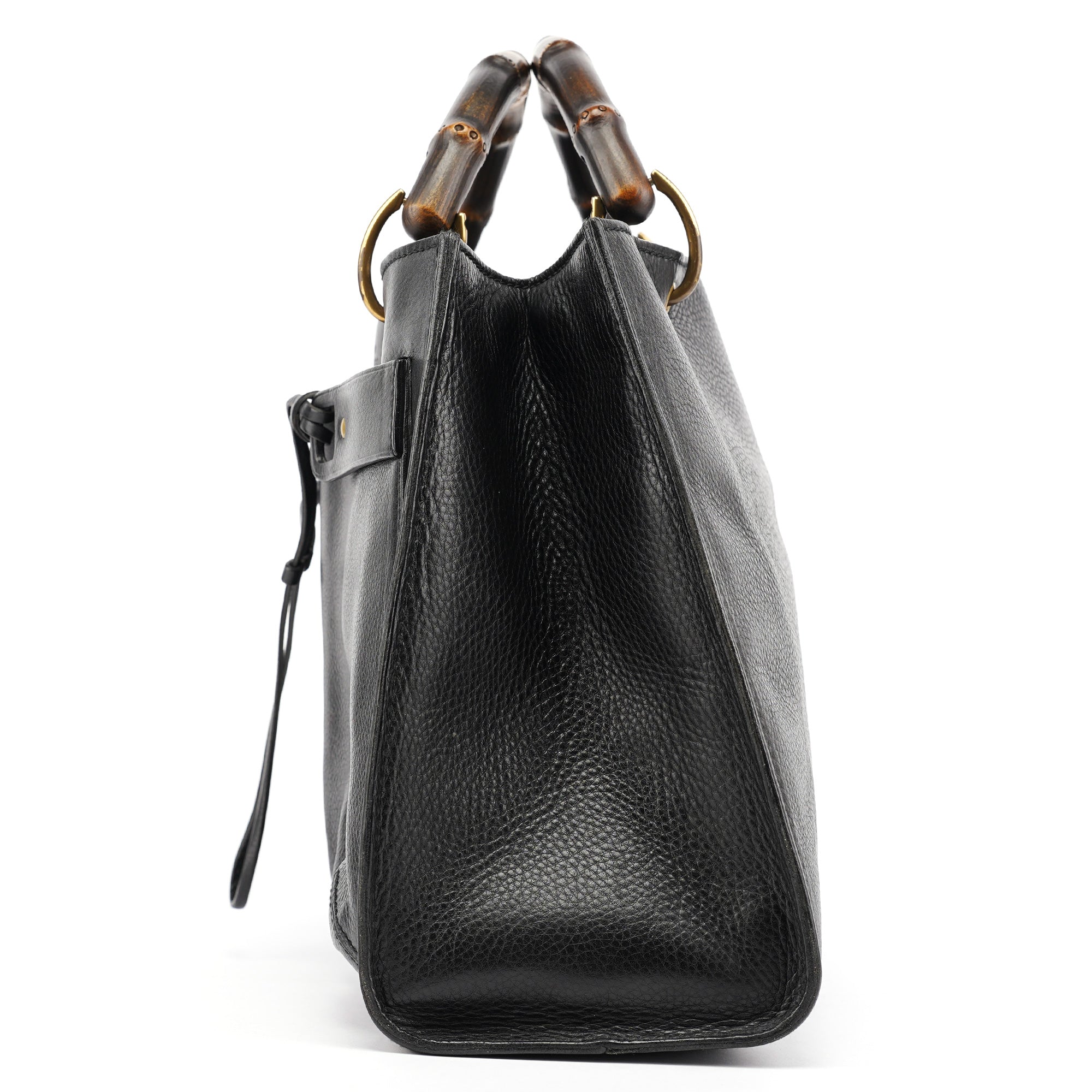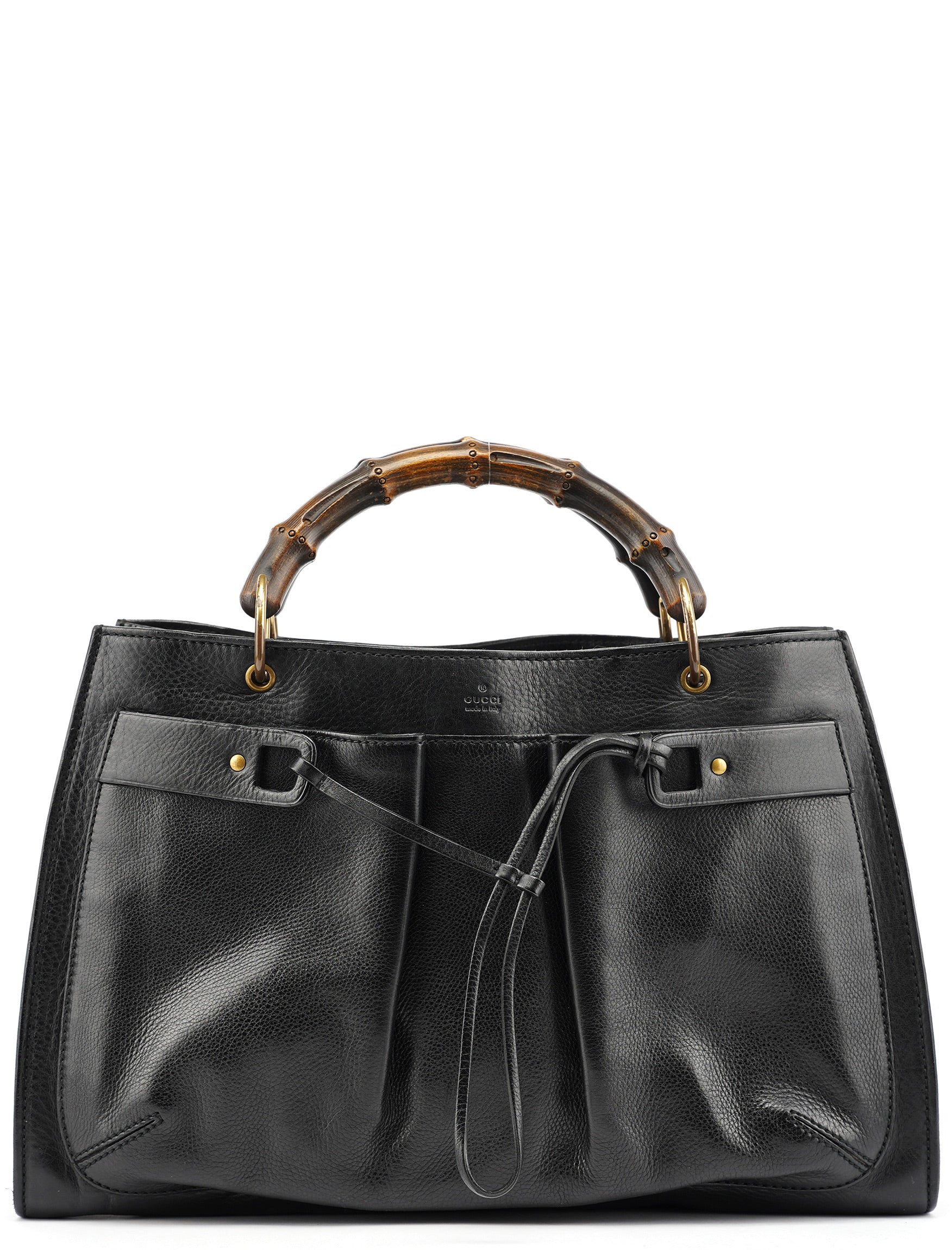 Designed in 2003 by Tom Ford, this Gucci Bamboo tote is crafted from supple black leather with signature curved bamboo handles and pleated front detailing. The spacious interior is lined in canvas and includes a zippered pocket, while the exterior features an open slot pocket for quick access. Finished with gold-tone hardware and leather drawstring accents.