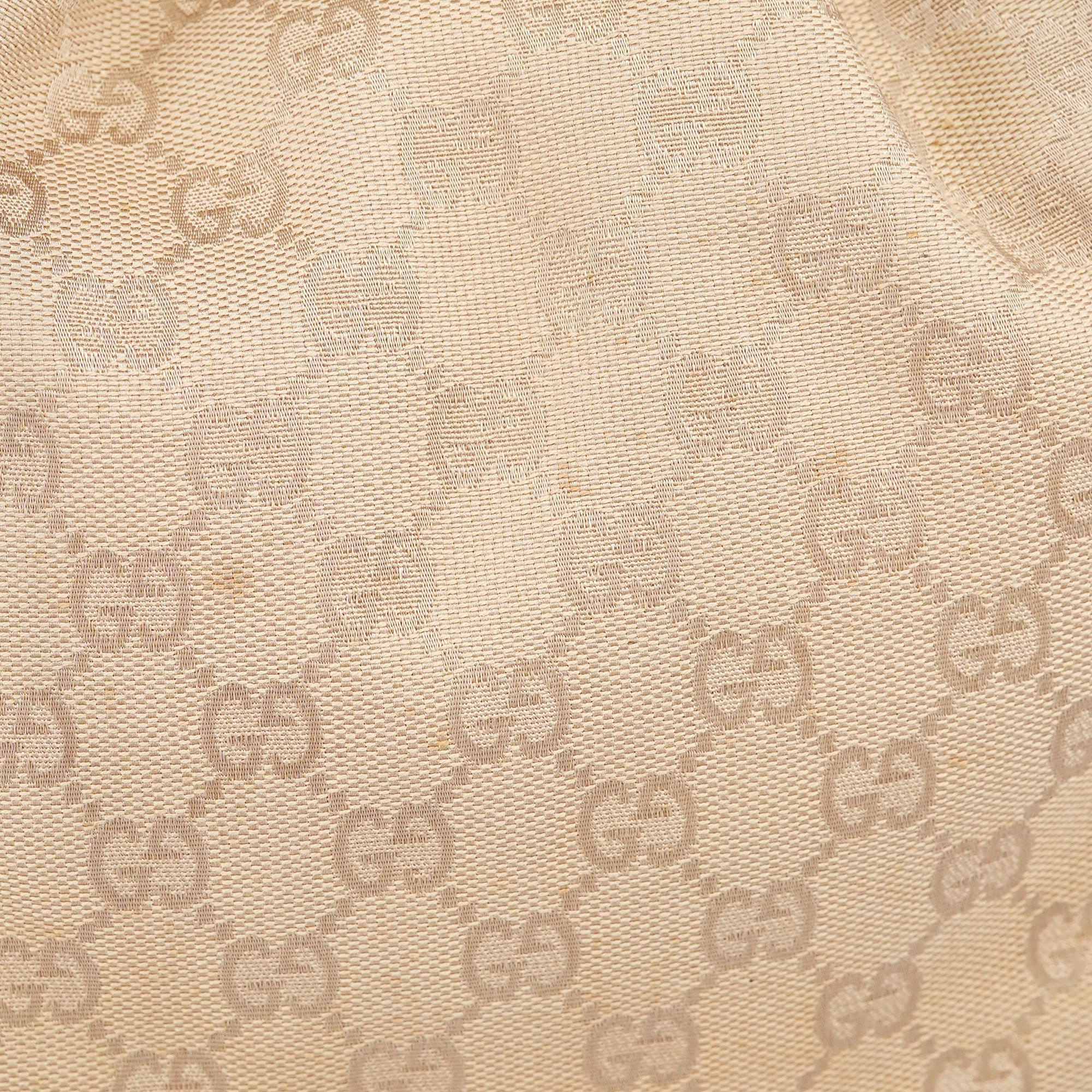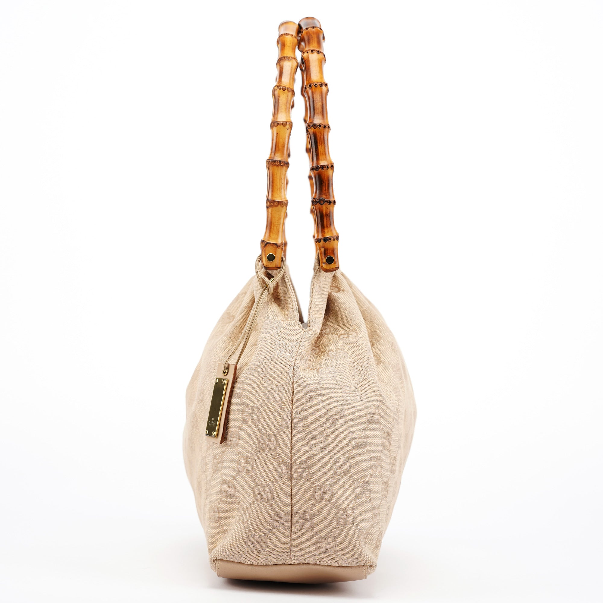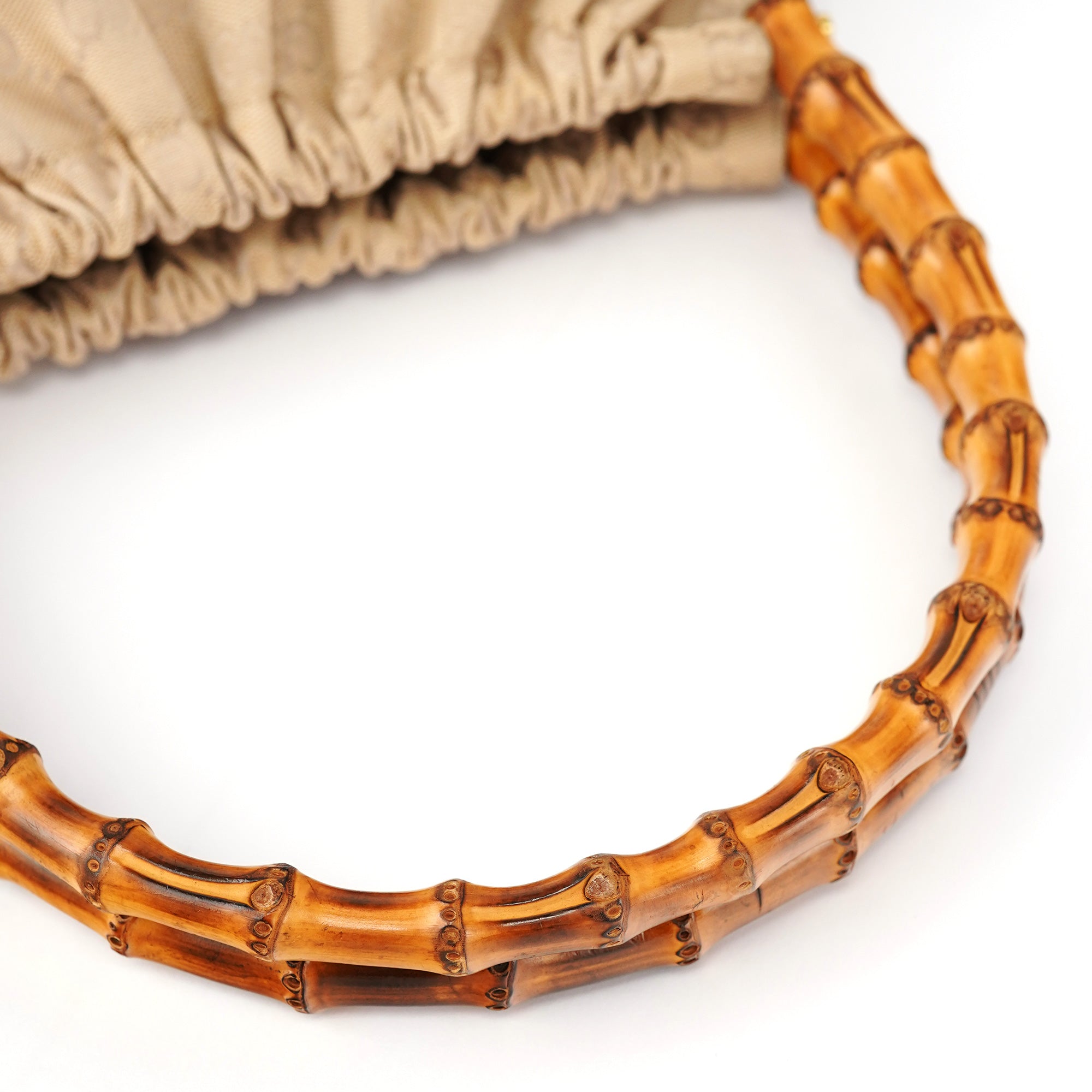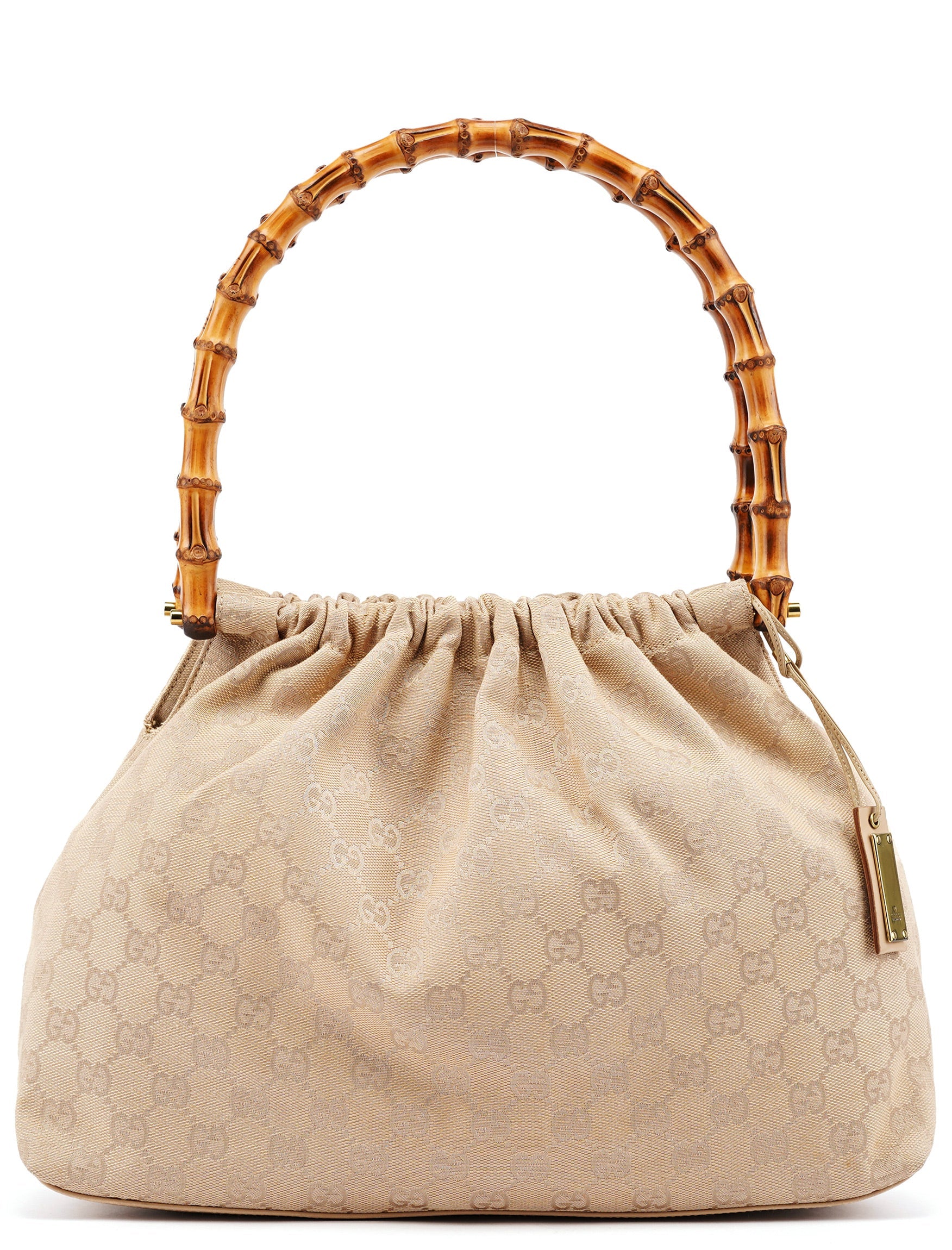 Designed in the early 2000s by Tom Ford, this Gucci shoulder bag is crafted in beige GG monogram canvas with a ruched top and double bamboo handles. Finished with gold-tone hardware and a satin-lined interior, it offers a softly structured silhouette with archival charm.