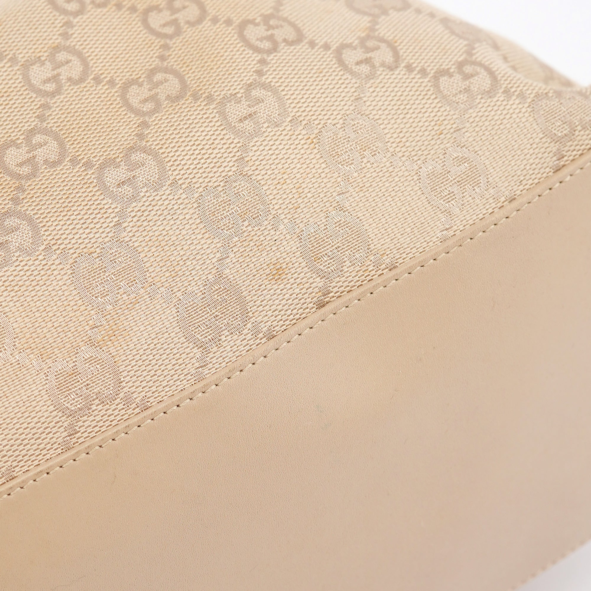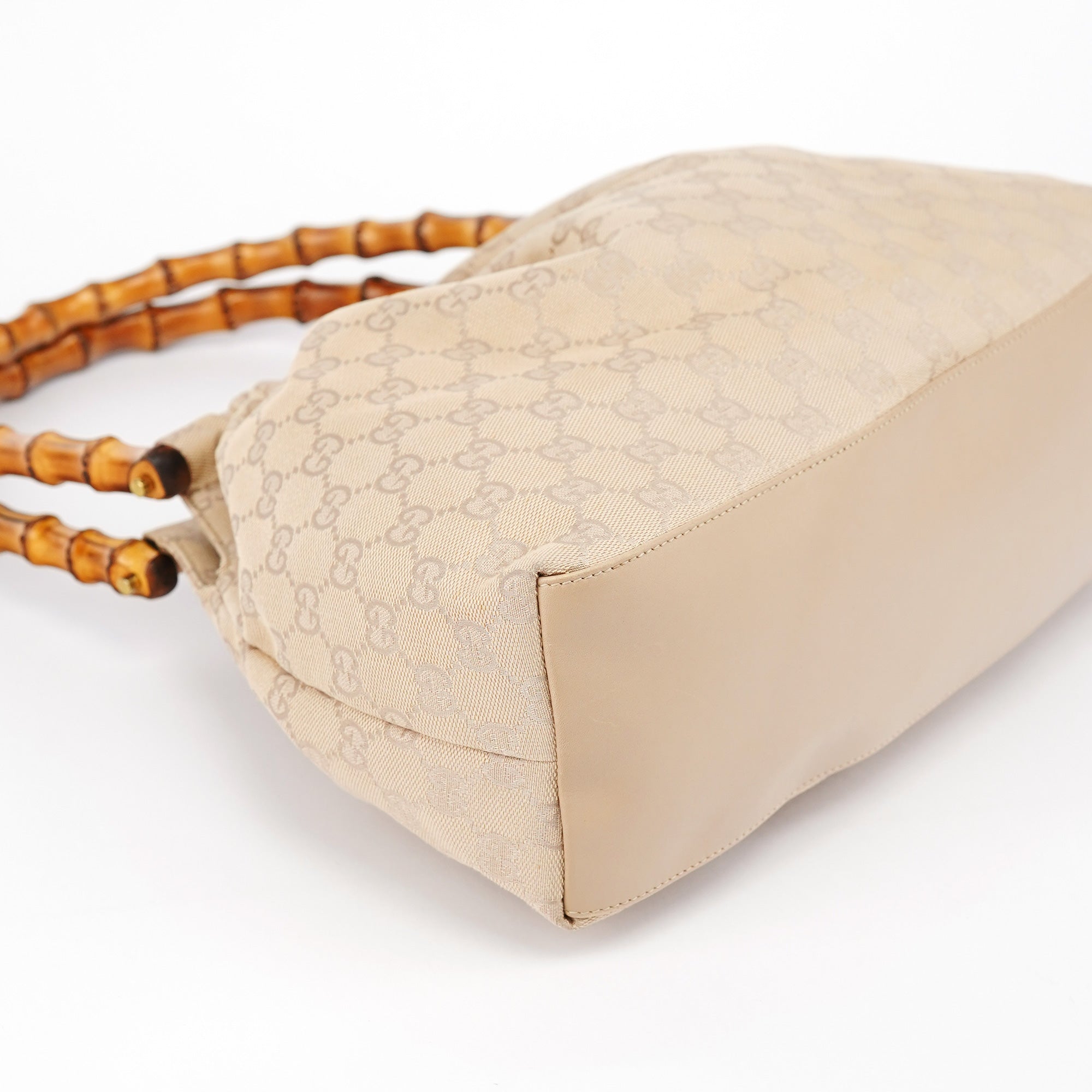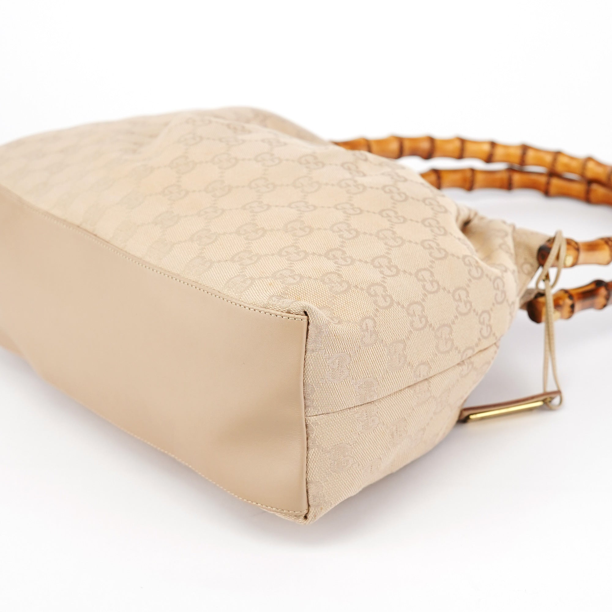 Designed in the early 2000s by Tom Ford, this Gucci shoulder bag is crafted in beige GG monogram canvas with a ruched top and double bamboo handles. Finished with gold-tone hardware and a satin-lined interior, it offers a softly structured silhouette with archival charm.