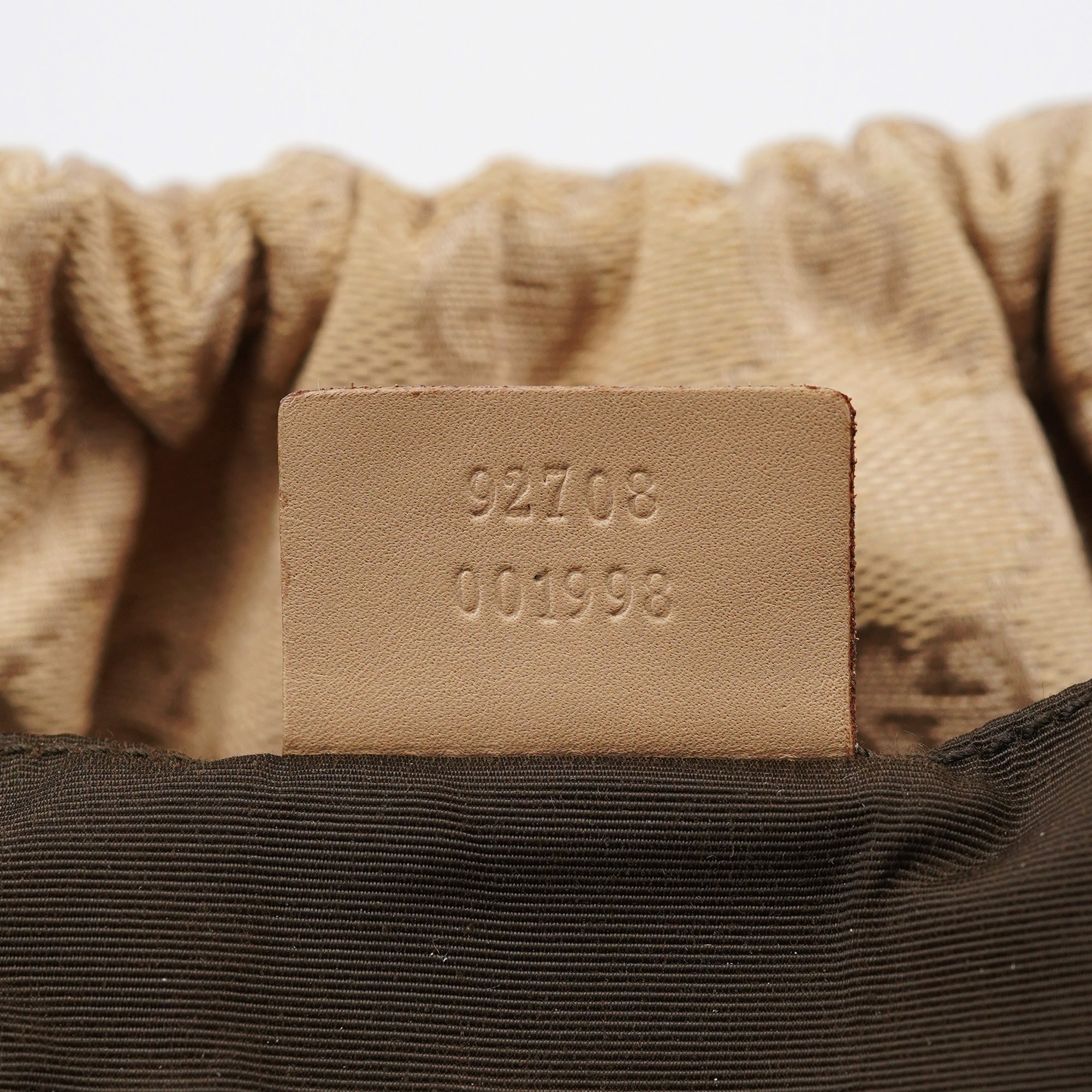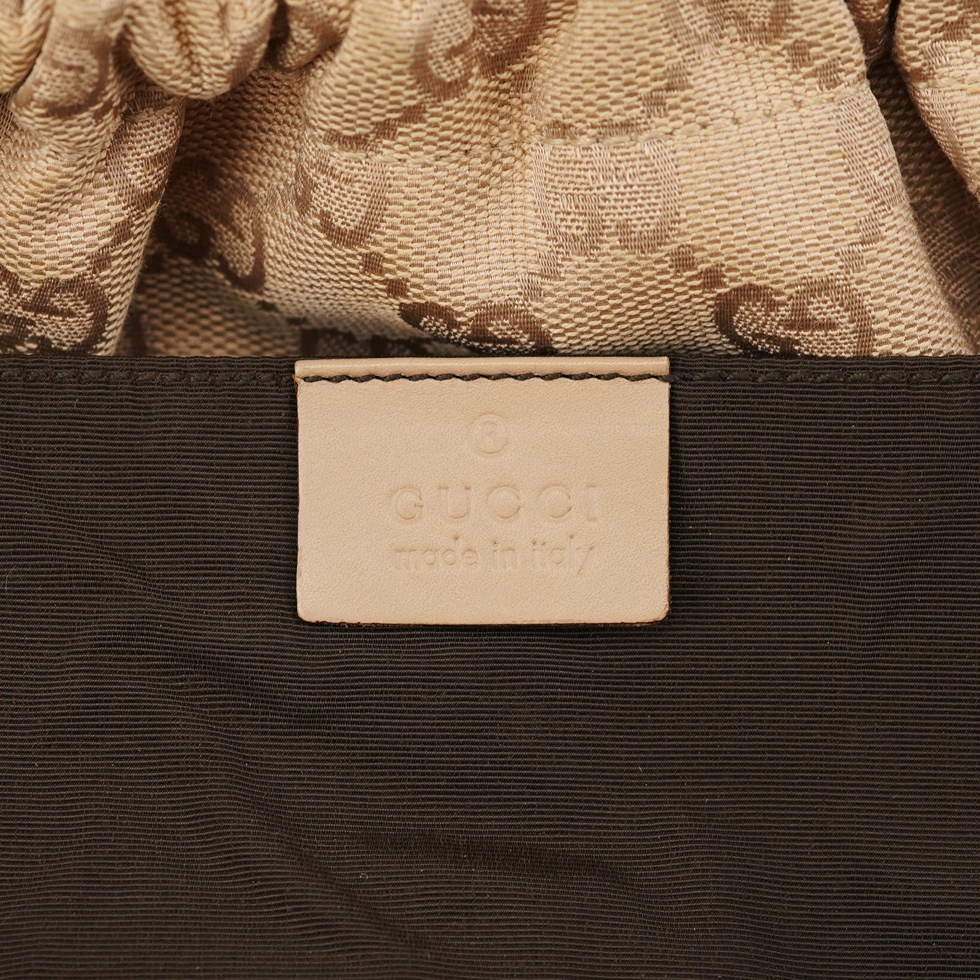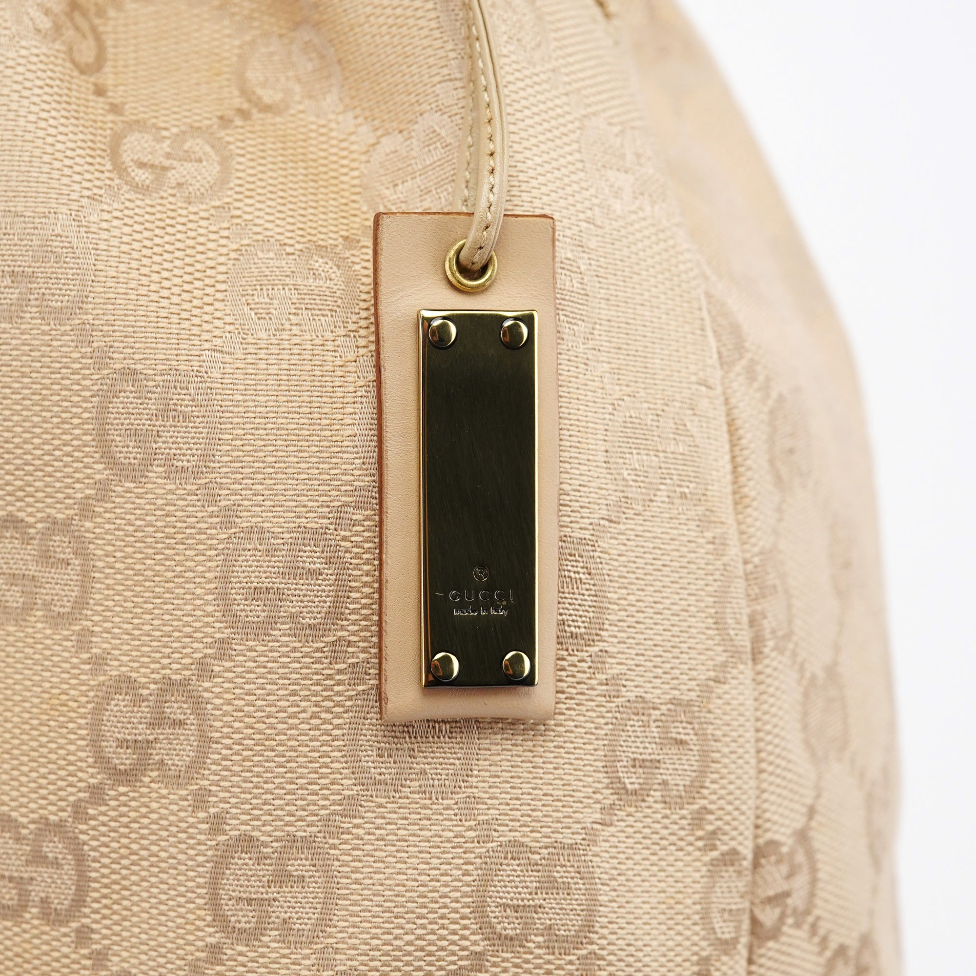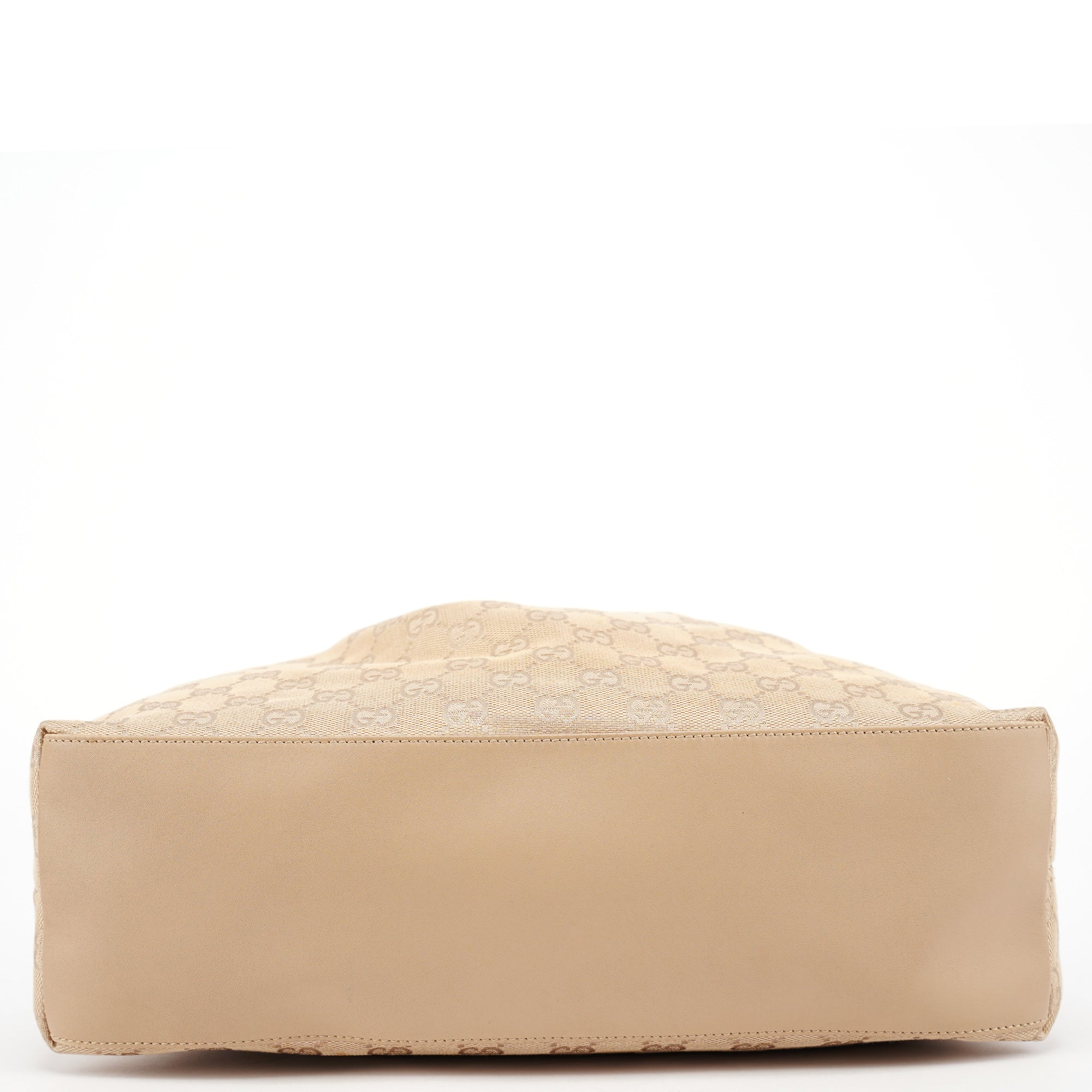 Designed in the early 2000s by Tom Ford, this Gucci shoulder bag is crafted in beige GG monogram canvas with a ruched top and double bamboo handles. Finished with gold-tone hardware and a satin-lined interior, it offers a softly structured silhouette with archival charm.