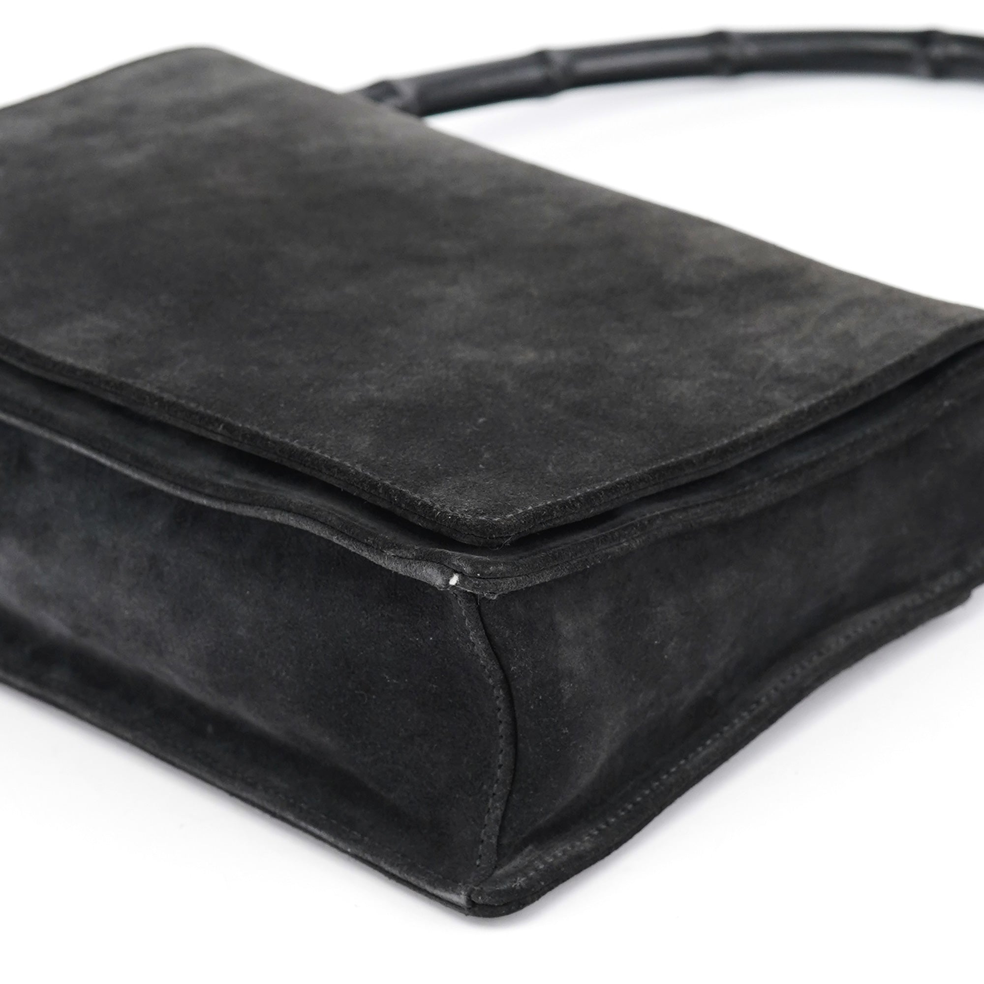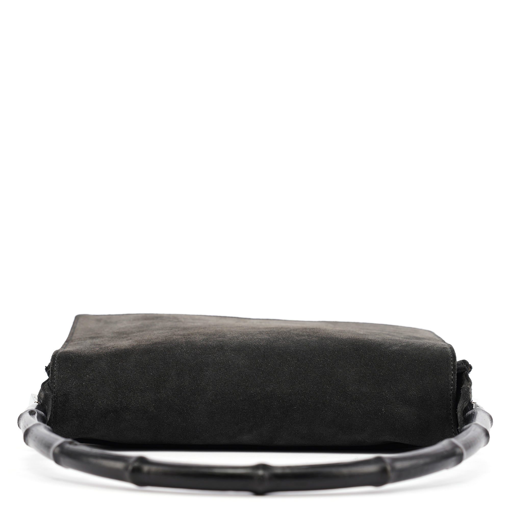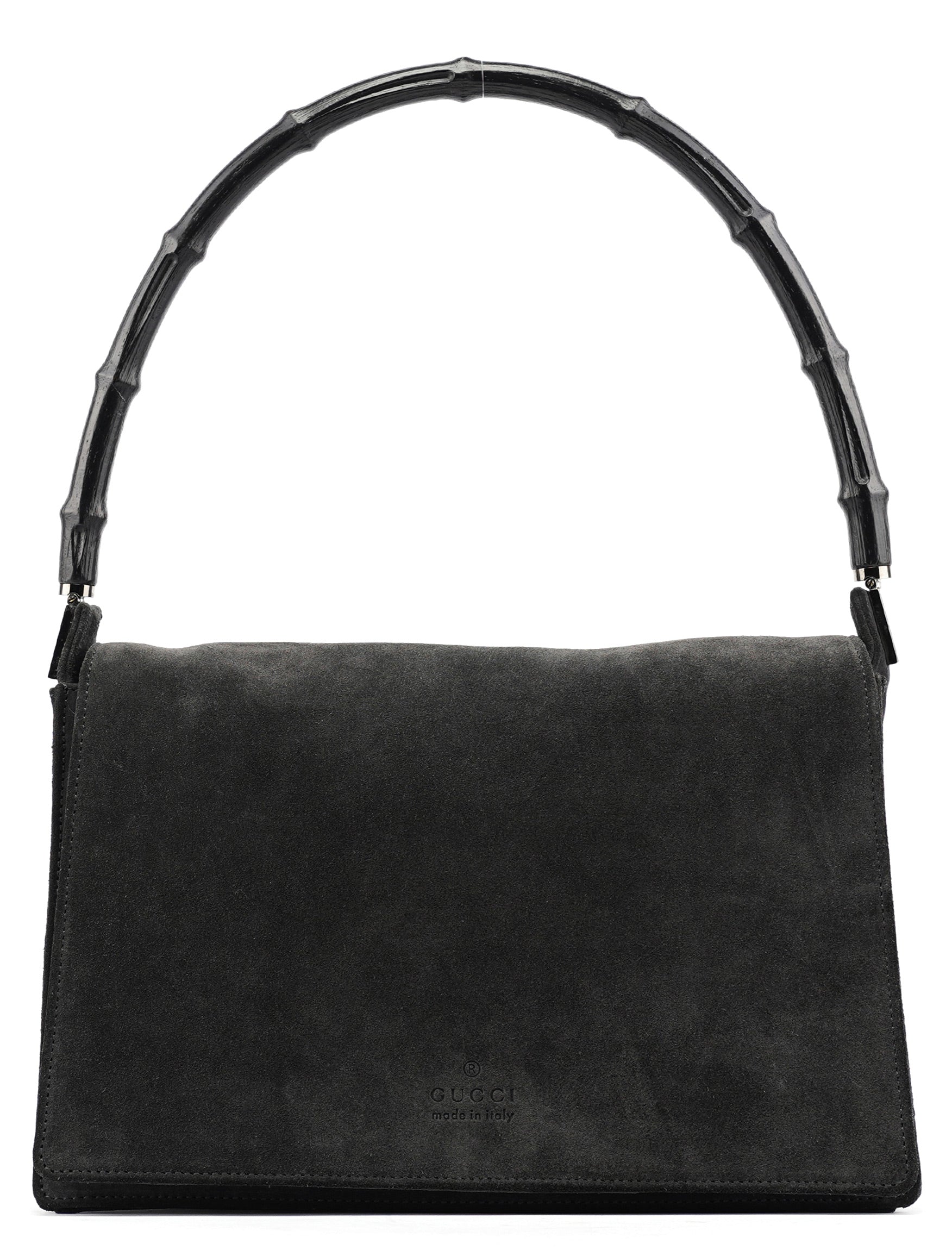Designed in the late 1990s by Tom Ford, this vintage Gucci shoulder bag is crafted in anthracite suede with a structured rectangular silhouette and signature black bamboo top handle. The minimalist flap design features discreet debossed logo branding and silver-tone hardware. Lined in tonal fabric with an interior zip pocket.