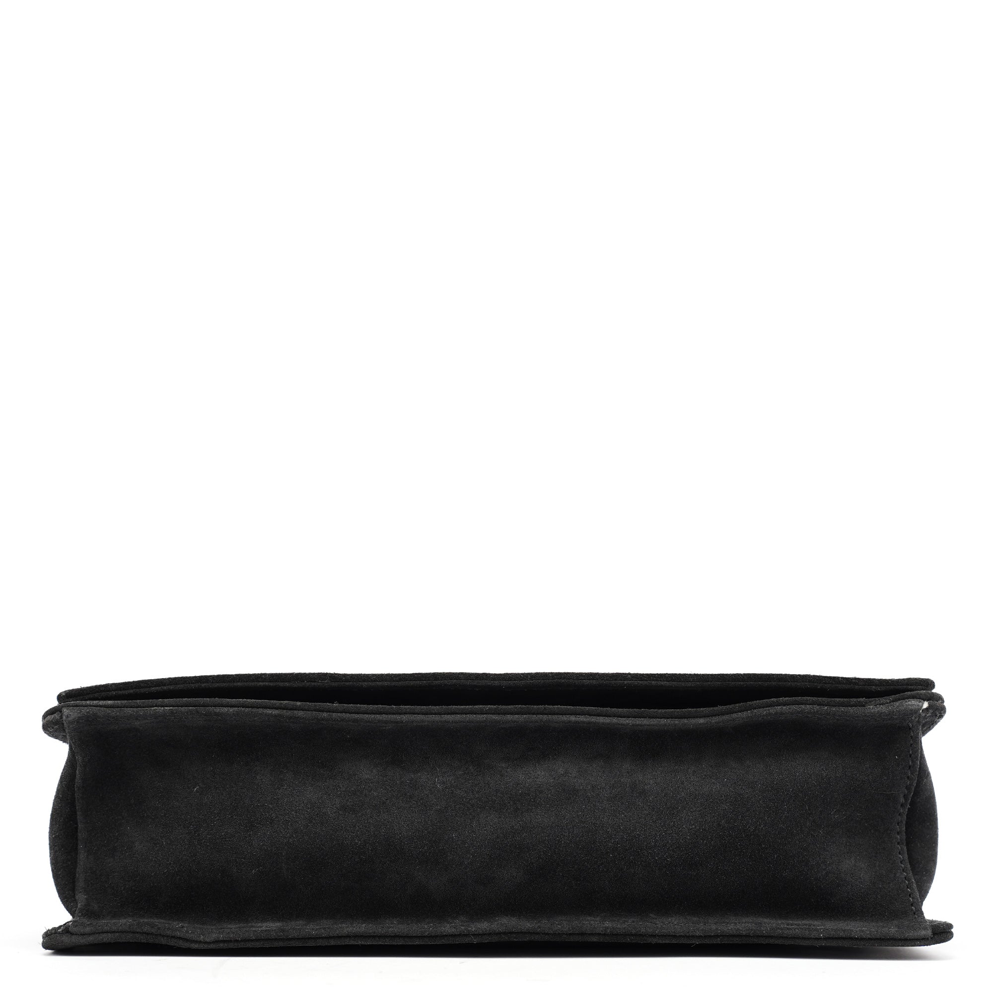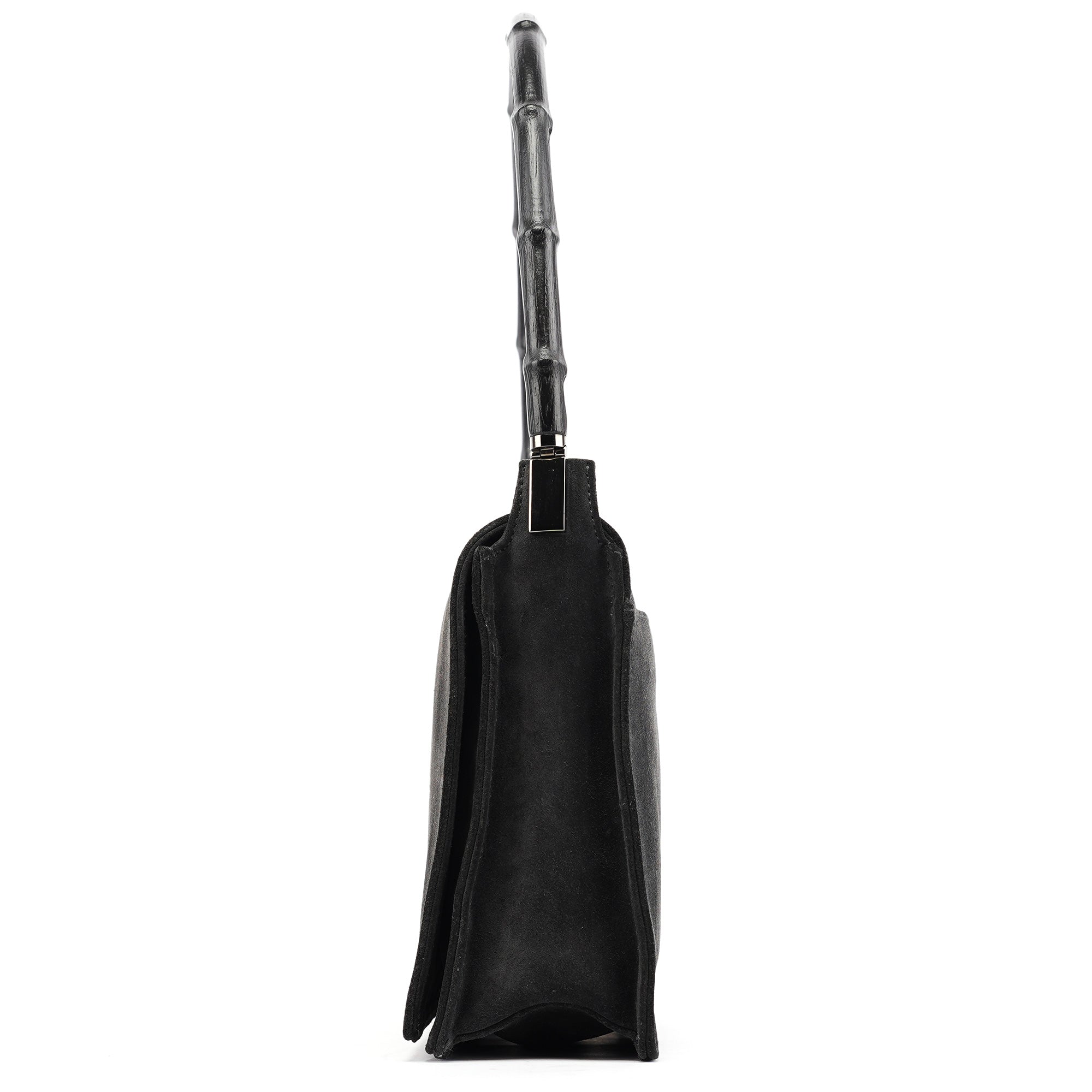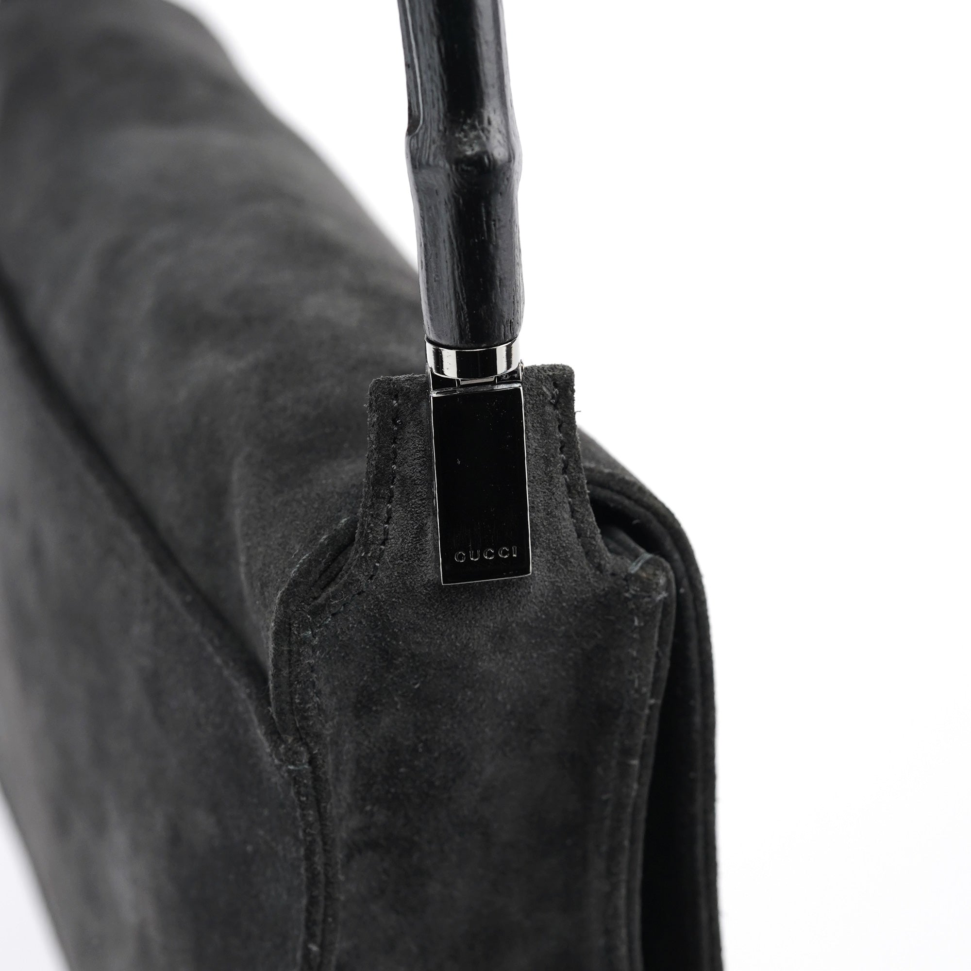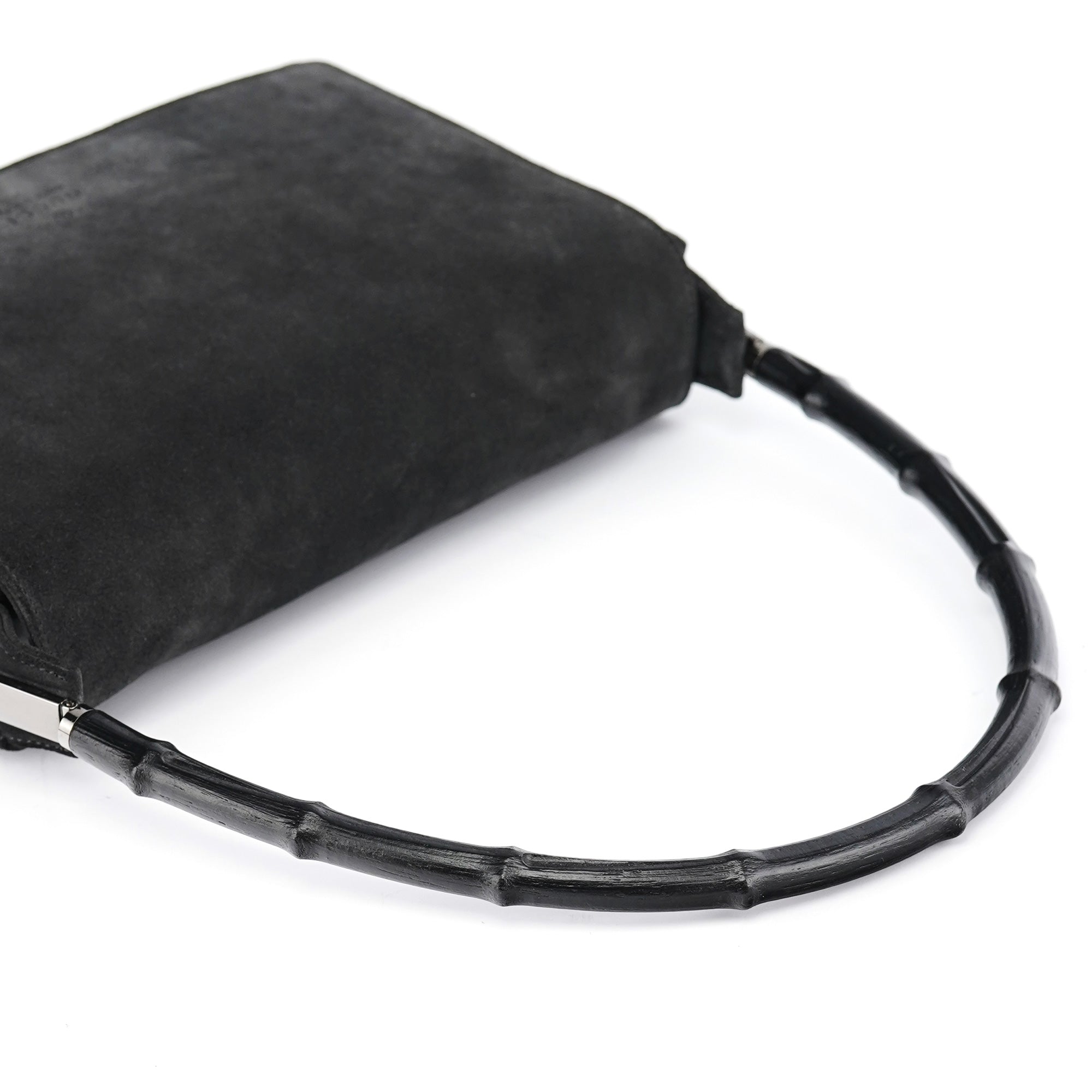 Designed in the late 1990s by Tom Ford, this vintage Gucci shoulder bag is crafted in anthracite suede with a structured rectangular silhouette and signature black bamboo top handle. The minimalist flap design features discreet debossed logo branding and silver-tone hardware. Lined in tonal fabric with an interior zip pocket.