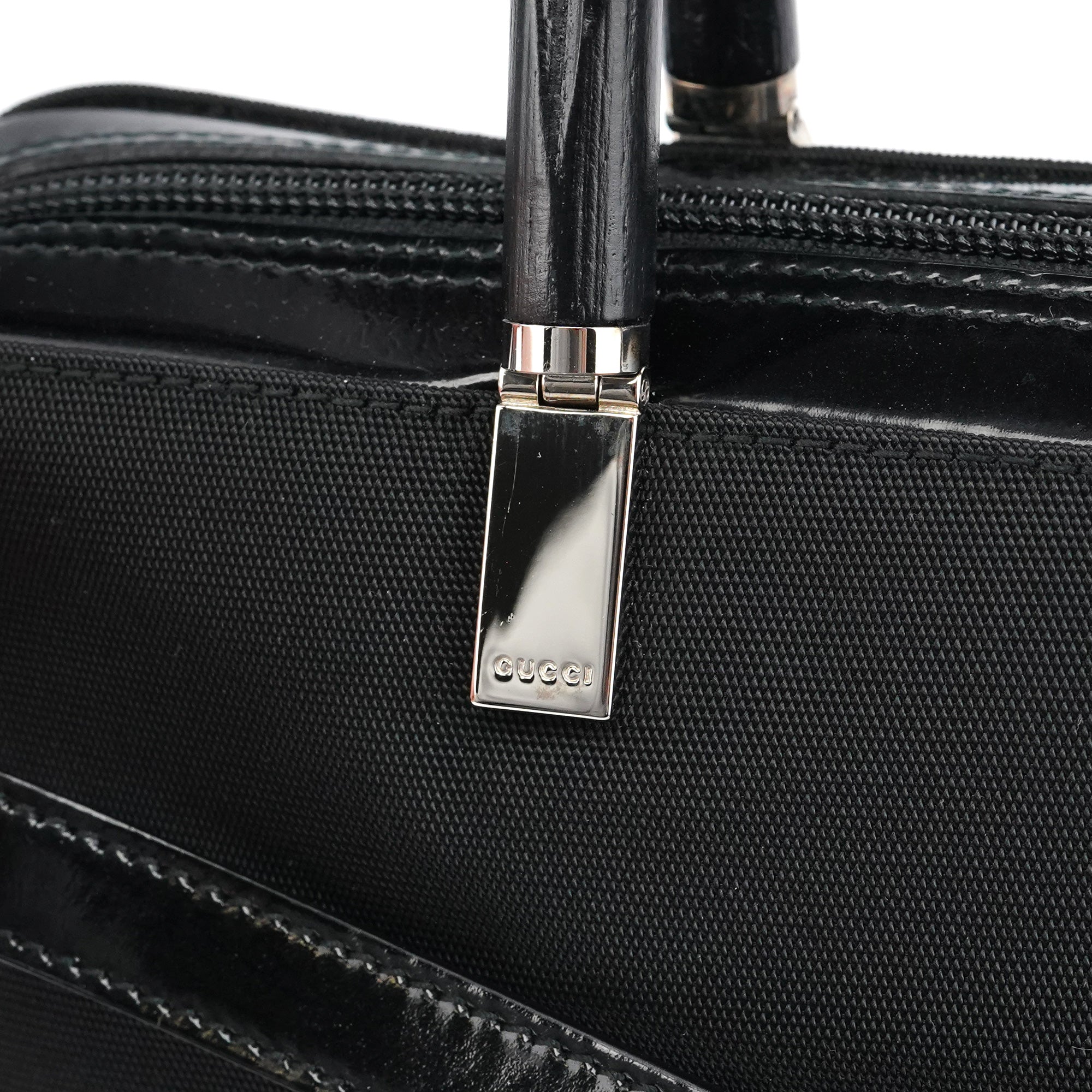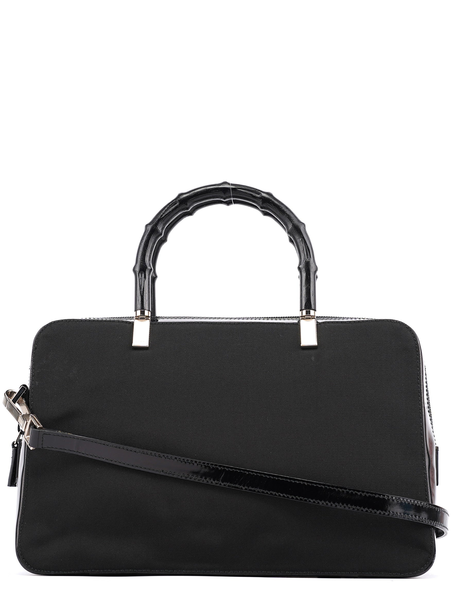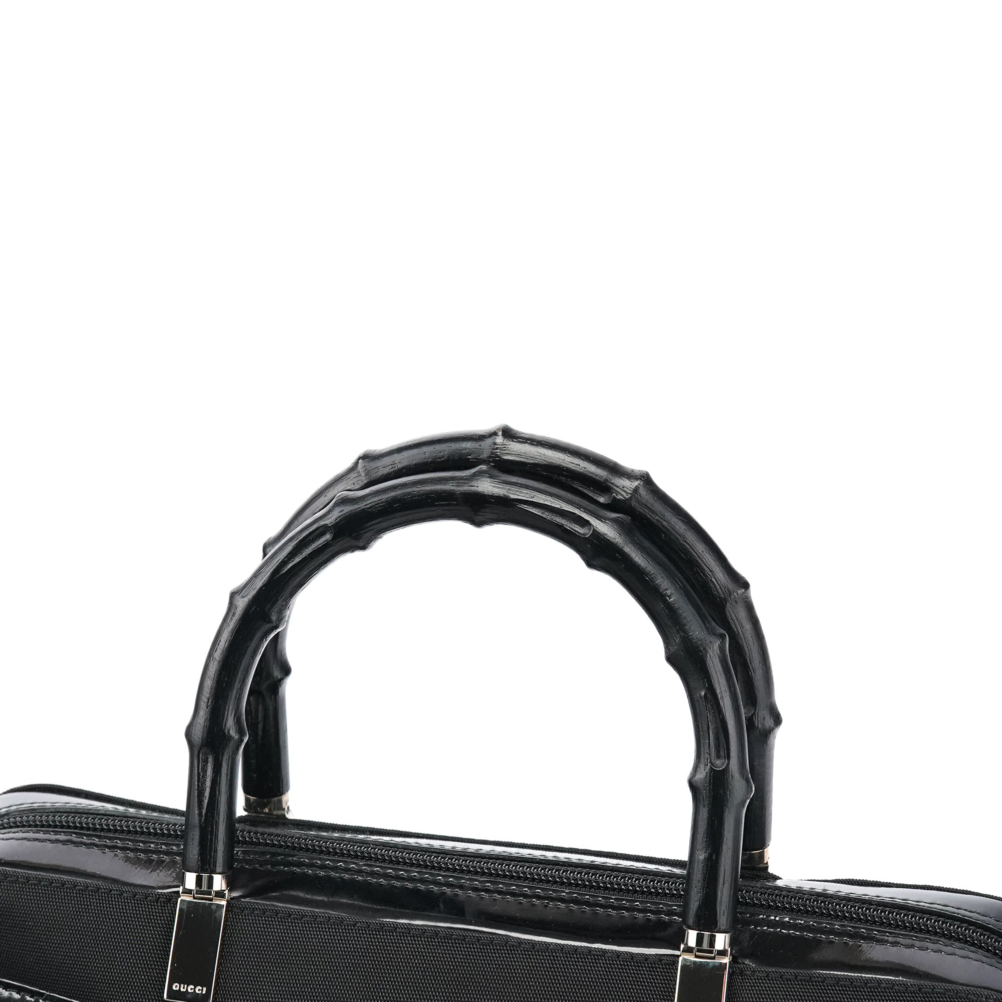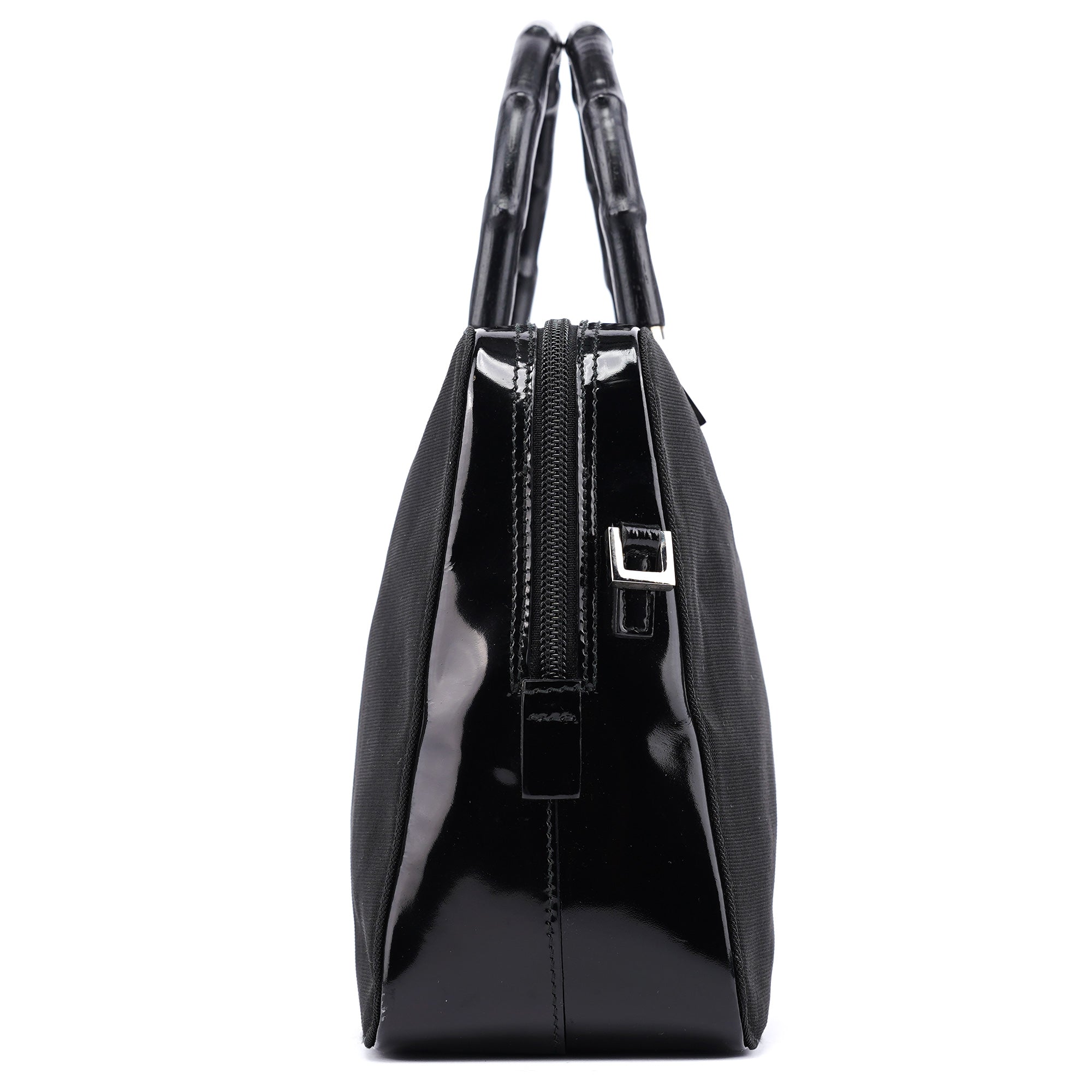 Designed in the late 1990's, this vintage Gucci Bamboo 2-way bag features black canvas with patent leather trim and iconic bamboo handles. The structured tote silhouette includes dual bamboo top handles with leather accents, a removable shoulder strap for versatile carry, and a zip-top closure with inner pocket. The nylon-lined interior offers practical storage for everyday essentials.